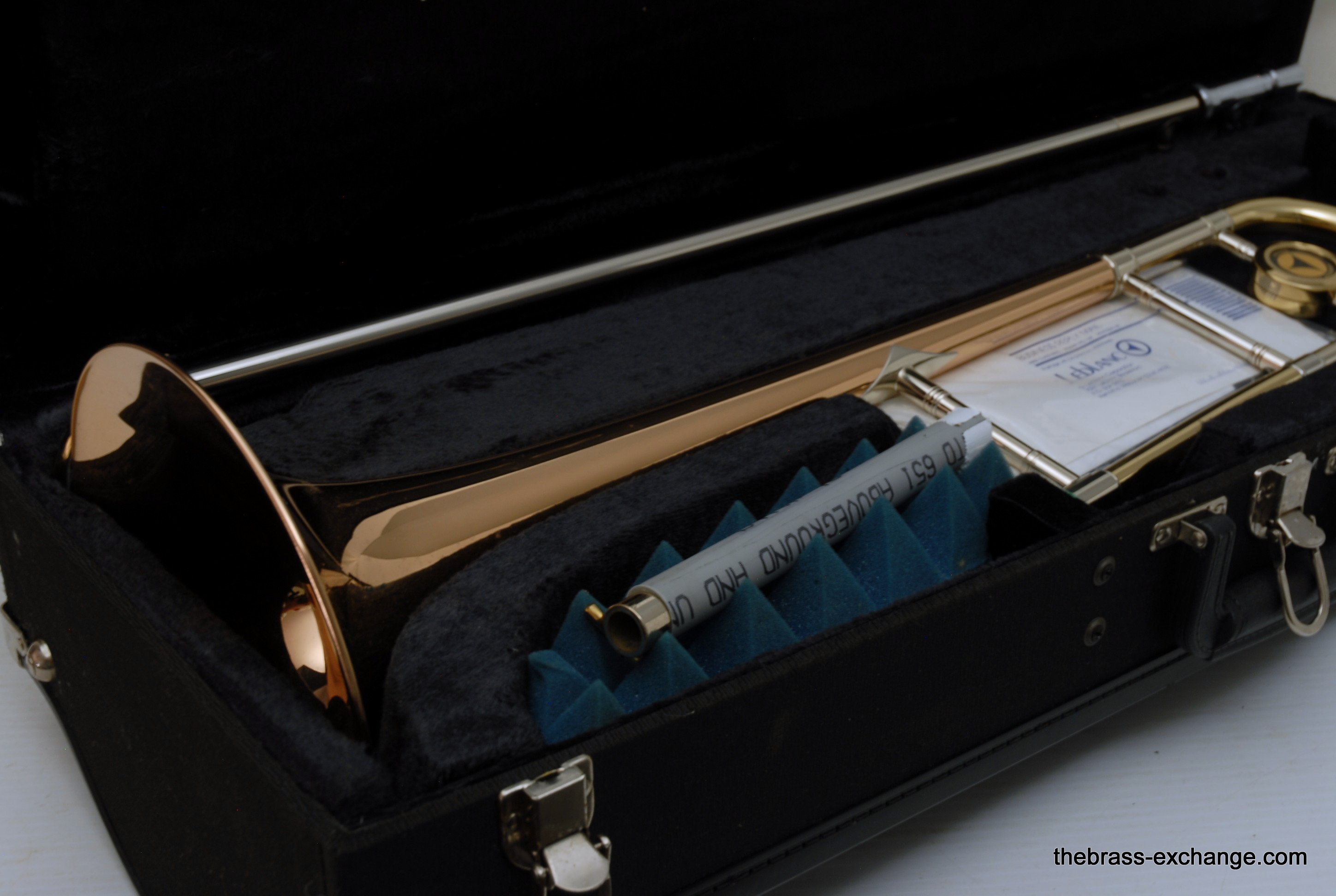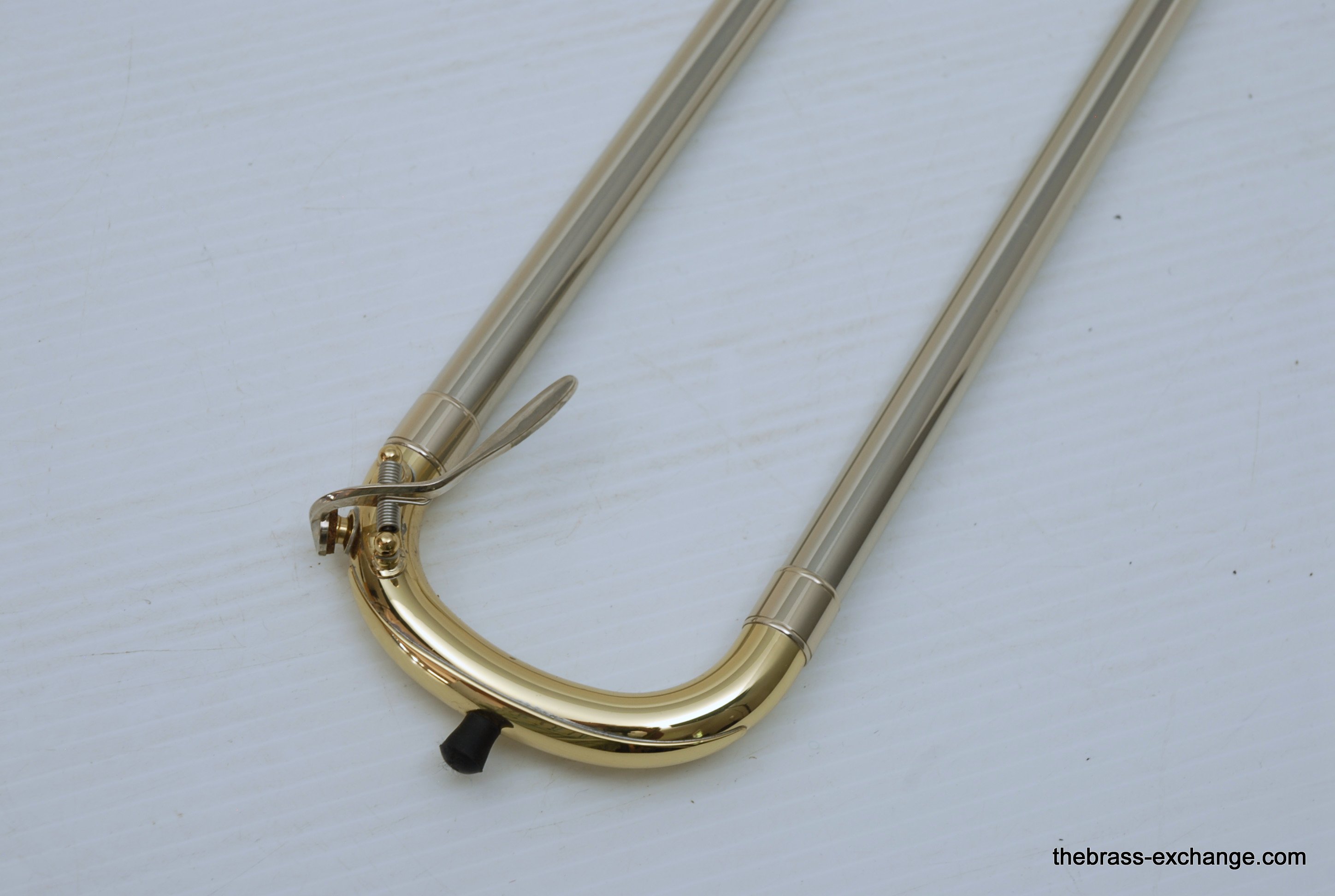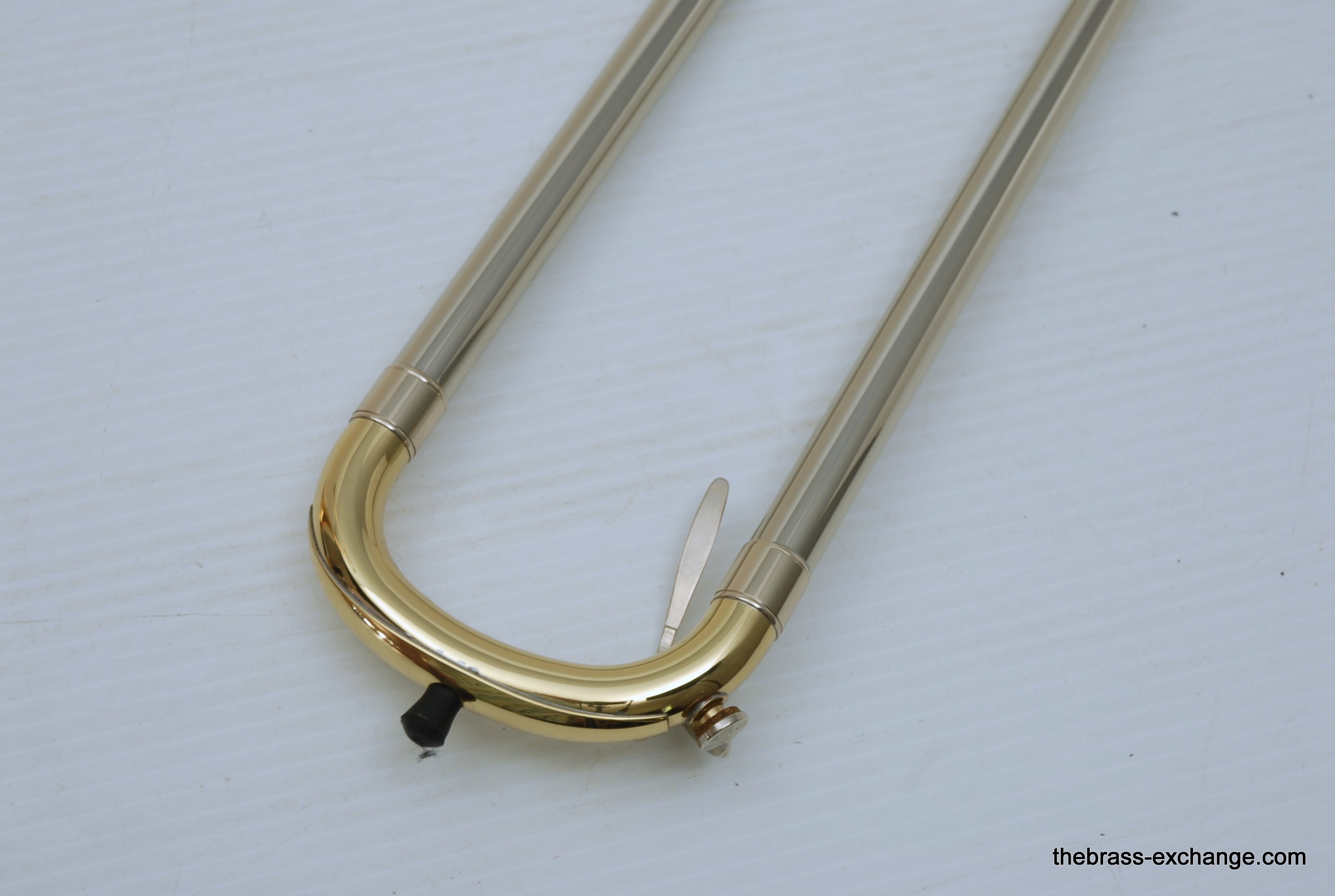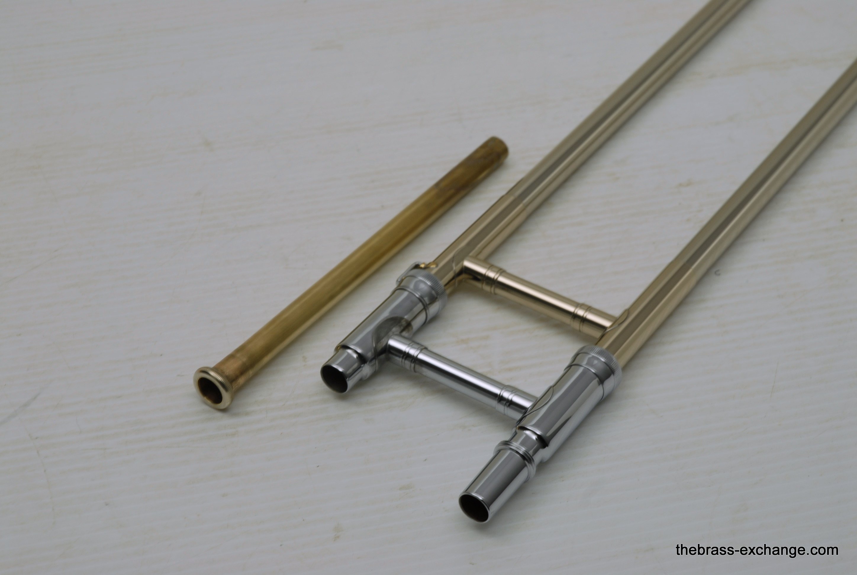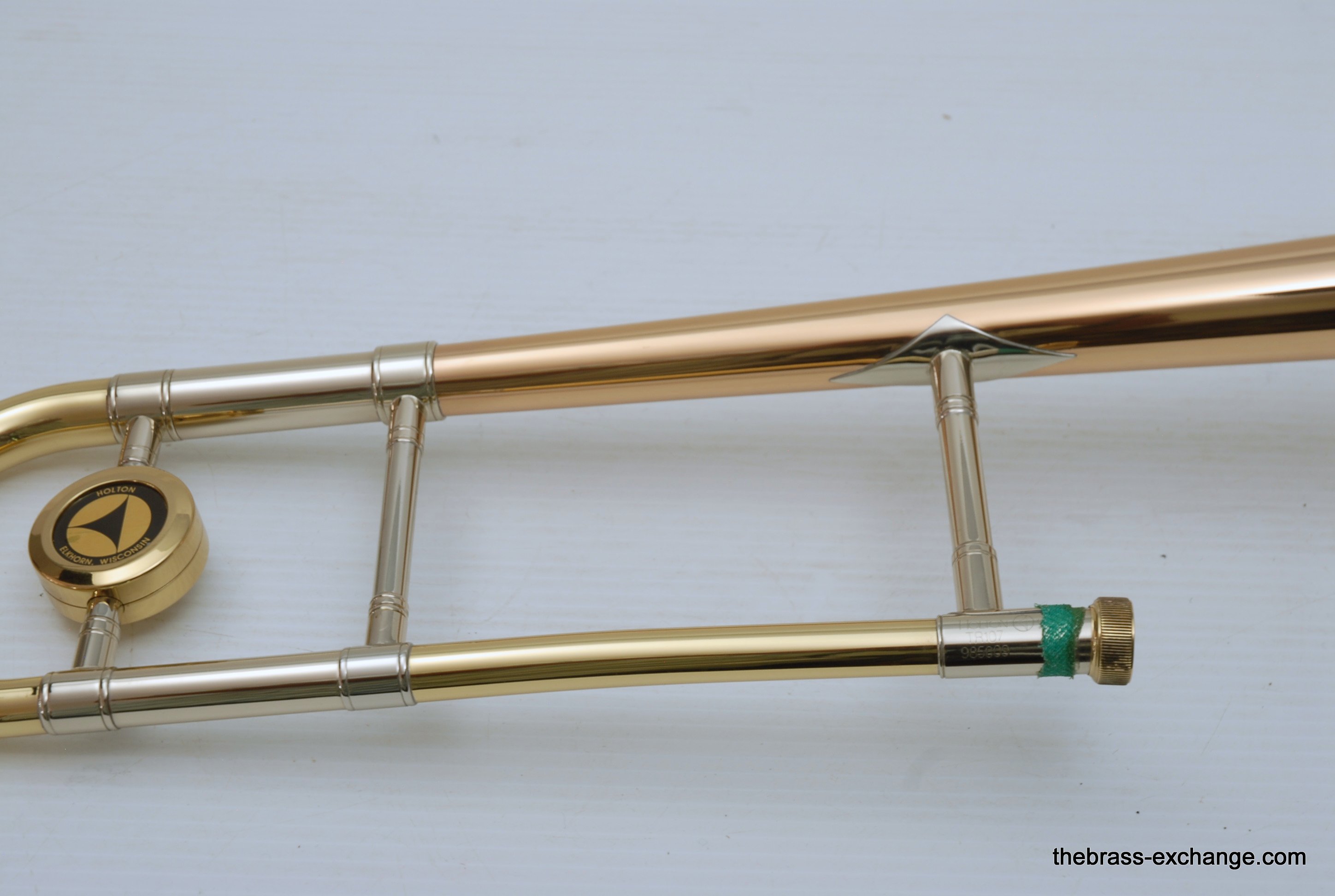 Holton TR107 Large Bore Straight Tenor.Β Has 8.5" Rose Brass Bell, Lighweight Nickel Silver Handslide with custom fit threadless removable press fit leadpipe, handlside in perfect playing condition.Β Β Super Mint Closet Find with paperwork and perfect condition case.Β These do not become availble very often, especially ones in mint condition, all original lacquer.Β Picky slide guys will enjoy. Would make an excellent all around tenor for any player looking to play without a trigger. Is .547 bore large shank mouthpiece.Β Plays dark, yet lively with lots of color. In-stock for immediate delivery.