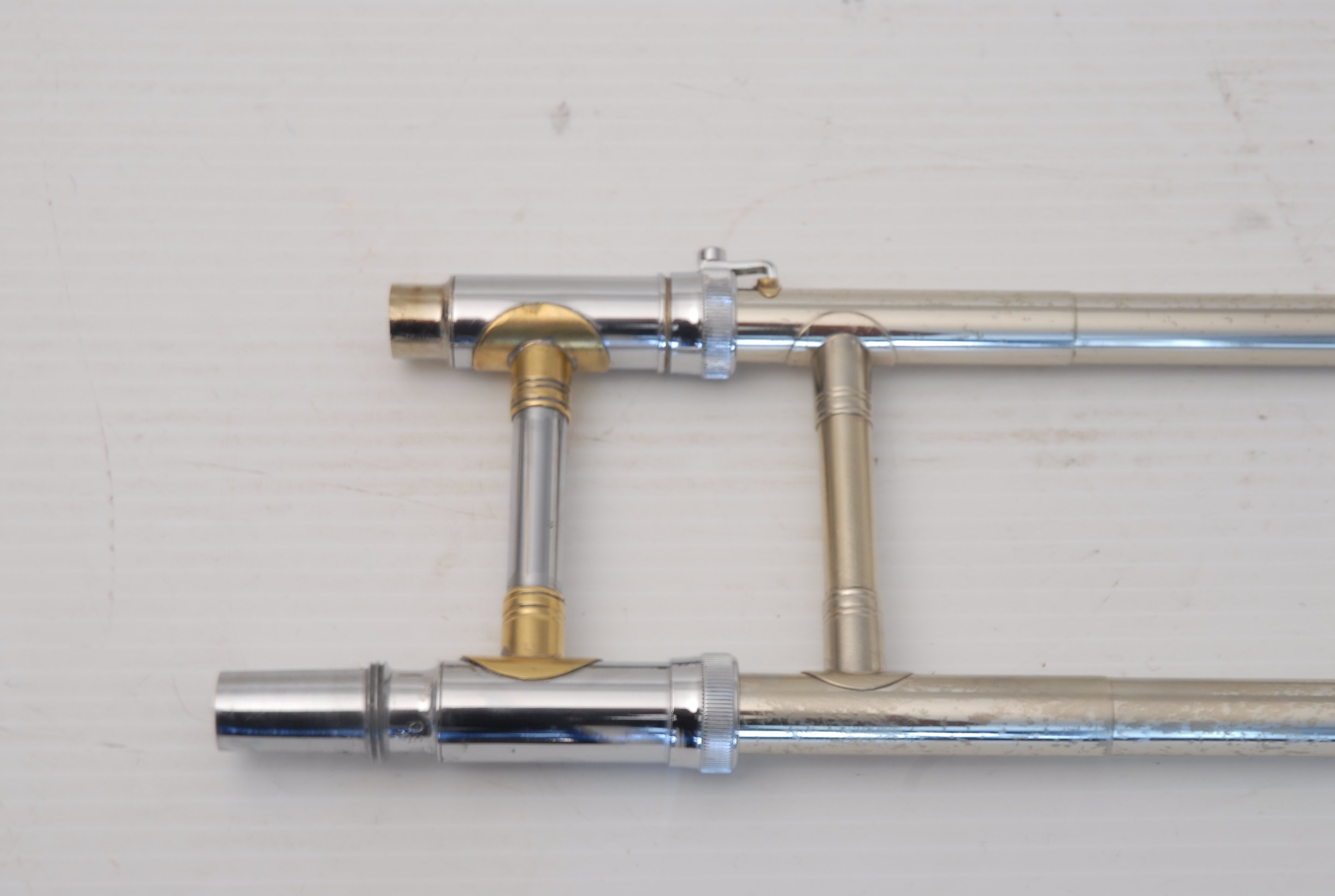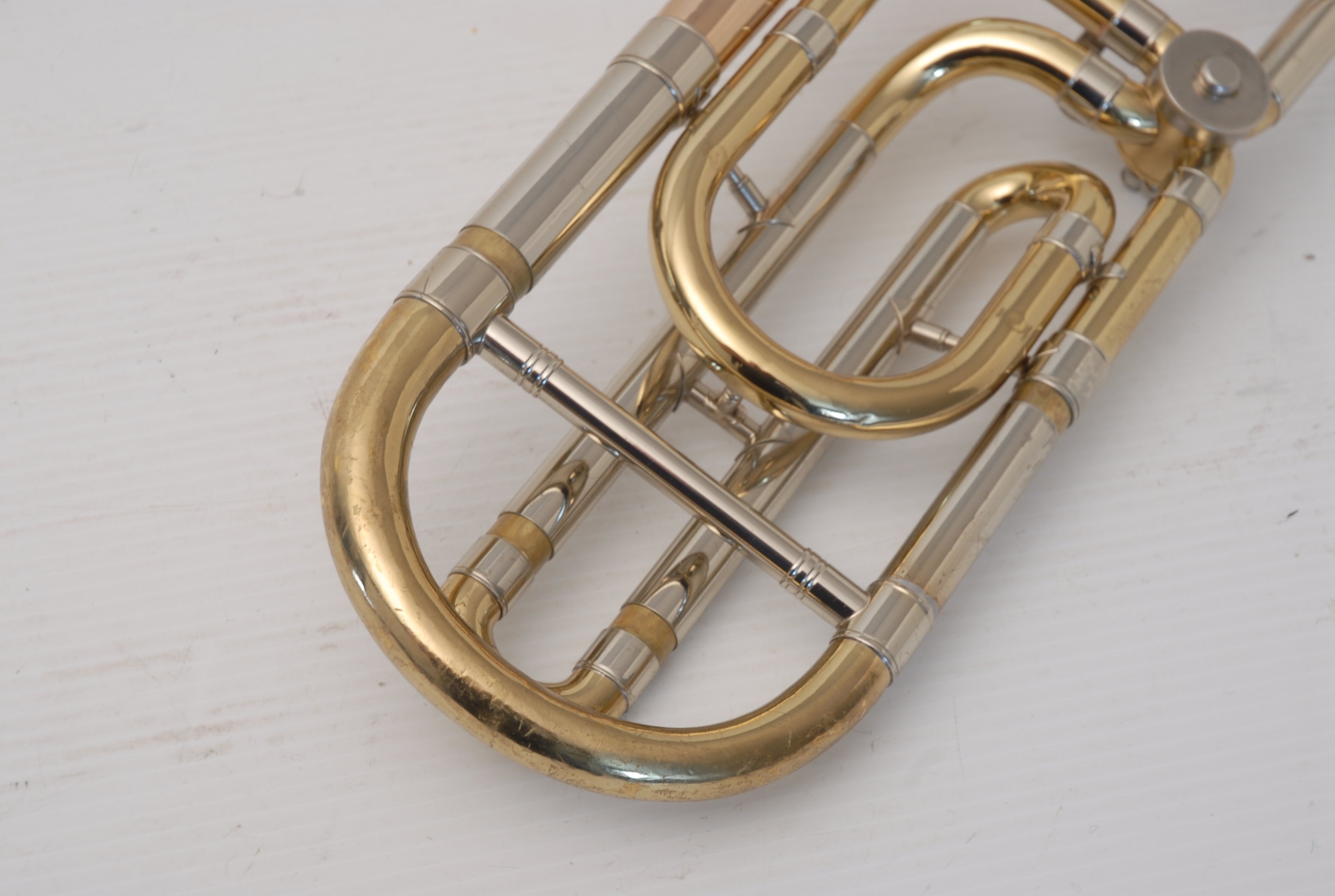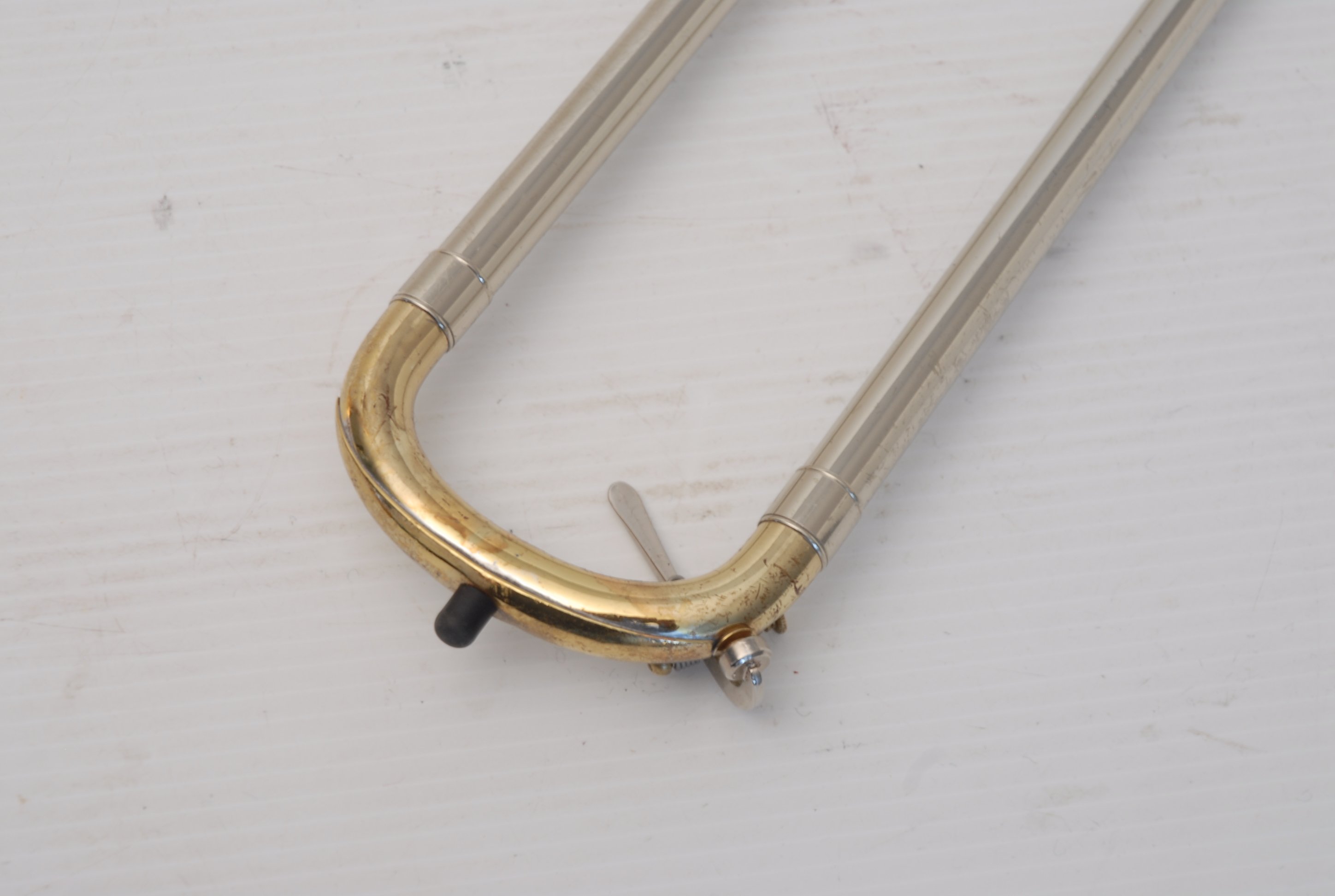 Holton TR150 Large Bore Tenor with F made in the mid 1970's. Has 8.75" gold brass bell, .547 nickel silver handslide. No dents or dings, previous repairs. Has had a chemical bath and been adjusted. Moderate lacquer wear over entire instrument. Handslide is OK despite some inner tube wear, of course reflected in the price. Would make an excellent first F attachement horn for and advancing young player. Comes with case and mouthpiece.