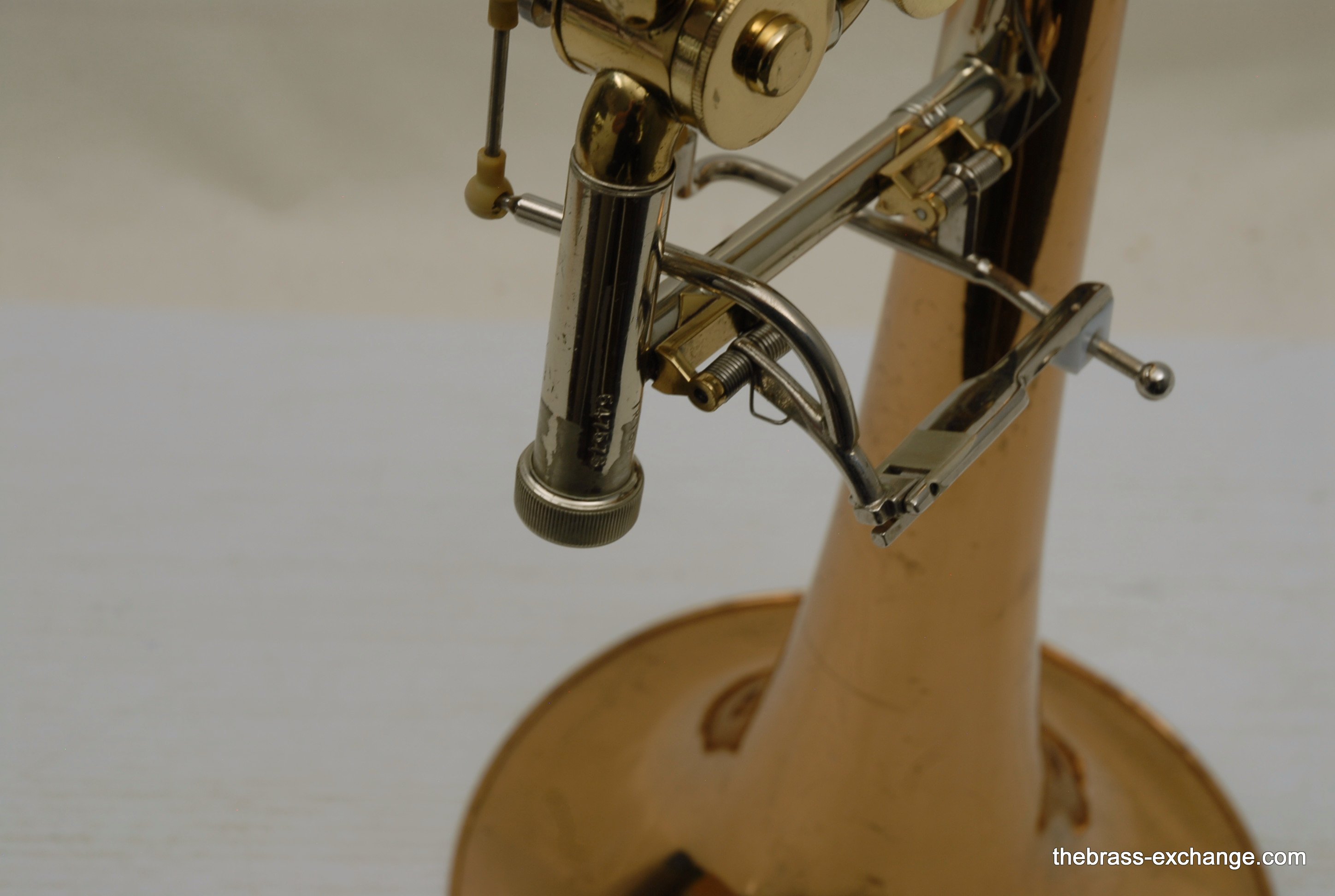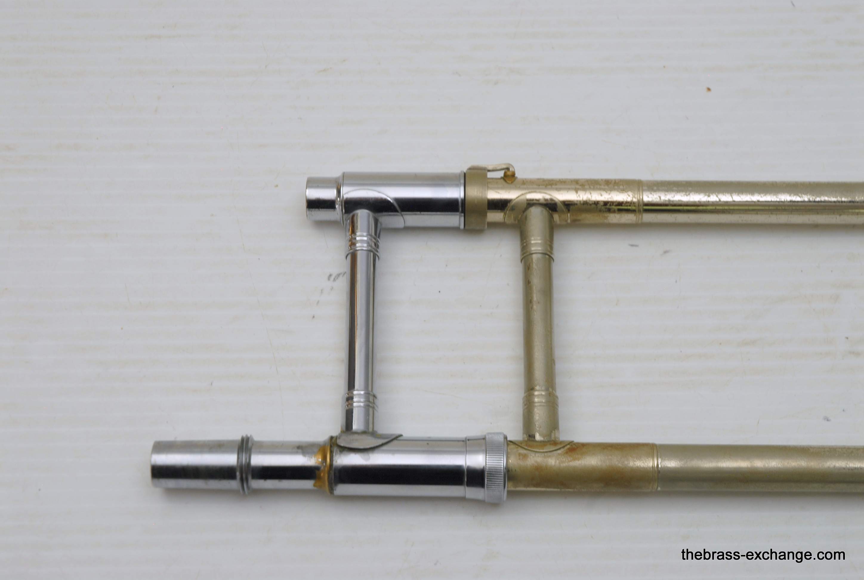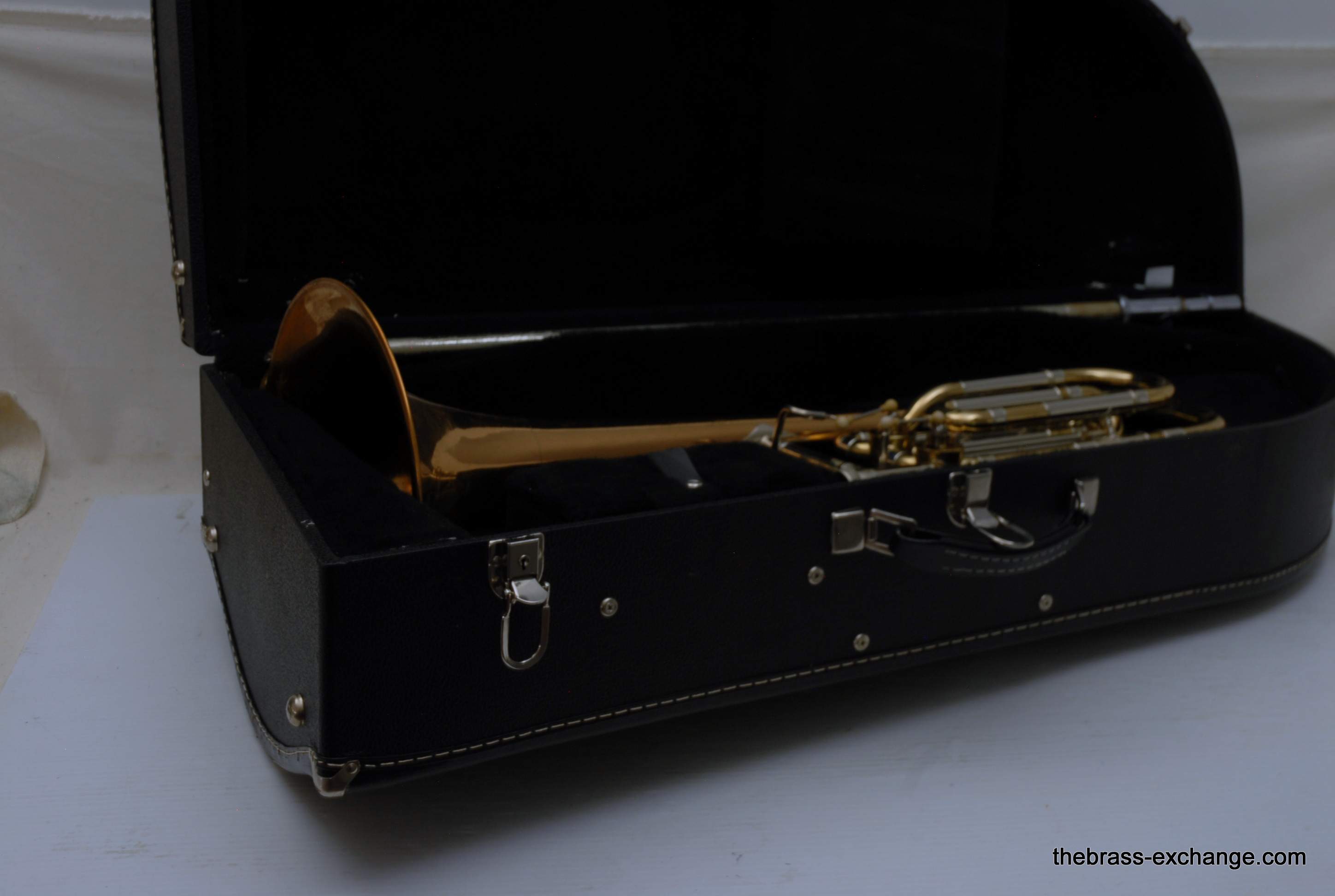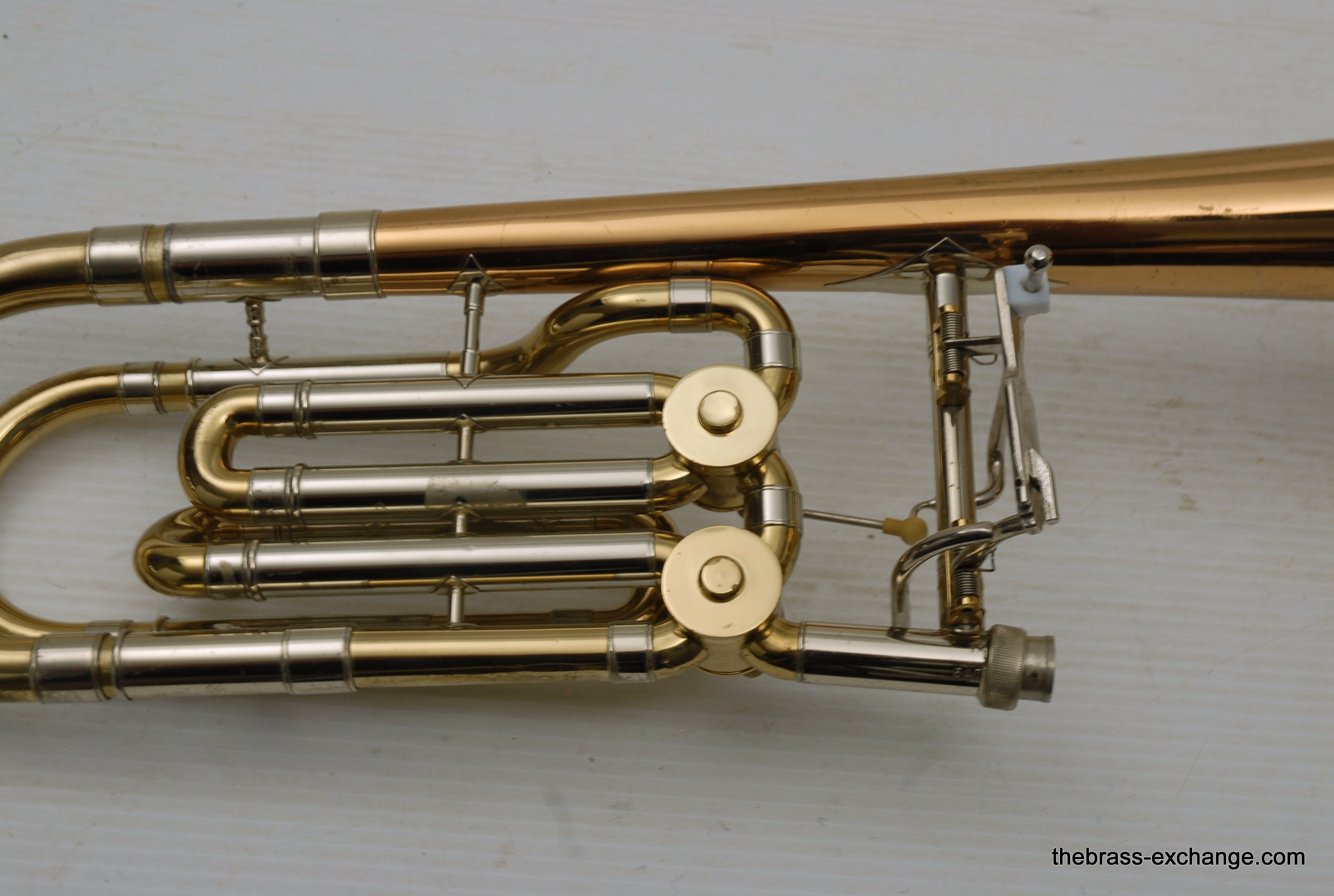 The bell section has received full shop service including dent removal, chemical cleaning, and rotor alignment. The instrument still retains its original lacquer and comes with a like-new Getzen bass trombone case.