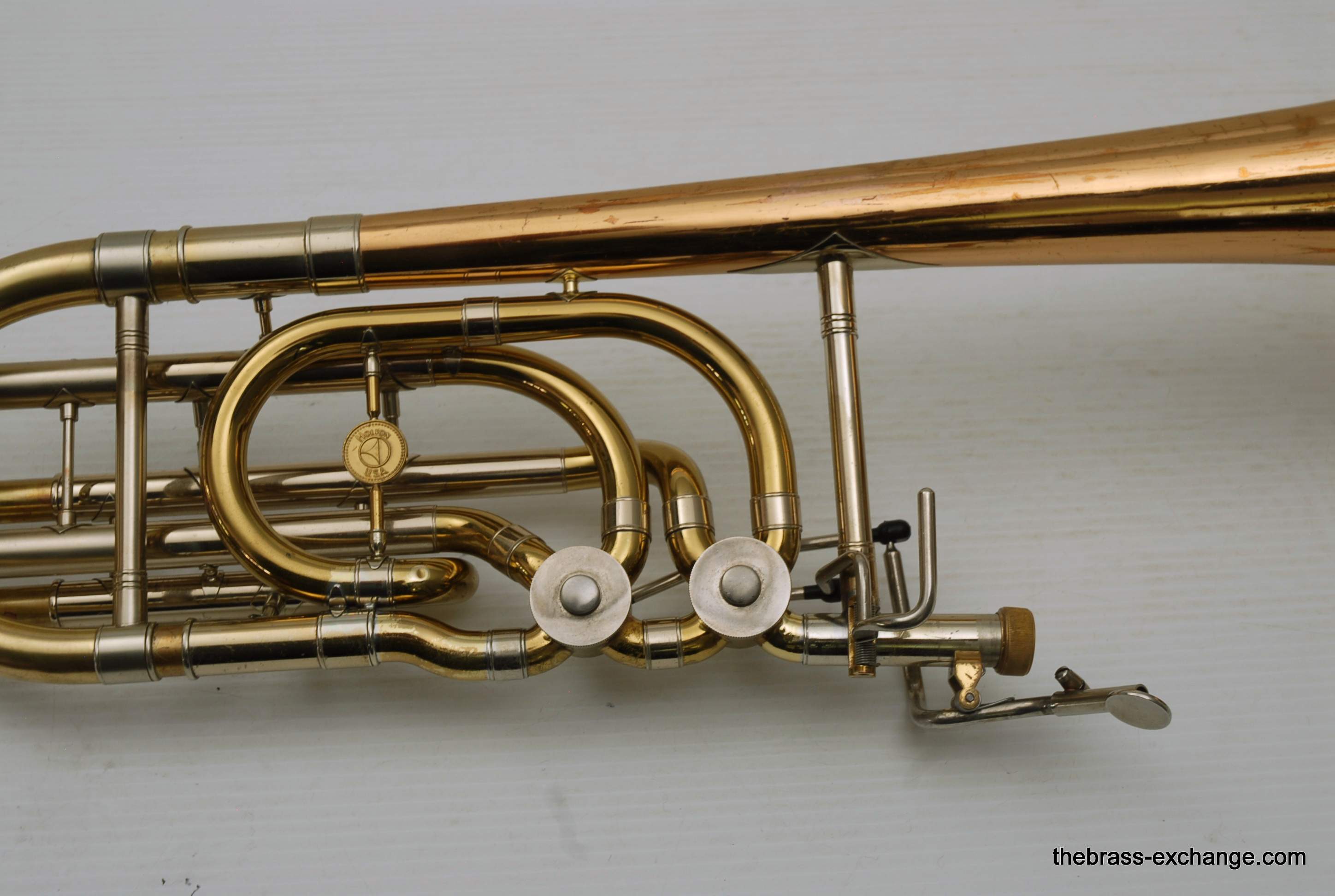Holton TR181 Independent Bass Trombone Bb/F/Gb/D, Made in the 1980's. All original parts and lacquer. This horn has a proven track record, and sure looks like it too. It isn't the prettiest one ever, but sure plays good. Has had full shop service including chemical bath and full once over. No dents or dings or issues with valve or hand slide. Minor wear spot on one inner tube, still feels smooth and not an issue, probably still way better slide action than most school owned bass trombones. Plays with big and dark sound. Would be an ideal first bass trombone for an advancing student not looking to go with a high dollar new horn today. Original case in good condition. In stock for immediate delivery.