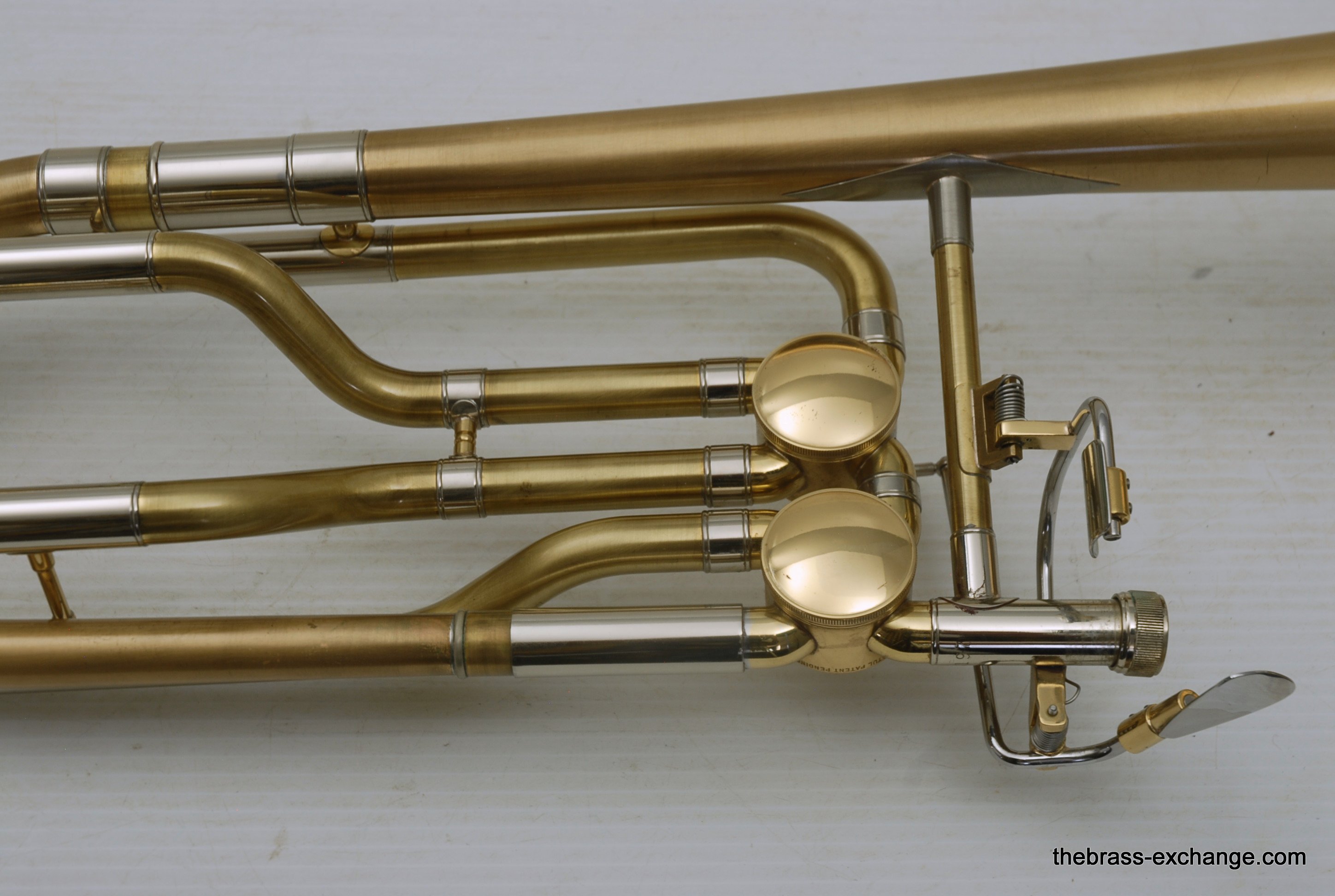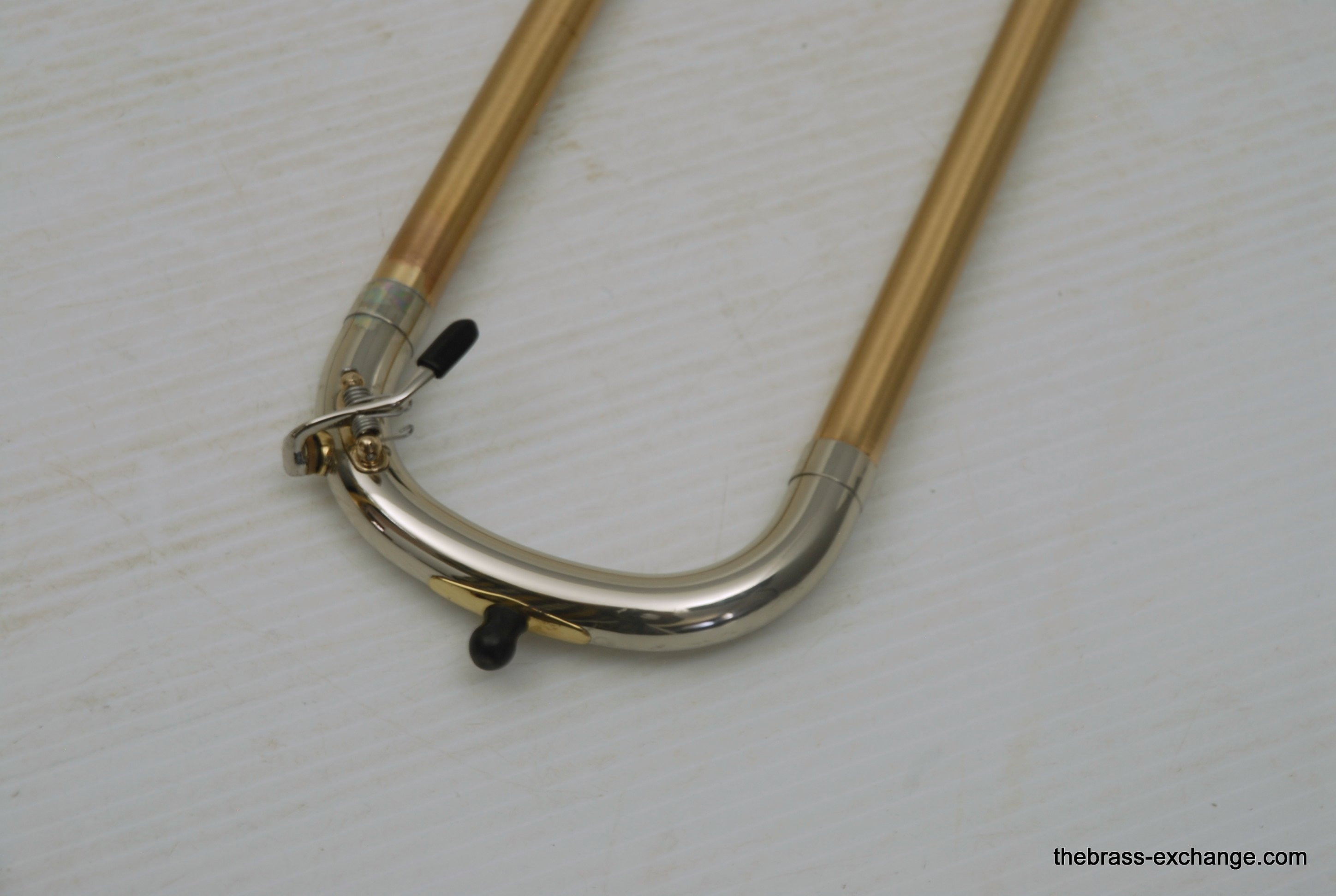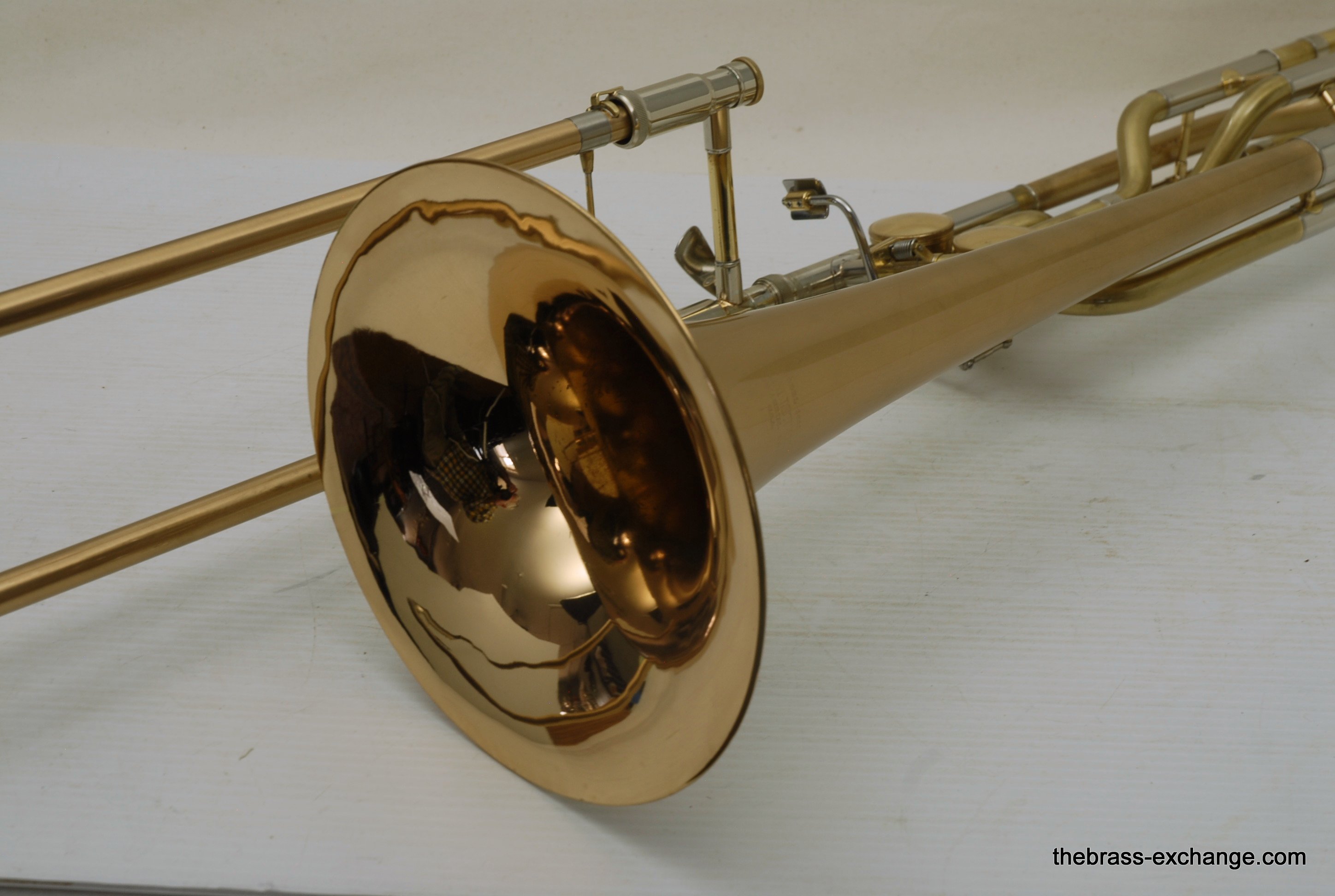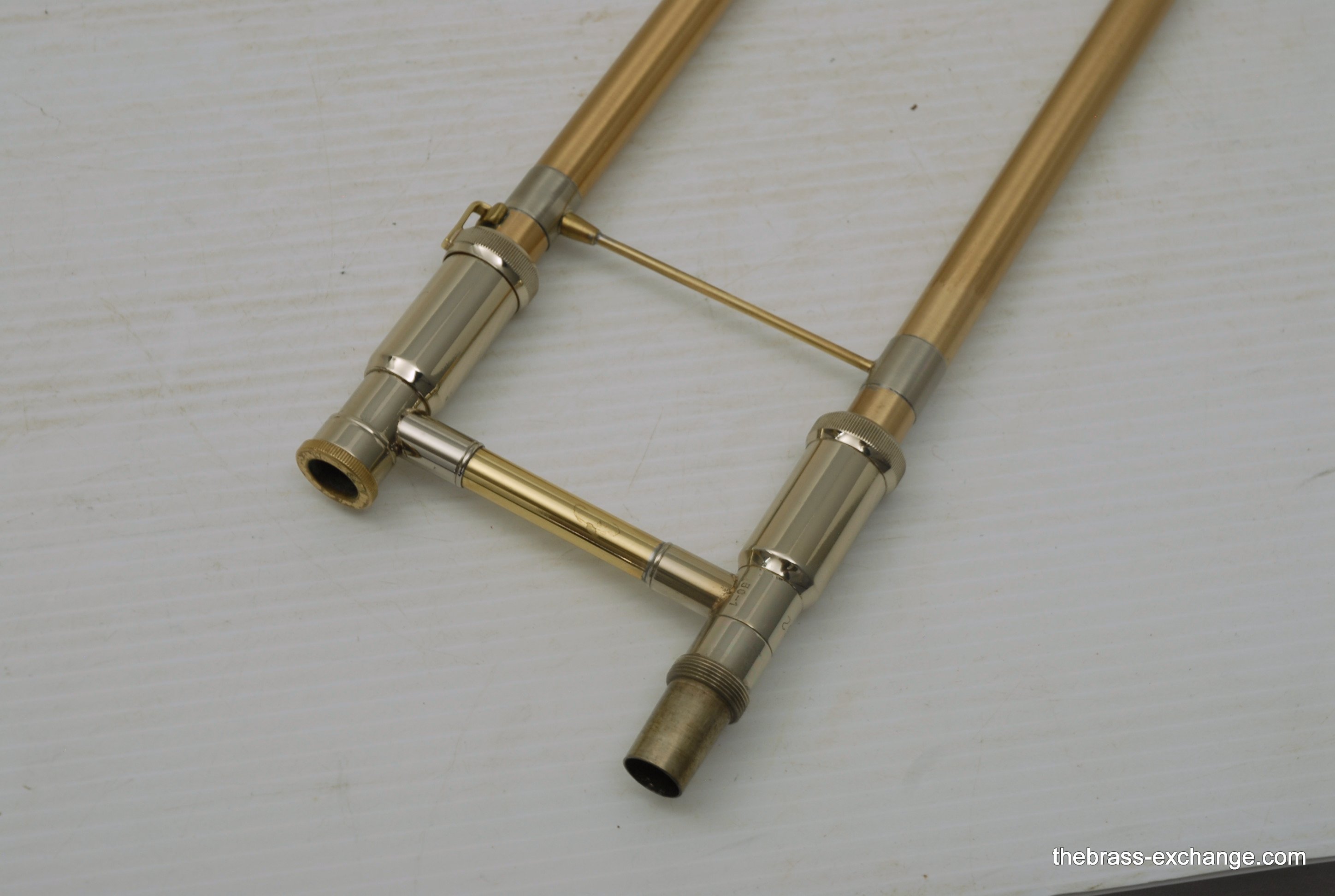 Bass Trombone Kanstul 1662 with custom satin finish. This is a 9.5" bronze bell, custom make with tuning in bell section vs. tuning in hand slide. The hand slide is a straight bore .562 with gold brass outer slide tubes and nickel silver end crook. Includes 3 removable leadpipes. The hand slide cross brace was modified by B.A.C. Horn Doctor in K.C. Tuning is Dependent Bb/F/GbD. The valve section plays fantastic and the hand slide is super light and free of tension. It's a great playing bass. The thin hand slide cross brace is evidently the same as the one that Elliot Mason plays on from B.A.C. This is a great bass for jazz or commercial style. Lot's of color, and splashes huge in the trigger range. Would work great in a big band. We would be happy to change the hand brace on the slide to a traditional nickel silver brace vs. the current thin brace for no extra cost. Please call or email for details, lead time. Comes with a Protec Propac Bass case in good condition.
