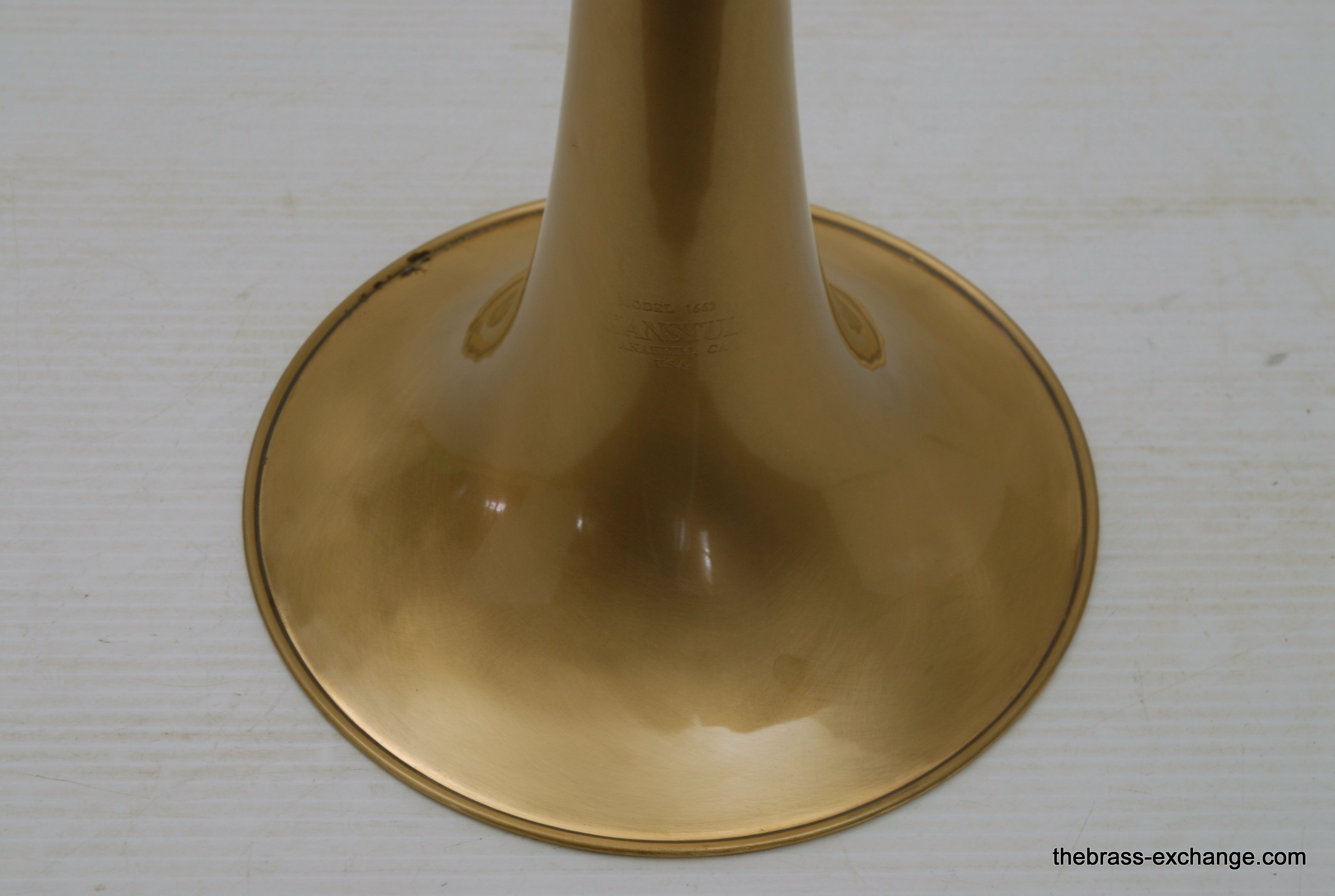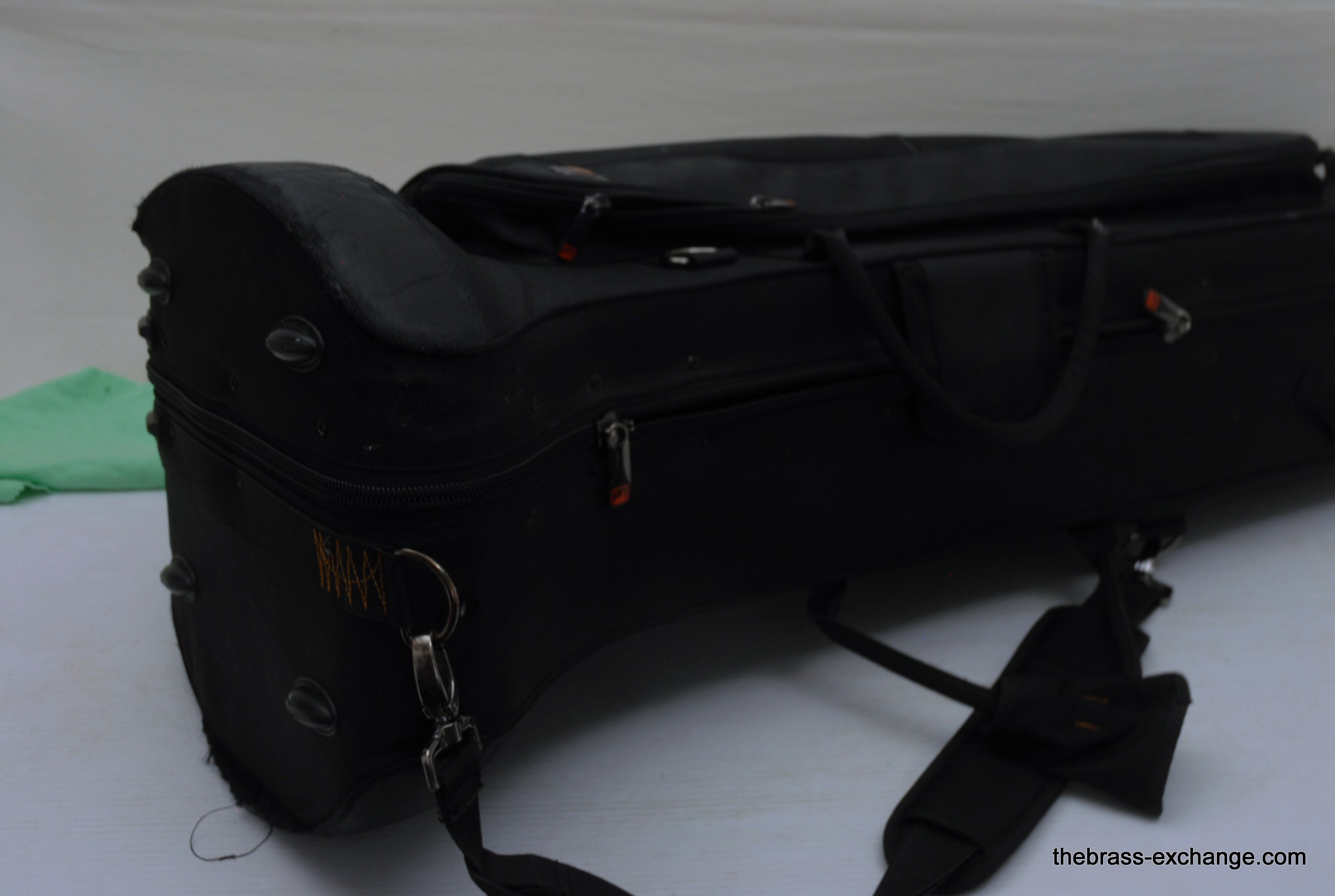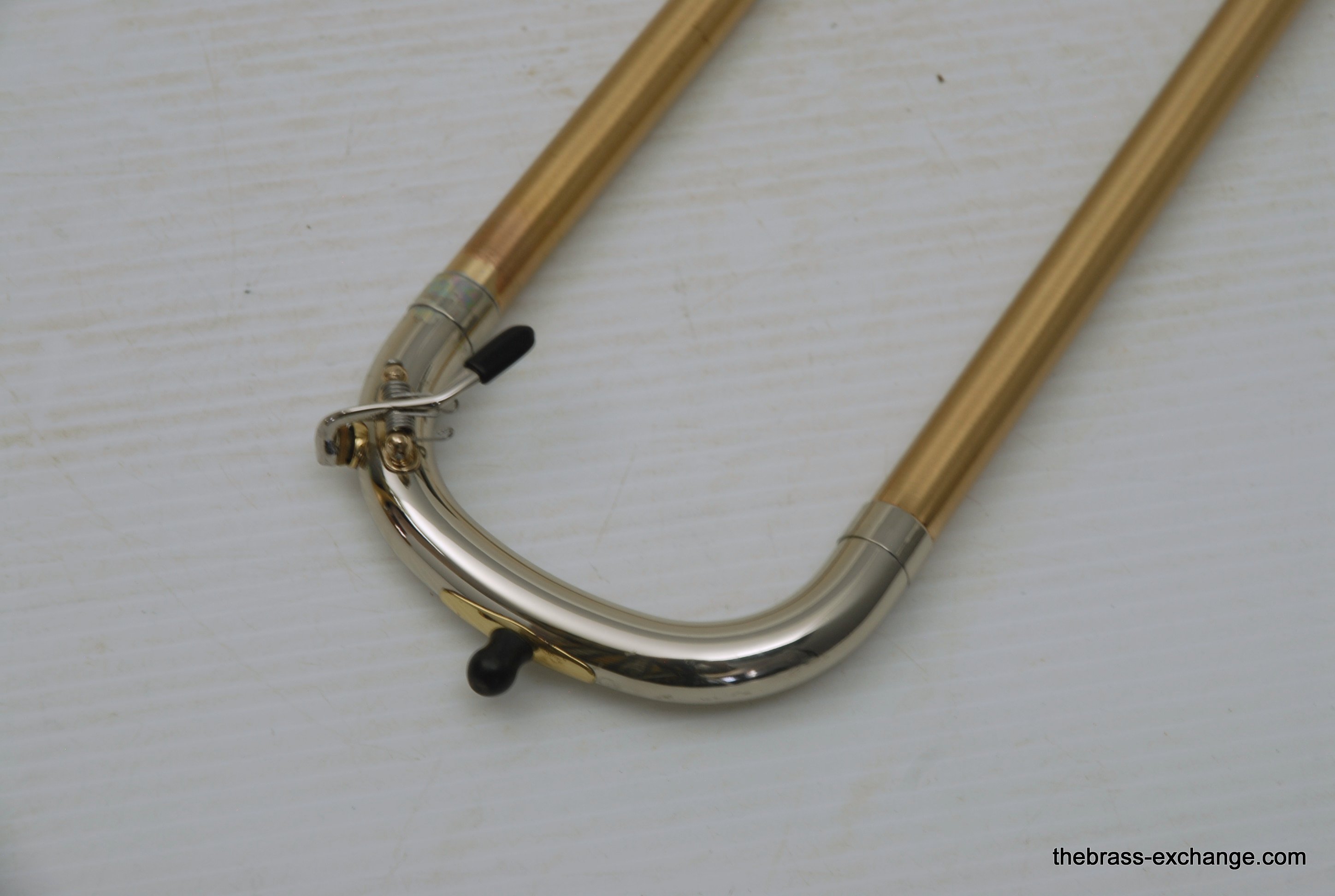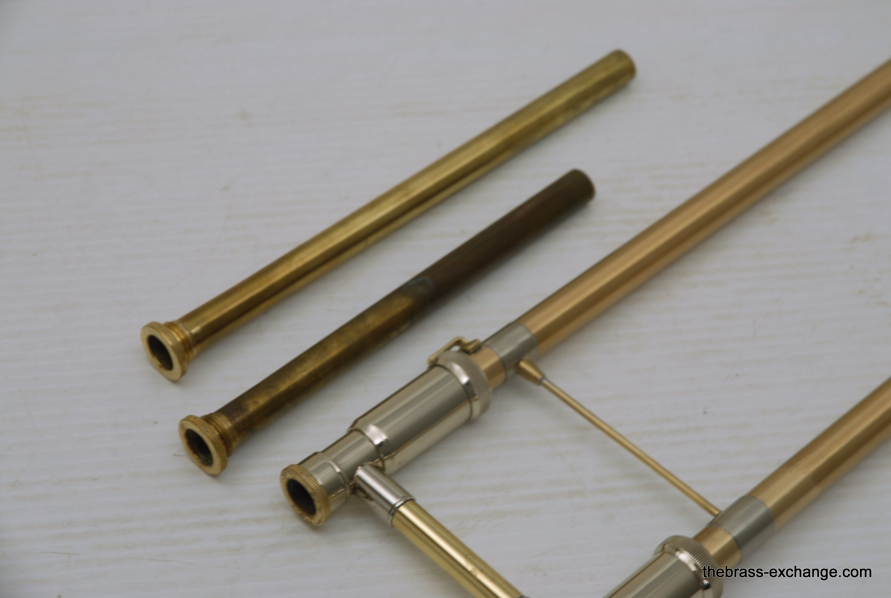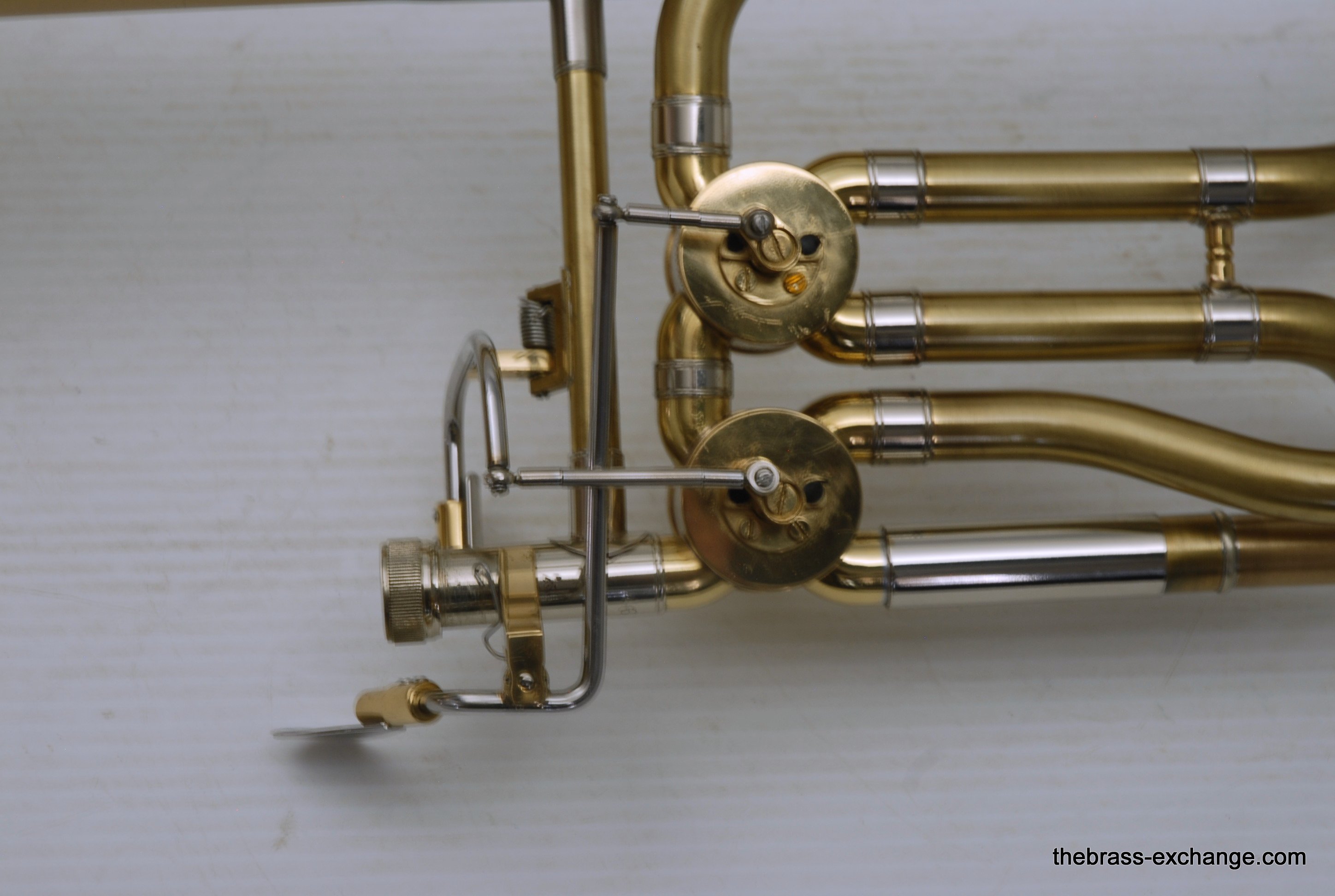 Bass Trombone Kanstul 1662 with custom satin finish. This is a 9.5" bronze bell, custom make with tuning in bell section vs. tuning in hand slide. The hand slide is a straight bore .562 with gold brass outer slide tubes and nickel silver end crook. Includes 3 removable leadpipes. The hand slide cross brace was modified by B.A.C. Horn Doctor in K.C. Tuning is Dependent Bb/F/GbD. The valve section plays fantastic and the hand slide is super light and free of tension. It's a great playing bass. The thin hand slide cross brace is evidently the same as the one that Elliot Mason plays on from B.A.C. This is a great bass for jazz or commercial style. Lot's of color, and splashes huge in the trigger range. Would work great in a big band. We would be happy to change the hand brace on the slide to a traditional nickel silver brace vs. the current thin brace for no extra cost. Please call or email for details, lead time. Comes with a Protec Propac Bass case in good condition.