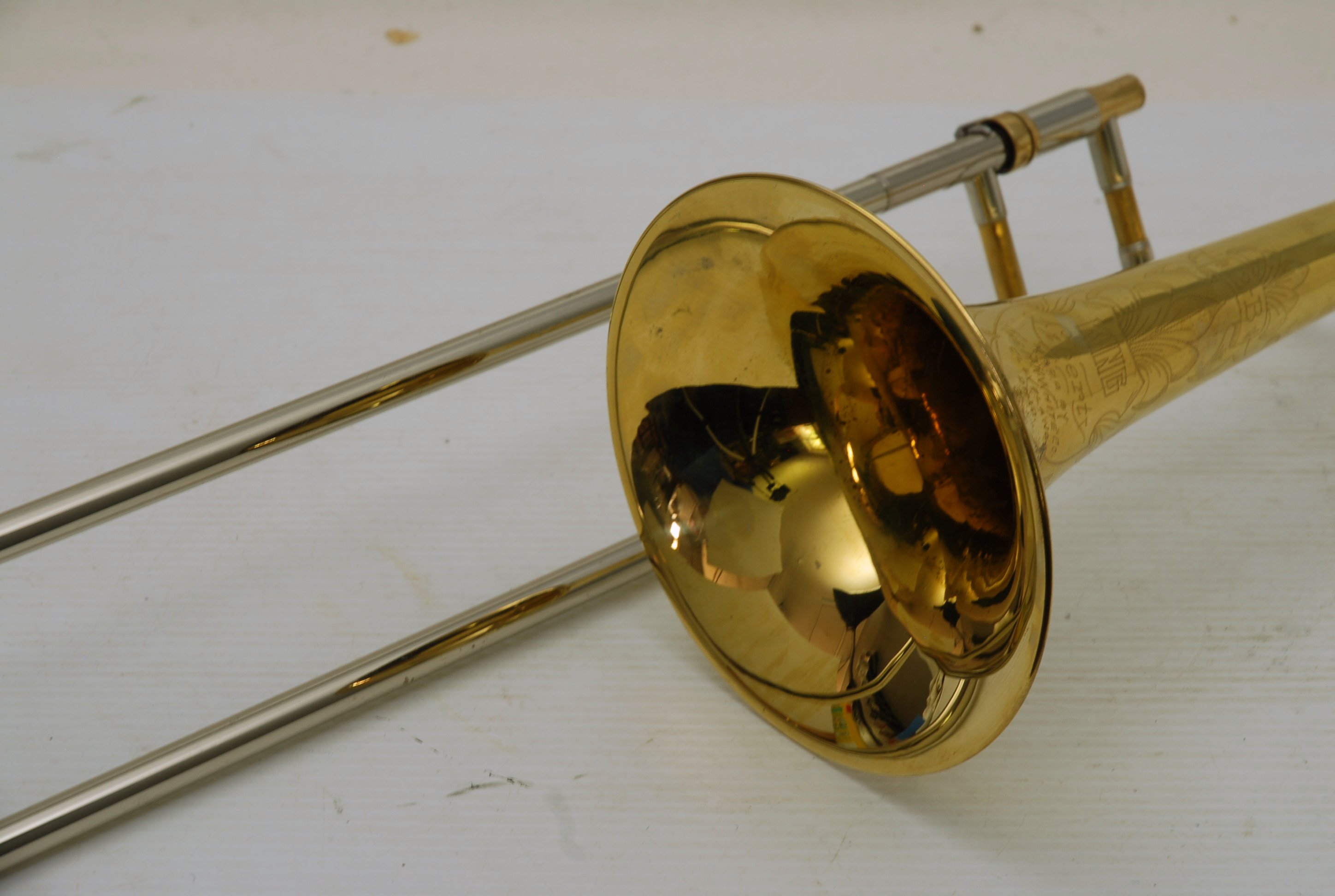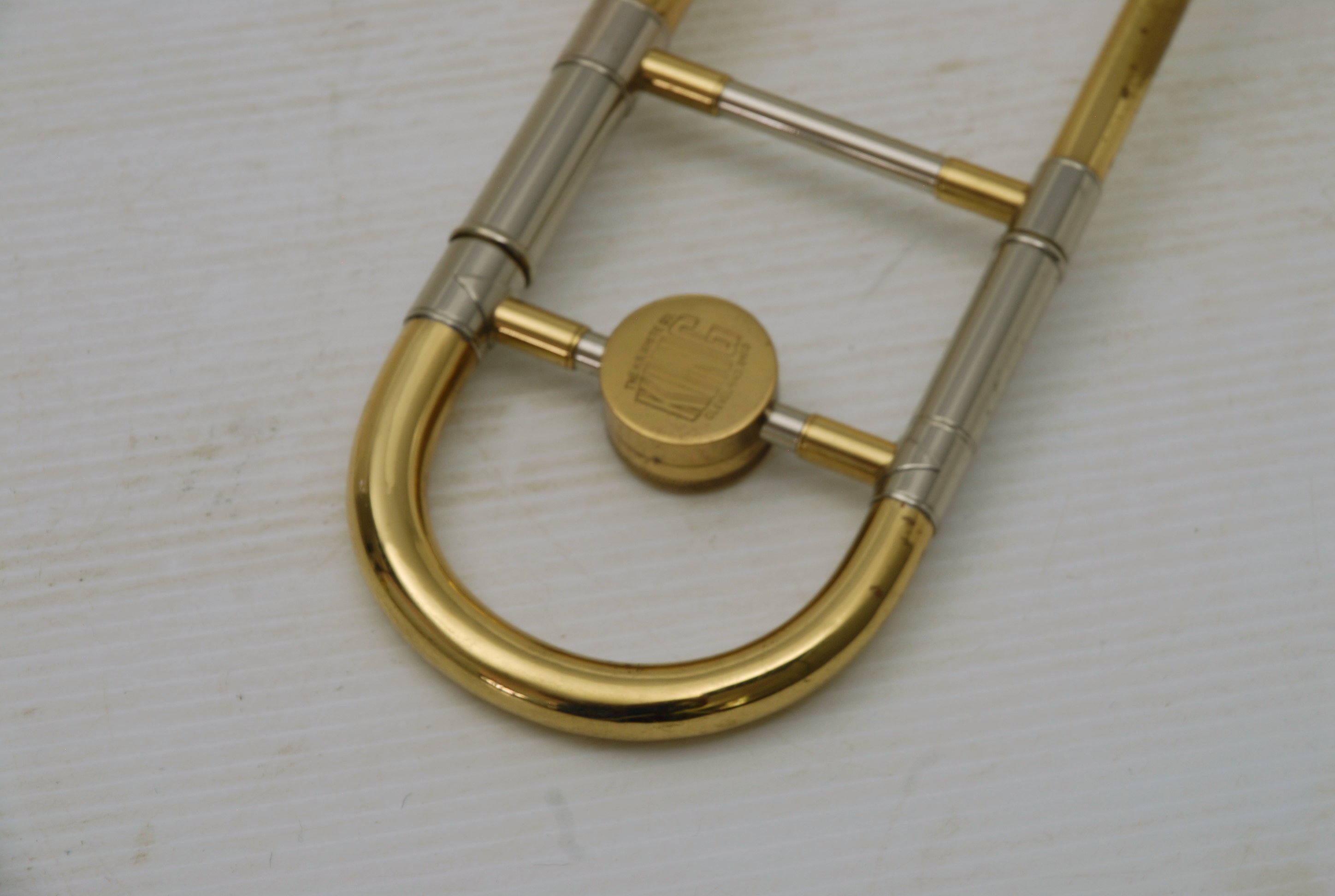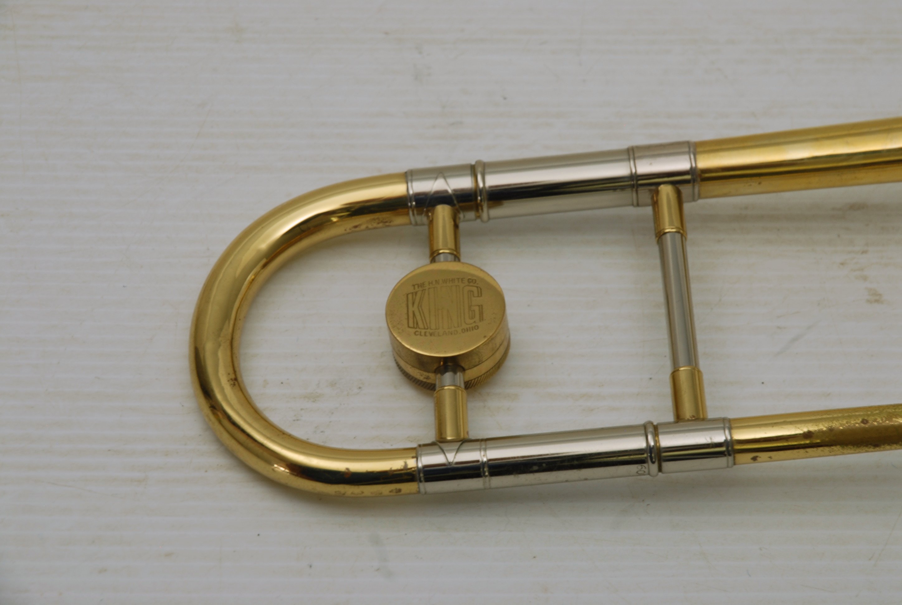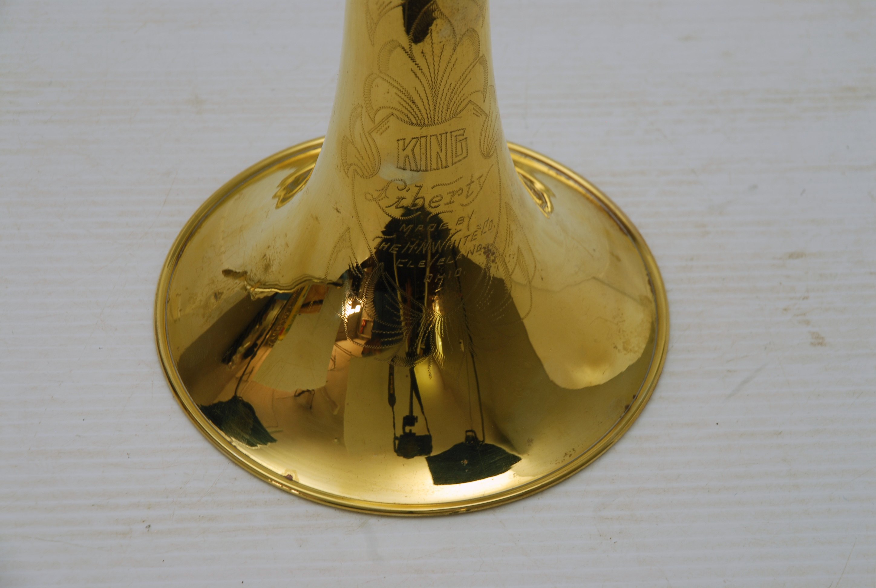 King 2B Liberty H.N. White Era, Vintage 1953. All original parts & Lacquer. This is a very nice classic H.N. White 2B without any issues or prior damage. Lacquer has been removed from the bell flare on up. All original lacquer on the rest of the horn. Handslide is super straight and no issues with inner slide tubes. Would be a great lead or jazz horn for any serious player looking for that classic King sound. This is the Tommy Dorsey model, ideal for big band, lead, solo. Original Burgundy leather wrapped coffin case included.