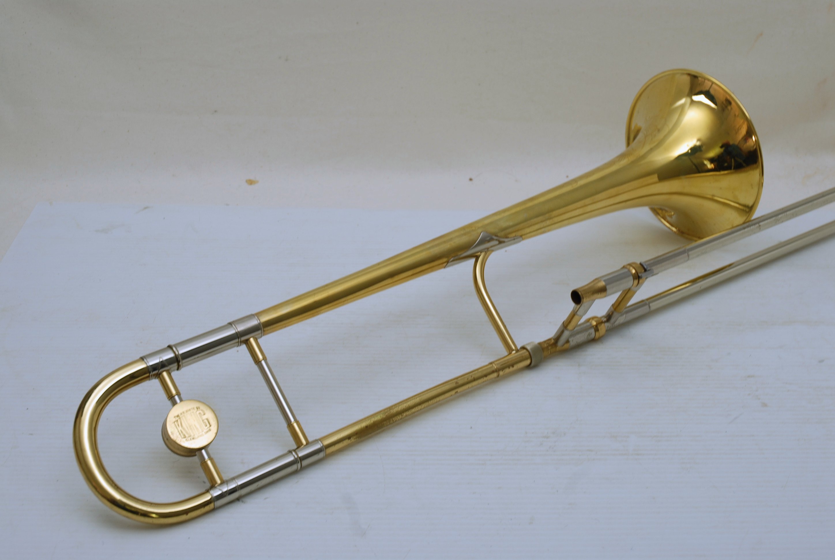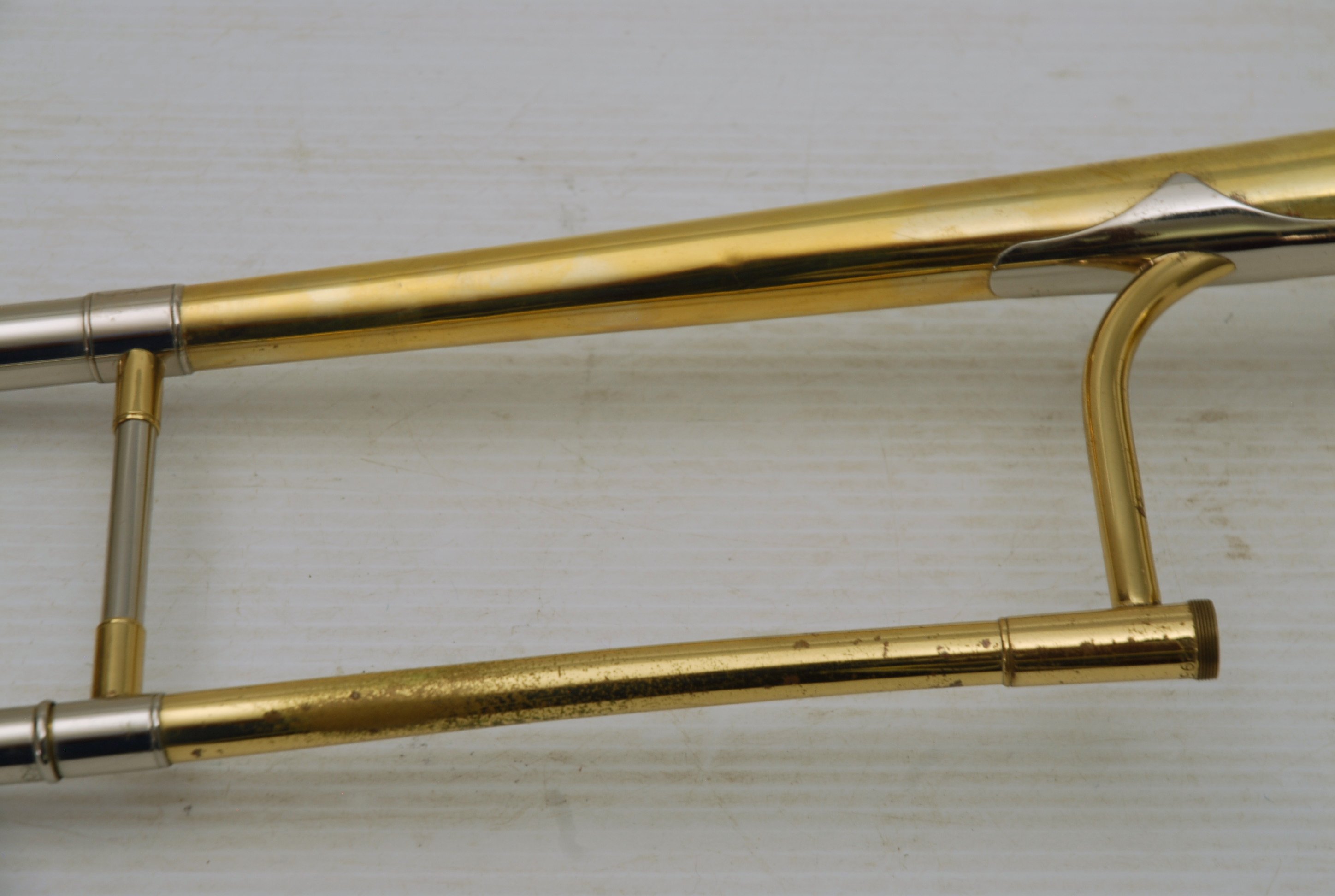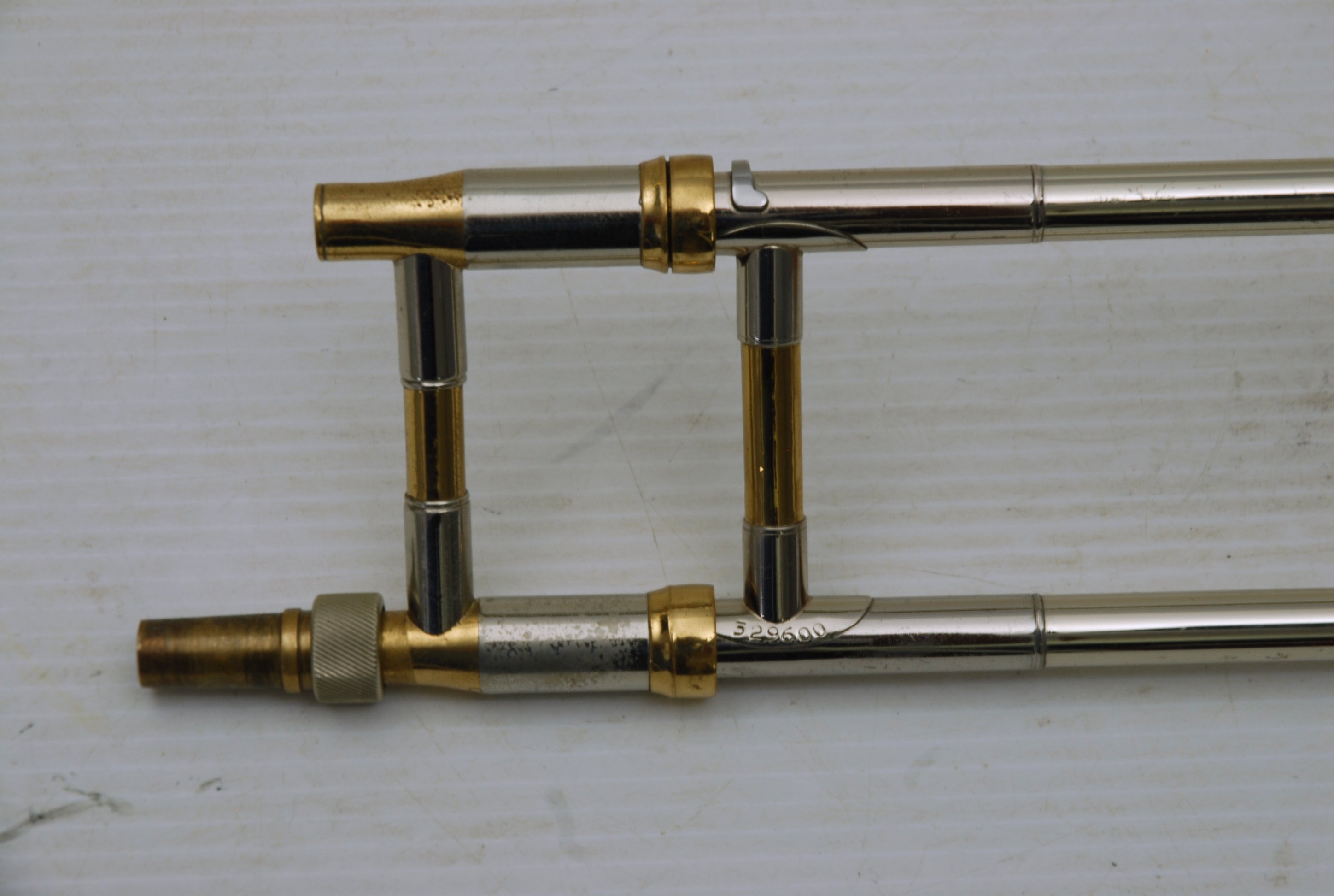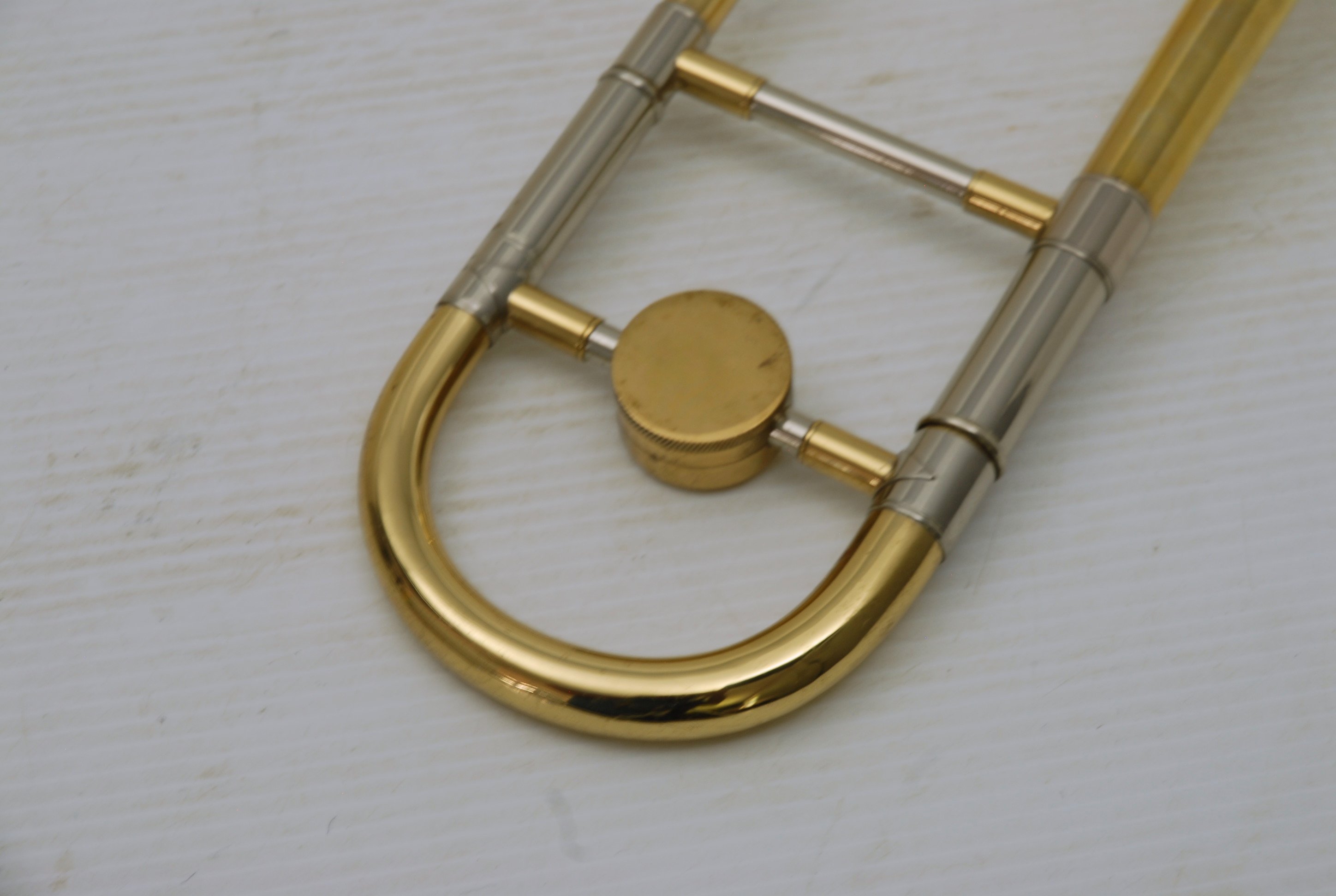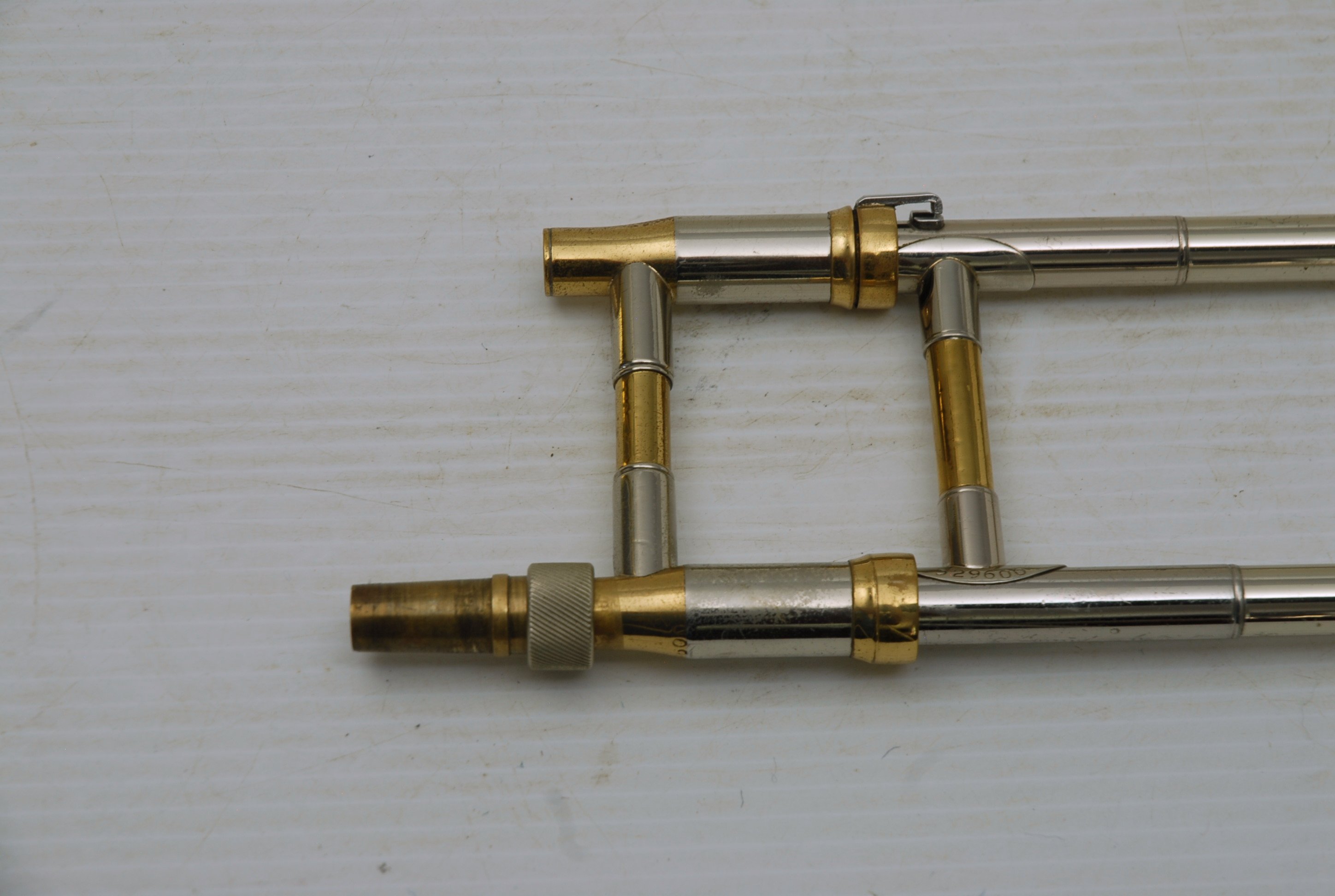 King 2B Liberty H.N. White Era, Vintage 1953. All original parts & Lacquer. This is a very nice classic H.N. White 2B without any issues or prior damage. Lacquer has been removed from the bell flare on up. All original lacquer on the rest of the horn. Handslide is super straight and no issues with inner slide tubes. Would be a great lead or jazz horn for any serious player looking for that classic King sound. This is the Tommy Dorsey model, ideal for big band, lead, solo. Original Burgundy leather wrapped coffin case included.