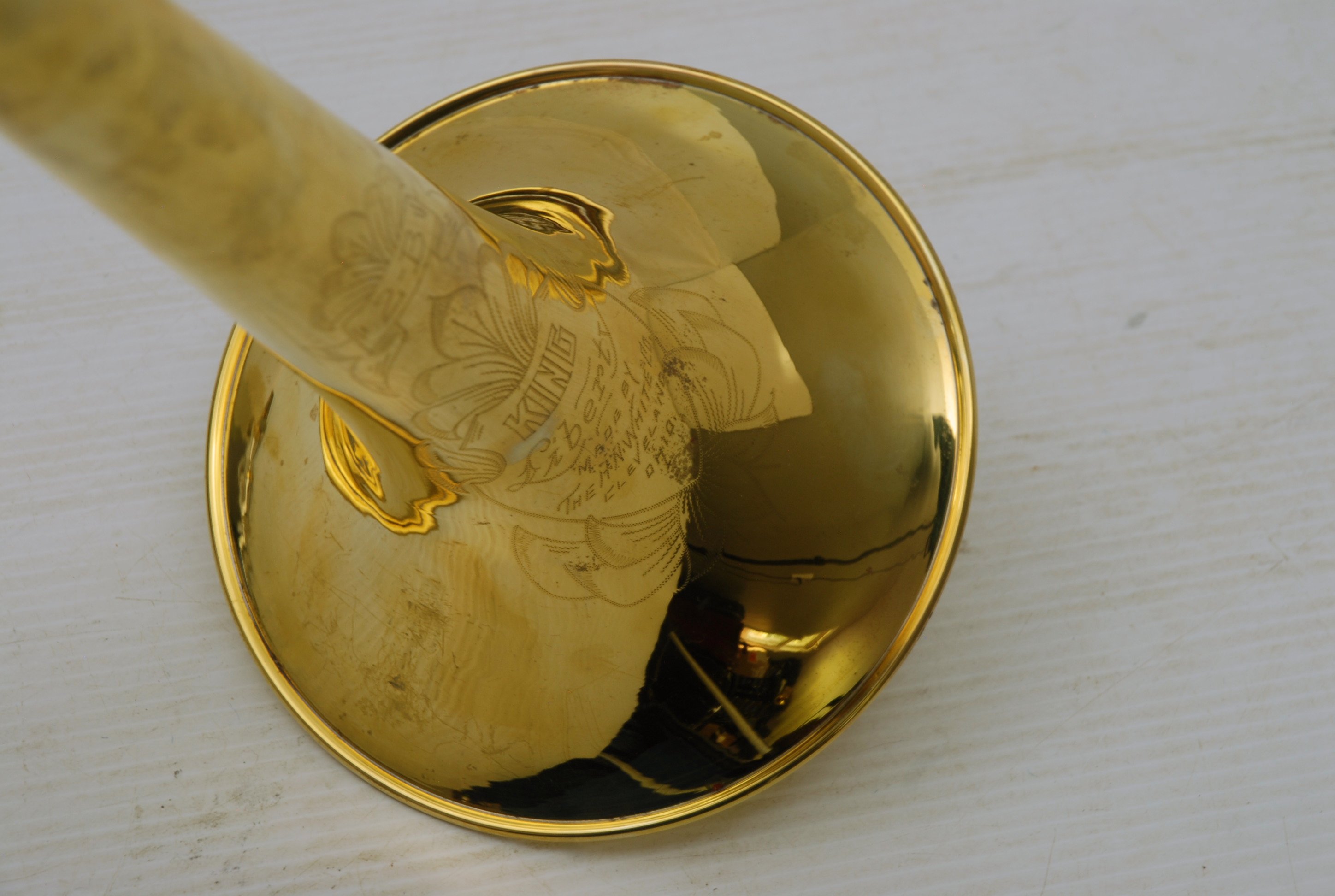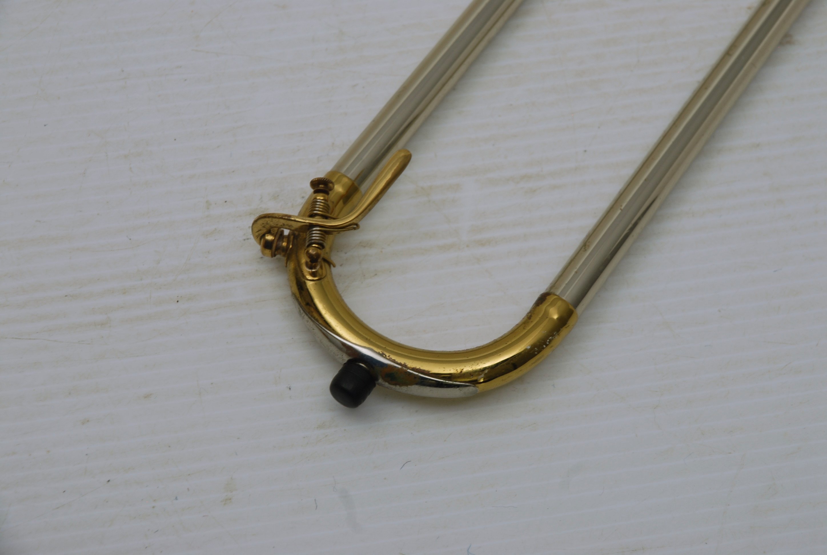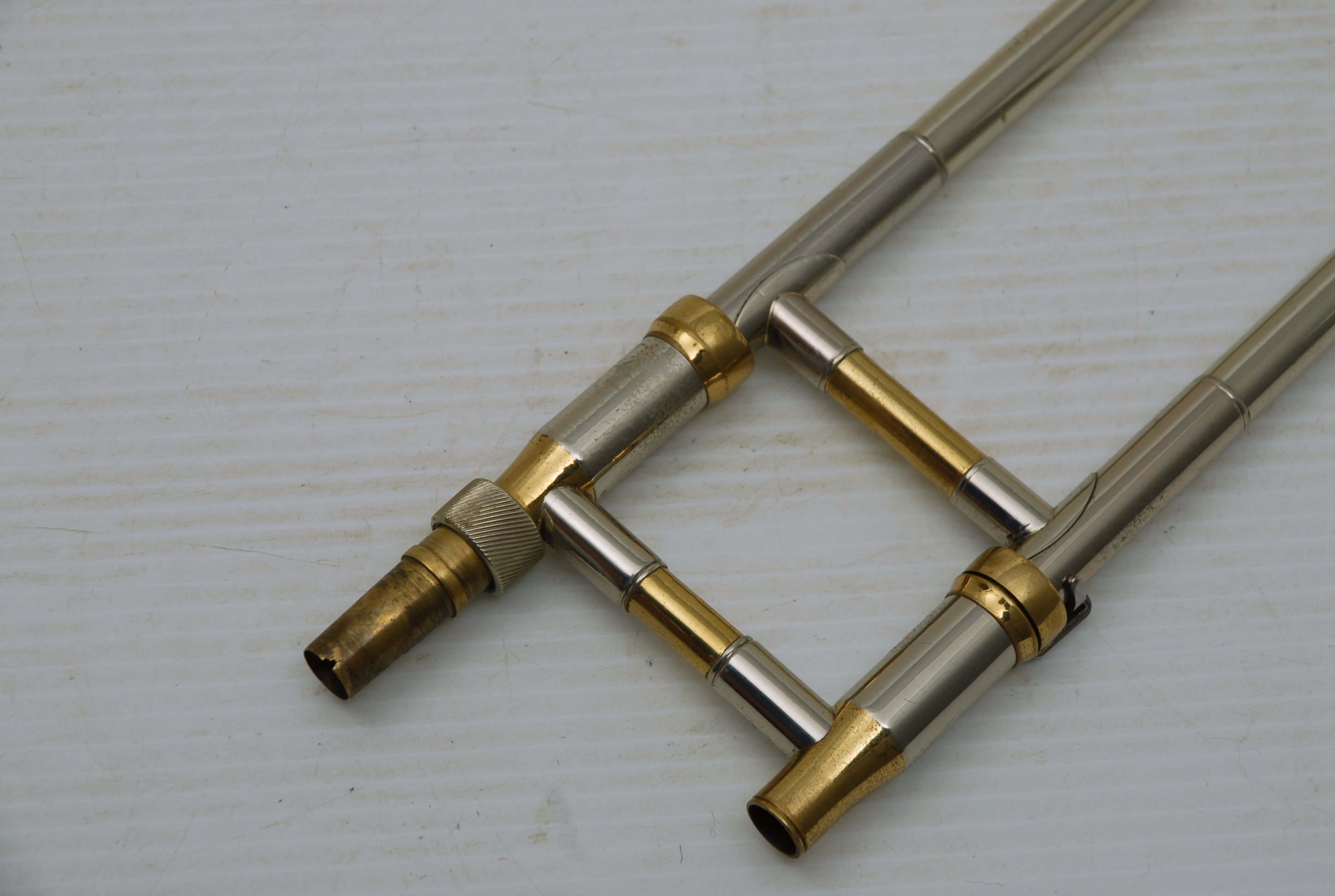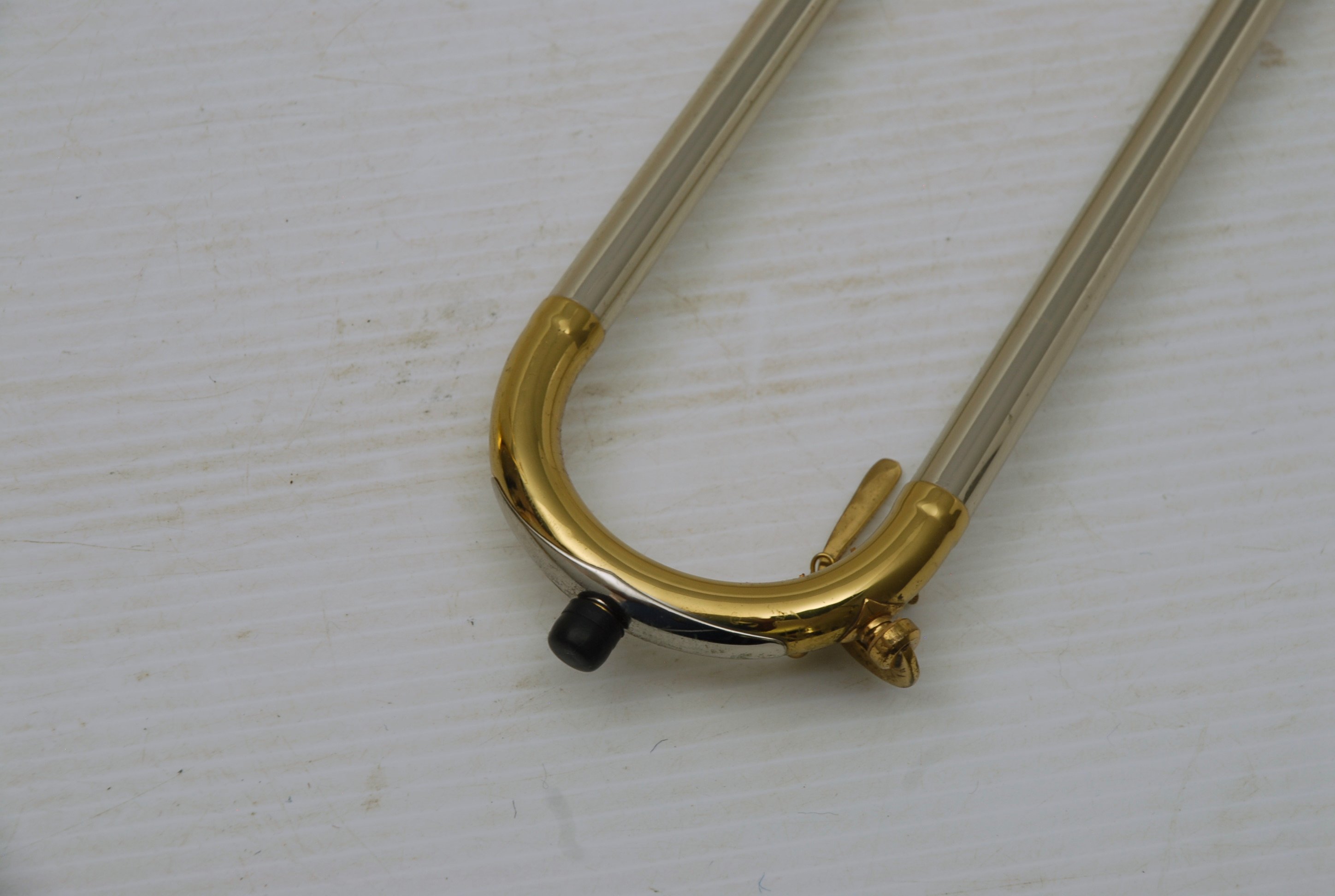 King 2B Liberty H.N. White Era, Vintage 1953. All original parts & Lacquer. This is a very nice classic H.N. White 2B without any issues or prior damage. Lacquer has been removed from the bell flare on up. All original lacquer on the rest of the horn. Handslide is super straight and no issues with inner slide tubes. Would be a great lead or jazz horn for any serious player looking for that classic King sound. This is the Tommy Dorsey model, ideal for big band, lead, solo. Original Burgundy leather wrapped coffin case included.