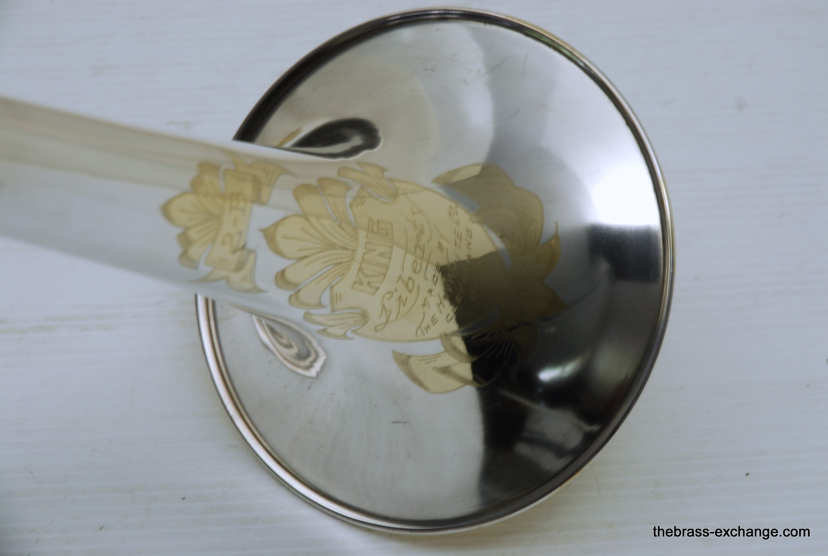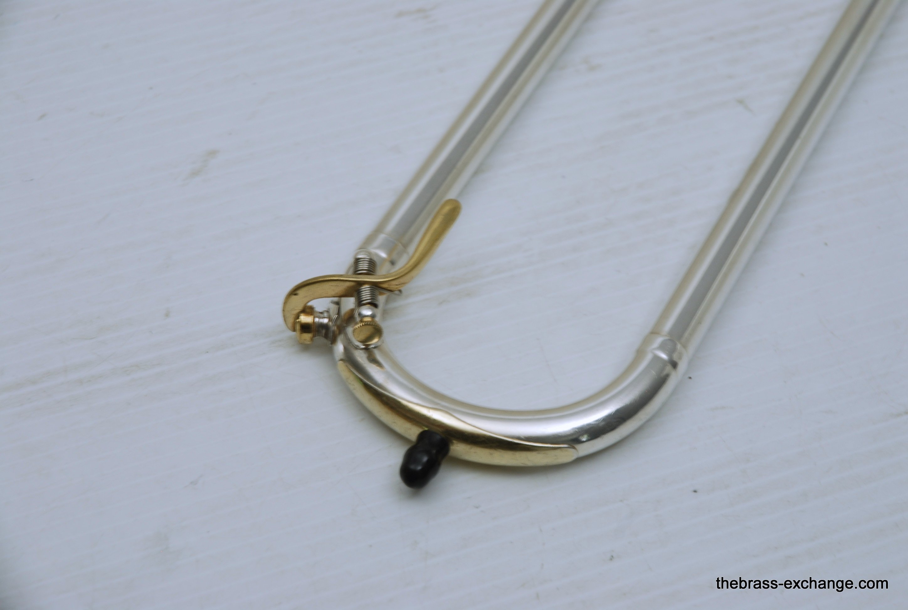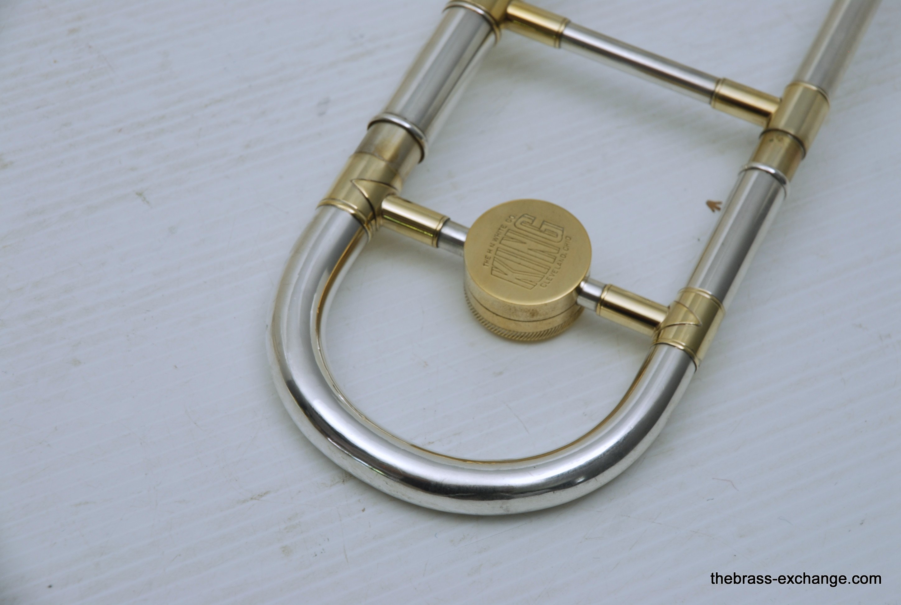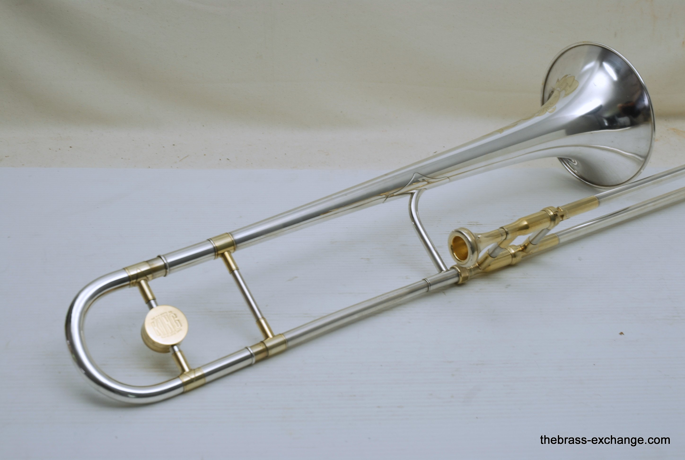 King 2B Liberty vintage 1955 H.N. White Era. If you were a lead player or soloist like Dorsey, Kai Winding, or Urbie Green during the big band era, you most likely would have choosen a 2B as your axe of choice. This is a special make 2B. It is not a silversonic, sterling silver bell. this is a yellow brass 2B Liberty with silver and gold plating. We think that Dorsey would have loved this horn. It is in perfect condition and has had full shop service, chemical bath, small dings and imperfections removed. All of the silver plating is intact. The gold plated inner bell is 100%. Other areas of gold plating include the hand braces on the slide grip, cork barrels, oversleeves, ferrels, tuning slide bracing, and of course balance weight. The floral engraving is crisp, and looks like it was made yesterday, even though this instrument is from 1955. It has indeed been closet kept by the original pruchaser for many years. Original coffin case is in near perfect condition. Comes with a gold plated King M21 (J.J. Johnson) Mouthpiece. Is both a collectors piece as well as a players horn. Many 2B and 3B's have passed through this shop over the past 10 years, never any 2B's quite like this one. Price includes a full handslide pro set up. If no set-up desired, take off $150, yes, totally playable as is, but why not make it perfect.