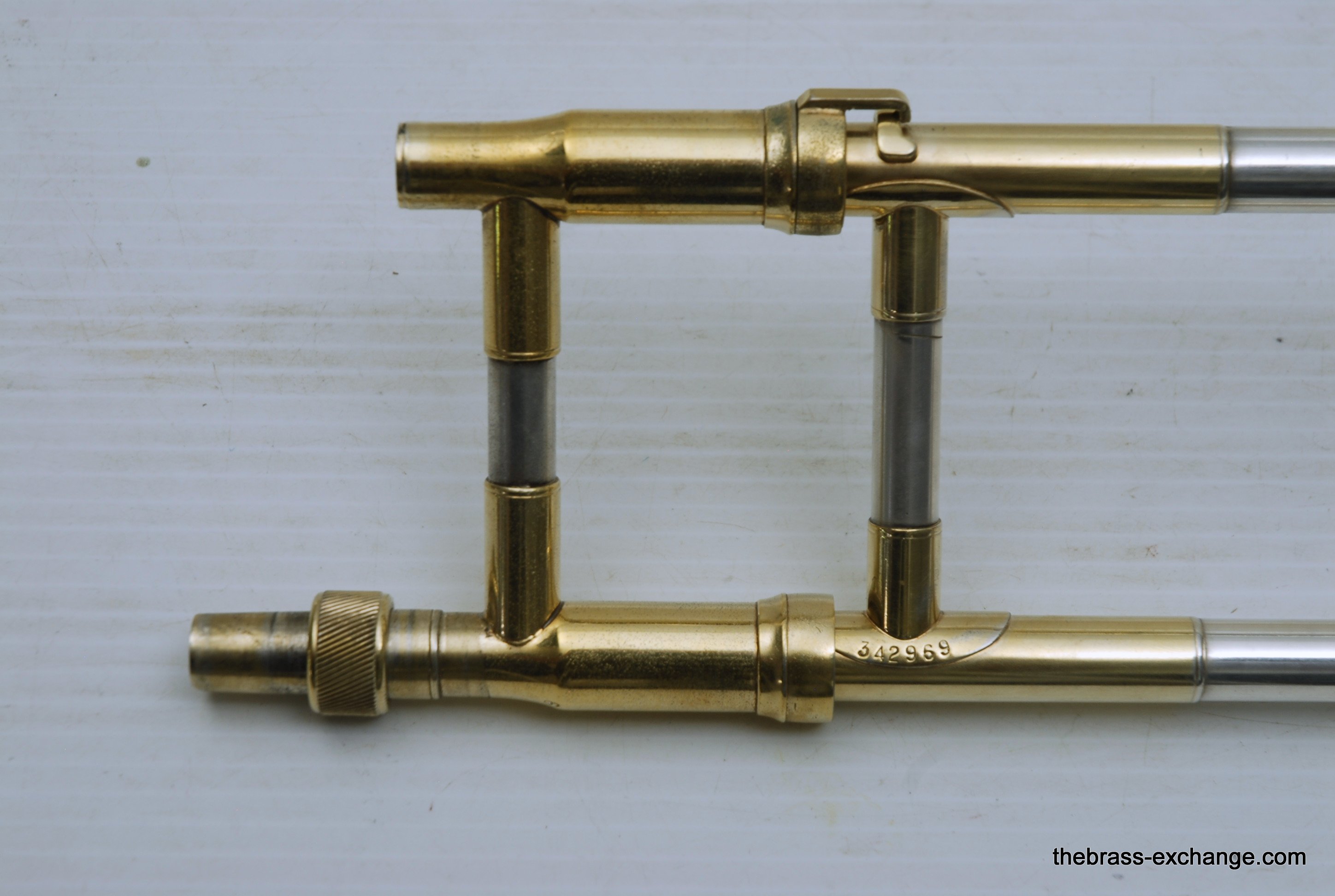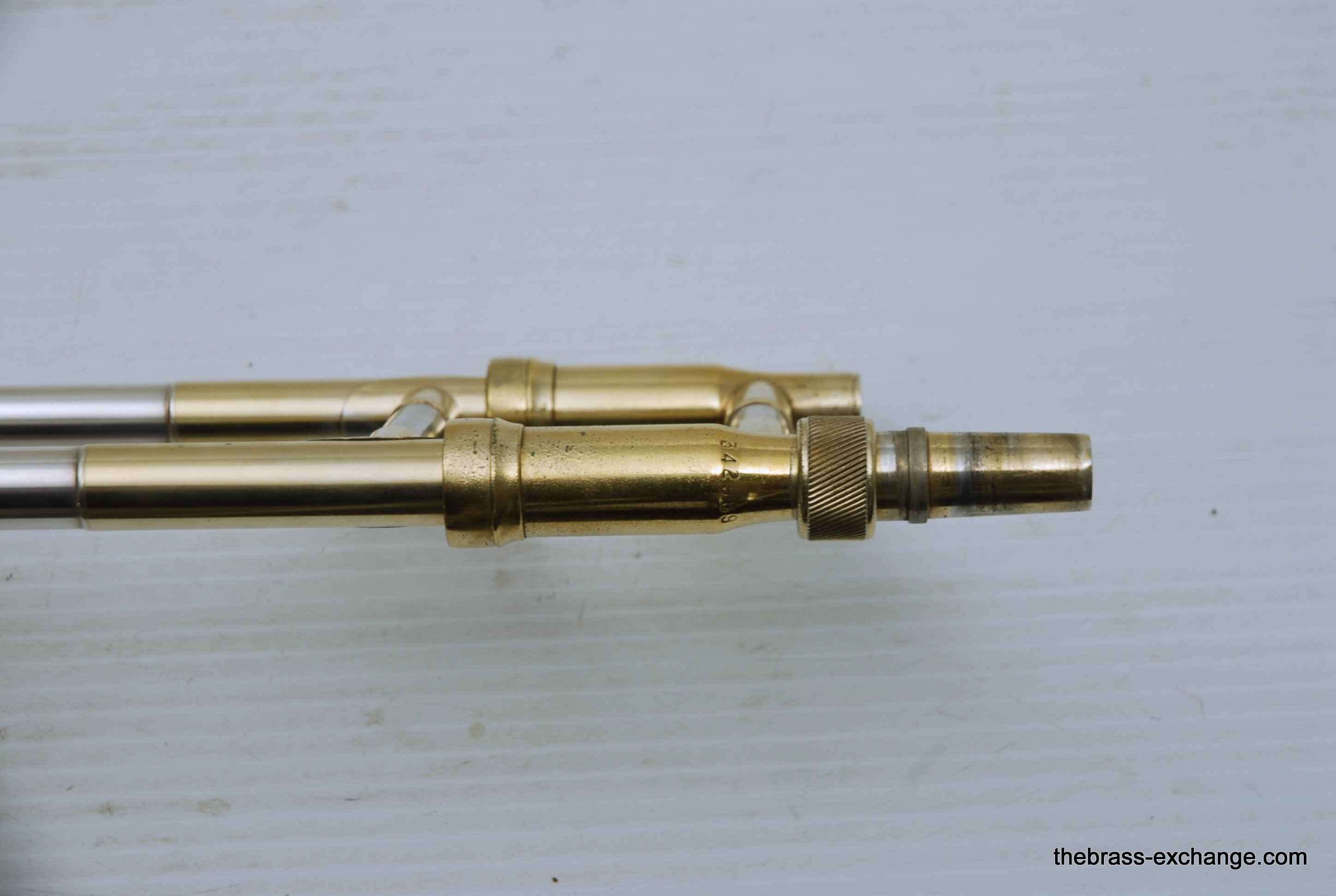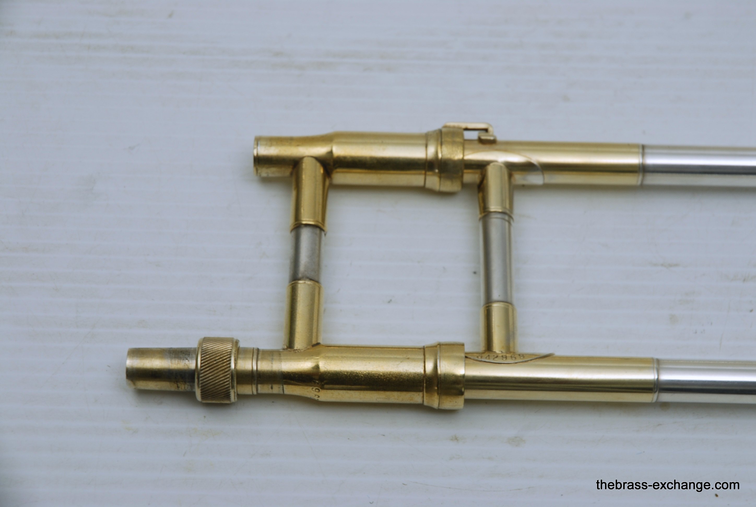 King 2B Liberty vintage 1955 H.N. White Era. If you were a lead player or soloist like Dorsey, Kai Winding, or Urbie Green during the big band era, you most likely would have choosen a 2B as your axe of choice. This is a special make 2B. It is not a silversonic, sterling silver bell. this is a yellow brass 2B Liberty with silver and gold plating. We think that Dorsey would have loved this horn. It is in perfect condition and has had full shop service, chemical bath, small dings and imperfections removed. All of the silver plating is intact. The gold plated inner bell is 100%. Other areas of gold plating include the hand braces on the slide grip, cork barrels, oversleeves, ferrels, tuning slide bracing, and of course balance weight. The floral engraving is crisp, and looks like it was made yesterday, even though this instrument is from 1955. It has indeed been closet kept by the original pruchaser for many years. Original coffin case is in near perfect condition. Comes with a gold plated King M21 (J.J. Johnson) Mouthpiece. Is both a collectors piece as well as a players horn. Many 2B and 3B's have passed through this shop over the past 10 years, never any 2B's quite like this one. Price includes a full handslide pro set up. If no set-up desired, take off $150, yes, totally playable as is, but why not make it perfect.