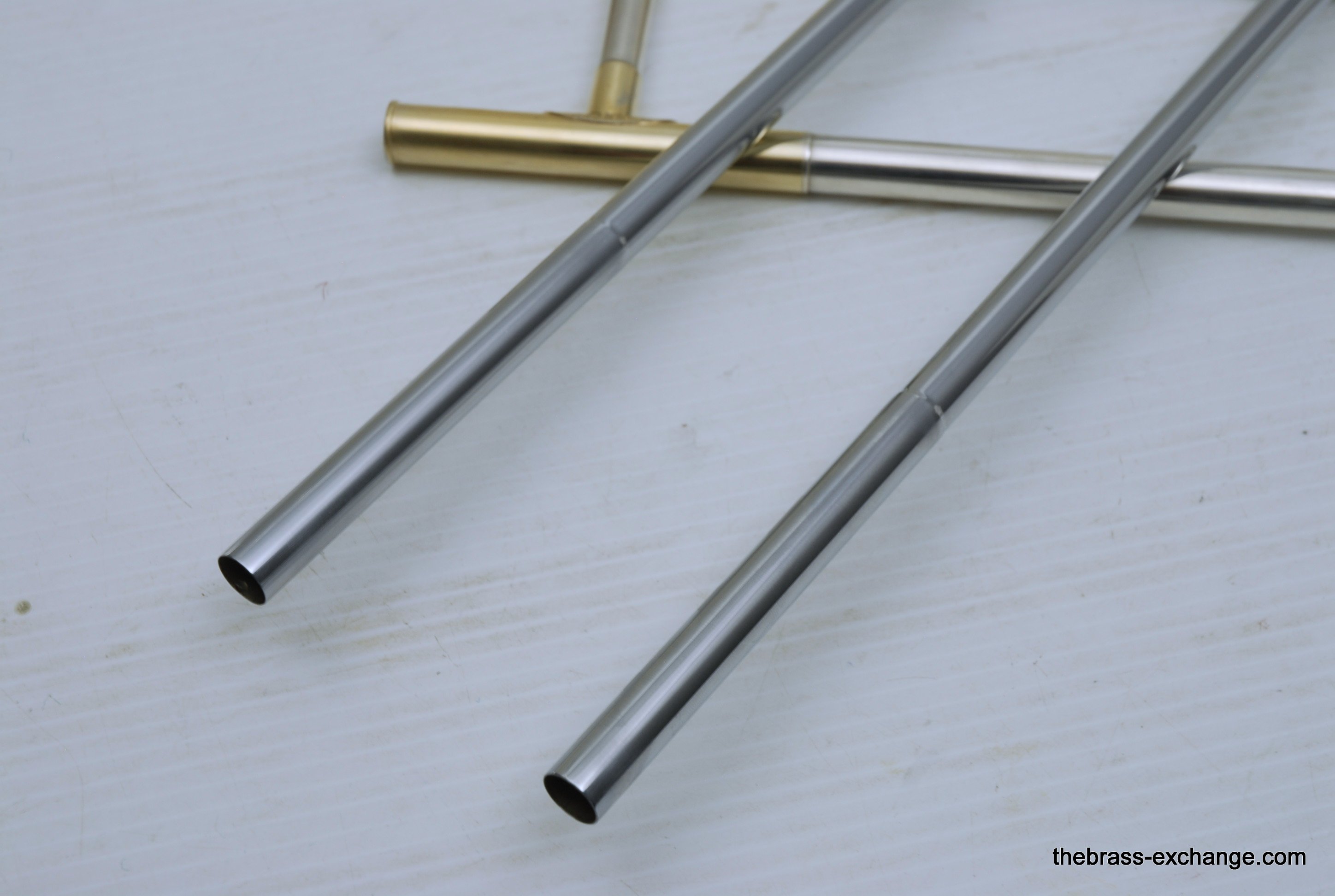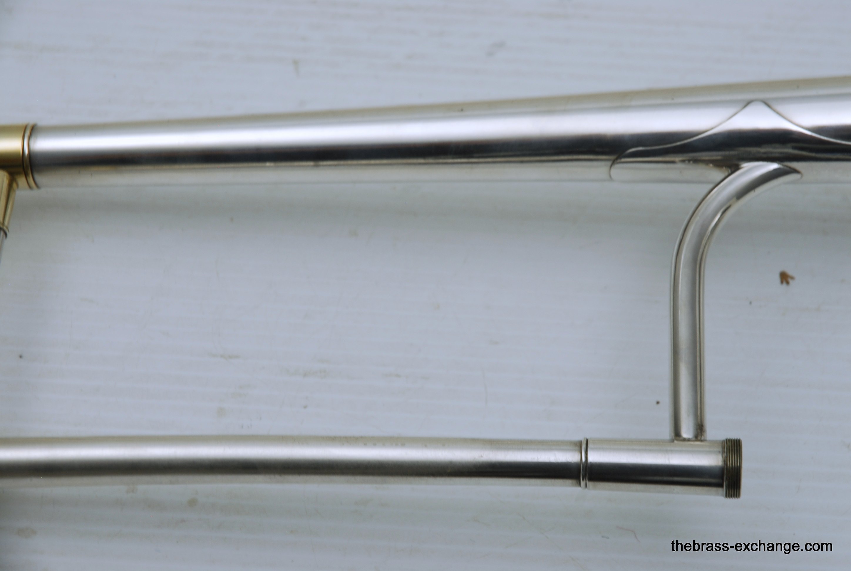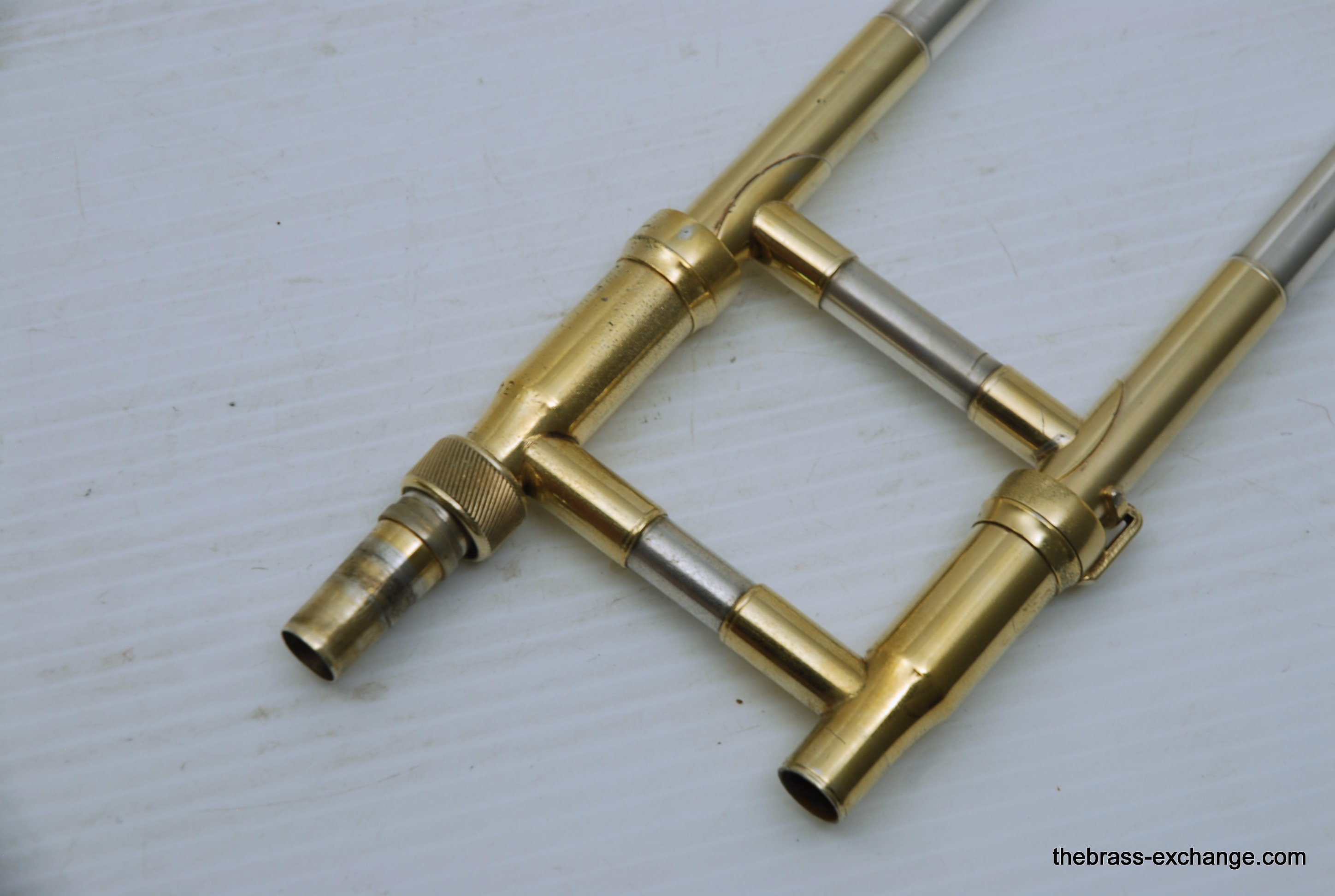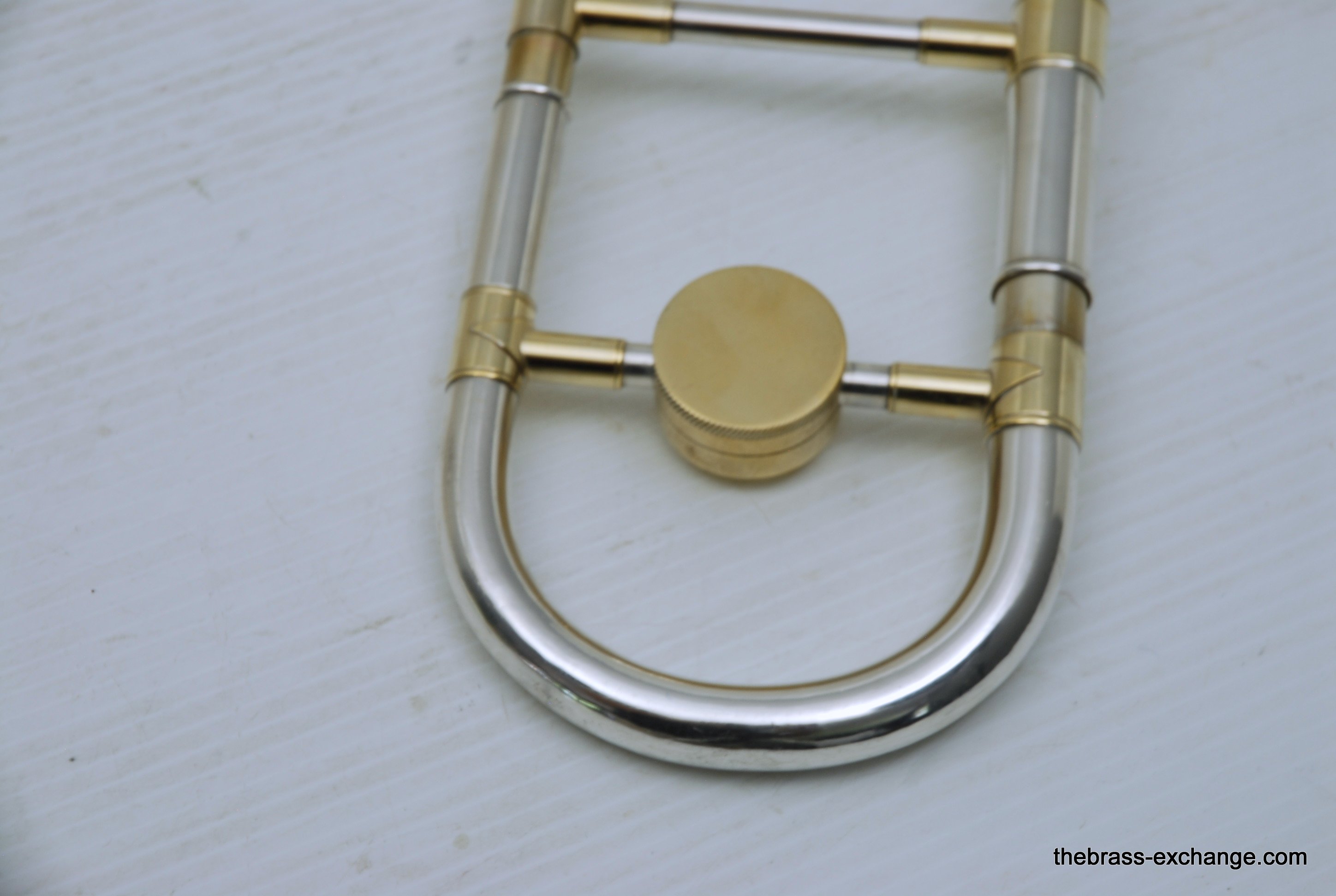 King 2B Liberty vintage 1955 H.N. White Era. If you were a lead player or soloist like Dorsey, Kai Winding, or Urbie Green during the big band era, you most likely would have choosen a 2B as your axe of choice. This is a special make 2B. It is not a silversonic, sterling silver bell. this is a yellow brass 2B Liberty with silver and gold plating. We think that Dorsey would have loved this horn. It is in perfect condition and has had full shop service, chemical bath, small dings and imperfections removed. All of the silver plating is intact. The gold plated inner bell is 100%. Other areas of gold plating include the hand braces on the slide grip, cork barrels, oversleeves, ferrels, tuning slide bracing, and of course balance weight. The floral engraving is crisp, and looks like it was made yesterday, even though this instrument is from 1955. It has indeed been closet kept by the original pruchaser for many years. Original coffin case is in near perfect condition. Comes with a gold plated King M21 (J.J. Johnson) Mouthpiece. Is both a collectors piece as well as a players horn. Many 2B and 3B's have passed through this shop over the past 10 years, never any 2B's quite like this one. Price includes a full handslide pro set up. If no set-up desired, take off $150, yes, totally playable as is, but why not make it perfect.