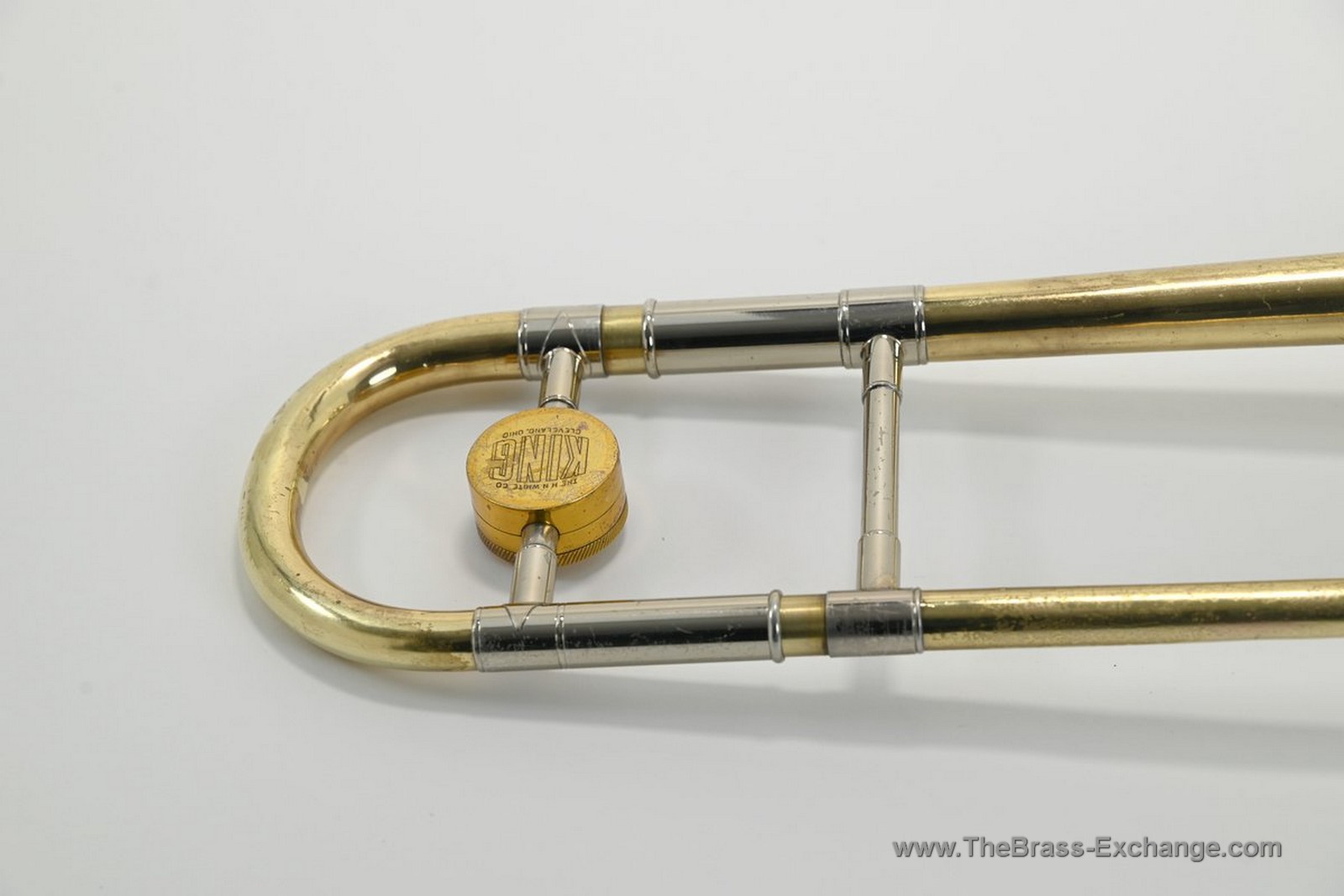 This H.N. White King 2B Liberty trombone from the mid-1950s SN 362798 is a solid, player-ready example of one of the most respected small-bore jazz instruments ever built. The horn has proper slide alignment with no defects, smooth action, and excellent response across the range. There is a small ding on the yellow-brass slide crook that is purely cosmetic and not worth worrying about.