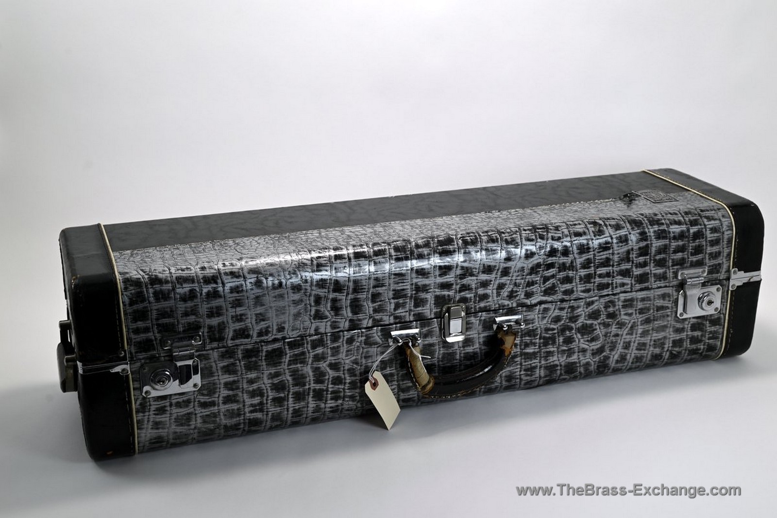 A black and silver coffin-style case with top handle and durable hardware is included.