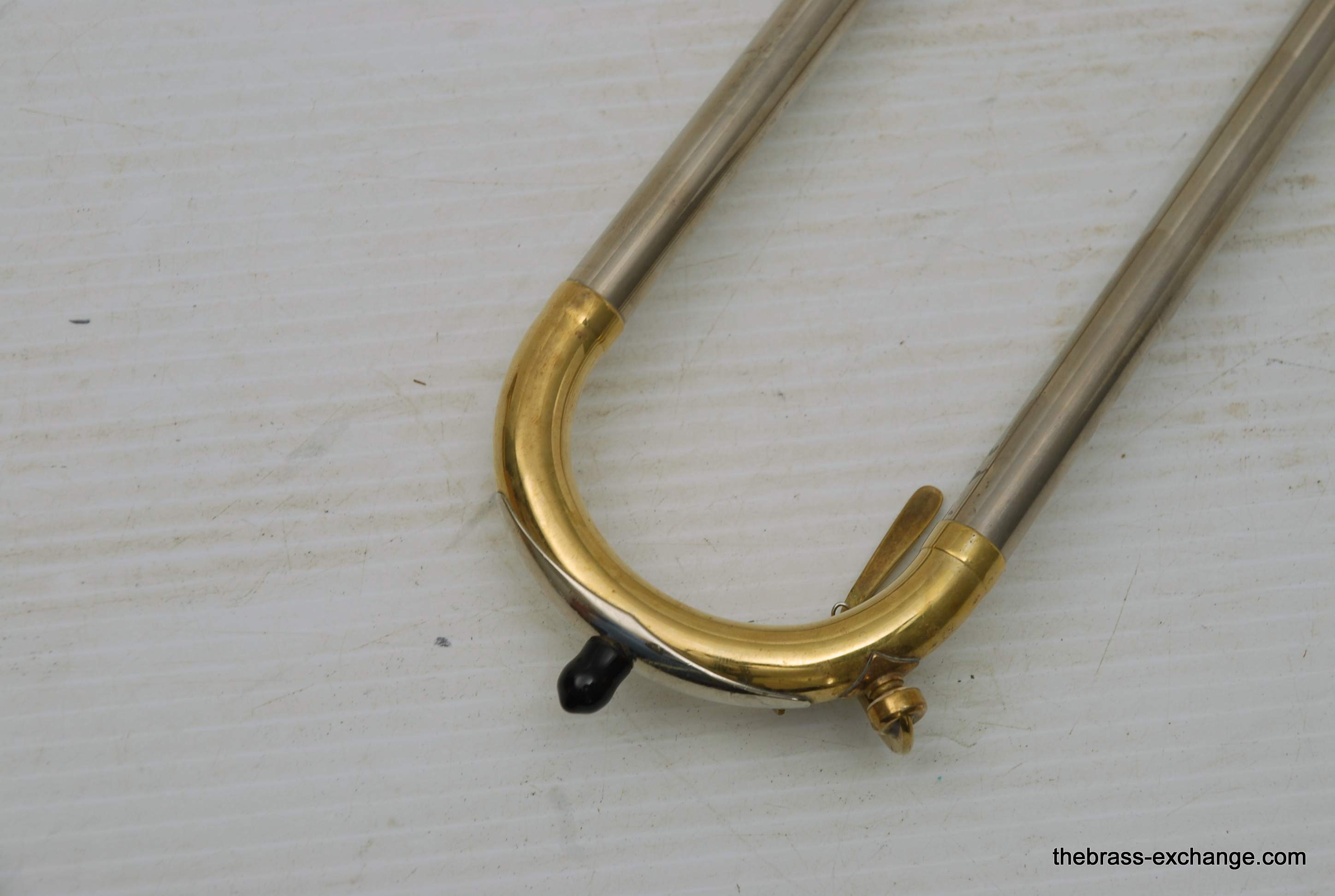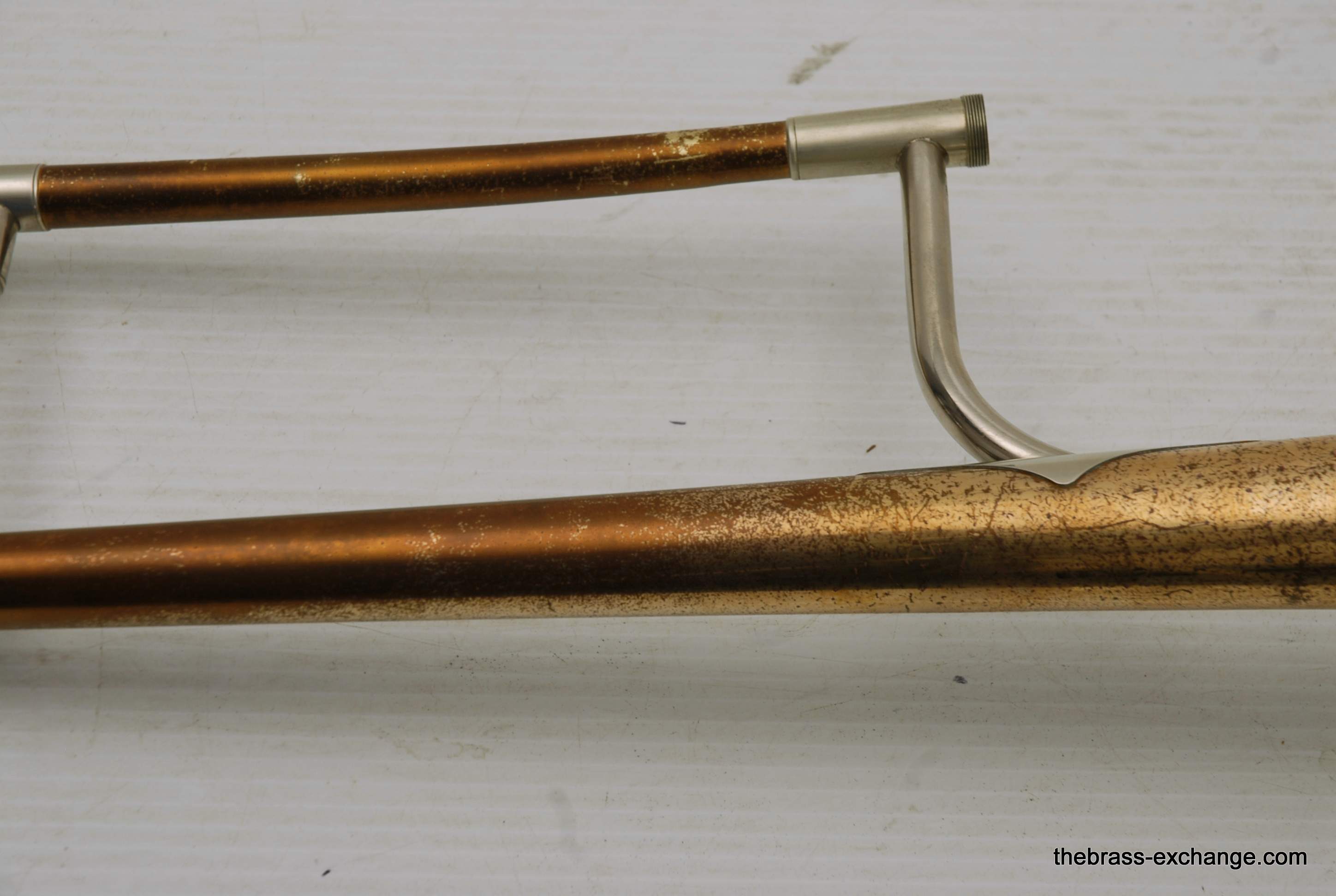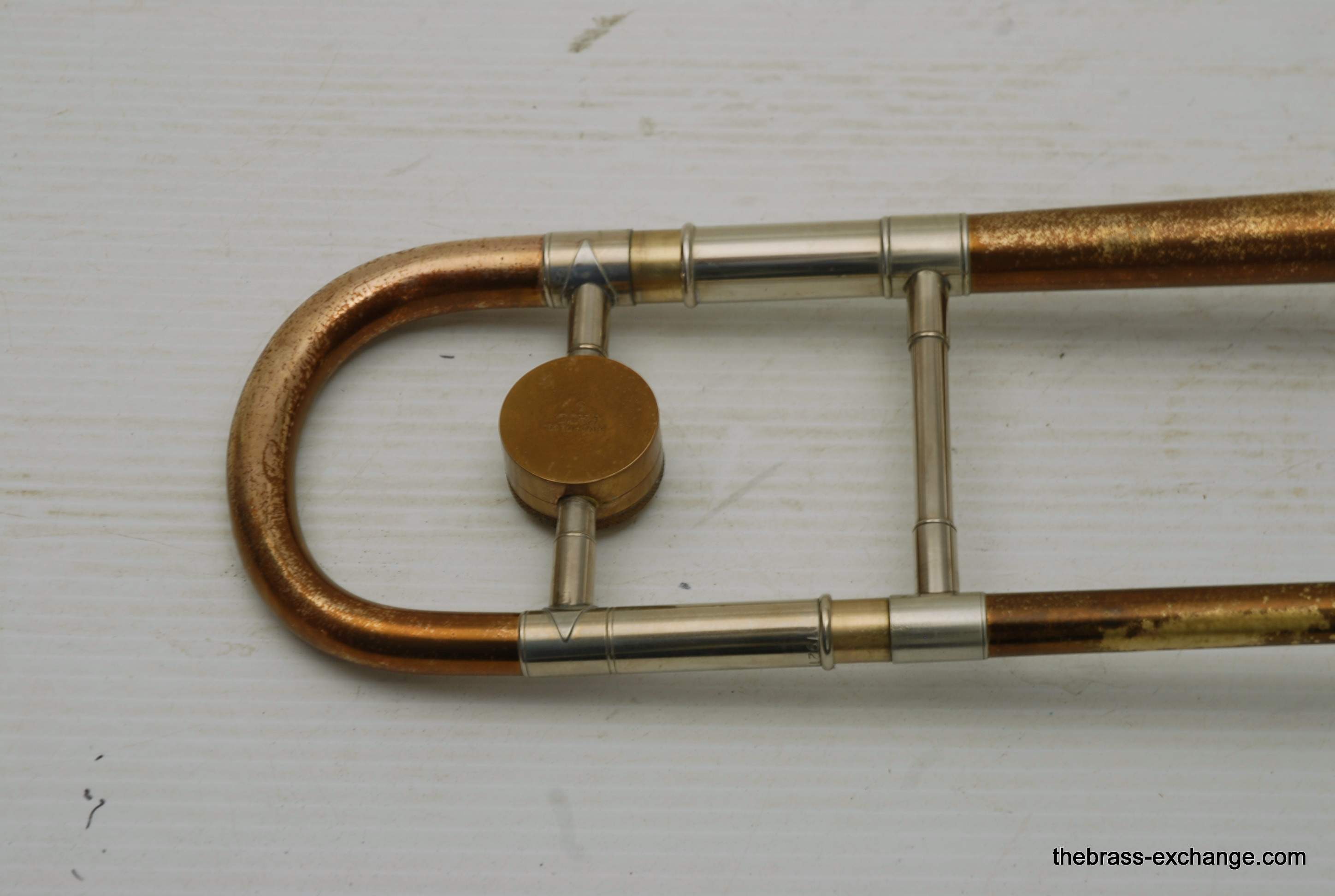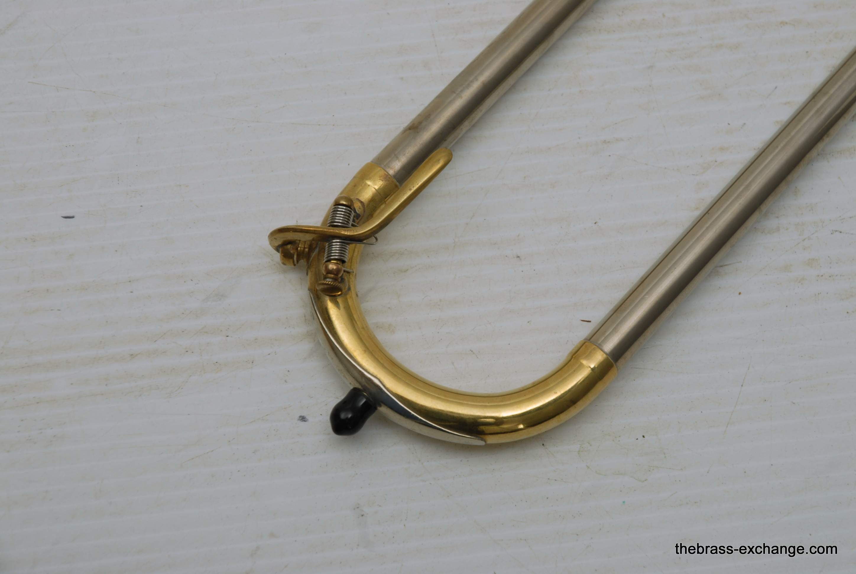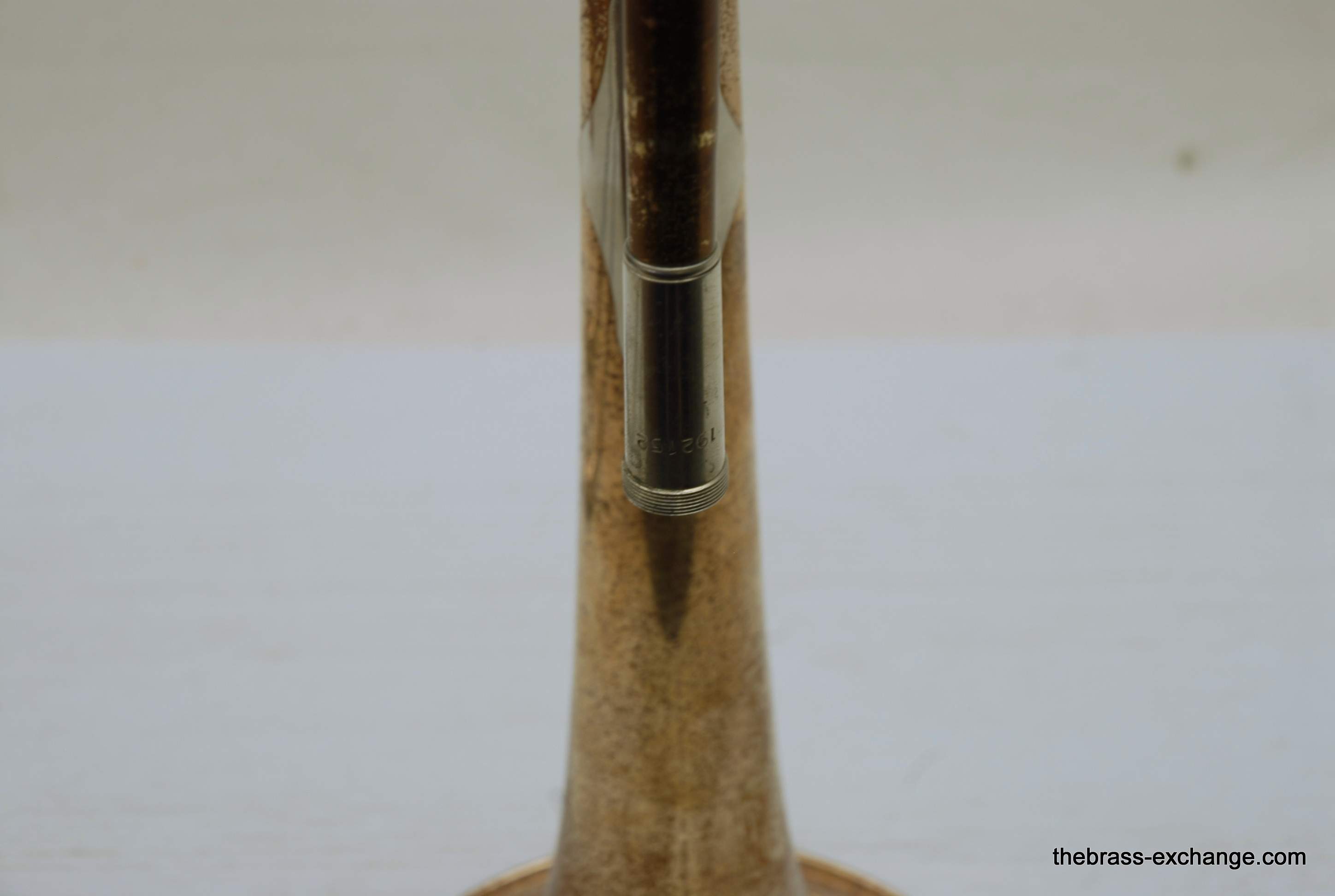 This horn has received full shop service here at The Brass Exchange, including internal cleaning and slide adjustment. The handslide is in good shape, with no plating loss, good alignment, and smooth action. While the horn has no dents or dings, there is a small crack in the bell flare area, likely due to natural metal thinning over time or a possible historic repair. It does not affect playability and has been factored into the price.