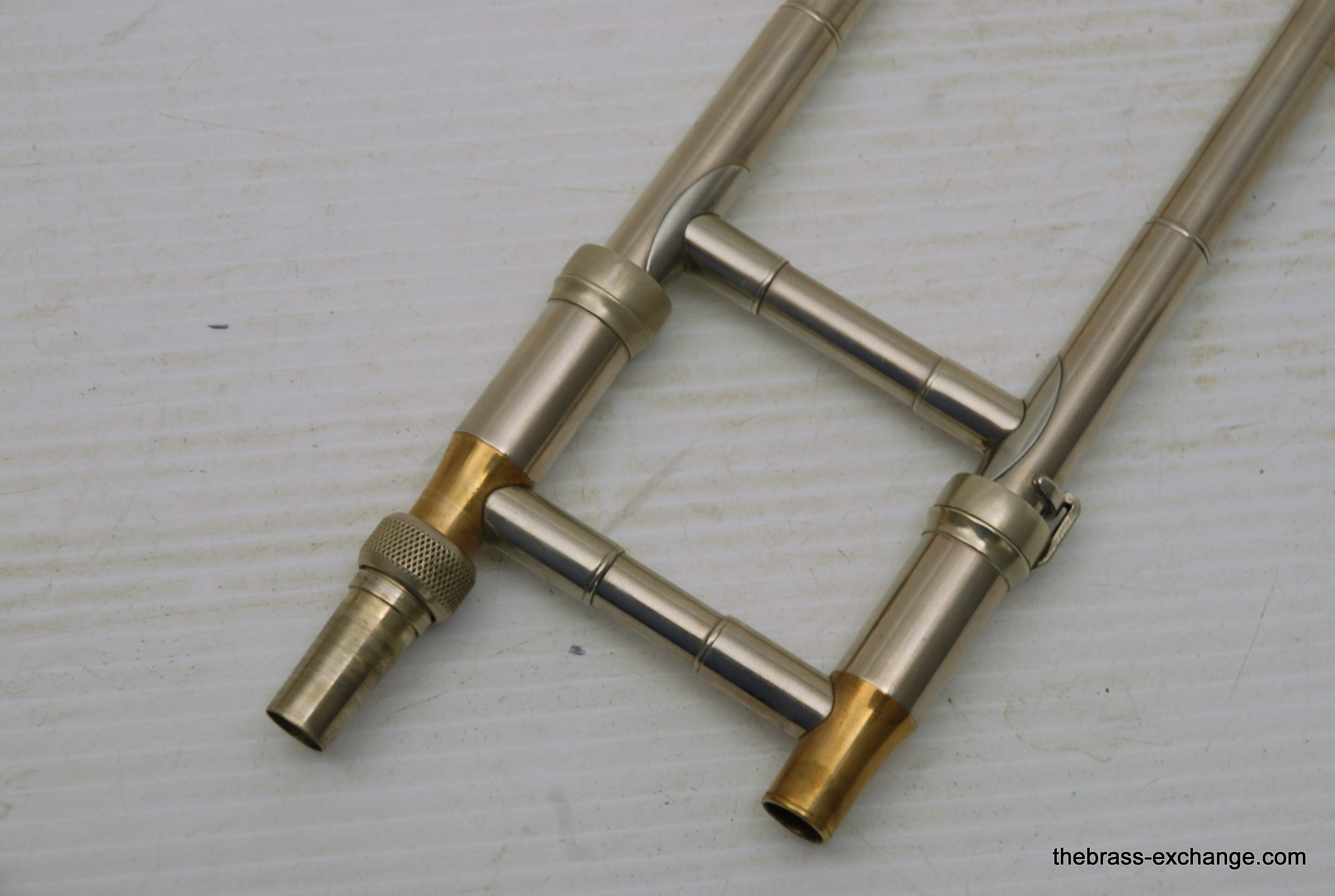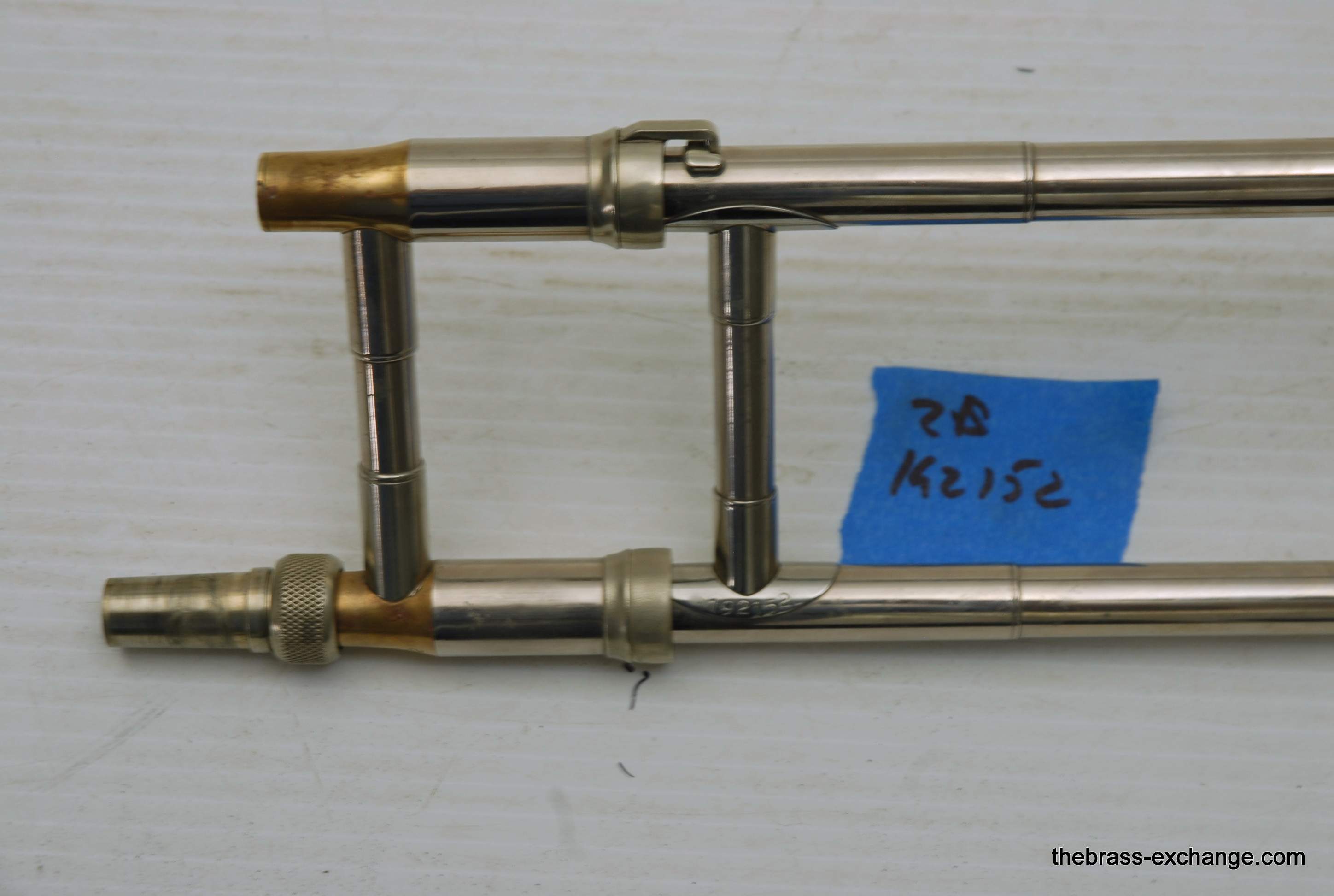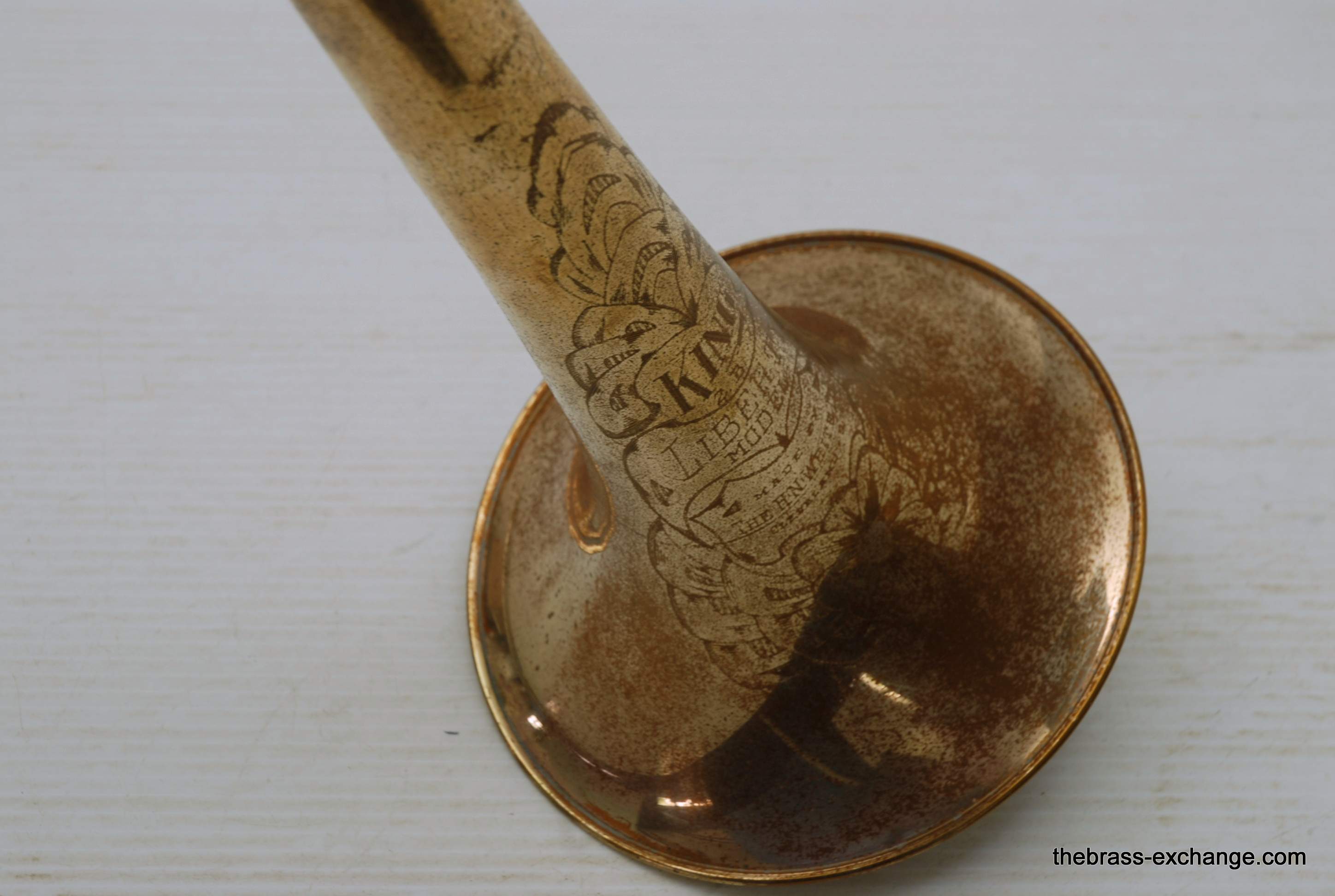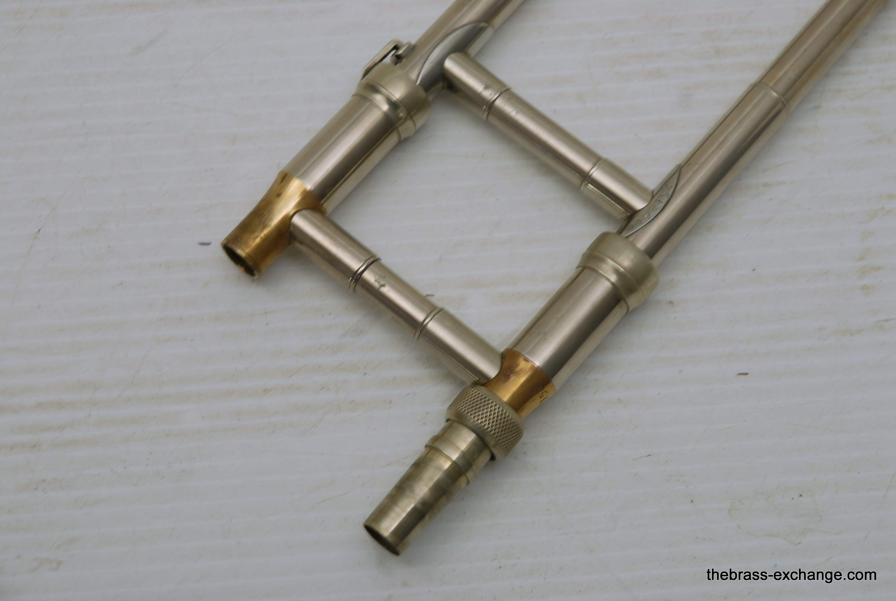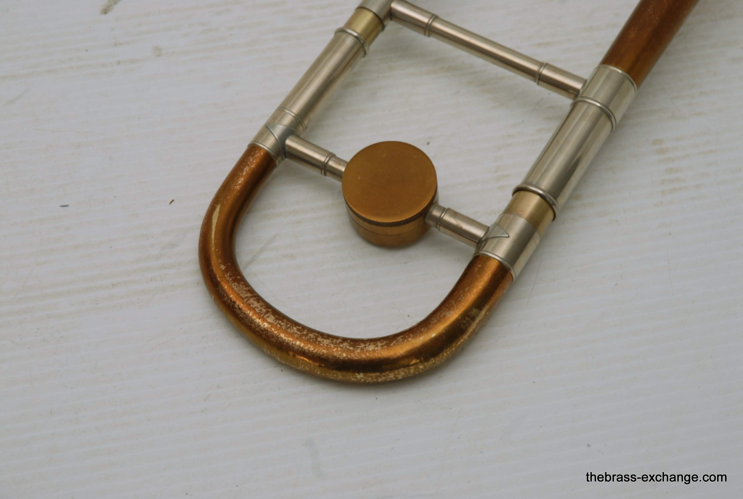 This horn has received full shop service here at The Brass Exchange, including internal cleaning and slide adjustment. The handslide is in good shape, with no plating loss, good alignment, and smooth action. While the horn has no dents or dings, there is a small crack in the bell flare area, likely due to natural metal thinning over time or a possible historic repair. It does not affect playability and has been factored into the price.