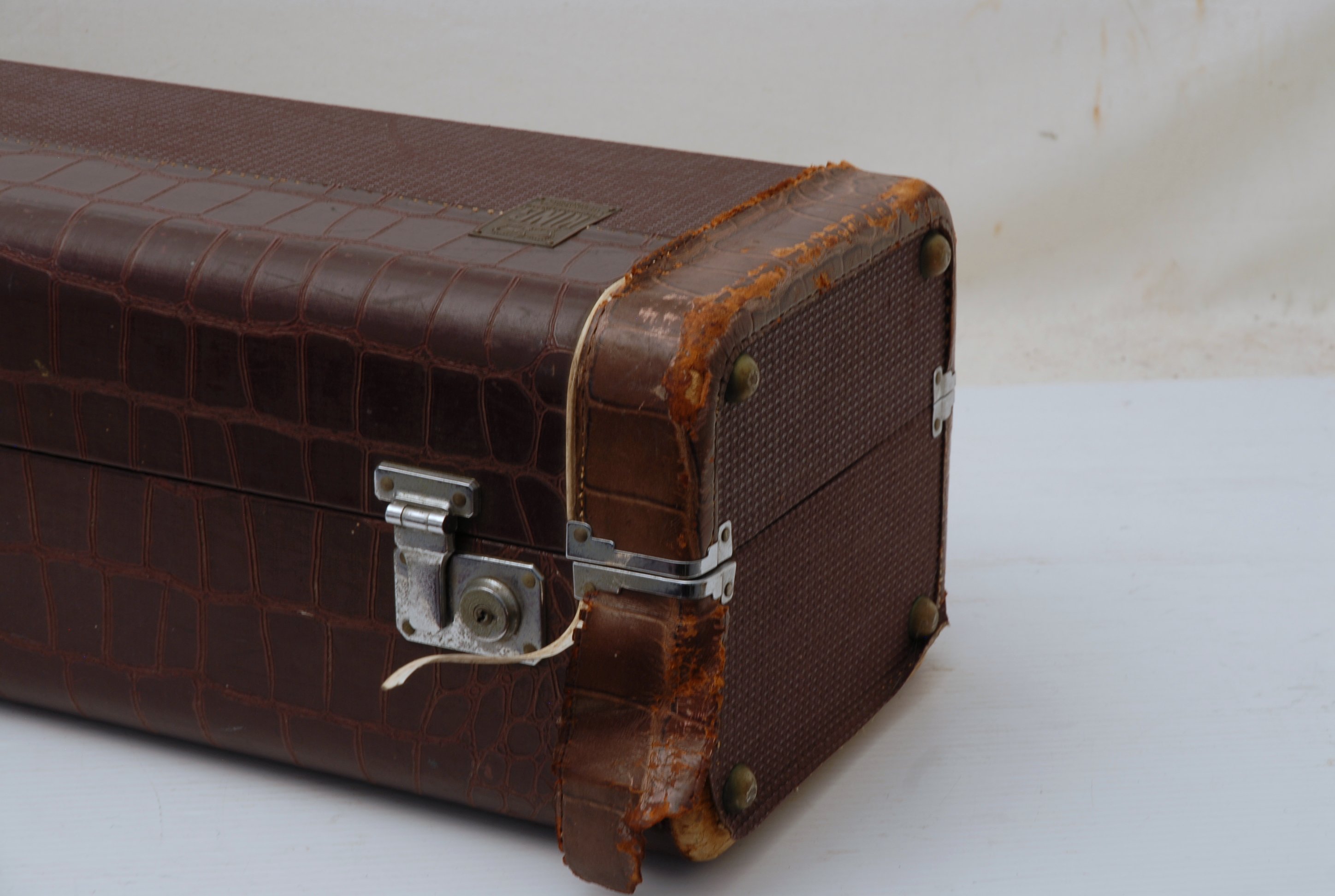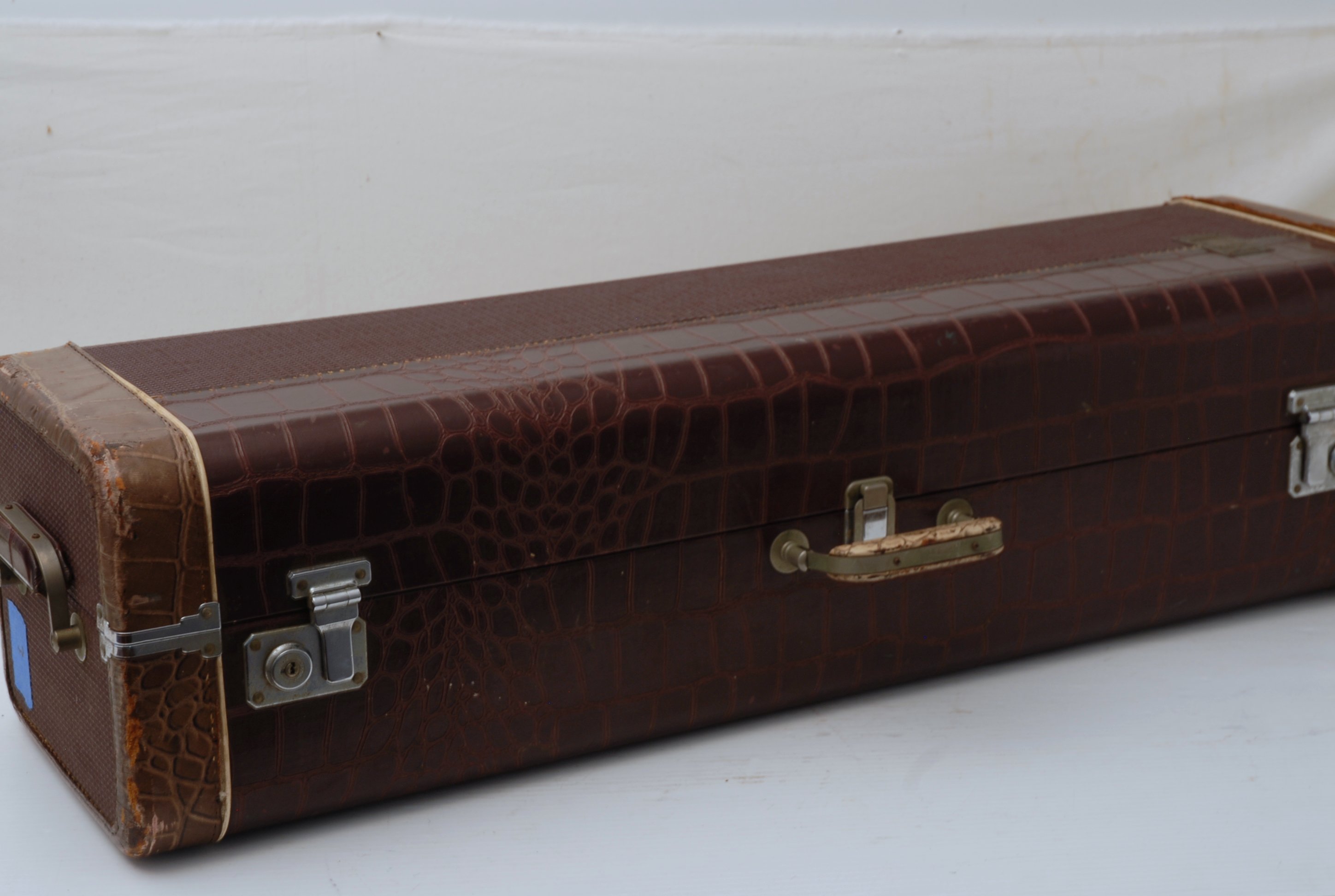 Includes the original alligator-style coffin case, also in good condition. The leather shows some exterior wear, but the latches are functional, and it remains a solid, practical case for storage or transport.