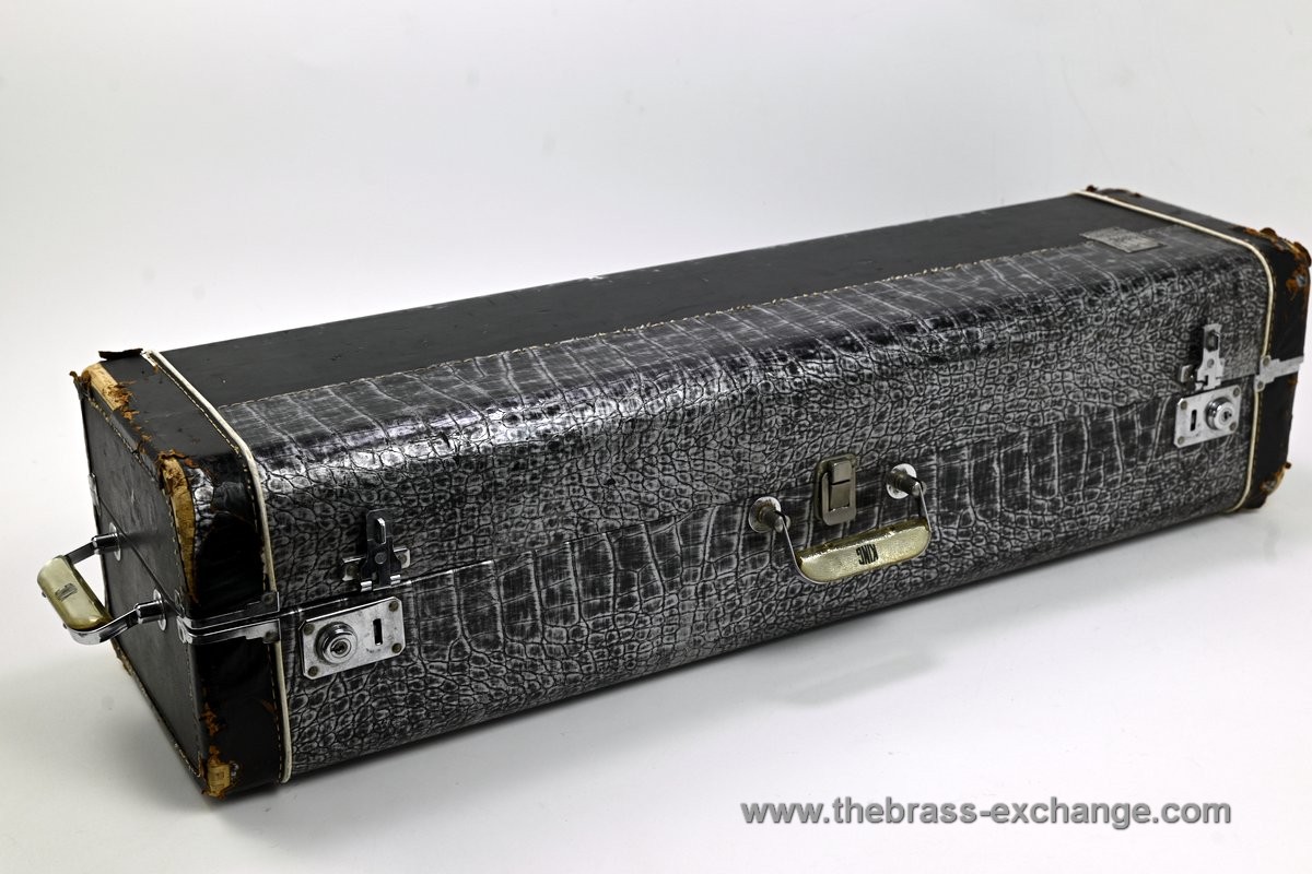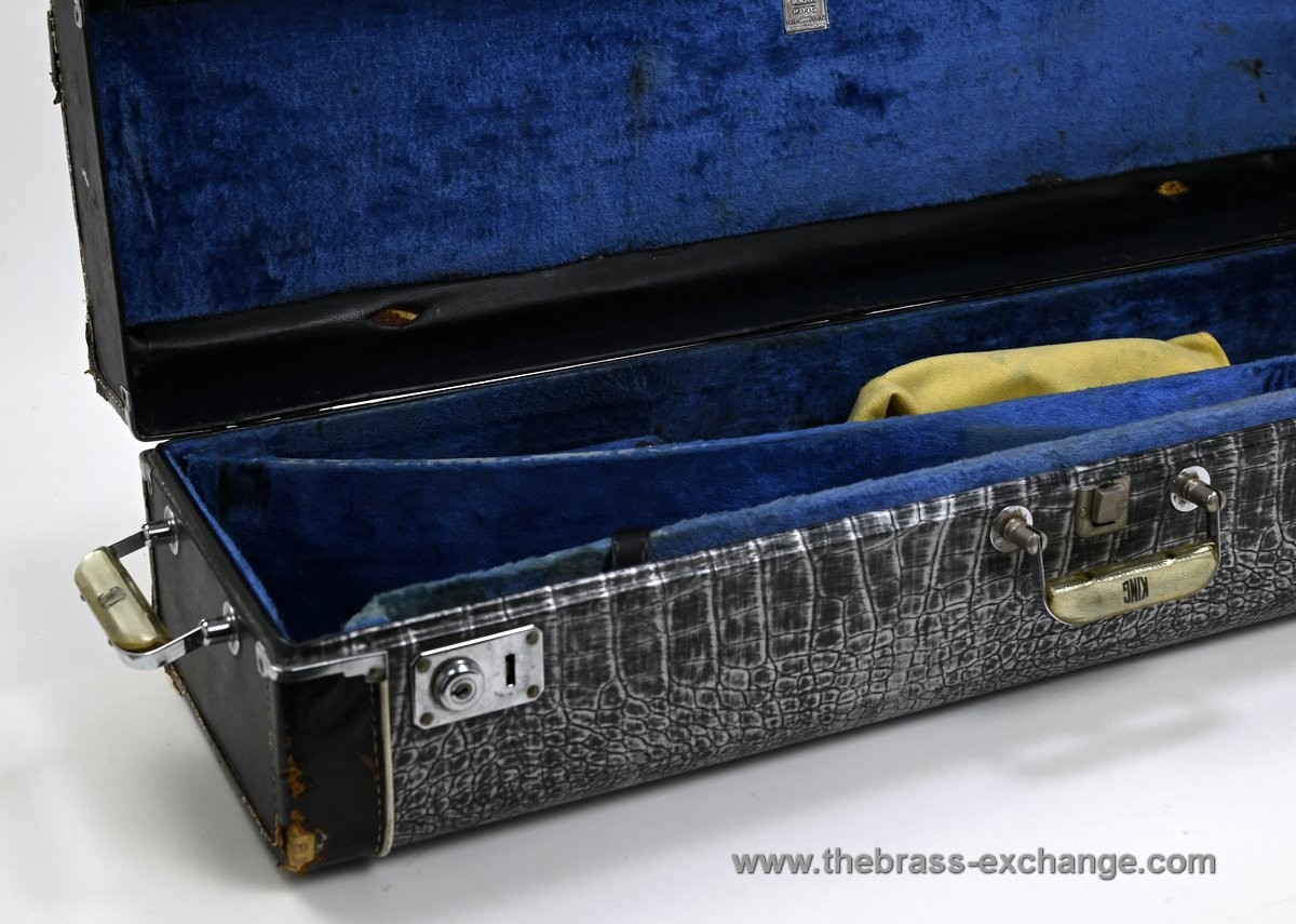 It came with its original King “coffin-style” case — black exterior, silver-trim hardware, blue interior — with all latches and handles functioning properly.