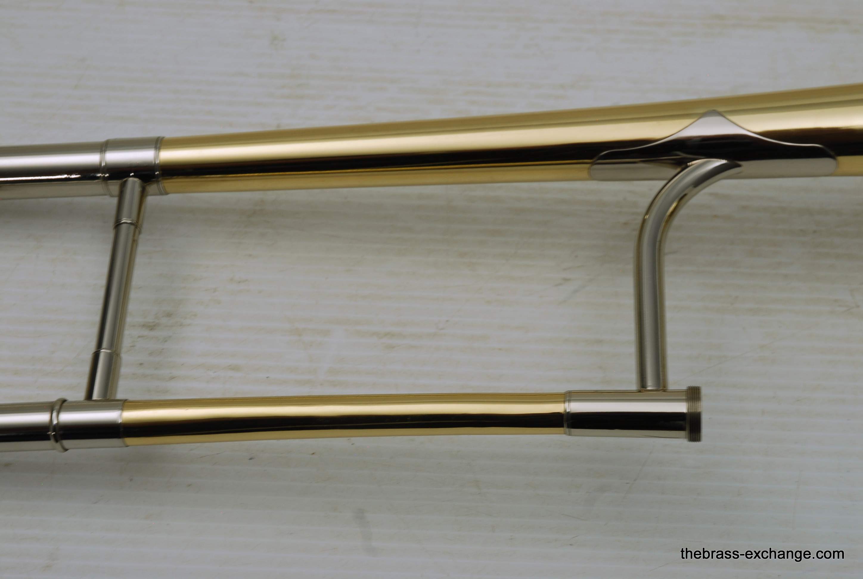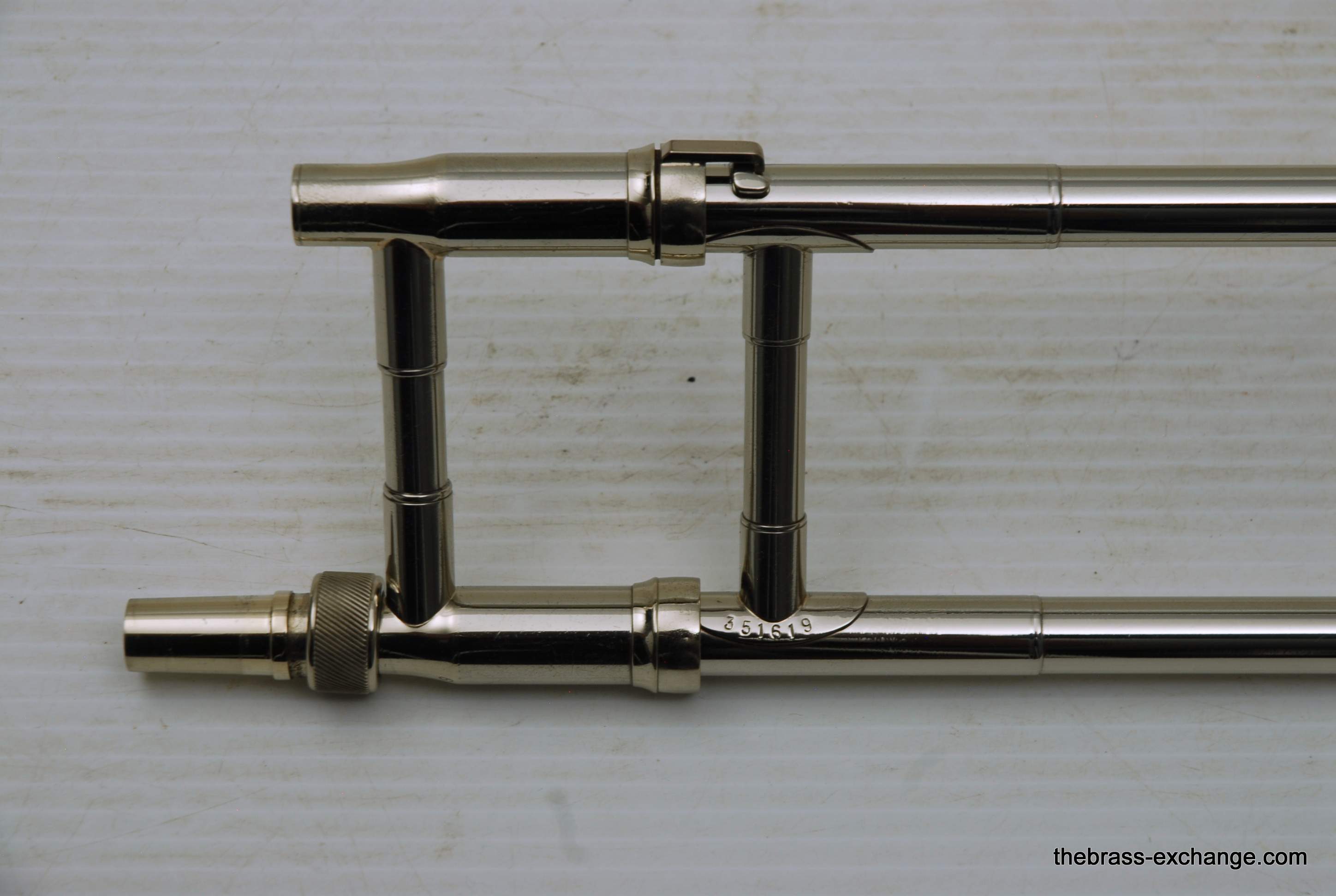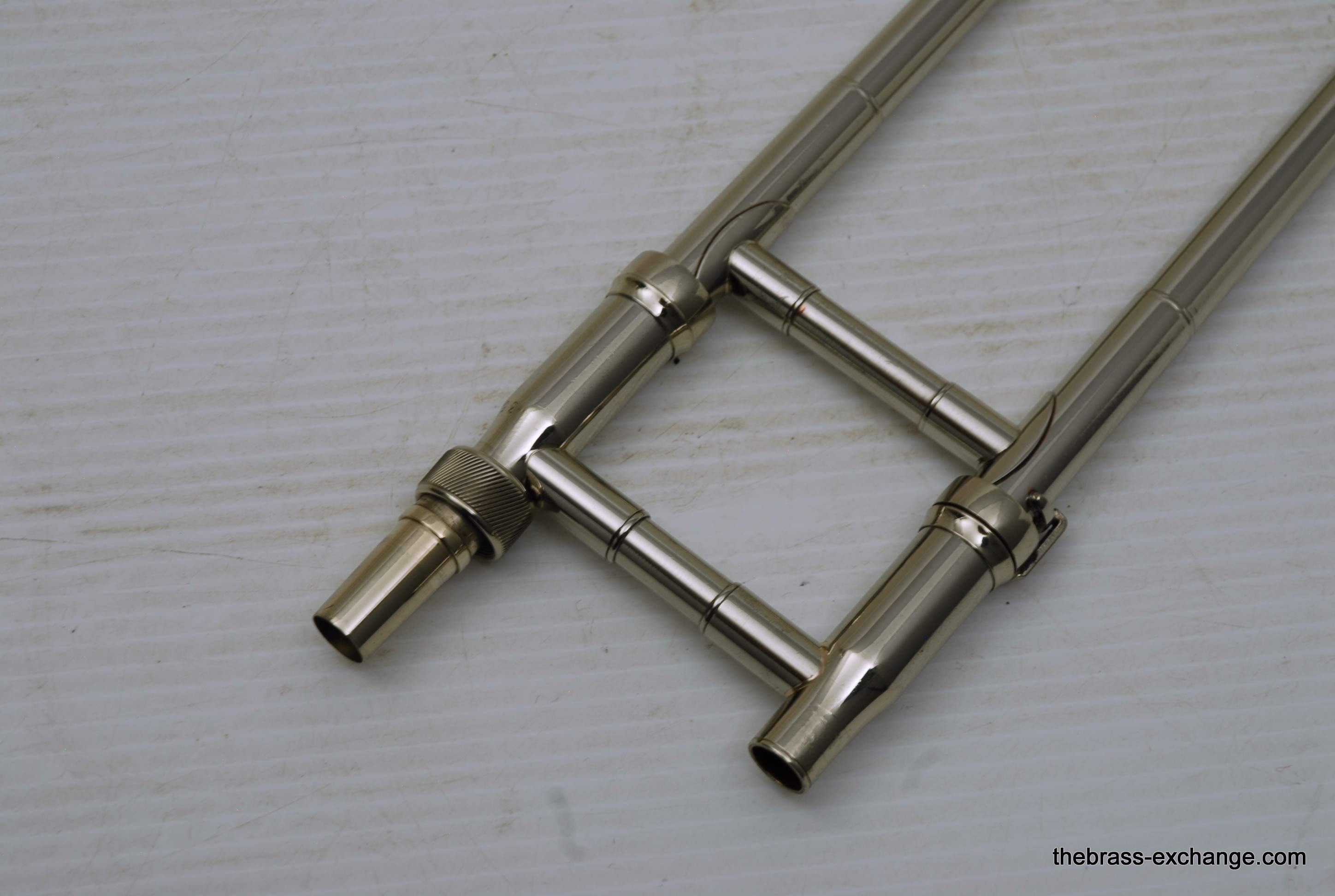 Kingย 3Bย Concert H.N. White 1950's Vintage.ย Was made between 1955-1960, is about the earilest one that we have seen here since the beginning of the Brass Exchange.ย Is most likely from 1956-57.ย King introduced the model in 1954.ย This one is all original parts, has been re-lacquered, many years ago and is in excellent condition. Has the classic 3B 8" Yellow brass bell, lightweight nickel .508 bore handslide.ย J.J. Johnson played this model.ย Kings are well known for a sweet centered sound.ย This one plays easy and comes from the family of the original owner.ย Handslide tubes are in perfect conditon, without defect.ย This 3B has the black/silver coffin case with blue interior.ย It would be harder to find a nicer 1950's 3B concert that this one.ย One of the features of the early 3B's is that the tuning crook is a little longer than the later ones, which definitely effects both sound and pitch.ย I feel that they play easier than the later ones, like 70's 80's and later.ย Would be a fantastic pro level jazz trombone for anyone, all levels of plays.ย In-stock.