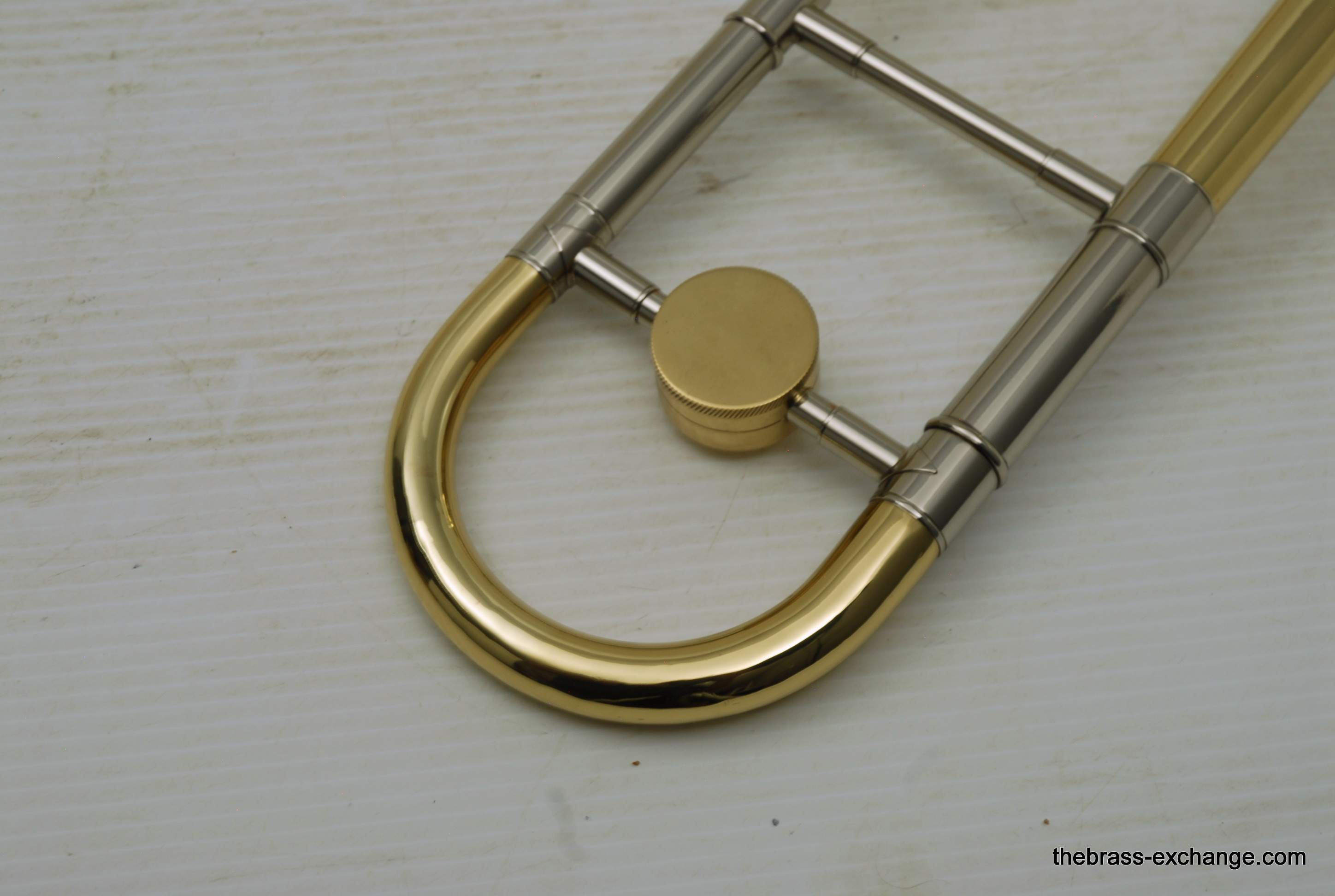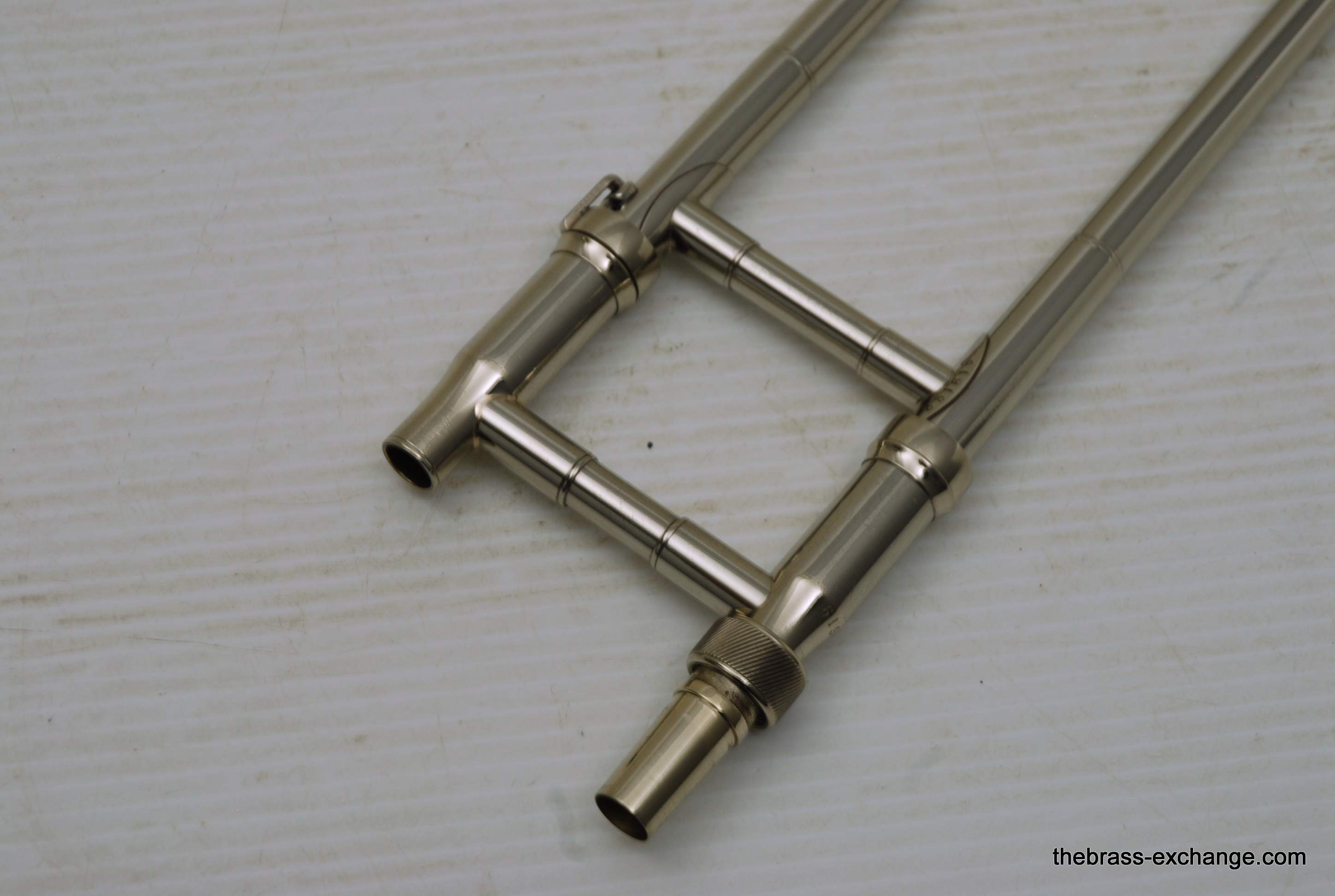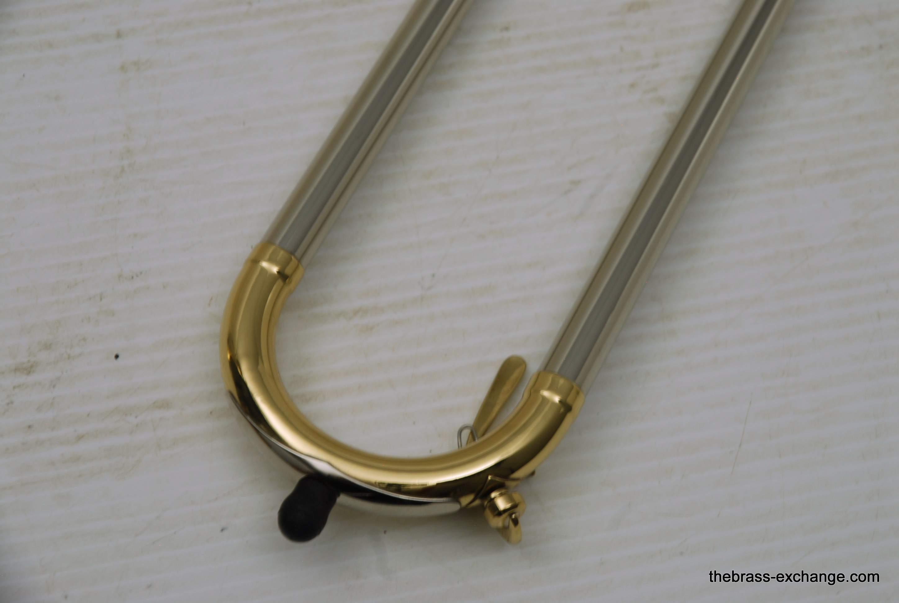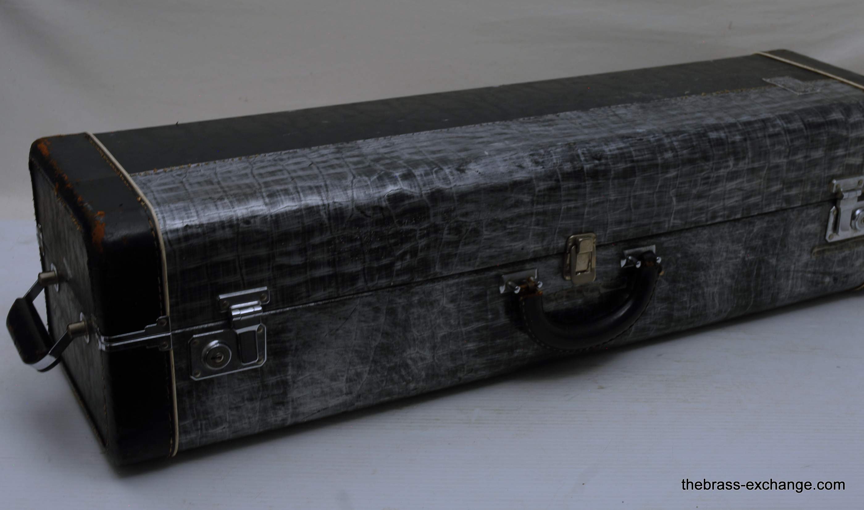 Kingย 3Bย Concert H.N. White 1950's Vintage.ย Was made between 1955-1960, is about the earilest one that we have seen here since the beginning of the Brass Exchange.ย Is most likely from 1956-57.ย King introduced the model in 1954.ย This one is all original parts, has been re-lacquered, many years ago and is in excellent condition. Has the classic 3B 8" Yellow brass bell, lightweight nickel .508 bore handslide.ย J.J. Johnson played this model.ย Kings are well known for a sweet centered sound.ย This one plays easy and comes from the family of the original owner.ย Handslide tubes are in perfect conditon, without defect.ย This 3B has the black/silver coffin case with blue interior.ย It would be harder to find a nicer 1950's 3B concert that this one.ย One of the features of the early 3B's is that the tuning crook is a little longer than the later ones, which definitely effects both sound and pitch.ย I feel that they play easier than the later ones, like 70's 80's and later.ย Would be a fantastic pro level jazz trombone for anyone, all levels of plays.ย In-stock.