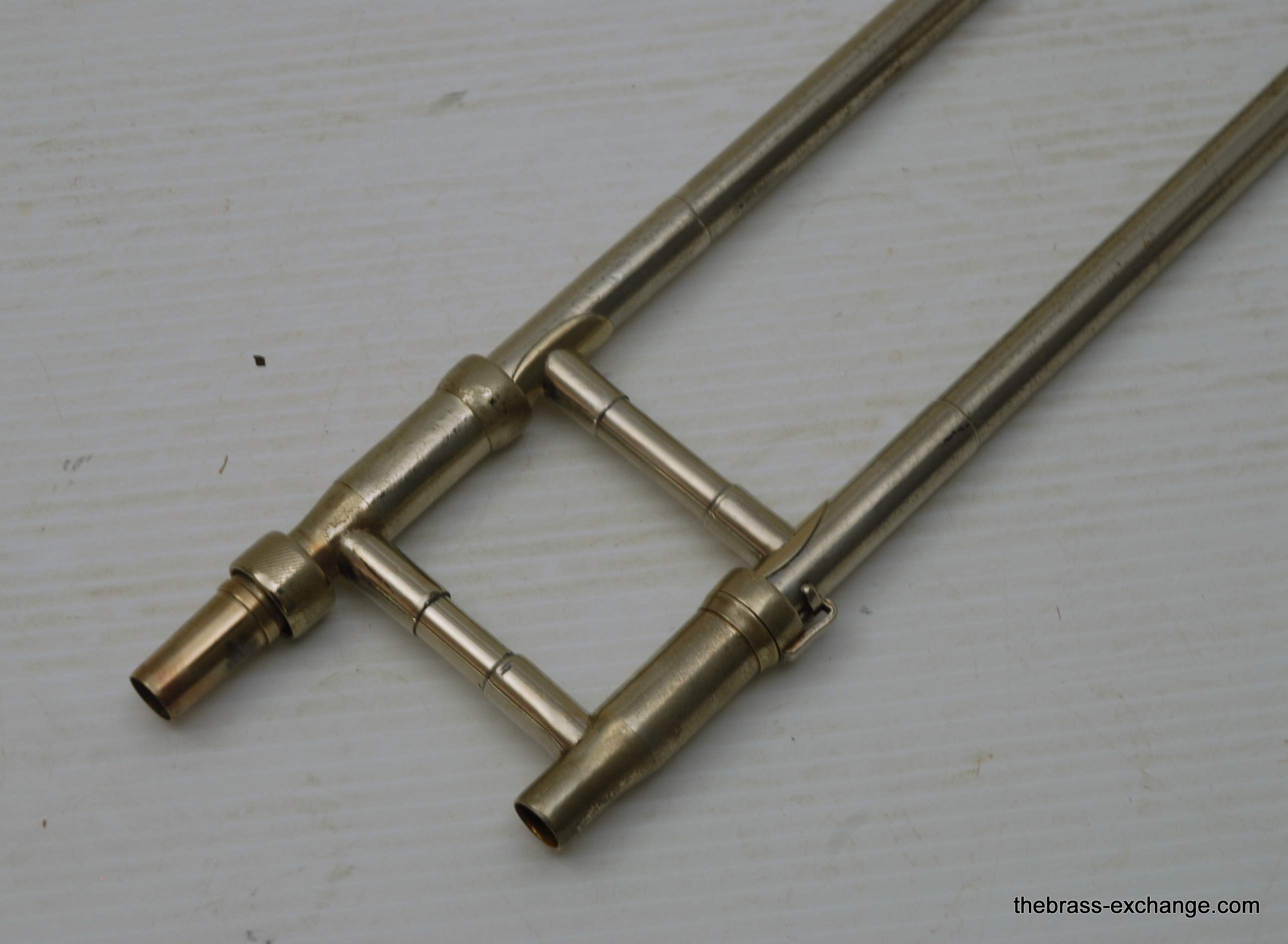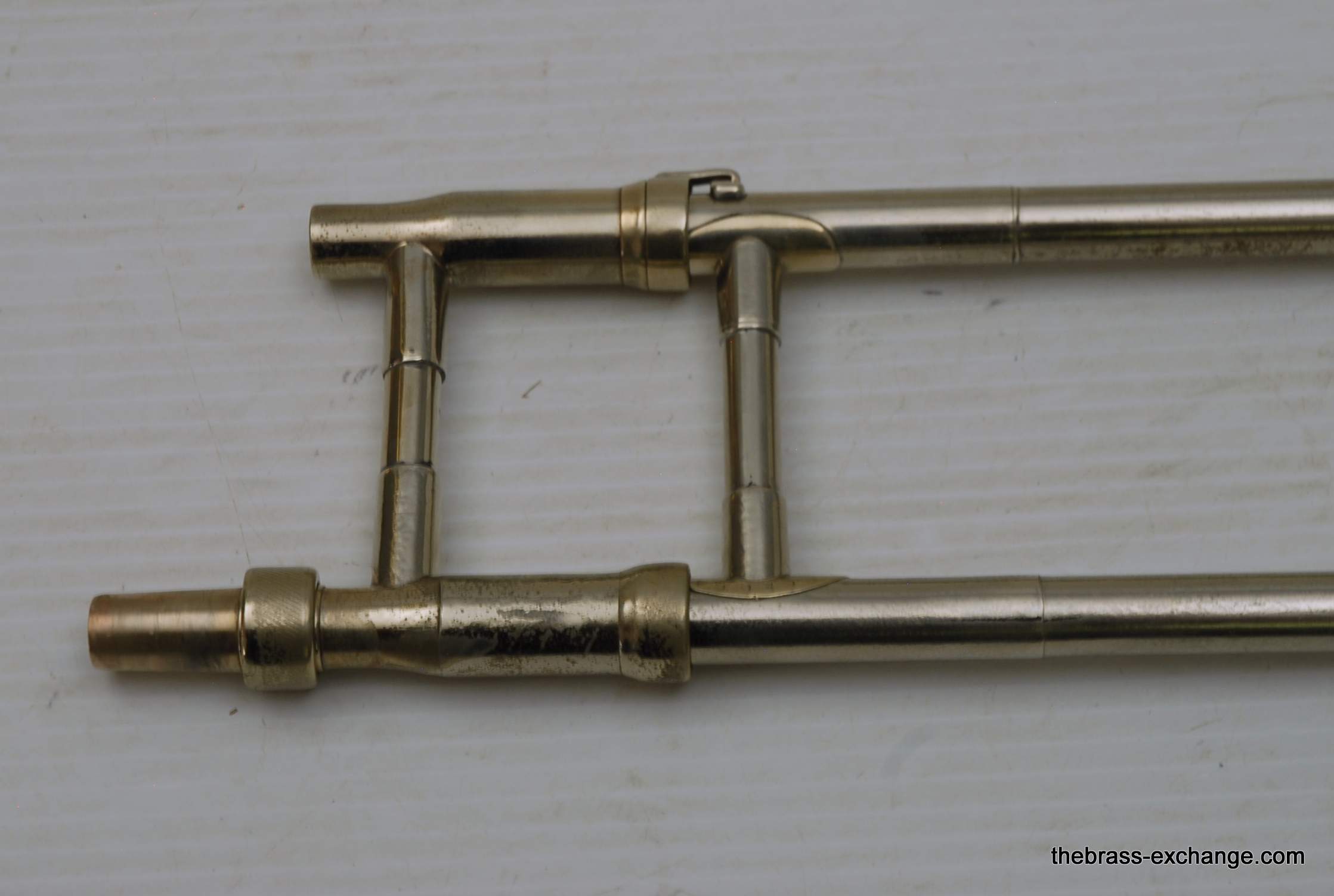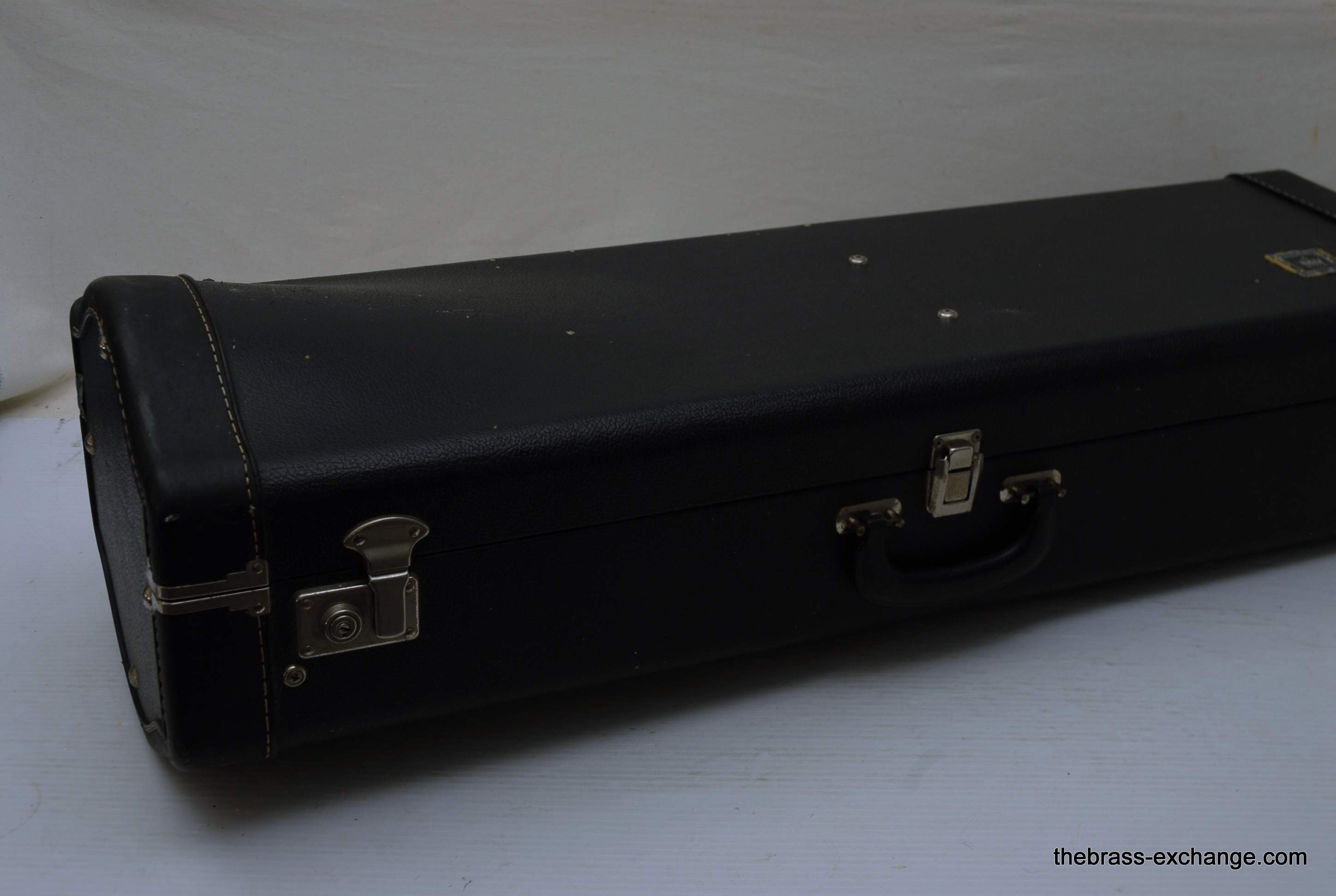 King 3BF Trombone, 1960's Make H.N. White Cleveland Era. Bell Section is H.N. White Era, Handslide is from mid 1970's. One of the most popular small bore tenor trombones of all time for jazz/commercial use. Straight bore .508, with 8" yellow brass bell. This 3BF has had full shop service including chemical bath and full once over. The original slide end crook had issues, so we replaced it. Hand slide is most likely not the original slide, as the SN 495XXX is from a 1970's 3B. Slide has proper alignment, straight tubes, and plays easily. Previous owner had the lacquer re-done over the entire instrument, although some of the lacquer has worn off. This is just an older 3B that has been played on a lot, but has many years of useful life ahead. Includes a King 4B case, about the same weight as the regular coffin style, just a different shape, fits well no problem. No service needs to improve playability.