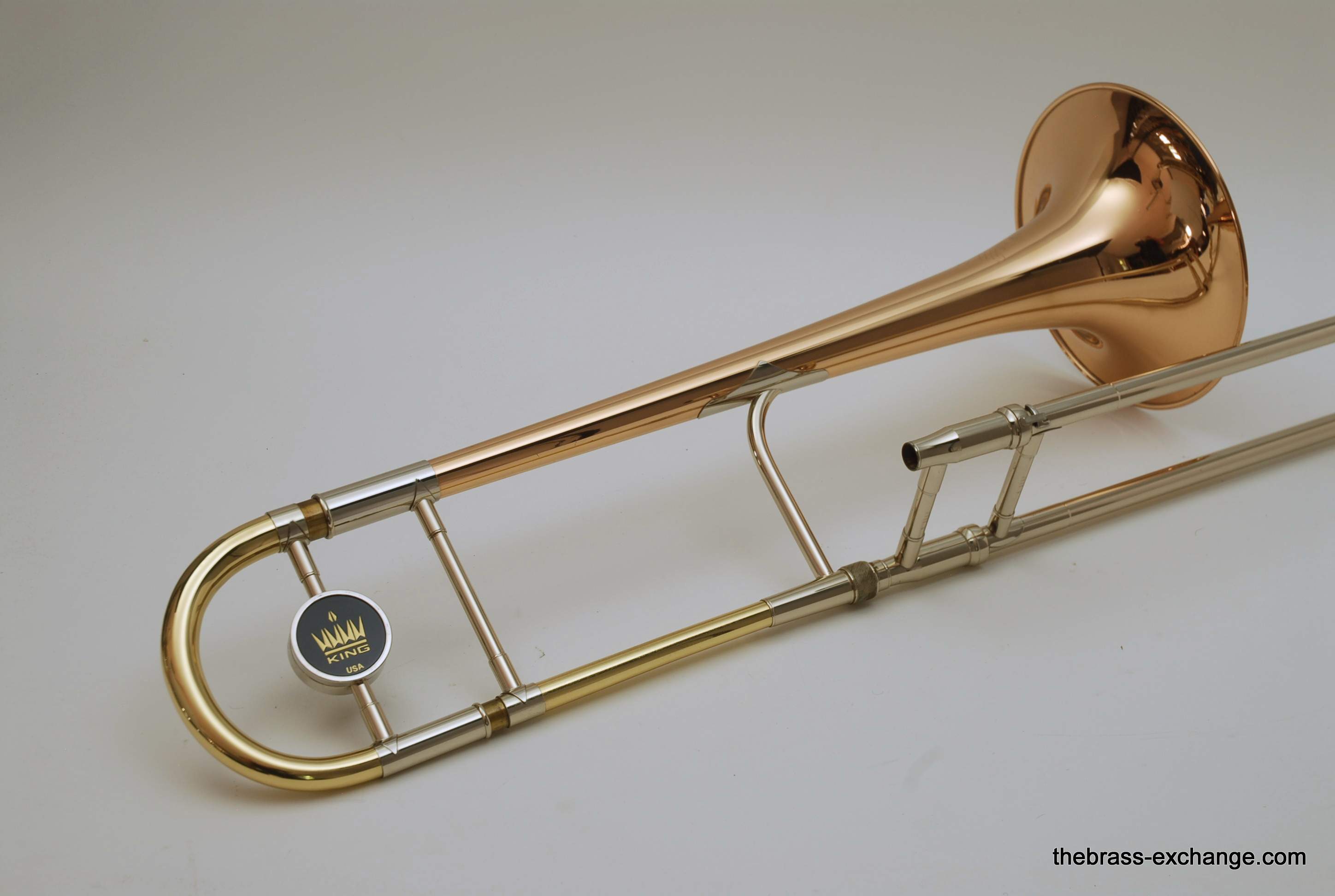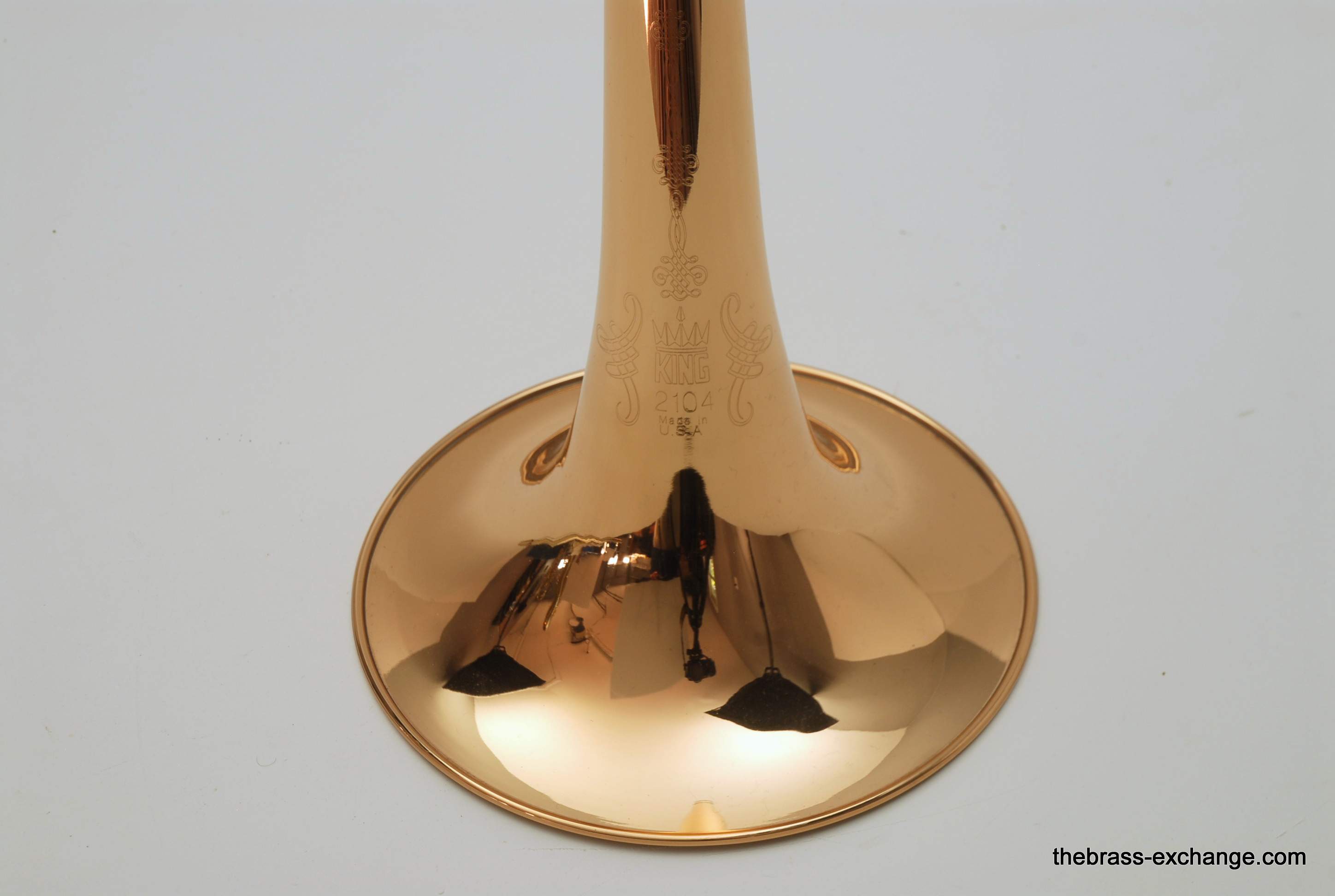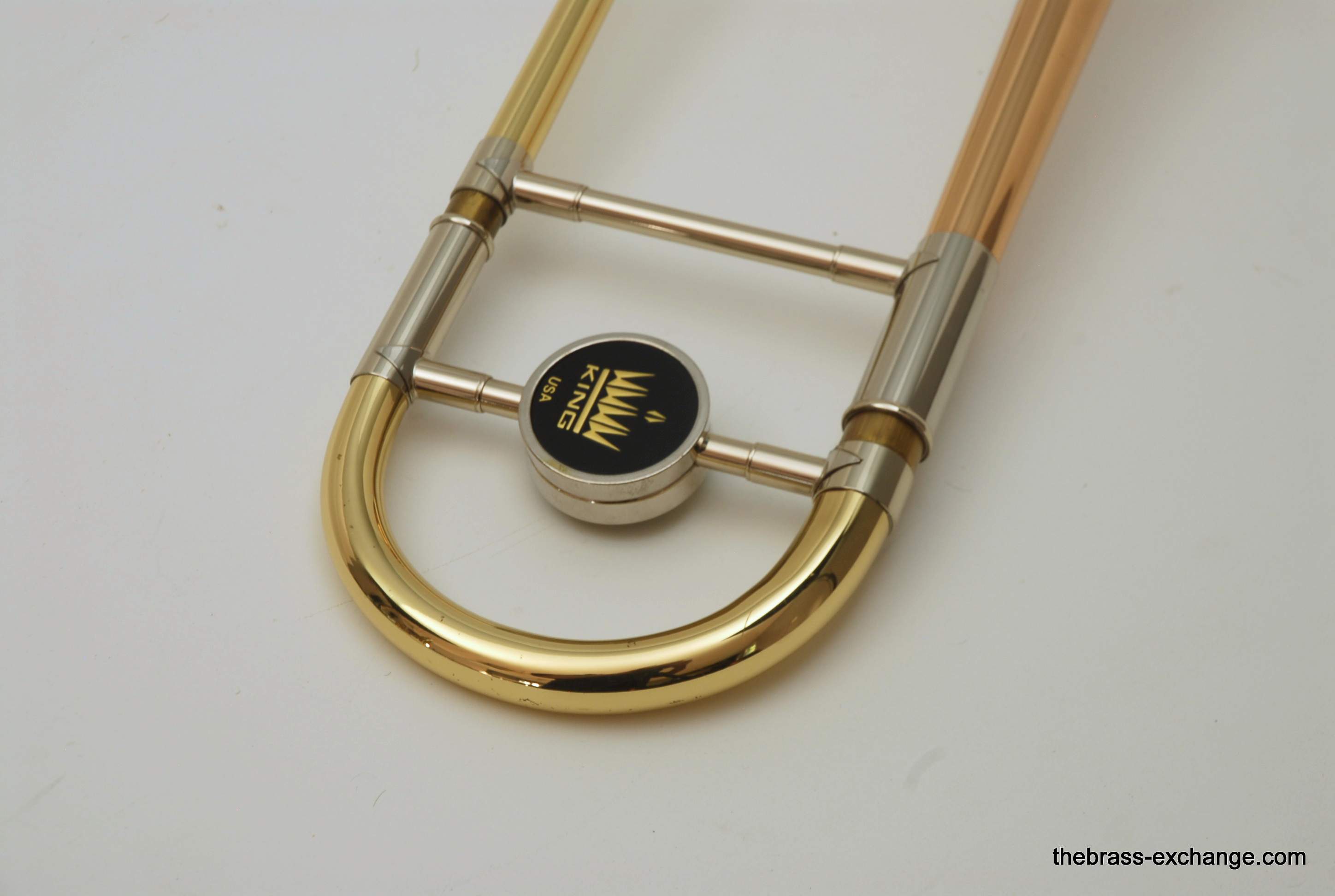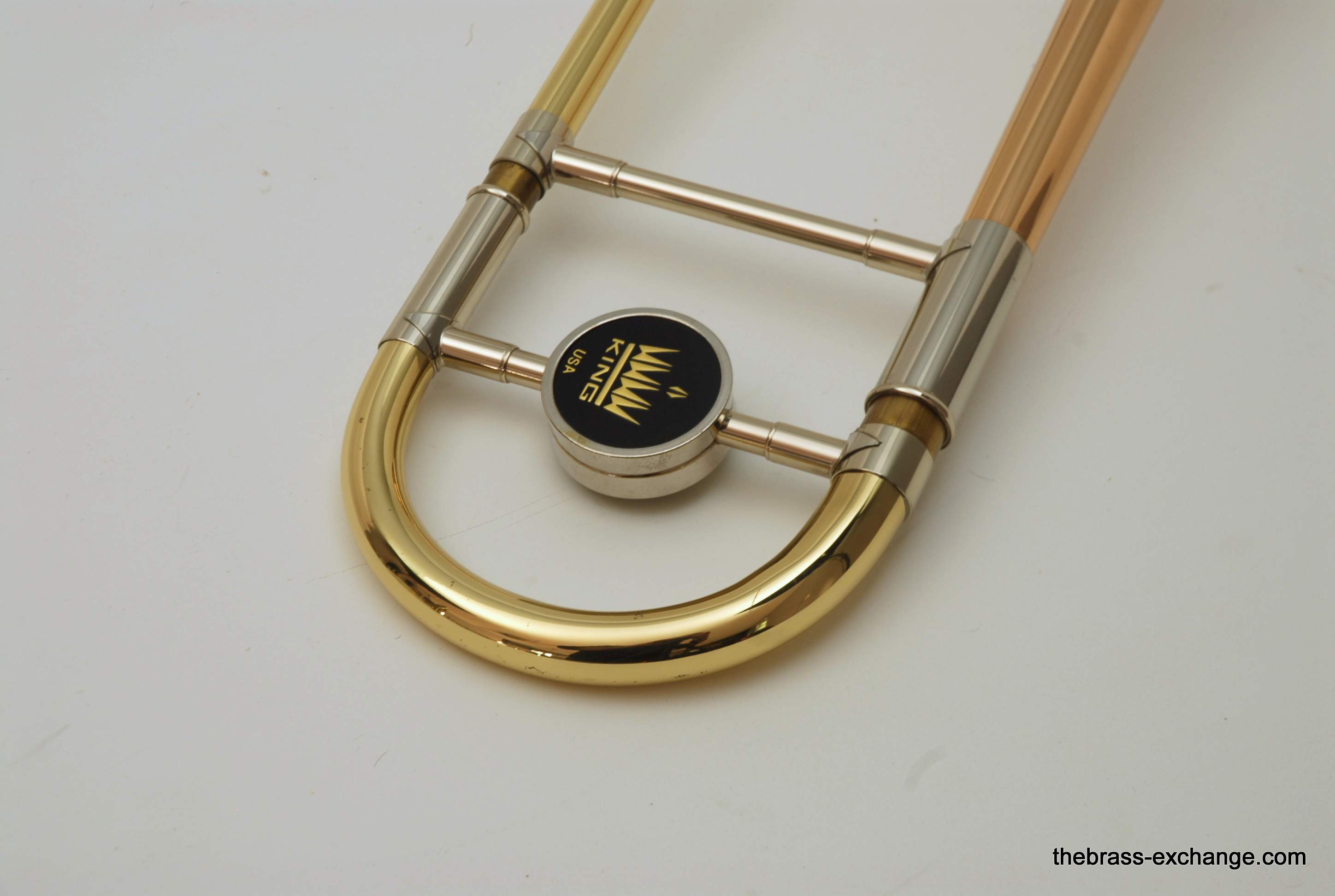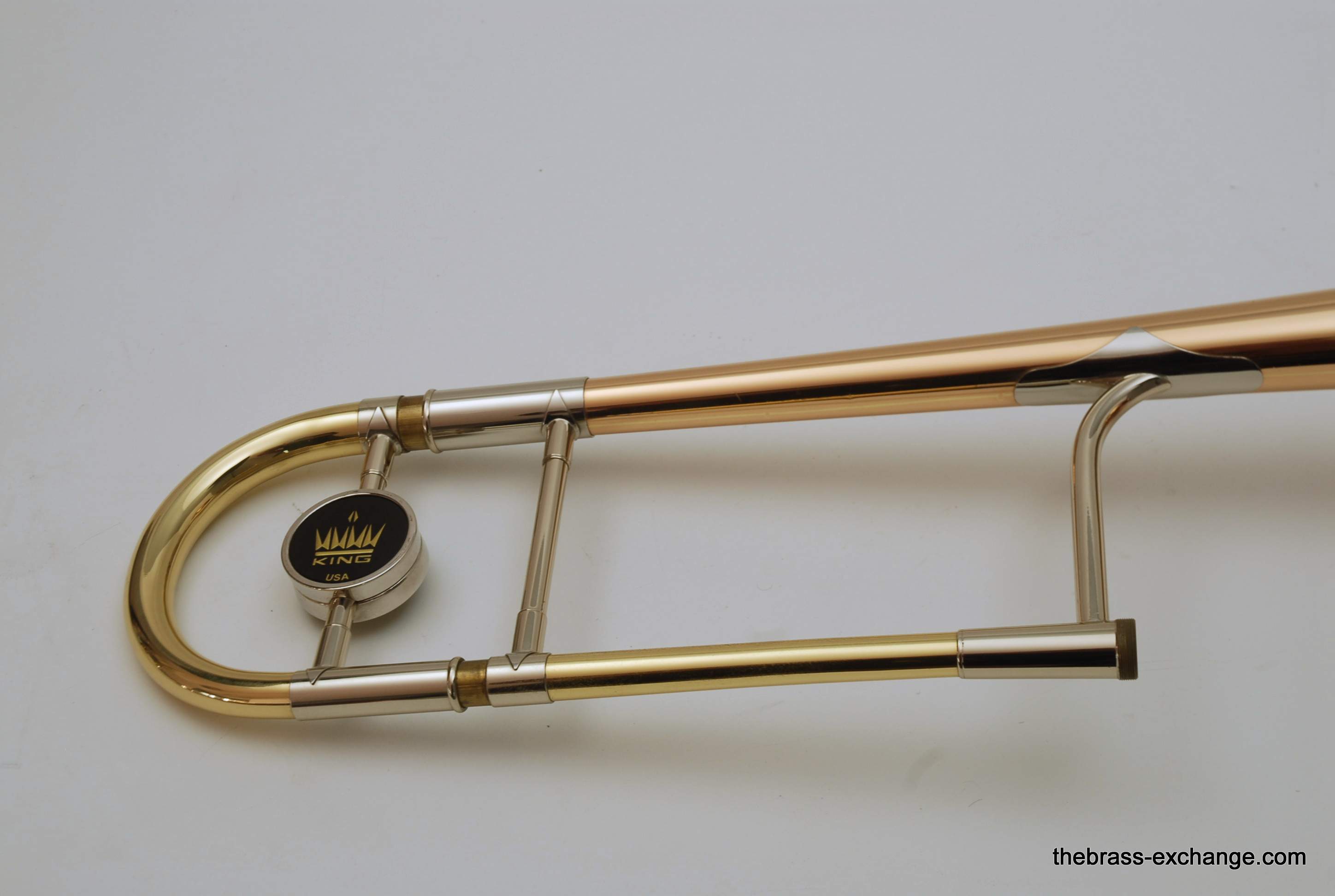 King 4B-G Model 2104.  Pre-owned, in excellent condition.  Plays perfectly, no prior damage or repairs, has a fantastic slide.  Is approximately 10 years old.  Has 8.5" gold brass bell, .547 bore nickel silver slide.  Plays with a lot of warmth, as you would expect with gold brass, gorgeous sound.  Takes standard large shank mouthpiece, not included.  Original case in excellent condition.  Would be a fantastic all around tenor for any player that wants a large horn but no F attachment.  Would also be a great large tenor Jazz Trombone.  This model sells new today for over $3000, with limited availability.