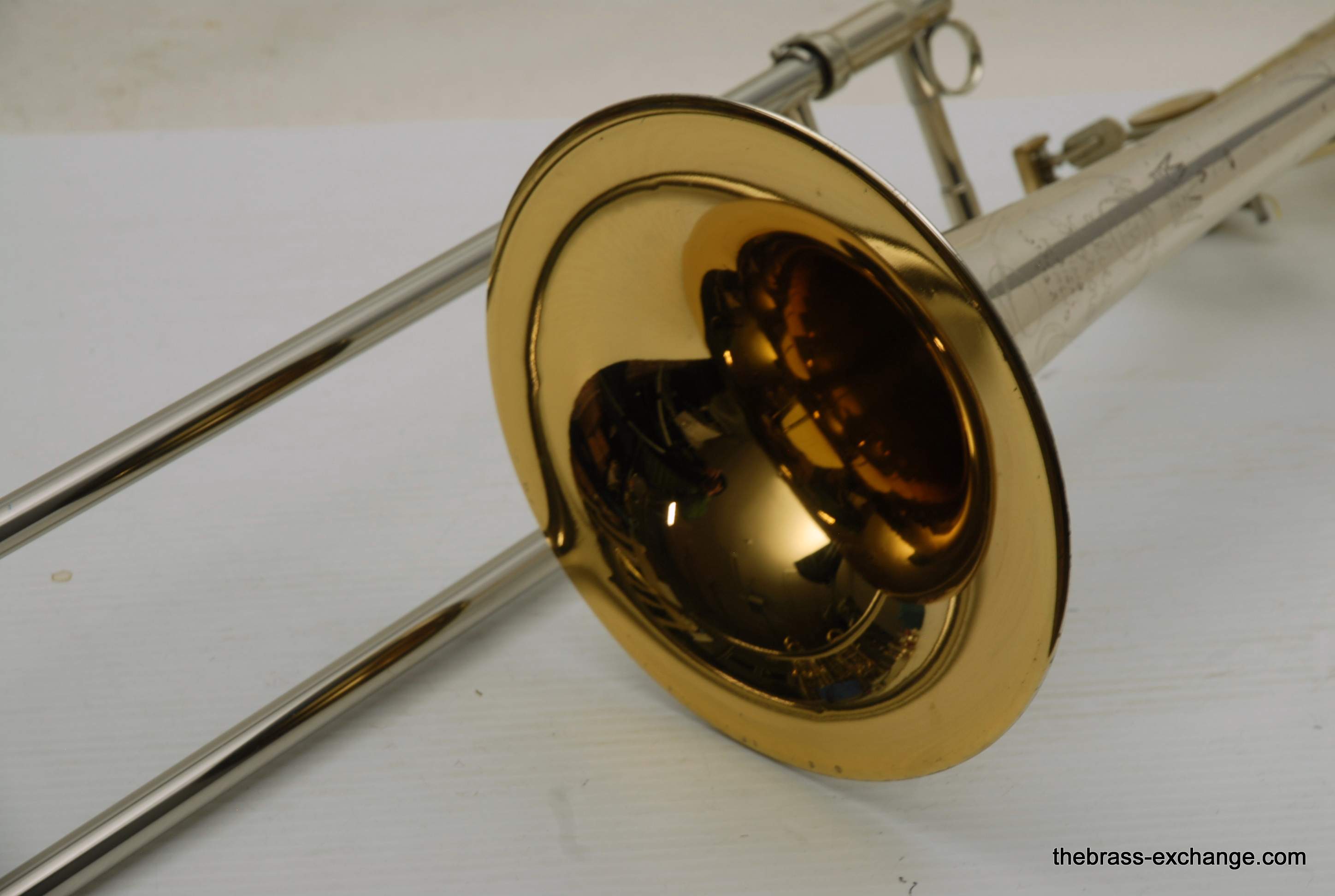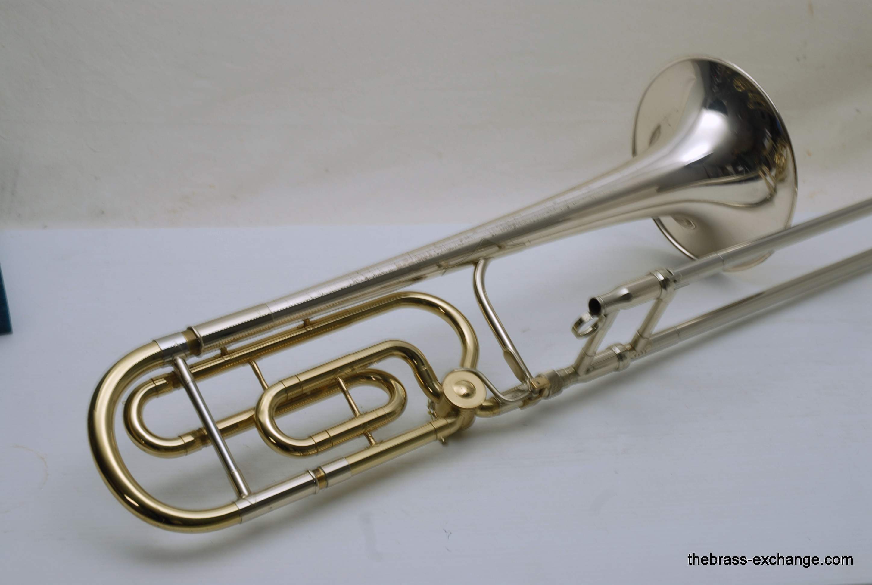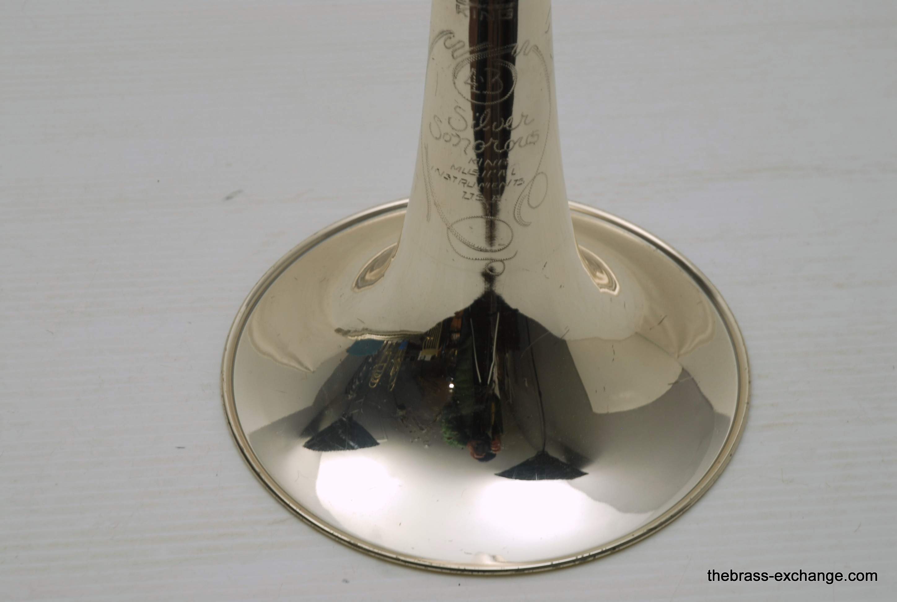 King 4B Silversonic Sonorous.   Classic Sterling Silver King 4B Silversonic.  Has 8.5" Sterling Silver Bell with Gold Plating on inner bell.  Traditional Rotor.  Lightweight Nickel Silver Handslide .547 Bore for large shank mouthpiece.  This instrument is in excellent playing condition and has an excellent without defects.  No previous damage or repairs.  Some lacquer wear but not bad.  Is still a very attractive instrument.  Enormous Energy out front with Sterling silver.  Sound carries with outstanding forward projection.  True pitches, and slots easily.  Would be an excellent choice for any player looking to play a large bore sterling silver horn.  King no longer offers the 4B Model in Sterling.  But, if they did, you would get an upcharge of $1600 for Sterling, because this is exactly what they do today on the 3B model.  Current price for a new Brass 4BF is over $3400, add a $1600 upcharge and you are at 5K.  No wonder they don't offer it any longer.  This one comes with a new fiberglass Crossrock Case, Blue, these sell new in the $350-400 range.  In-stock for immediate delivery.