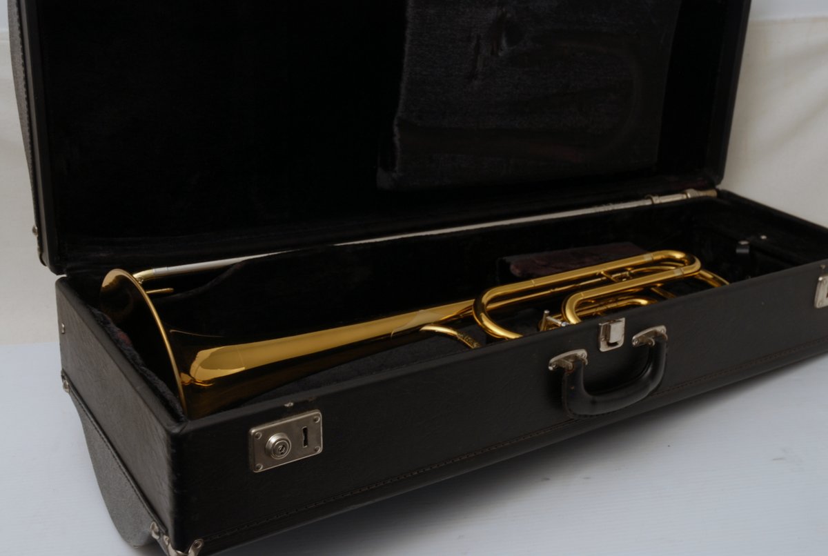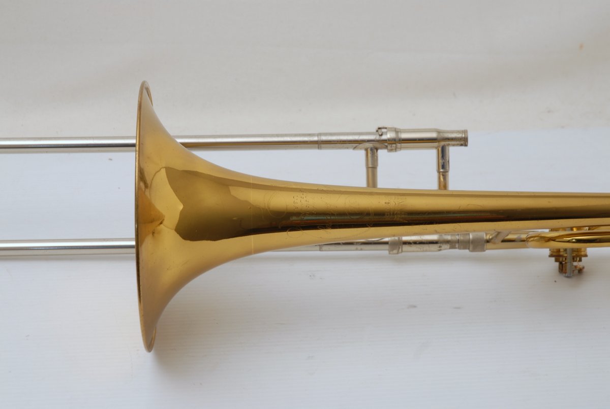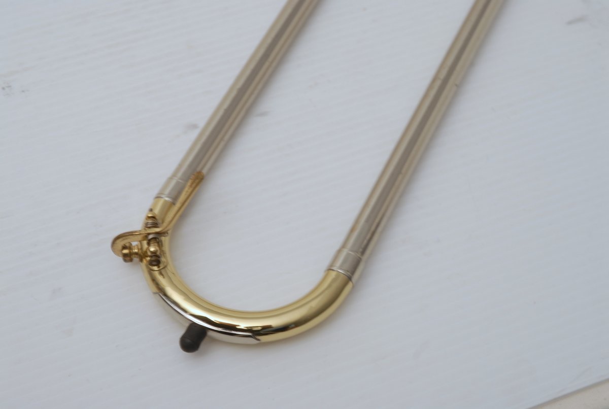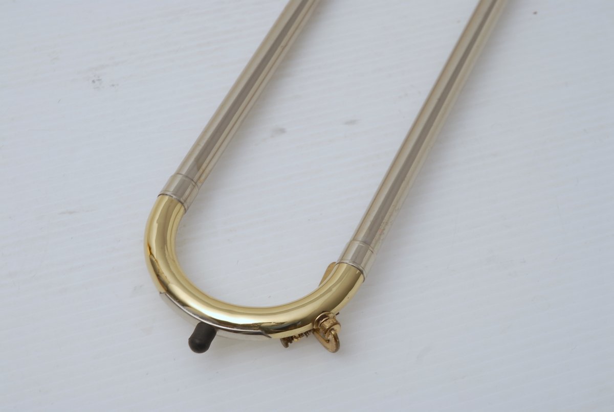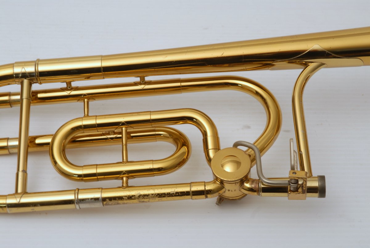 Before sale, it received recent cleaning and mechanical service at The Brass Exchange. The handslide operated smoothly and reliably, and the instrument played well following preparation. A non-original Benge case in very good condition was included along with mouthpiece and basic lubricants.