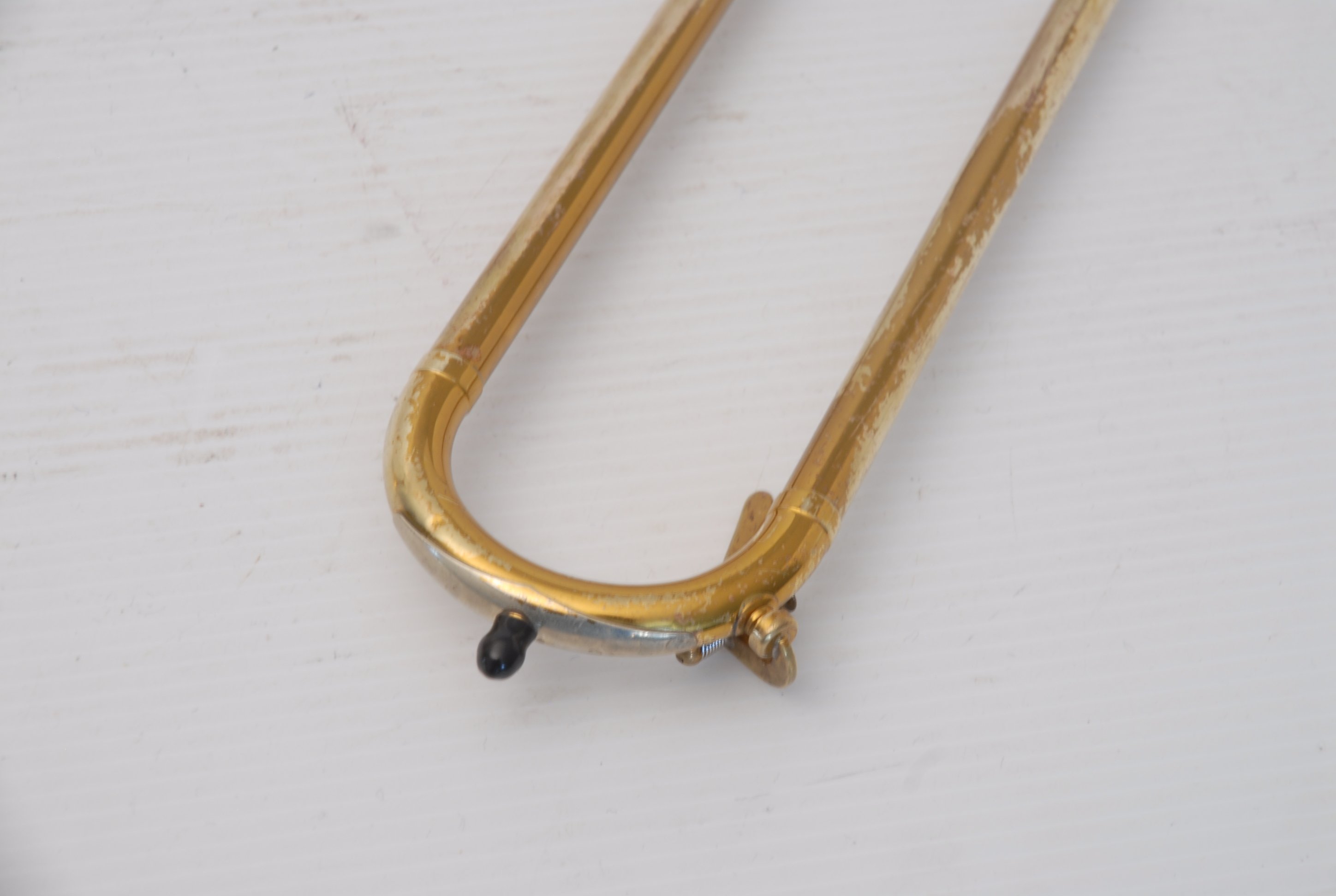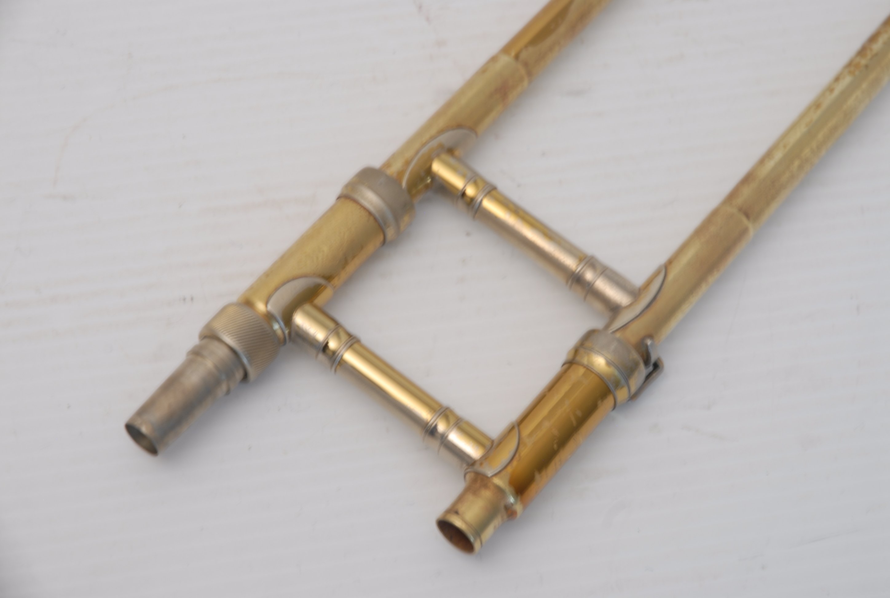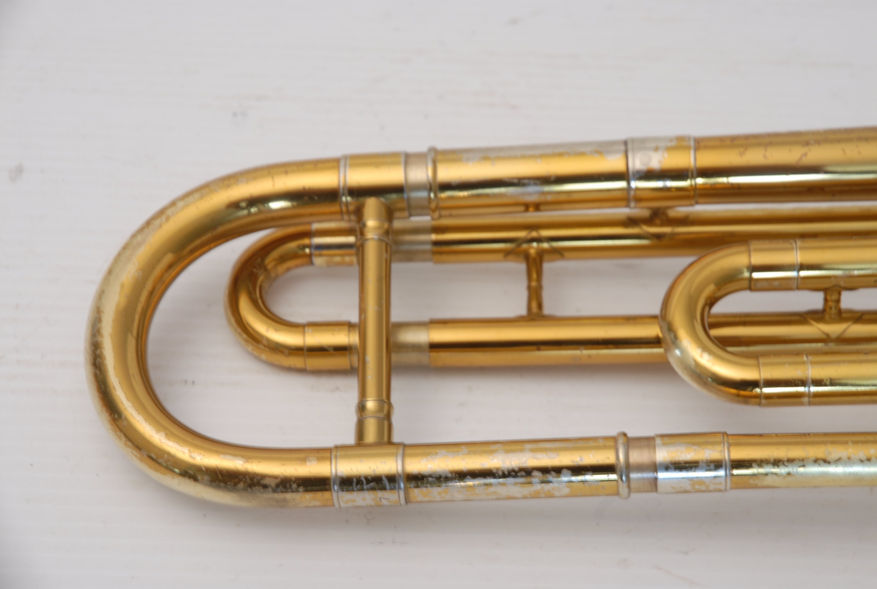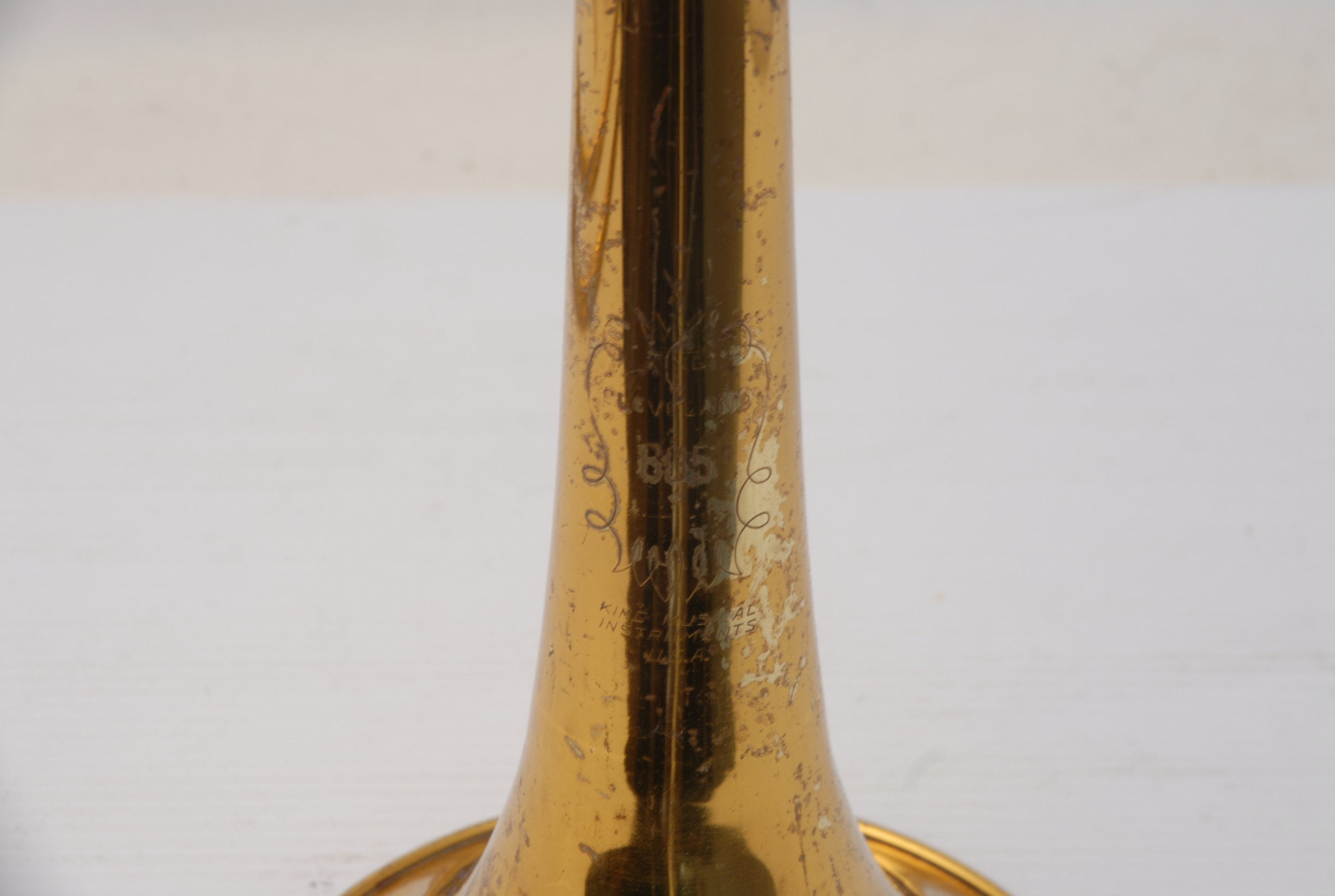 These photos on this listing come from an earlier period of our shop photography. They still accurately document the instrument and its condition, but may not reflect our current studio style. They are preserved as part of the historical record of this King 605 student trombone.