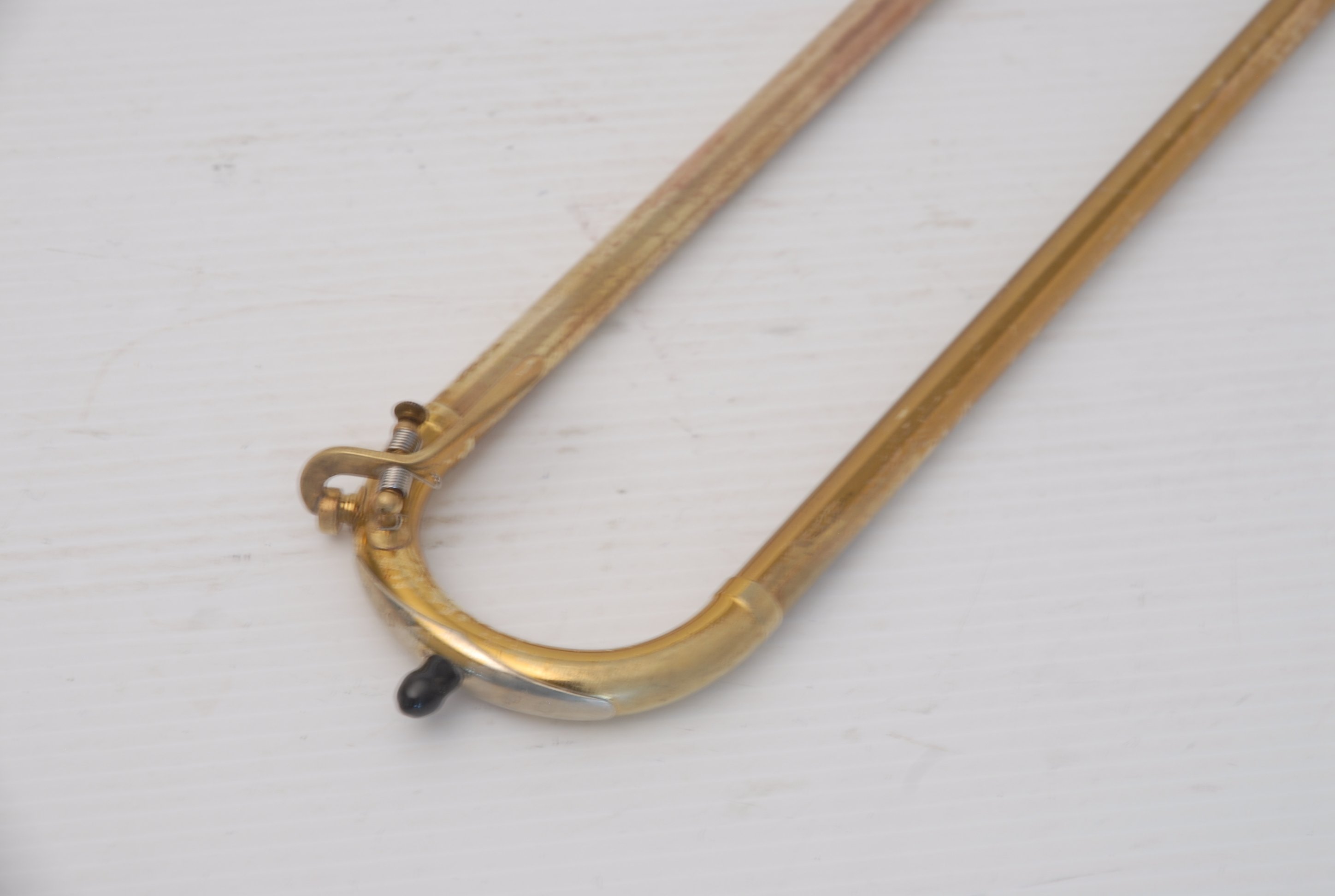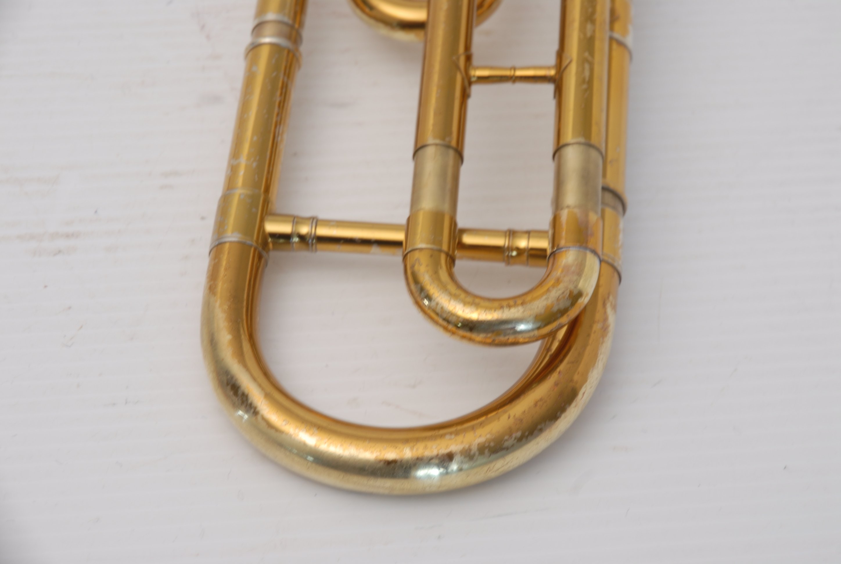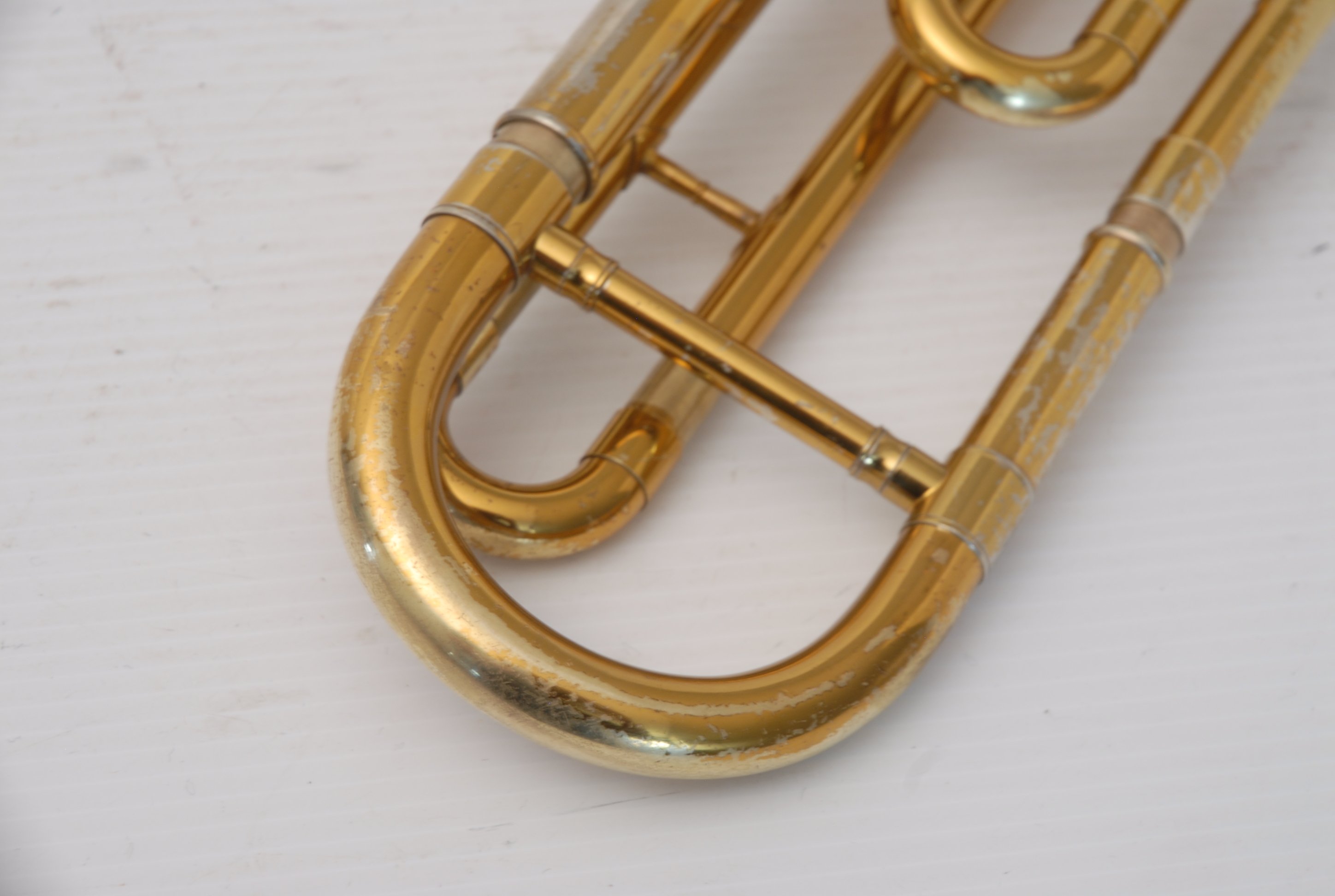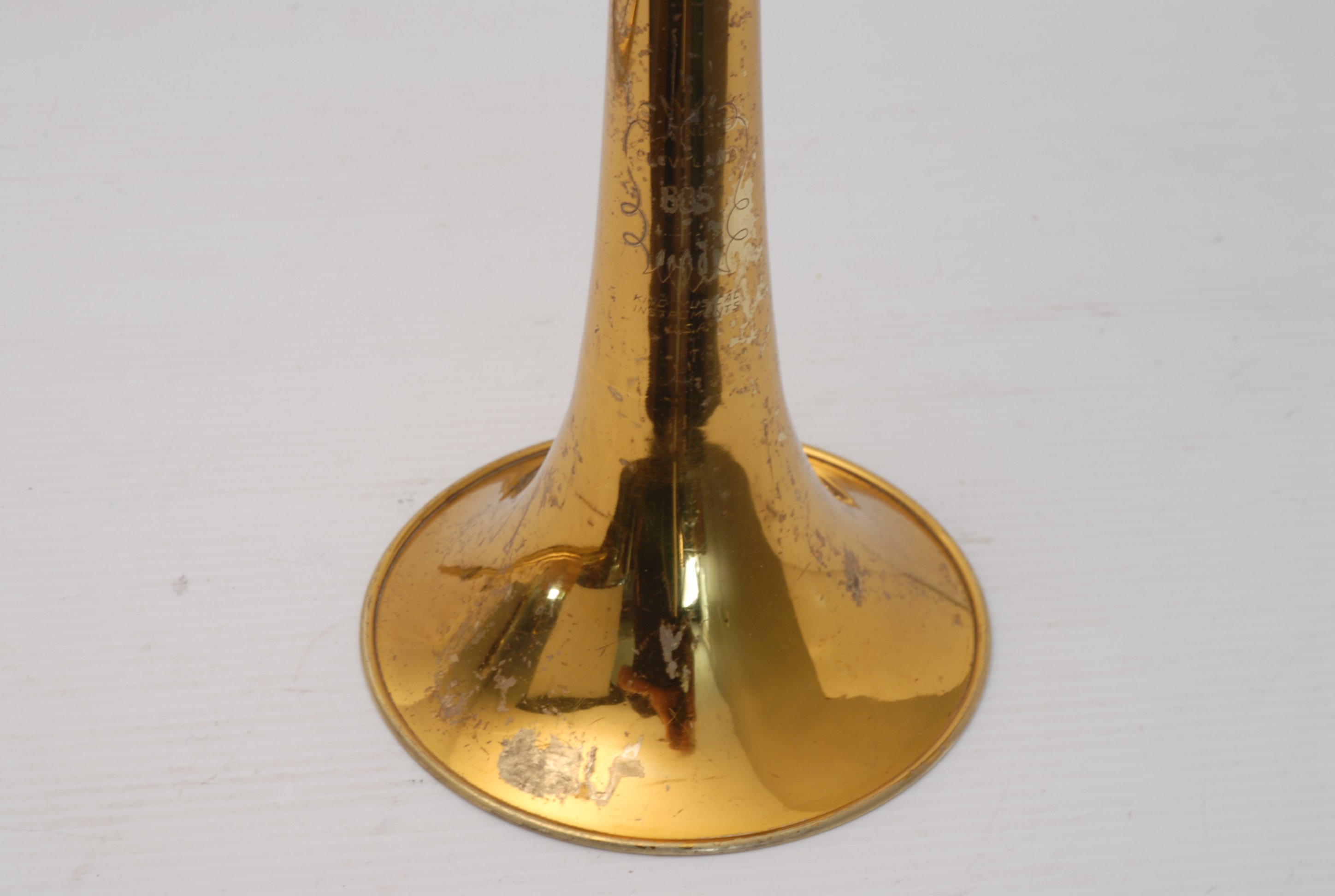 These photos on this listing come from an earlier period of our shop photography. They still accurately document the instrument and its condition, but may not reflect our current studio style. They are preserved as part of the historical record of this King 605 student trombone.