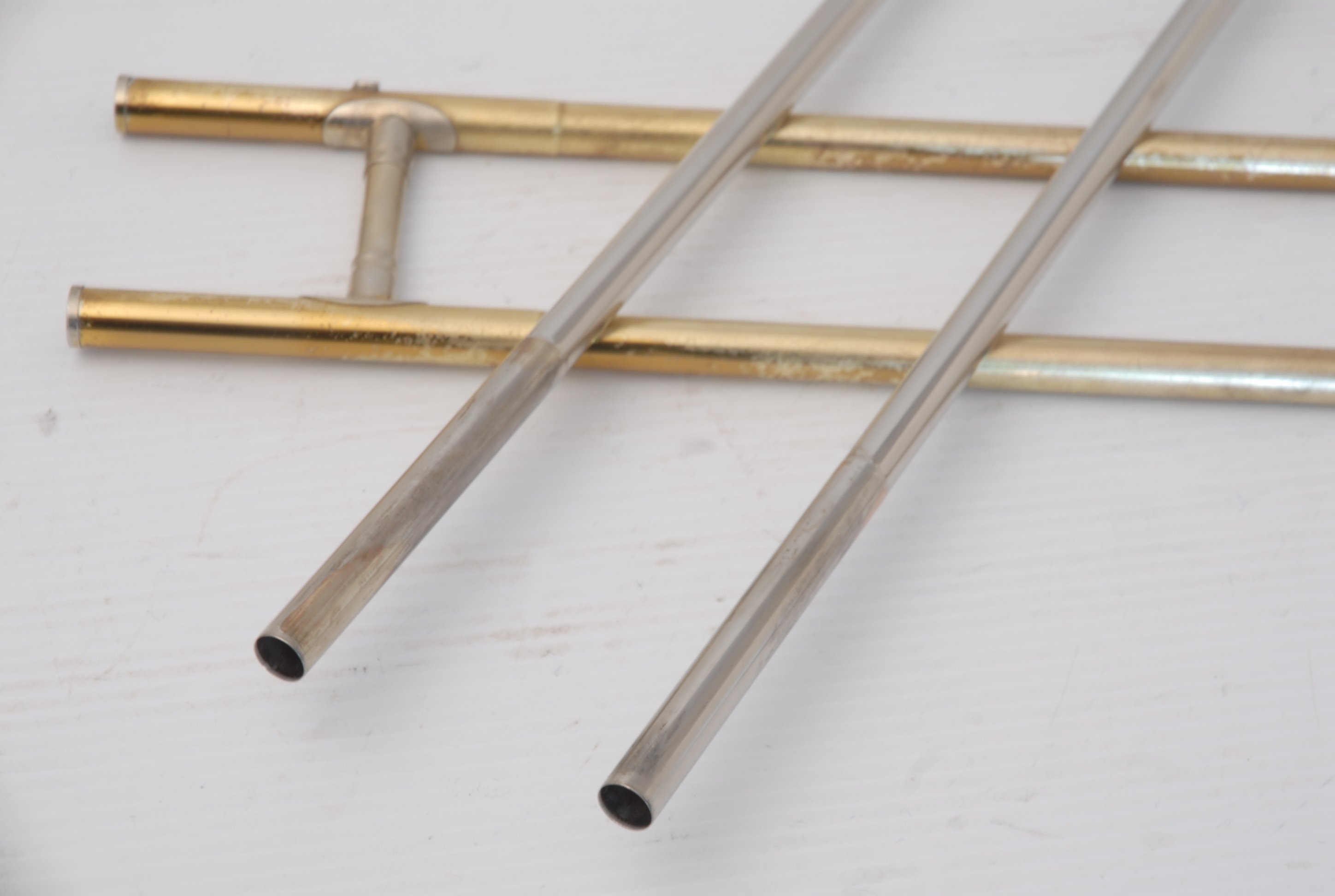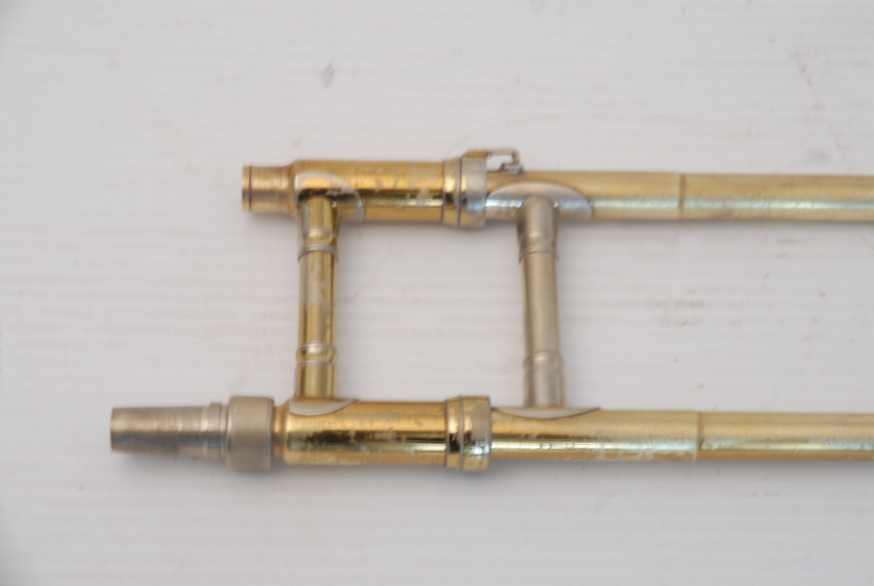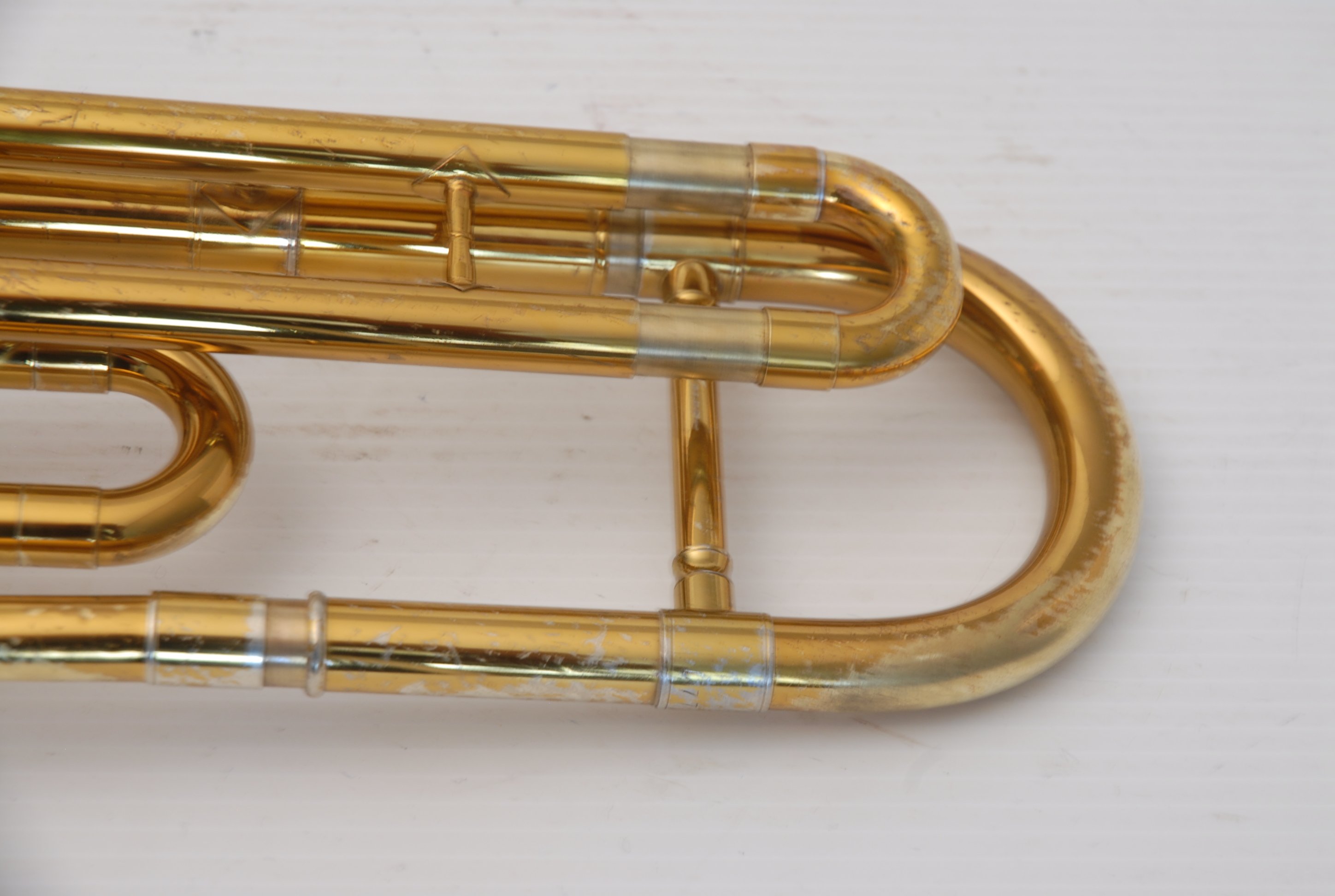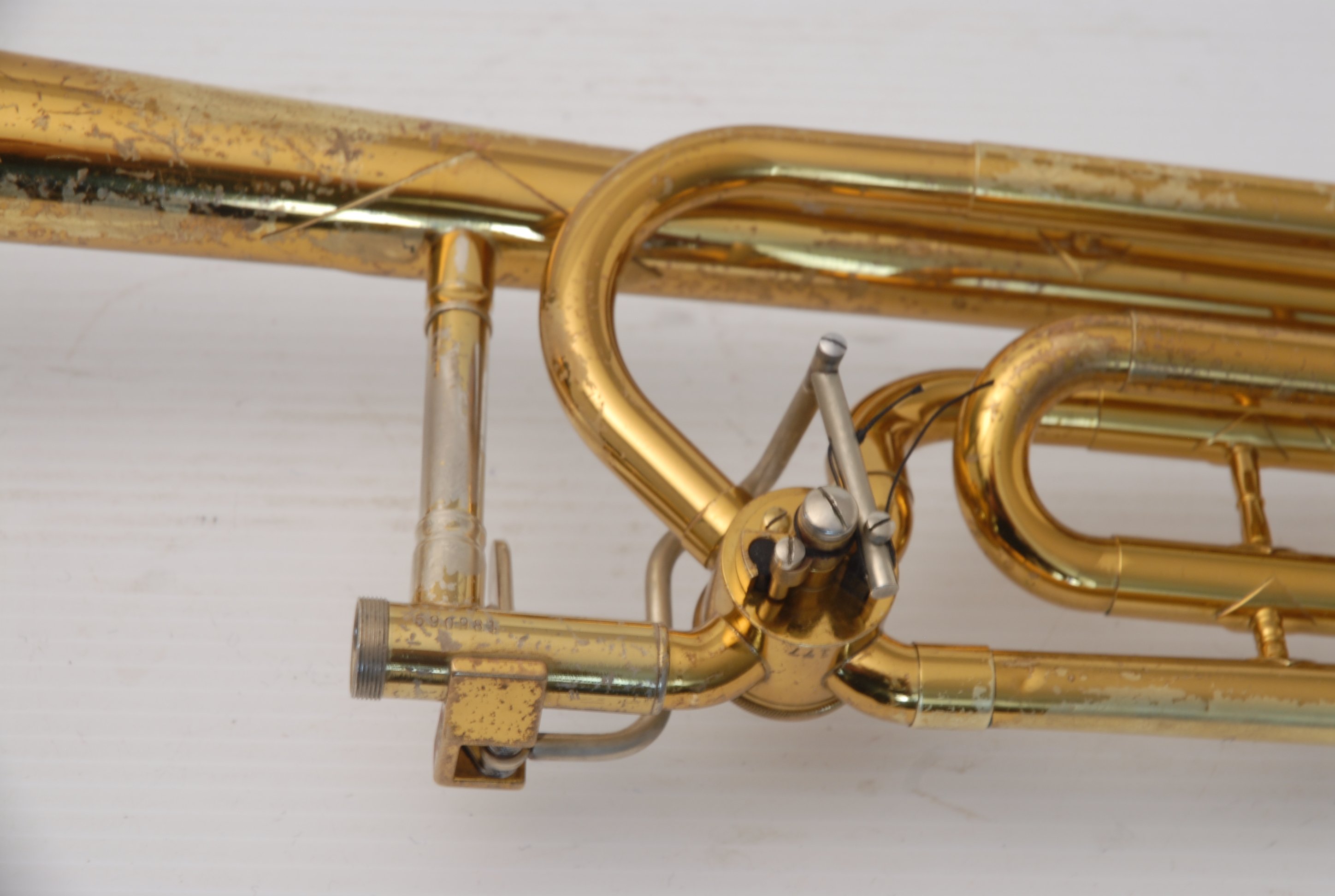 These photos on this listing come from an earlier period of our shop photography. They still accurately document the instrument and its condition, but may not reflect our current studio style. They are preserved as part of the historical record of this King 605 student trombone.