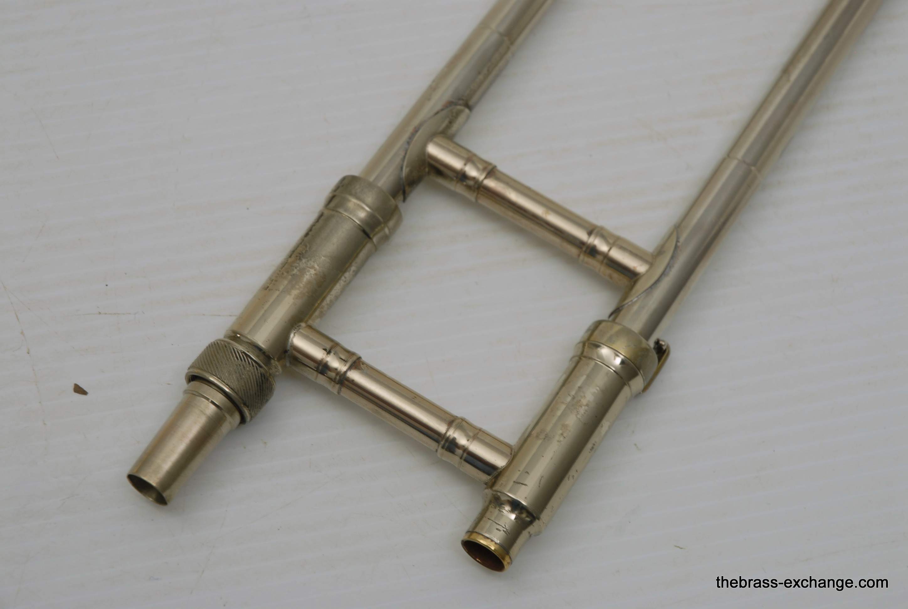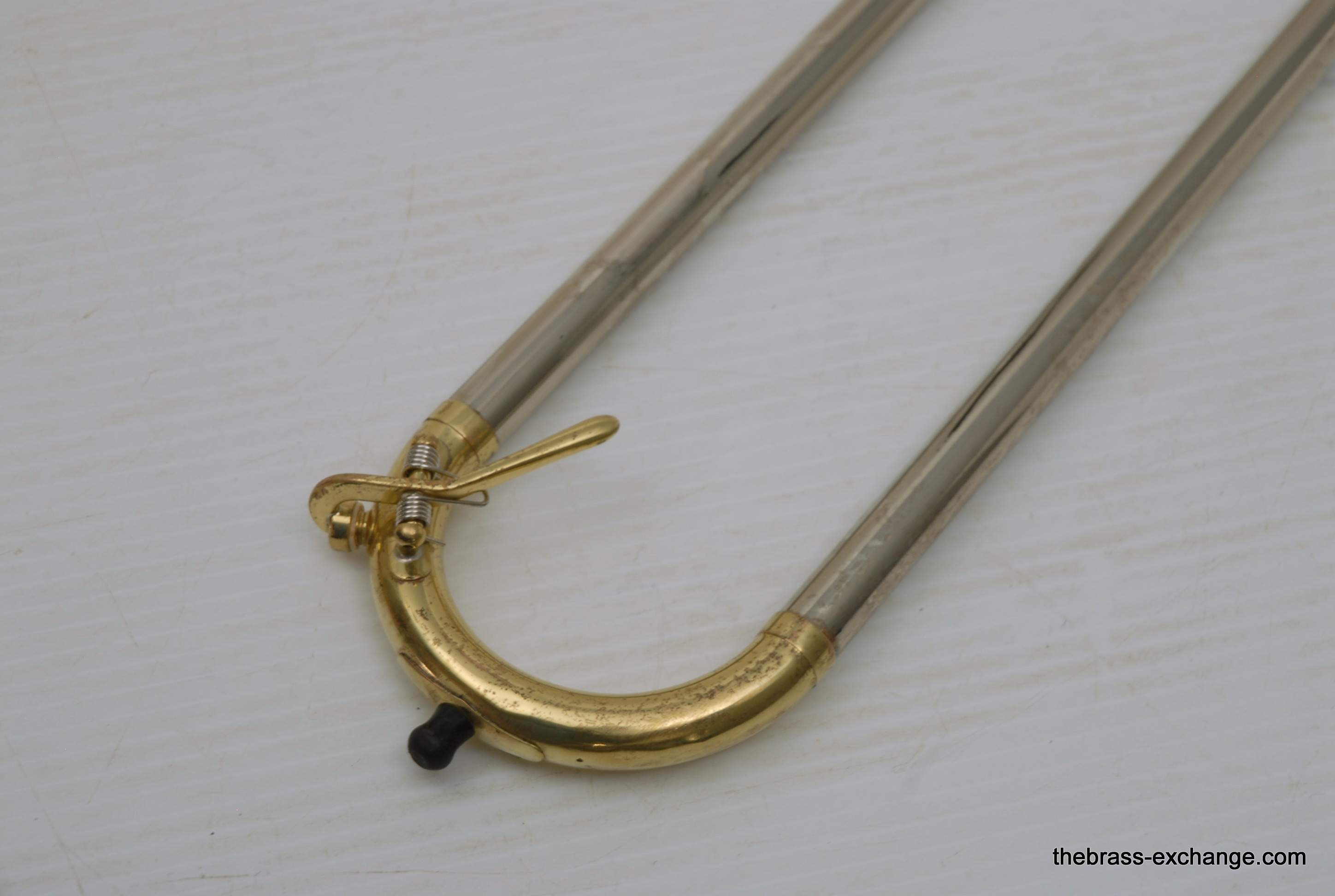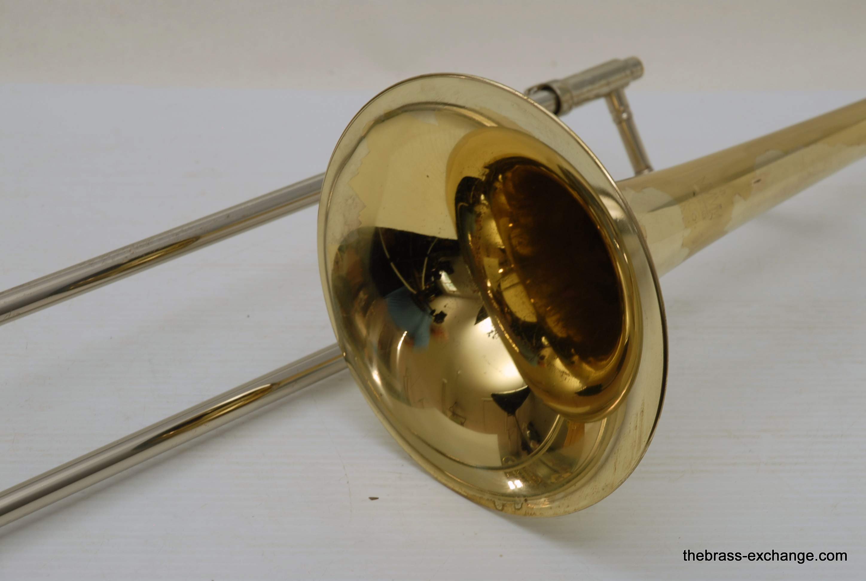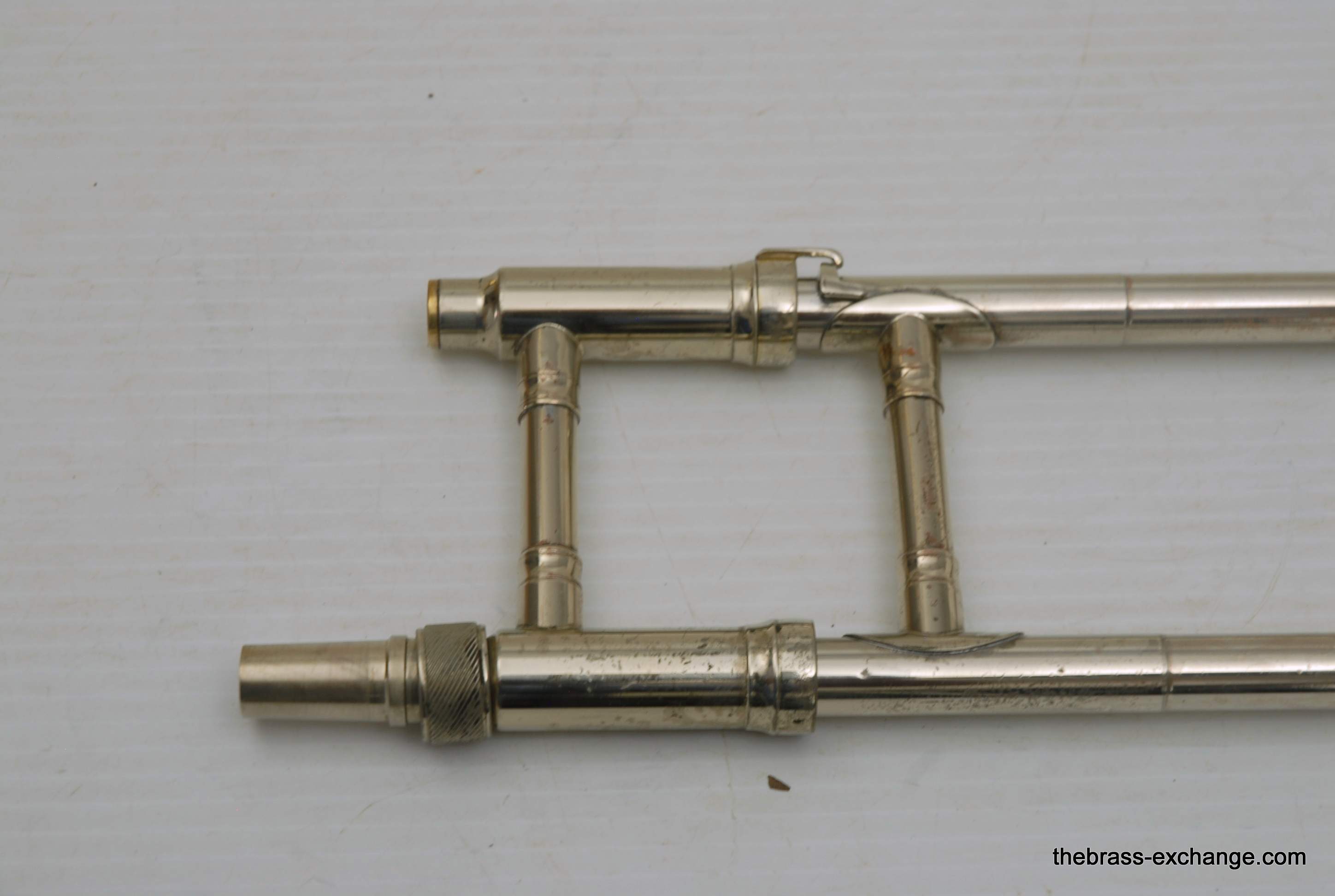 King 606 Student Model Trombone. Complete set-up including mouthpiece and handslide lubricant. This model has the 8" yellow brass bell and lightweight nickel silver handslide. Has had full shop service, chemical bath, ect. Would be a perfect entry level trombone for a new student. Some lacquer wear, but the horn is very straight and plays exactly as it should.