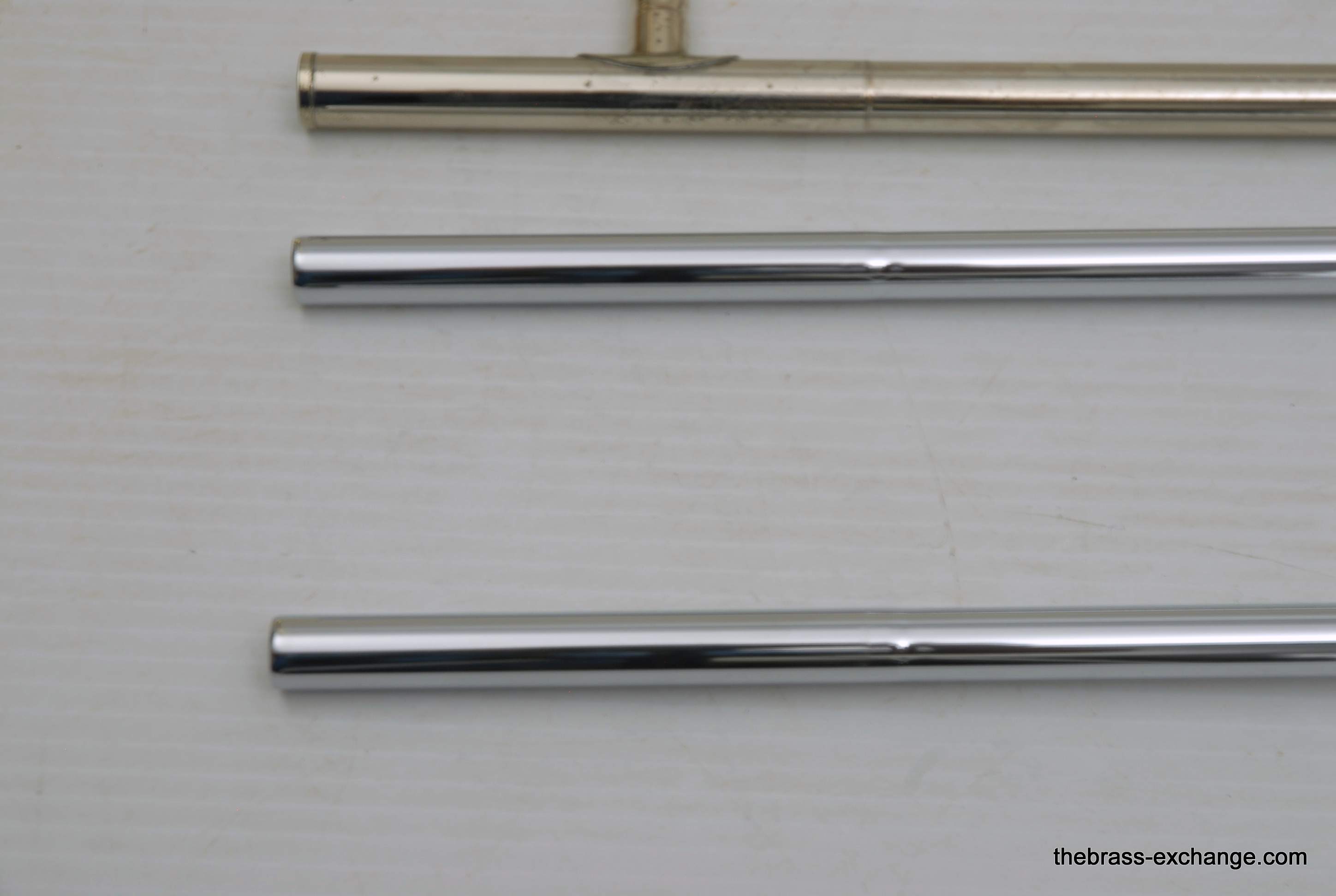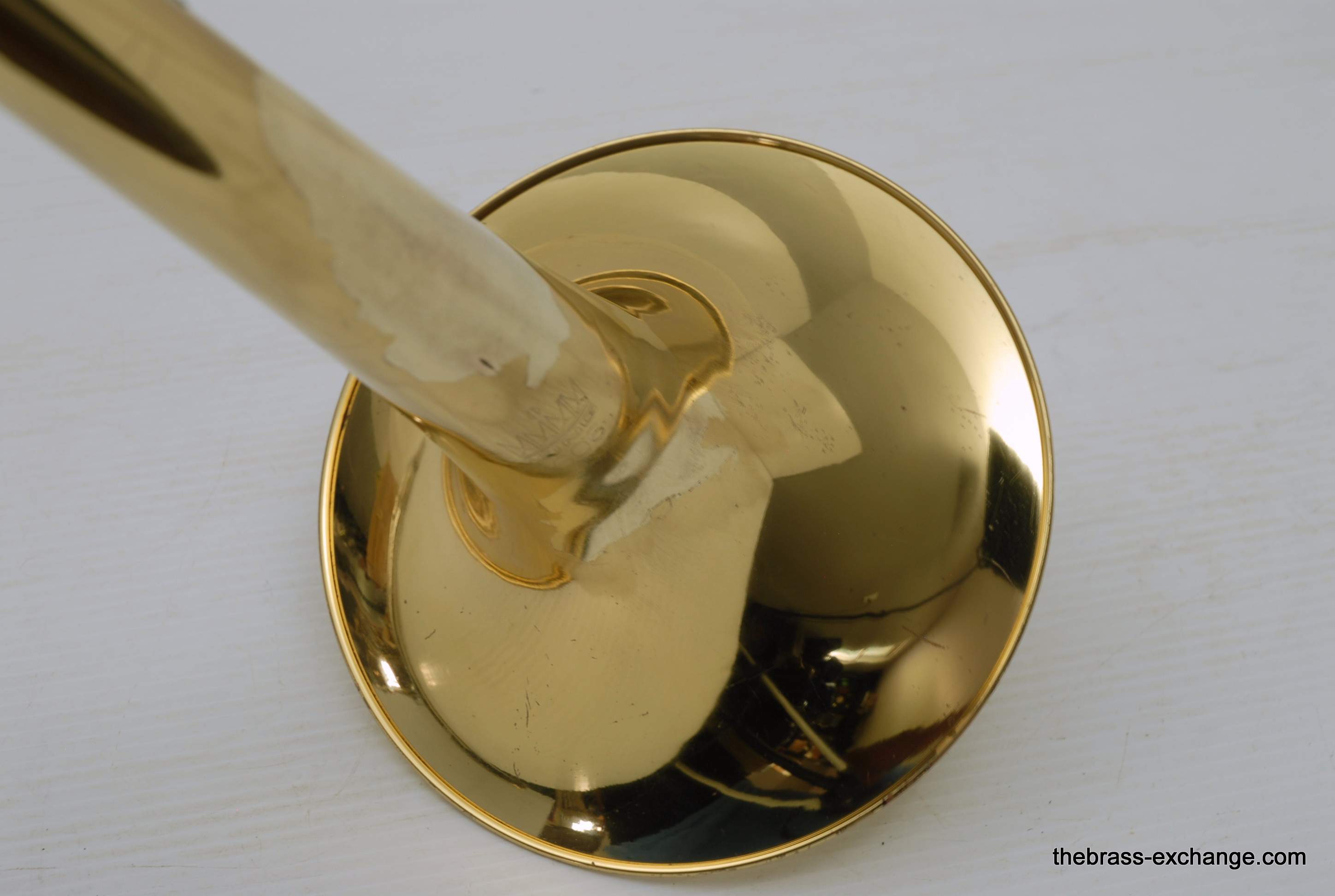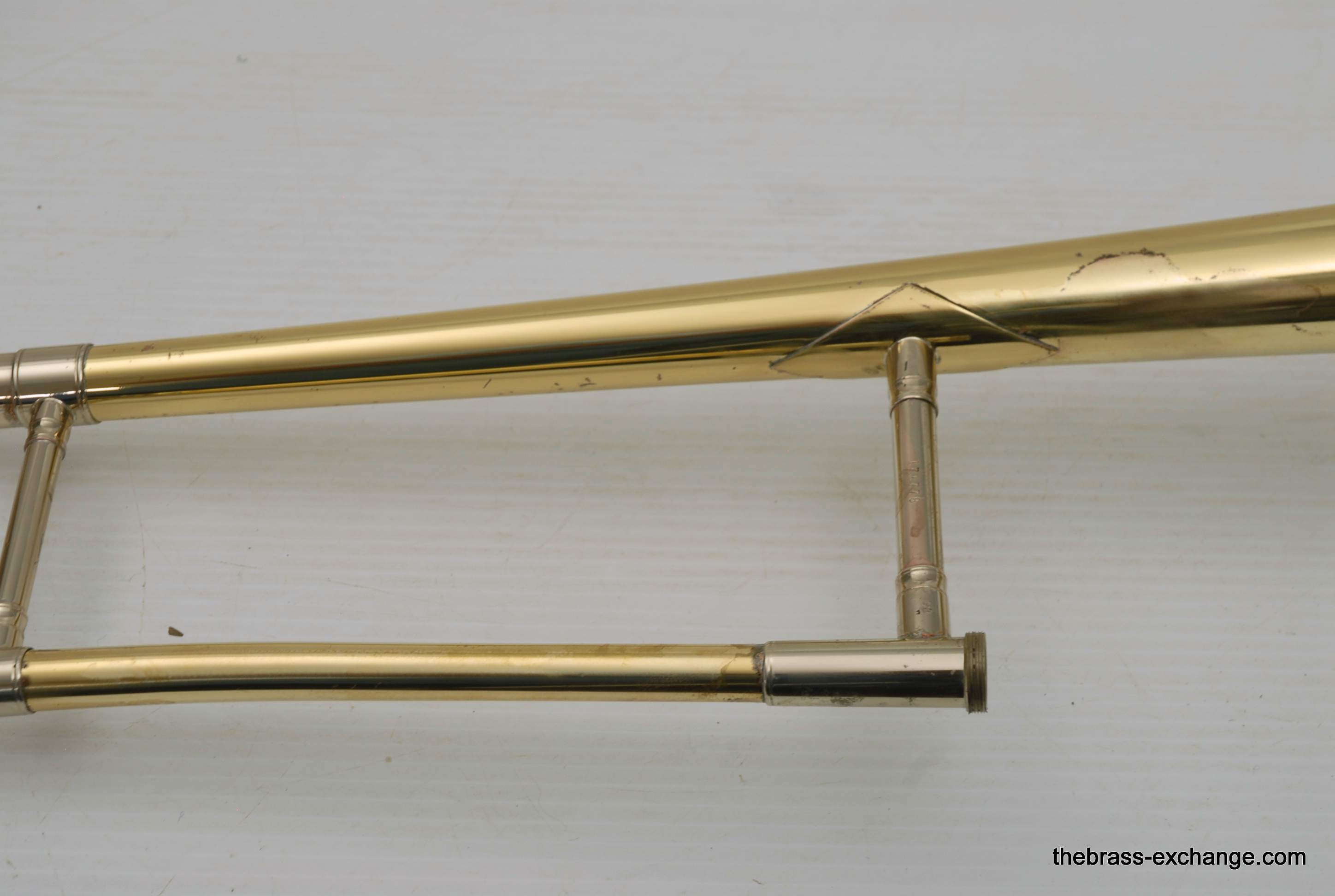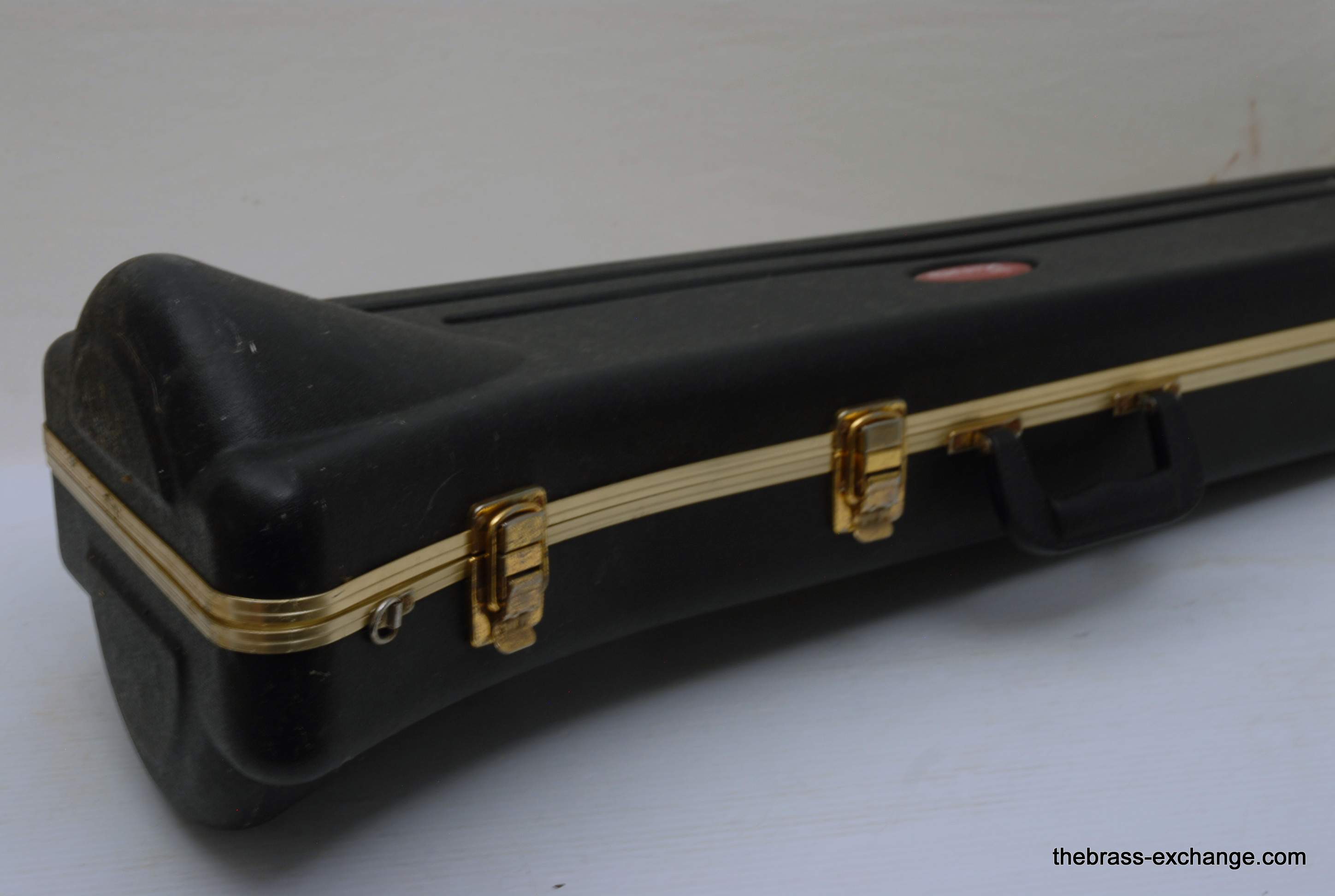 King 606 Student Model Trombone. Complete set-up including mouthpiece and handslide lubricant. This model has the 8" yellow brass bell and lightweight nickel silver handslide. Has had full shop service, chemical bath, ect. Would be a perfect entry level trombone for a new student. Some lacquer wear, but the horn is very straight and plays exactly as it should.