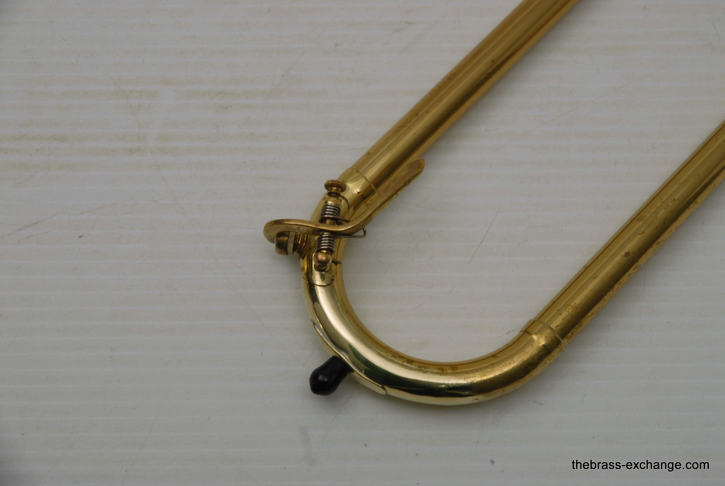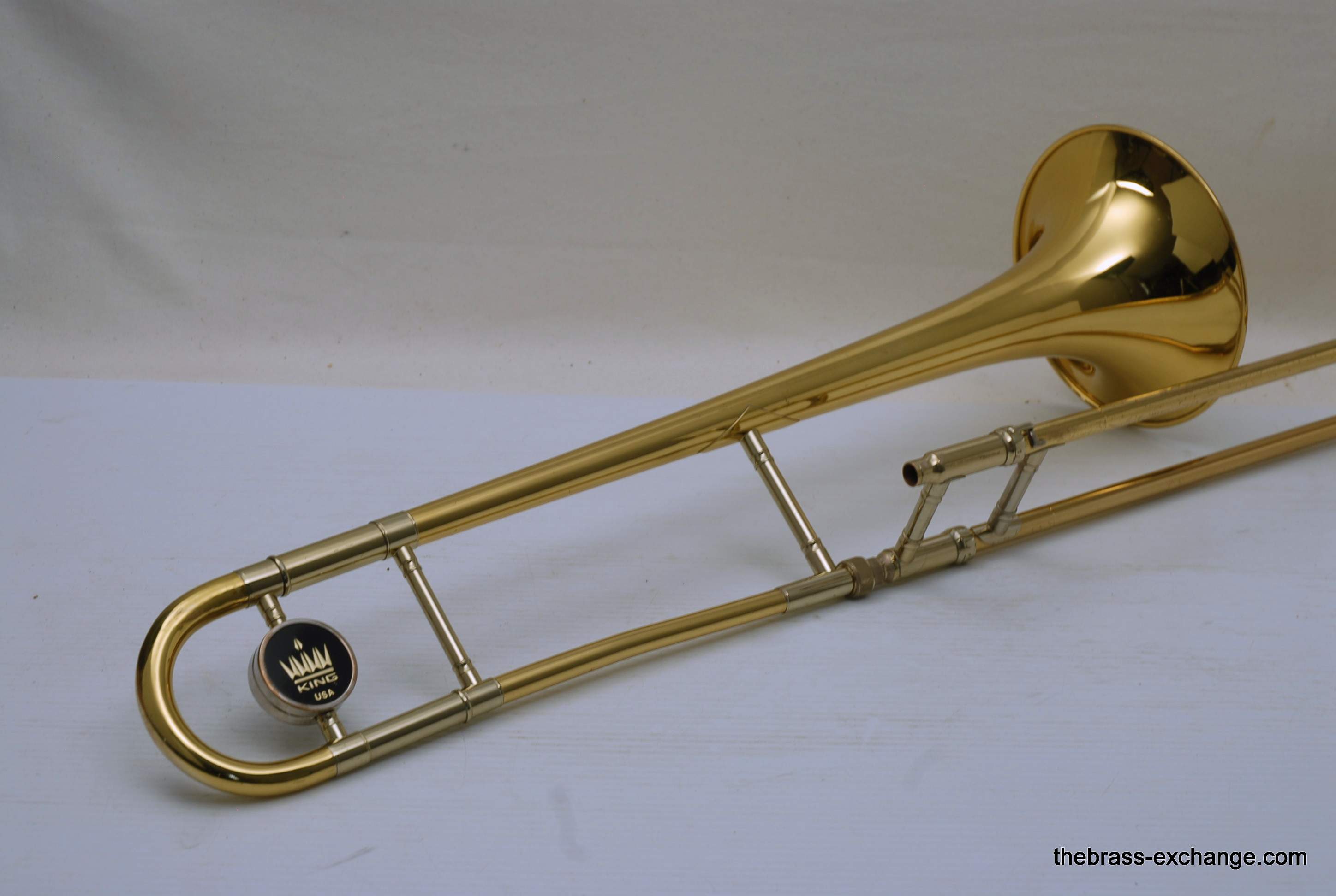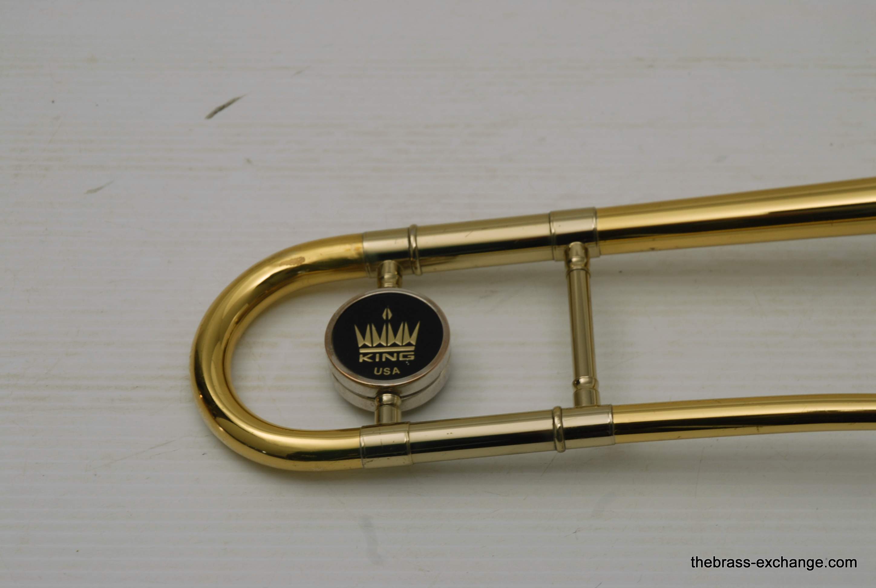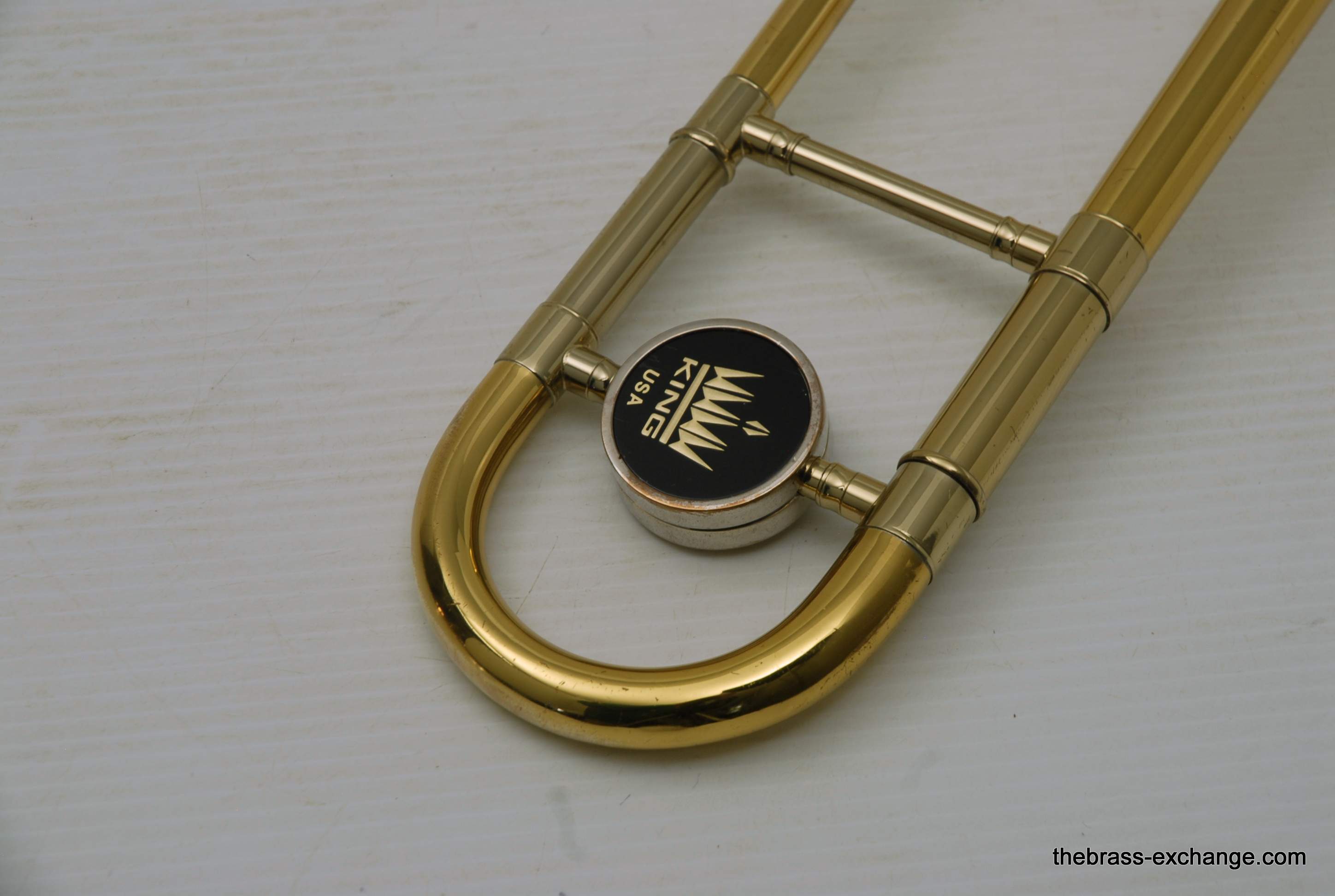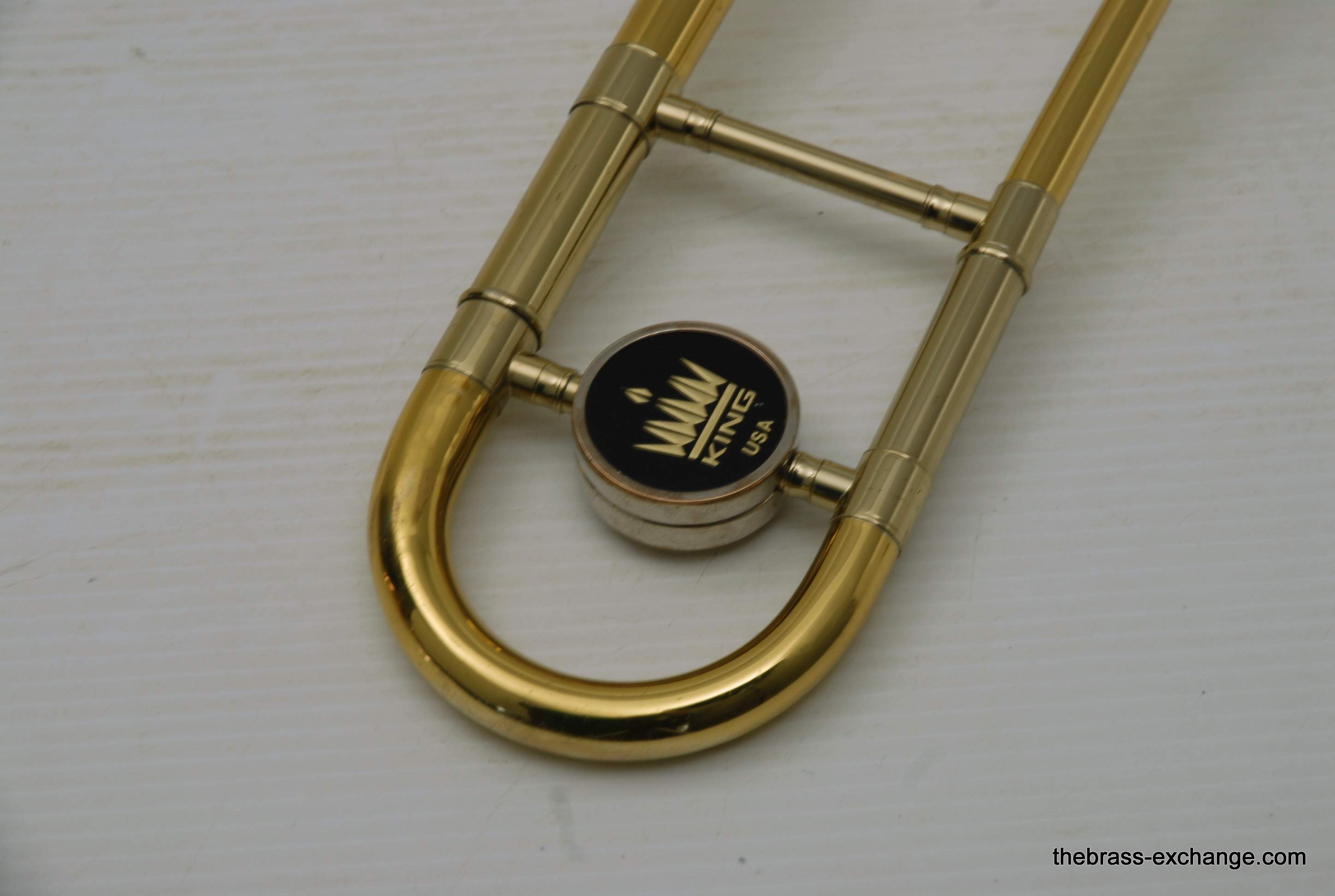 King 606 Trombone.  Single owner pre-owned.  Has had full shop service with chemical bath.  No dents or dings, no previous damage or repair.  Has great slide and plays 100%.  Lacquer wear is minimal, has very bright appearance. This model is one of the most popular student trombones of the last 40 years.  Specifications are 8" yellow brass bell, .500 bore lighweight brass slide.  Small shank mouthpiece.  Any young player that has to carry his instrument any distance will appreciate the light weight ergonomic design of this outfit.  Includes mothpiece and Yamaha Trombone Slide Lubricant.  In-stock for immediate delivery.  Is ready to play out of the box.
