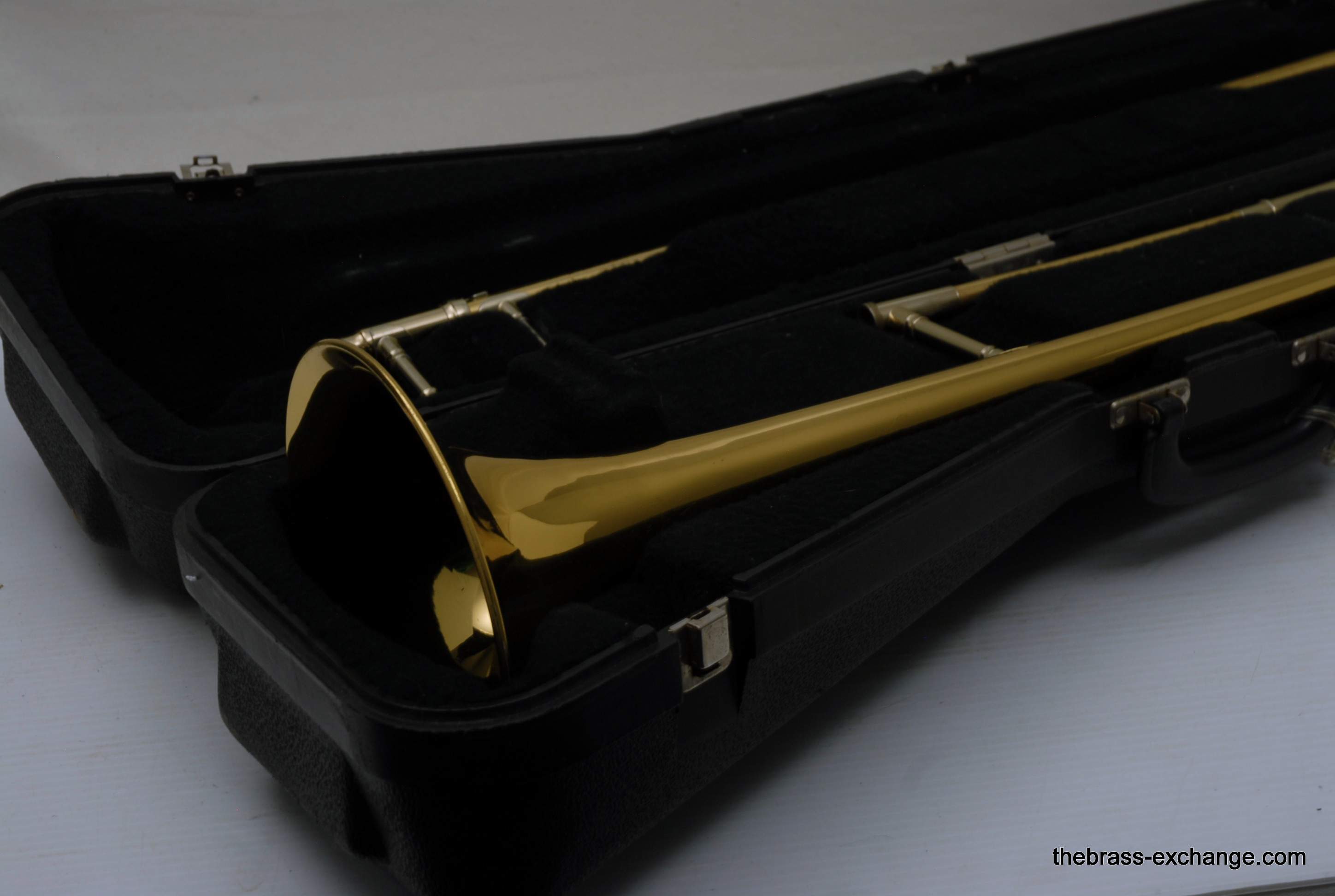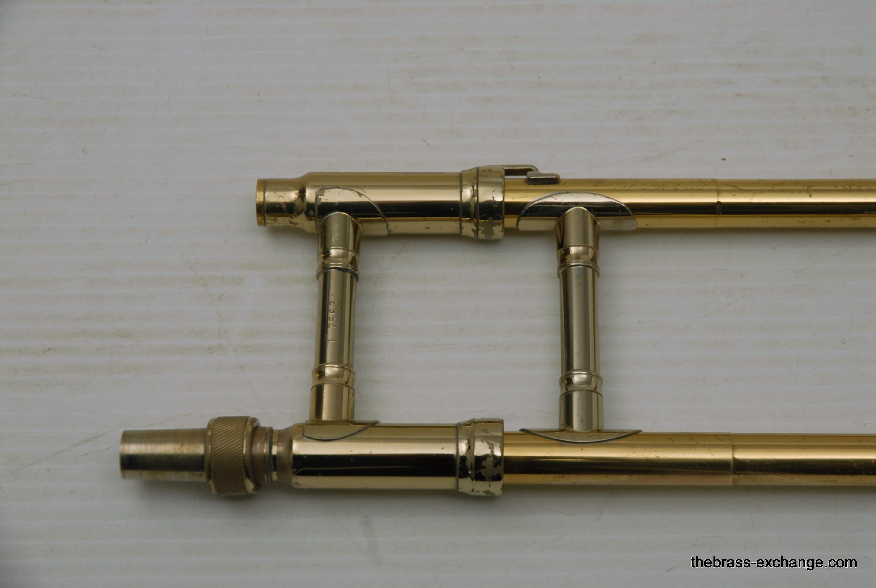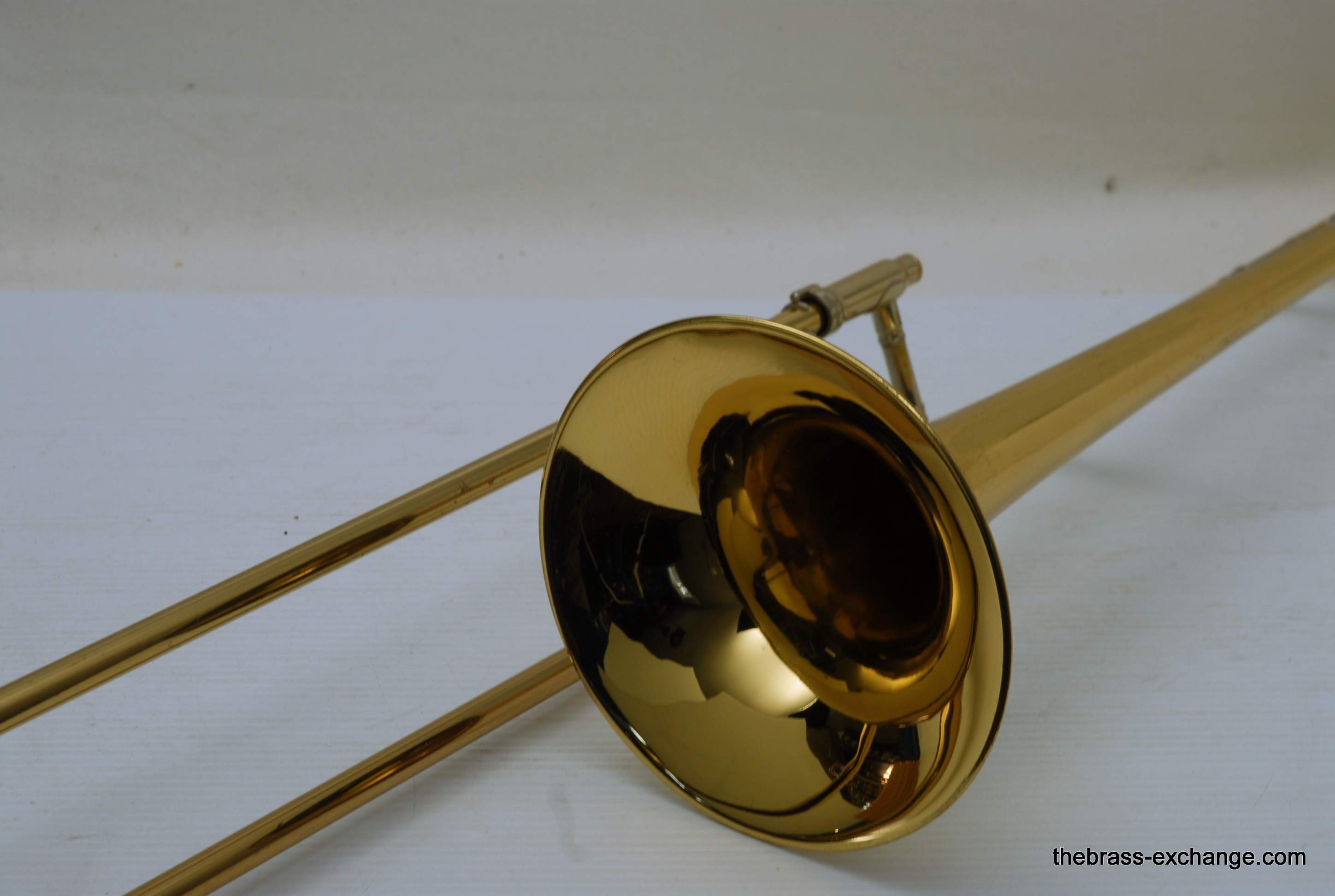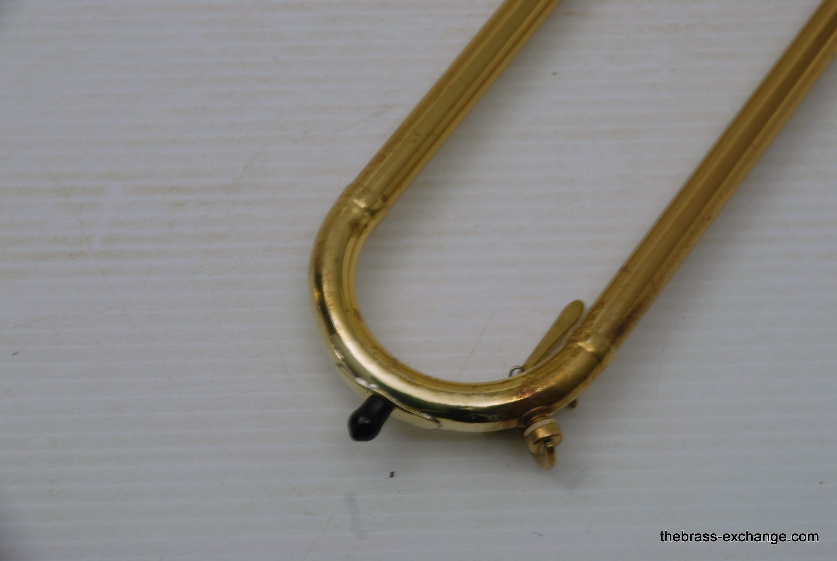 King 606 Trombone.  Single owner pre-owned.  Has had full shop service with chemical bath.  No dents or dings, no previous damage or repair.  Has great slide and plays 100%.  Lacquer wear is minimal, has very bright appearance. This model is one of the most popular student trombones of the last 40 years.  Specifications are 8" yellow brass bell, .500 bore lighweight brass slide.  Small shank mouthpiece.  Any young player that has to carry his instrument any distance will appreciate the light weight ergonomic design of this outfit.  Includes mothpiece and Yamaha Trombone Slide Lubricant.  In-stock for immediate delivery.  Is ready to play out of the box.