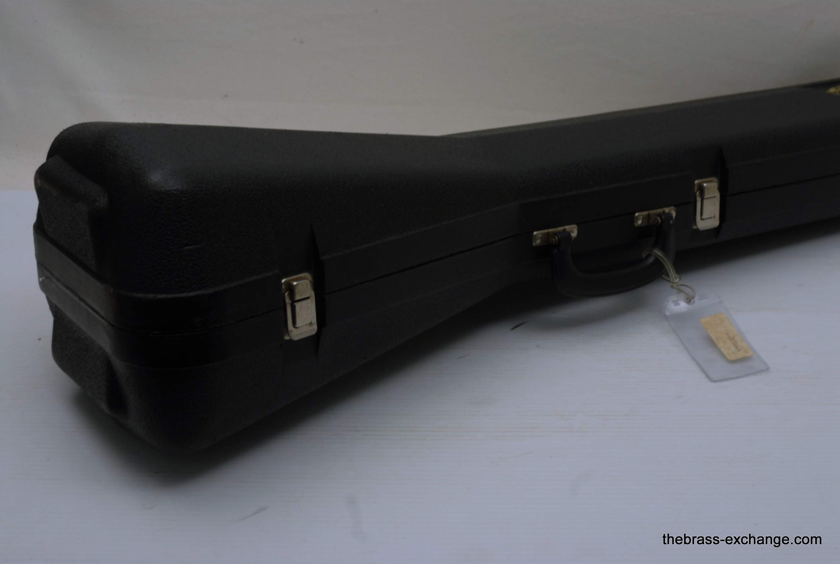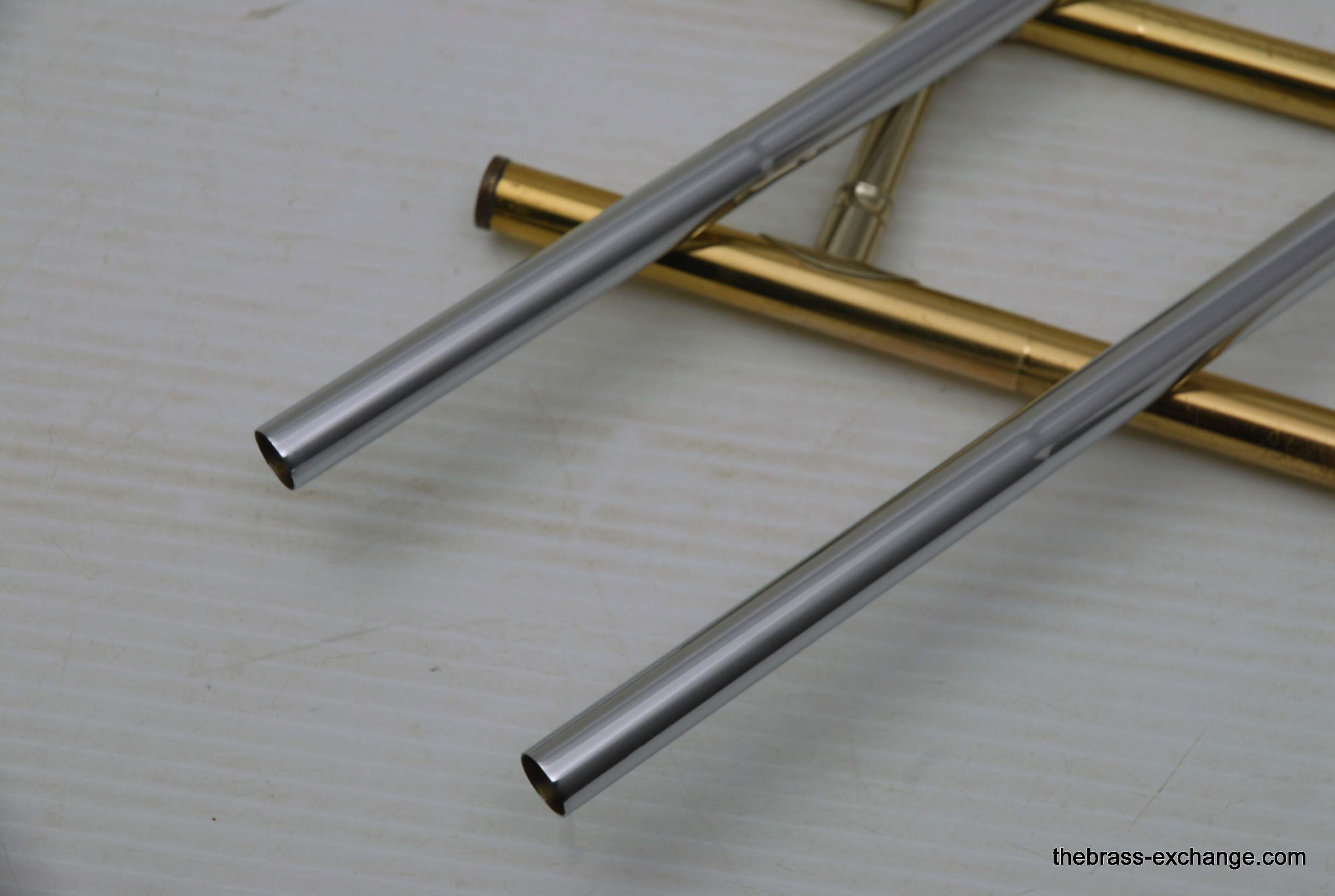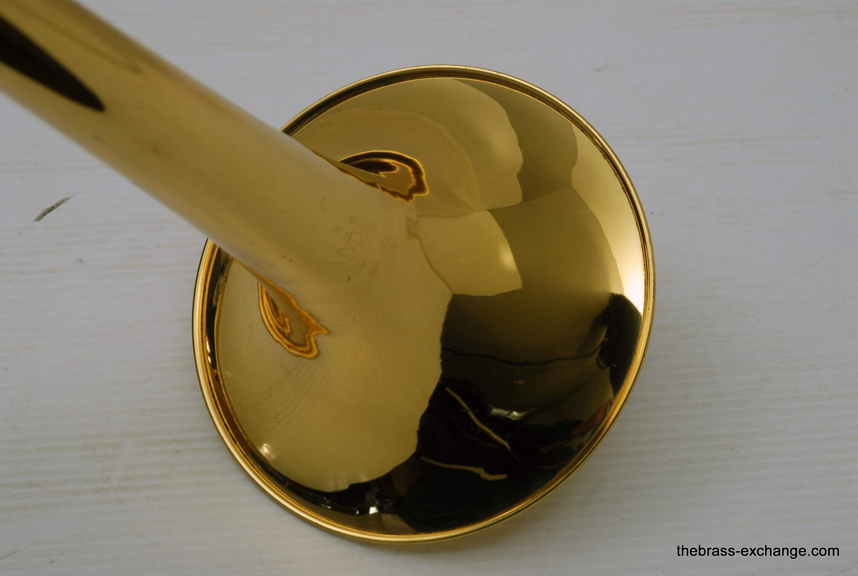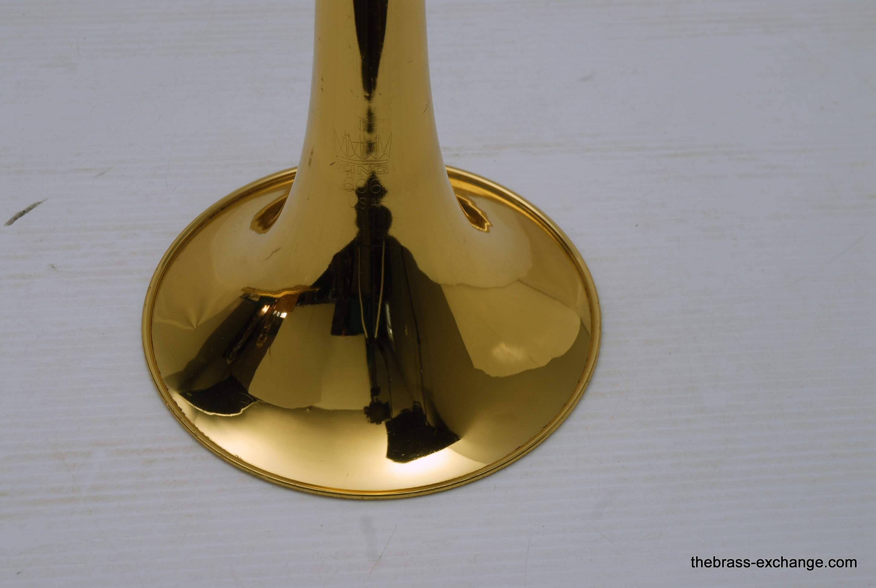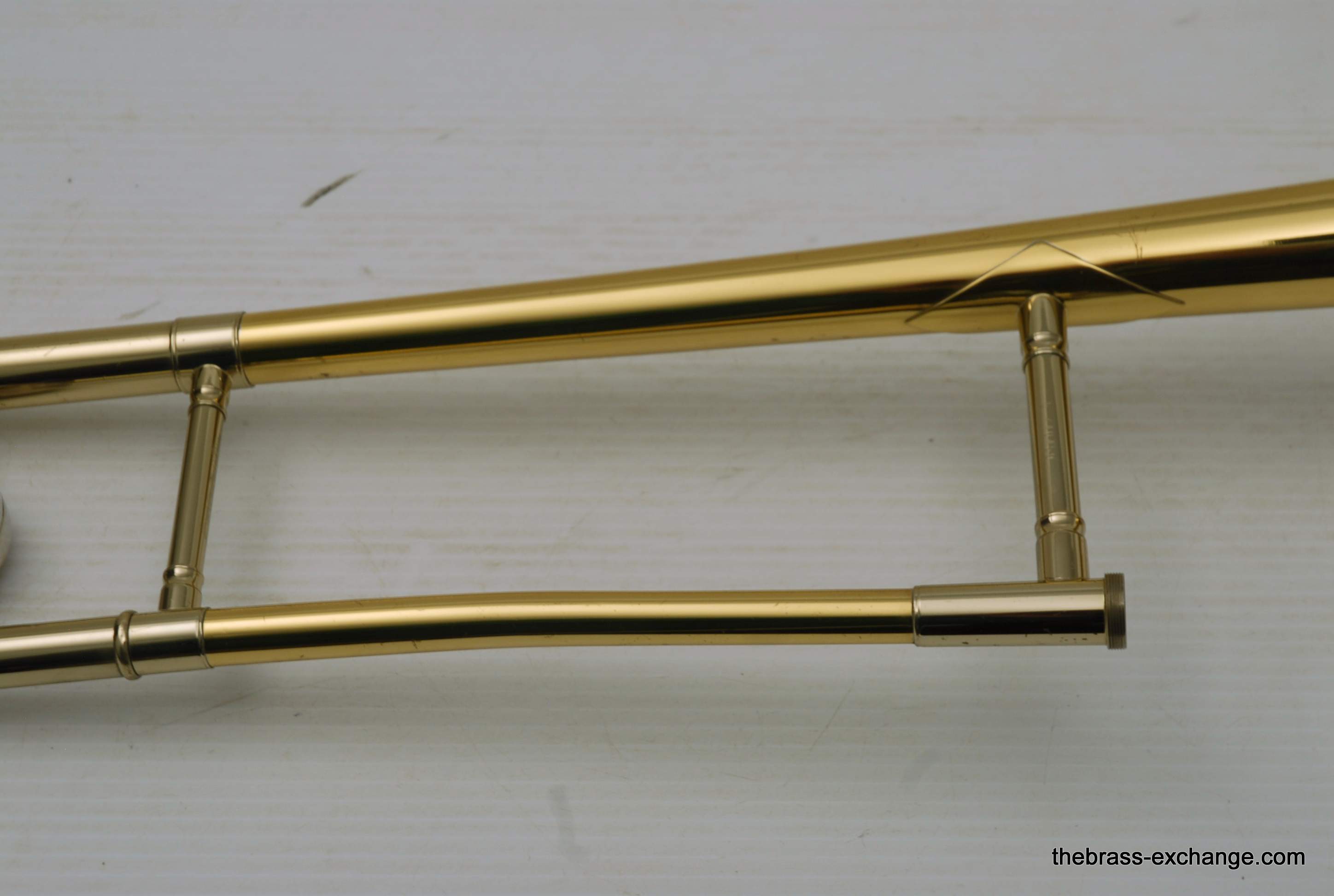 King 606 Trombone.  Single owner pre-owned.  Has had full shop service with chemical bath.  No dents or dings, no previous damage or repair.  Has great slide and plays 100%.  Lacquer wear is minimal, has very bright appearance. This model is one of the most popular student trombones of the last 40 years.  Specifications are 8" yellow brass bell, .500 bore lighweight brass slide.  Small shank mouthpiece.  Any young player that has to carry his instrument any distance will appreciate the light weight ergonomic design of this outfit.  Includes mothpiece and Yamaha Trombone Slide Lubricant.  In-stock for immediate delivery.  Is ready to play out of the box.