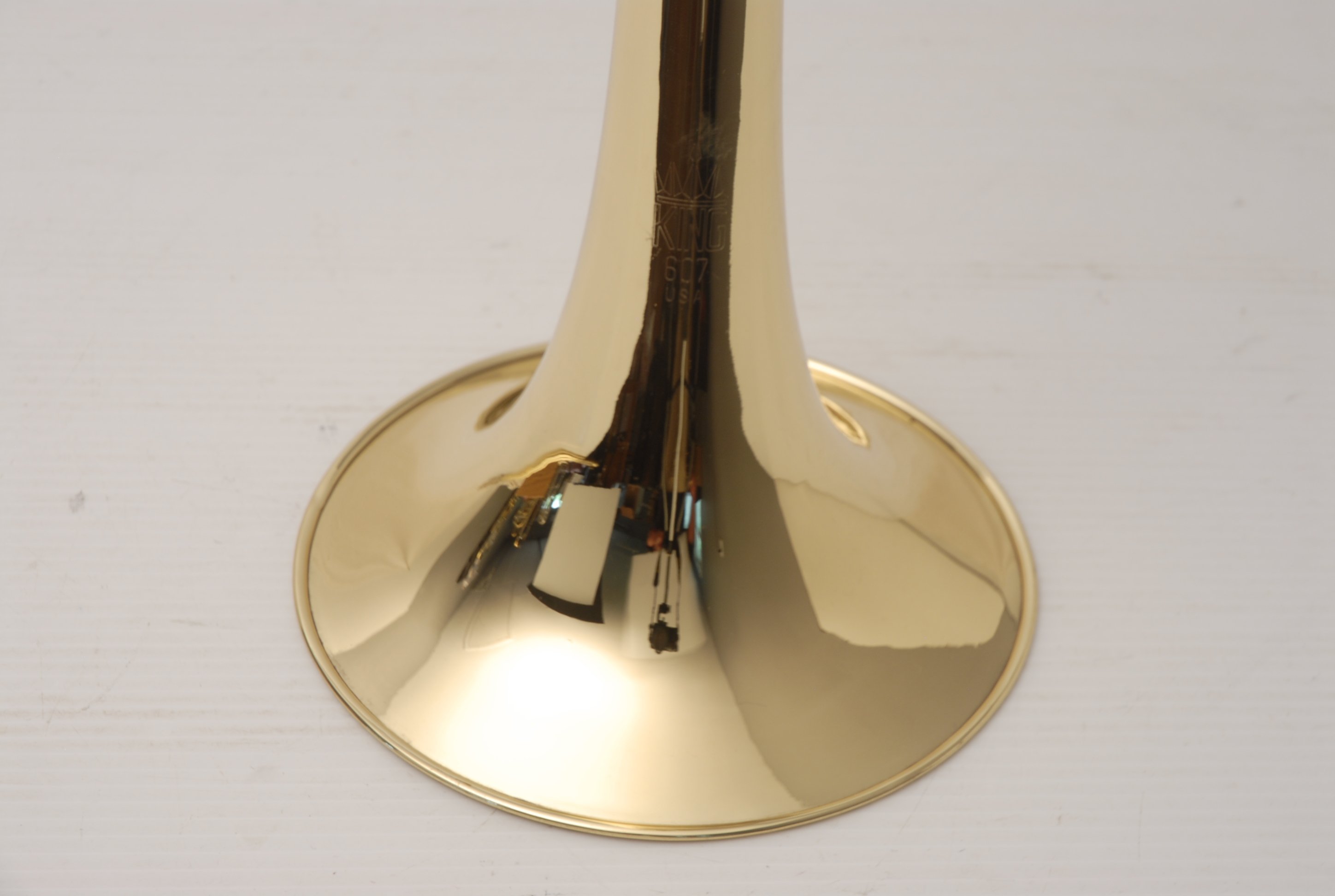 The King 607 Medium Bore Tenor Trombone with F-Attachment represents one of Kingβs well-designed intermediate trigger models. Built with a .525 medium bore slide and an 8" yellow brass bell, instruments like the 607 were intended to bridge the gap between student horns and full professional models.