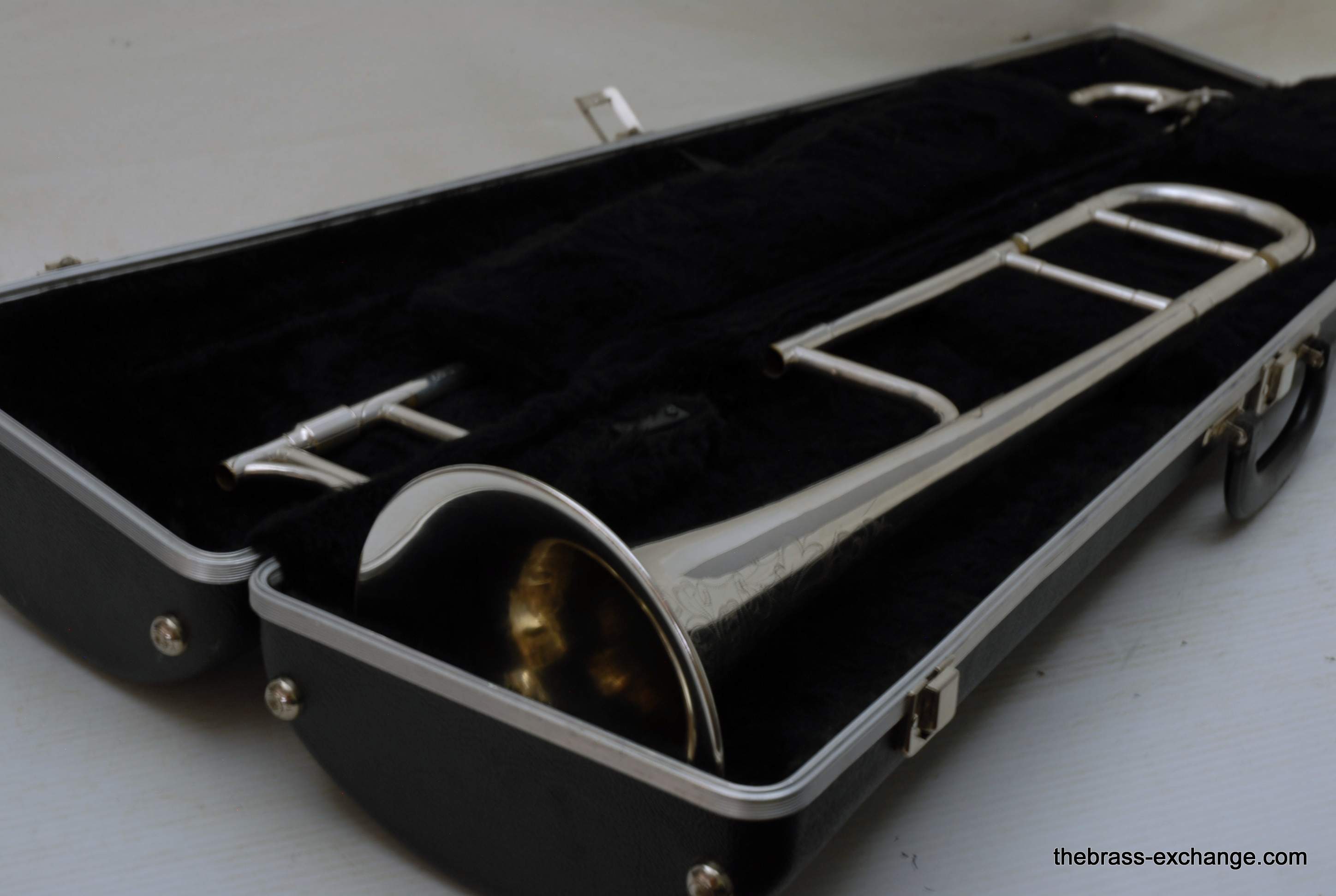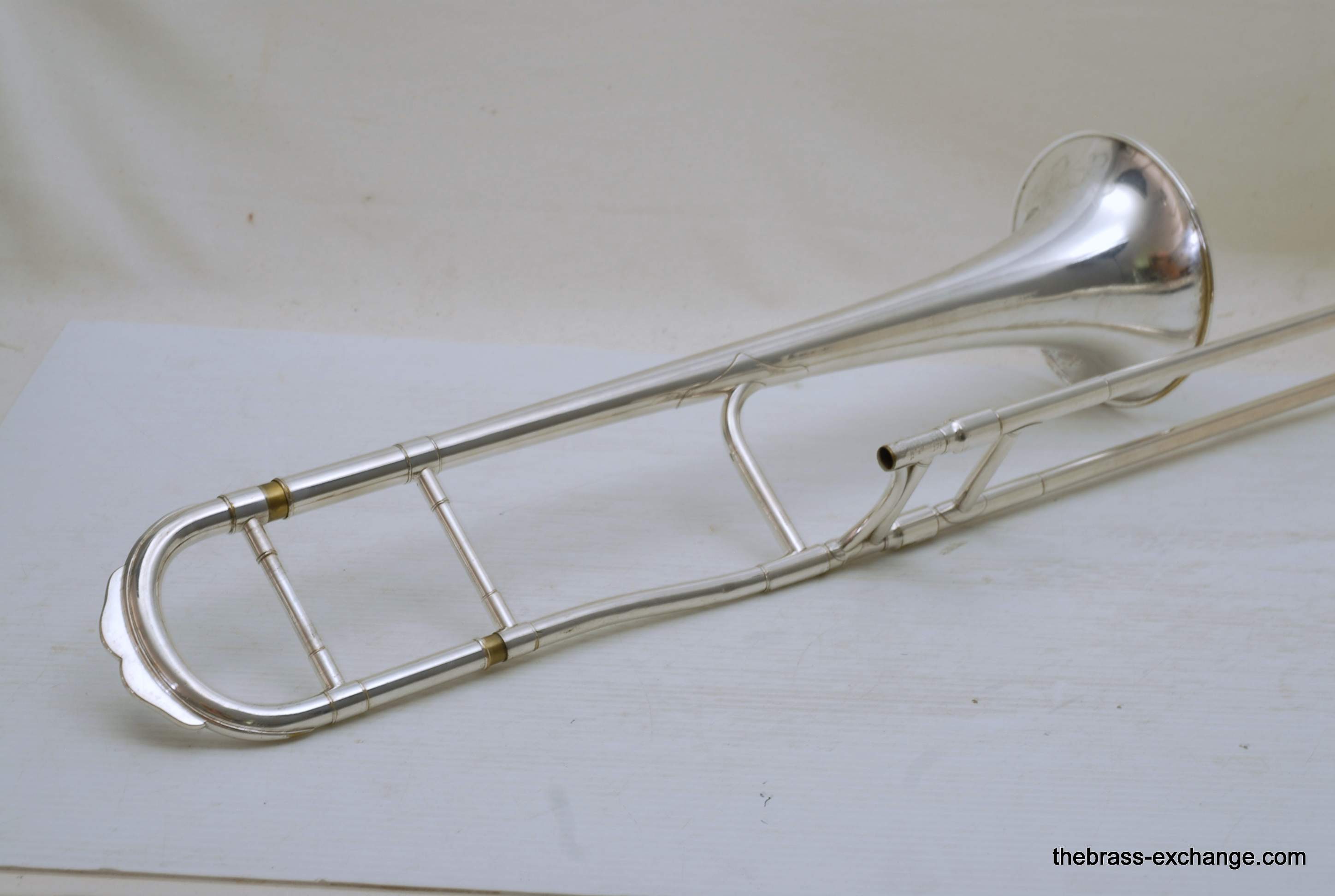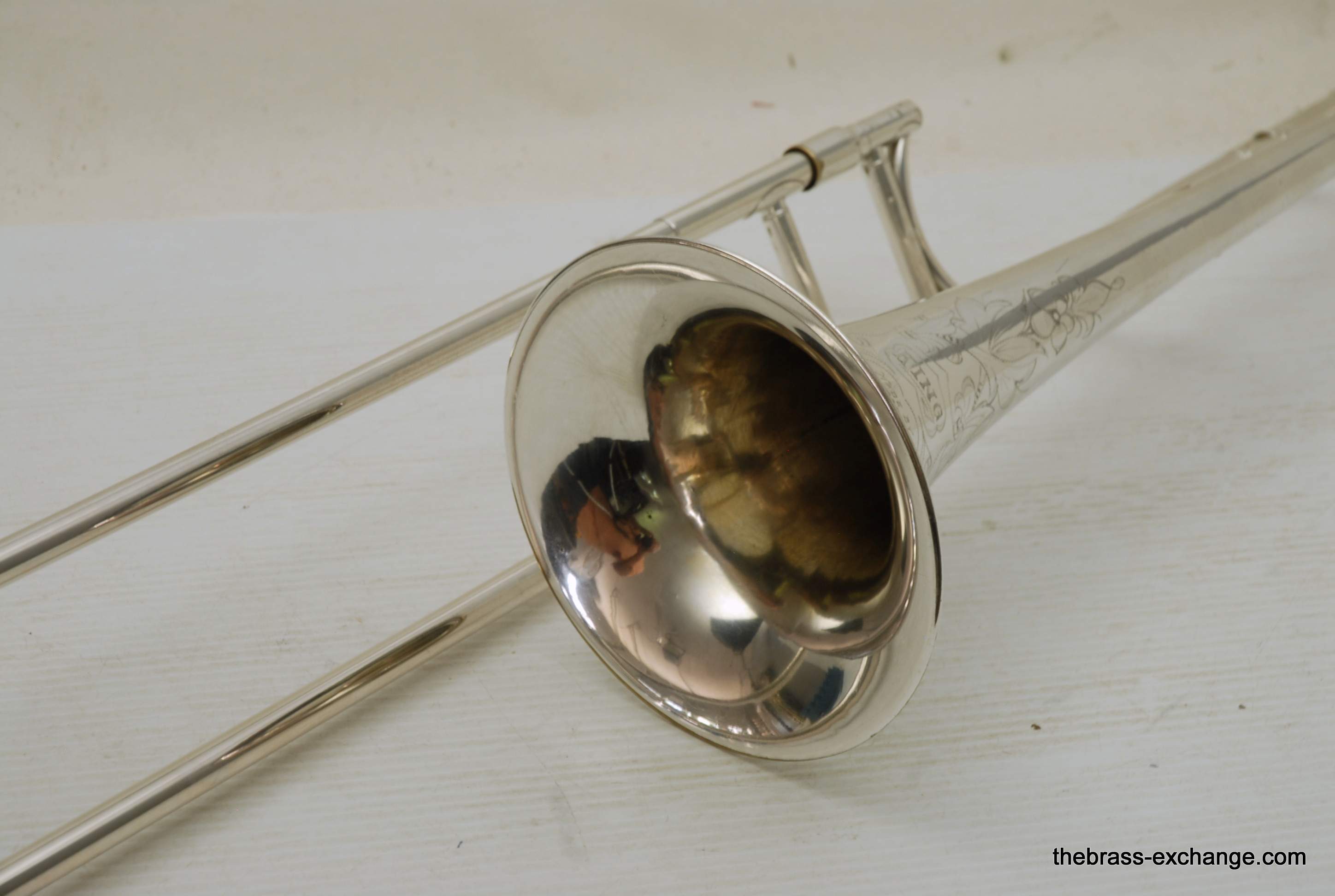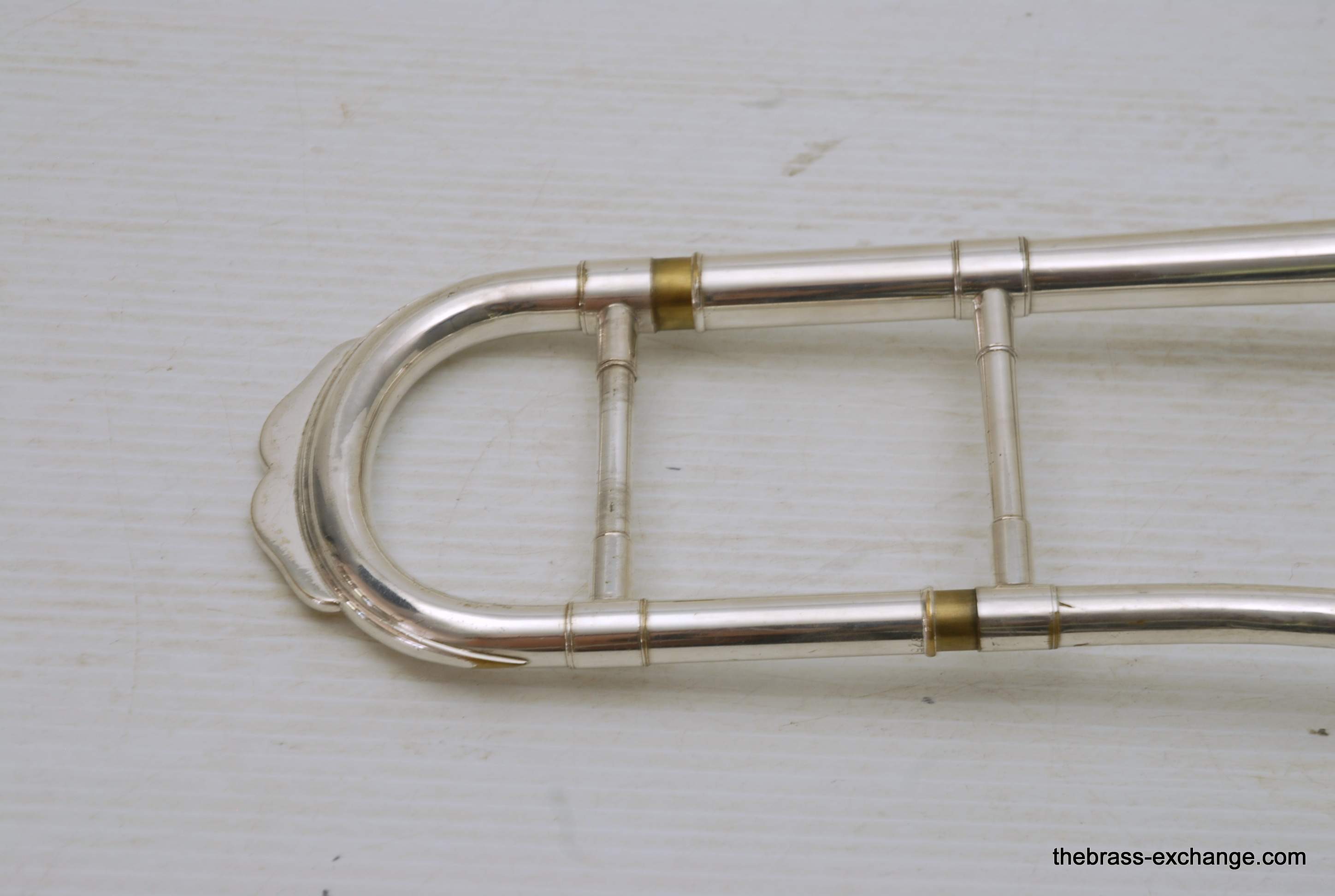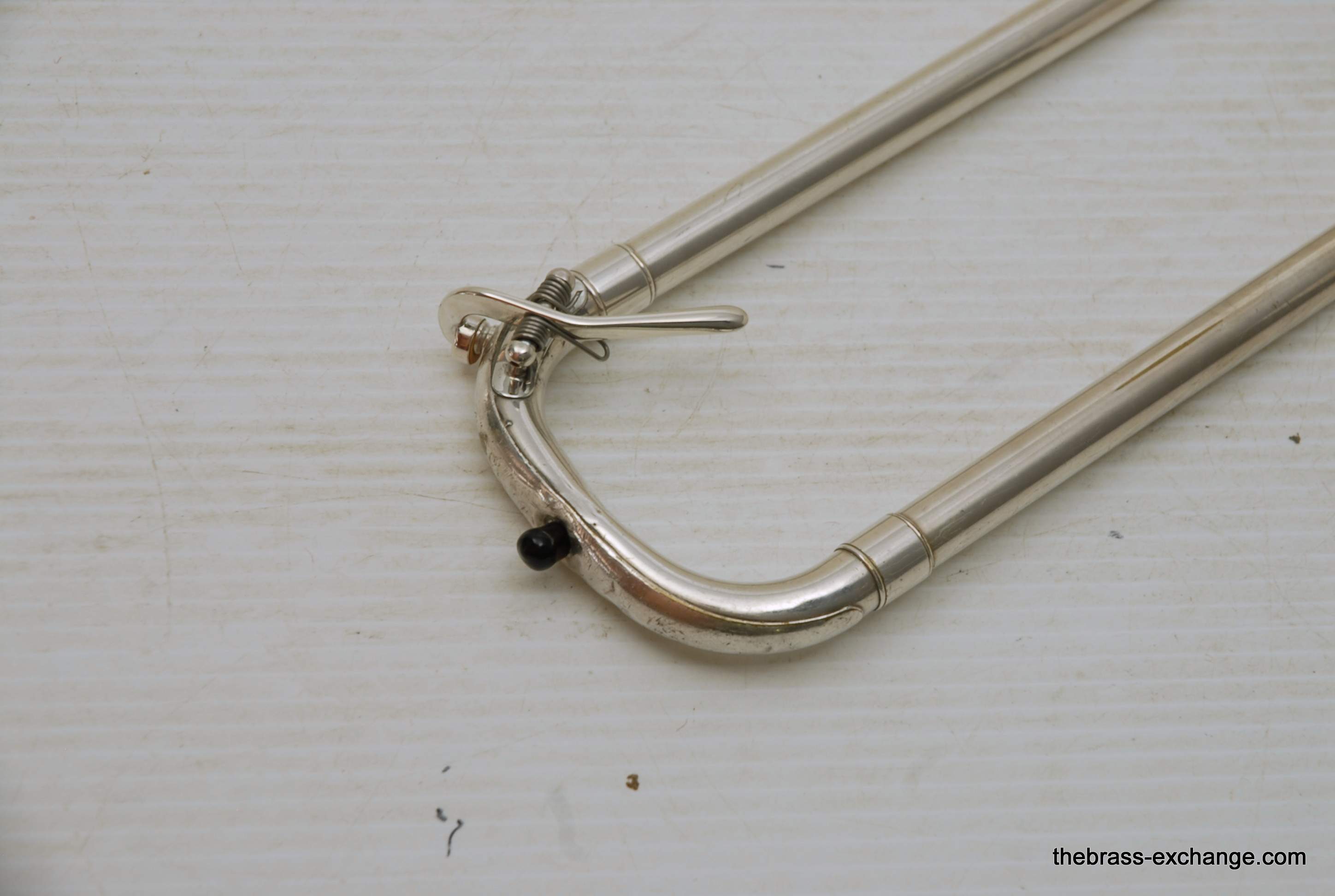 King 1106 Utility Trombone, Vintage Mid 1920’s, SN 87503. Silver Plated Model with 7” Bell diameter and .461 Bore Size handslide. Takes standard small shank mouthpiece. Nearly 100 years old, this trombone still plays. Has never been taken apart or had major damage or repairs. Overall is in good condition. Handslide action is not up to modern standards. Is more of a historical piece for a King collector looking to add to his line-up. Non original case. In-stock for immediate delivery.