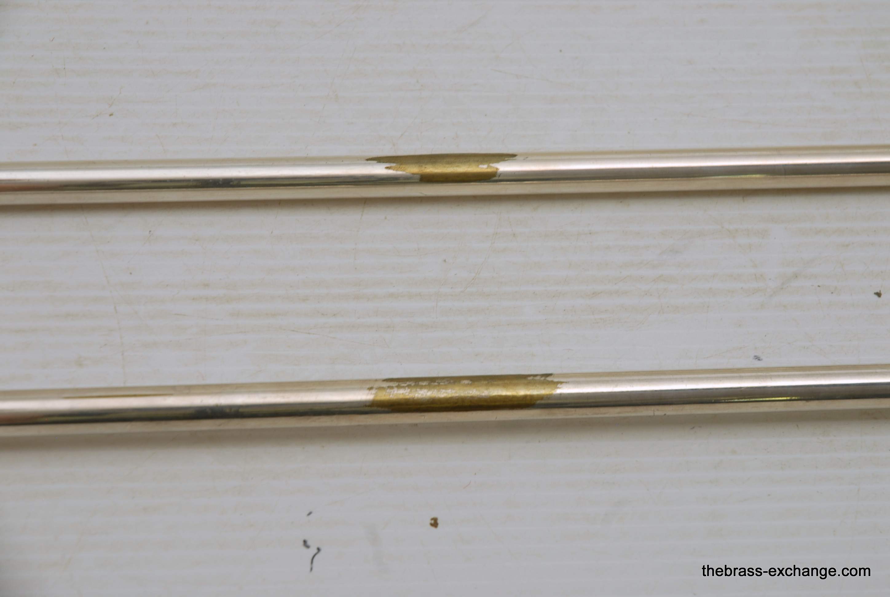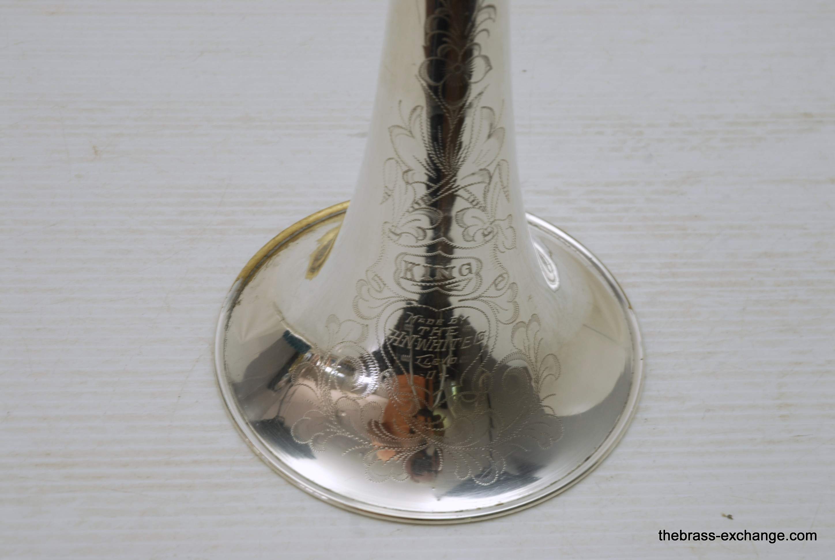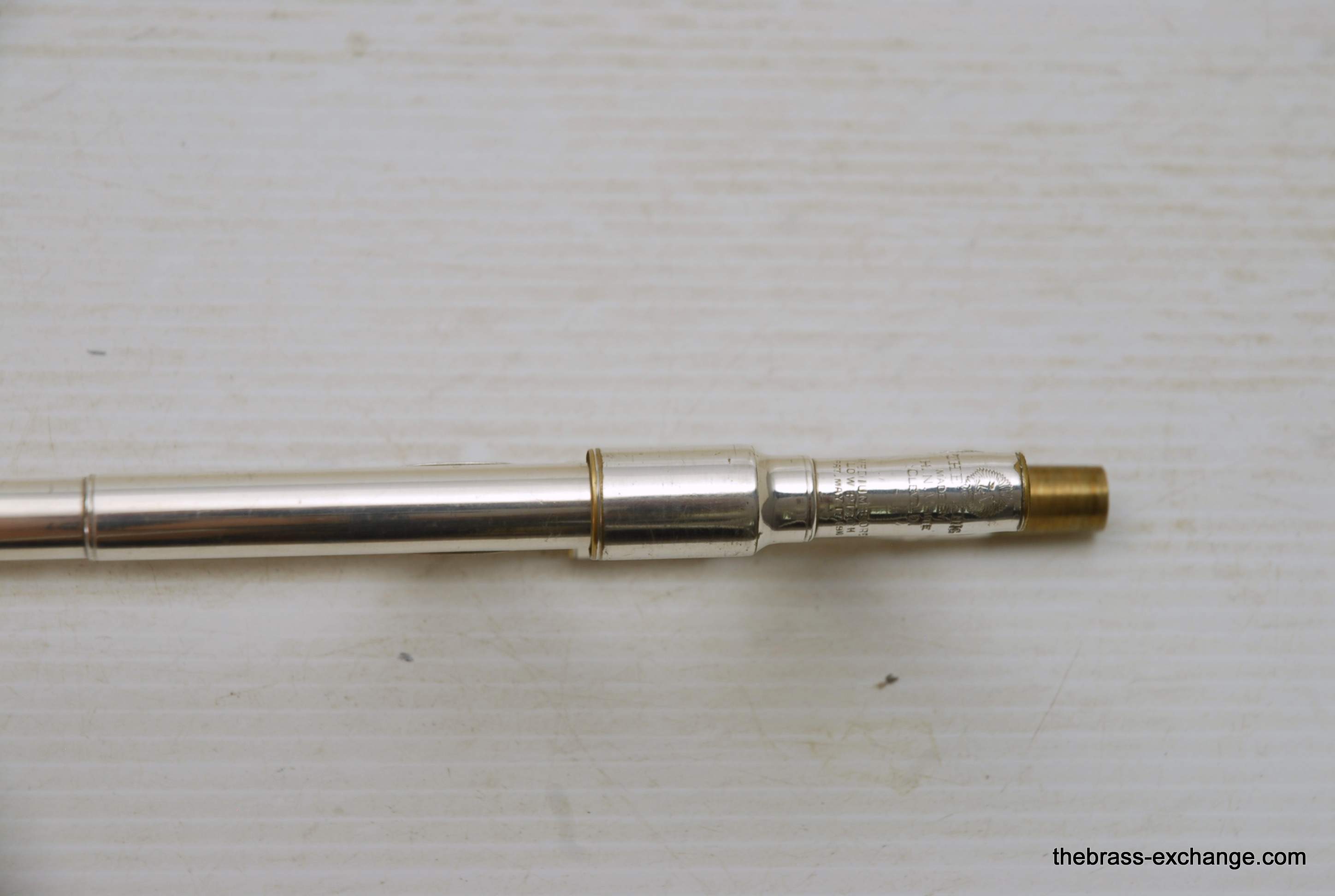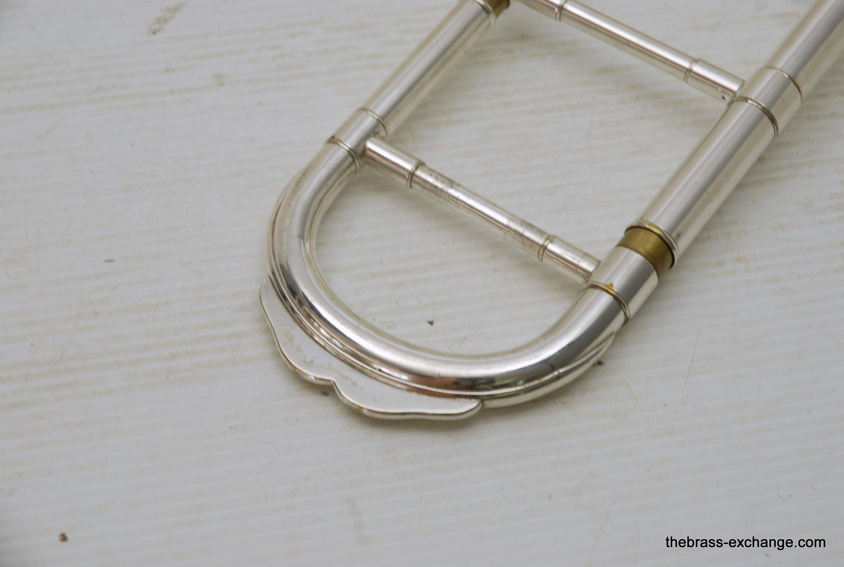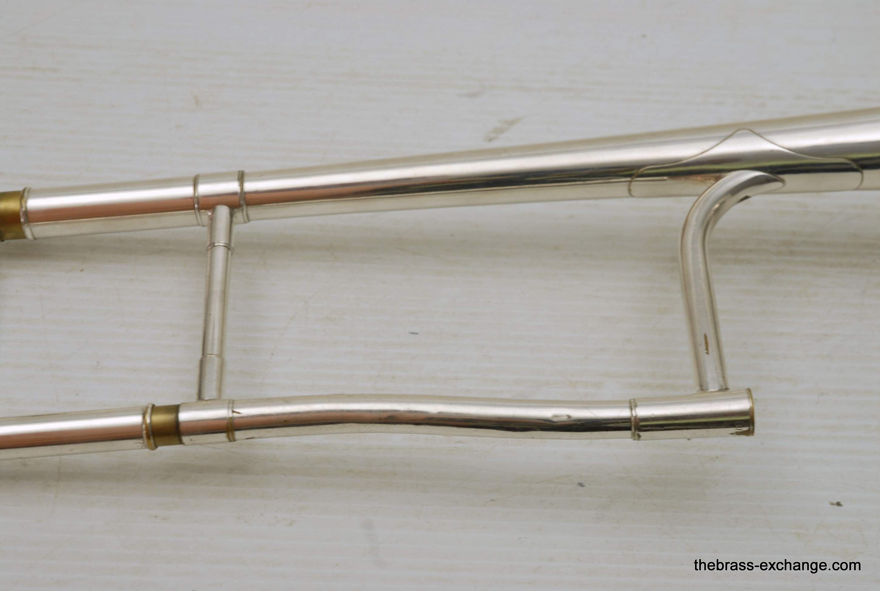 King 1106 Utility Trombone, Vintage Mid 1920’s, SN 87503. Silver Plated Model with 7” Bell diameter and .461 Bore Size handslide. Takes standard small shank mouthpiece. Nearly 100 years old, this trombone still plays. Has never been taken apart or had major damage or repairs. Overall is in good condition. Handslide action is not up to modern standards. Is more of a historical piece for a King collector looking to add to his line-up. Non original case. In-stock for immediate delivery.