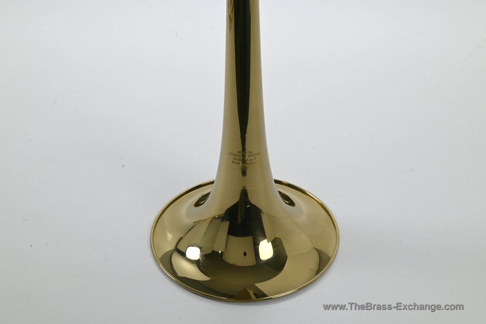 This 134F model is the .528 bore (Bach 36B class) version featuring a yellow brass 8.2" bell, standard-weight handslide, and traditional F-attachment wrap with the renowned K&H rotary valve. It accepts a small-shank mouthpiece, giving it a versatile response—ideal for section or solo playing.