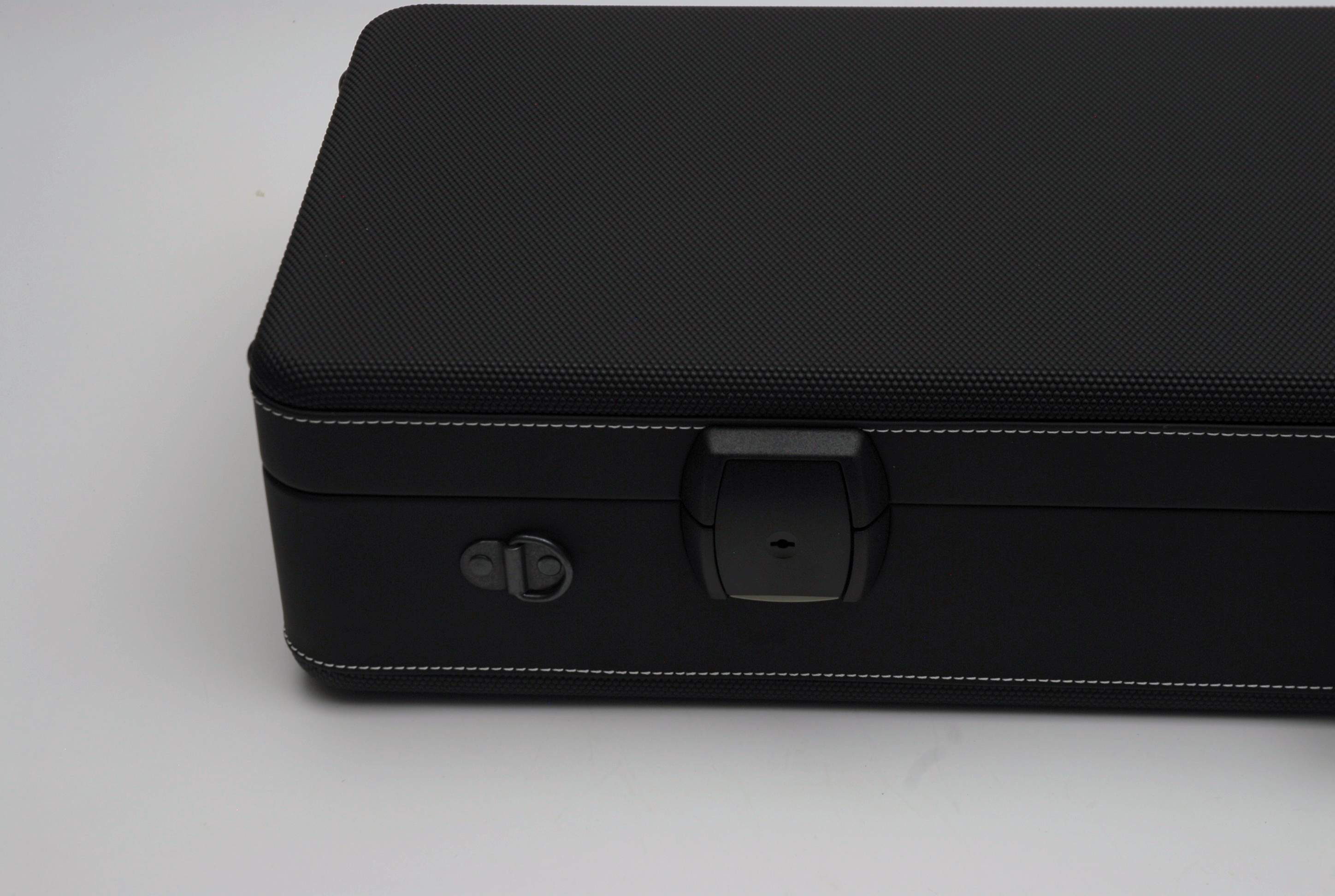 No. The case uses two keyed mechanical latches for a clean, durable closure.