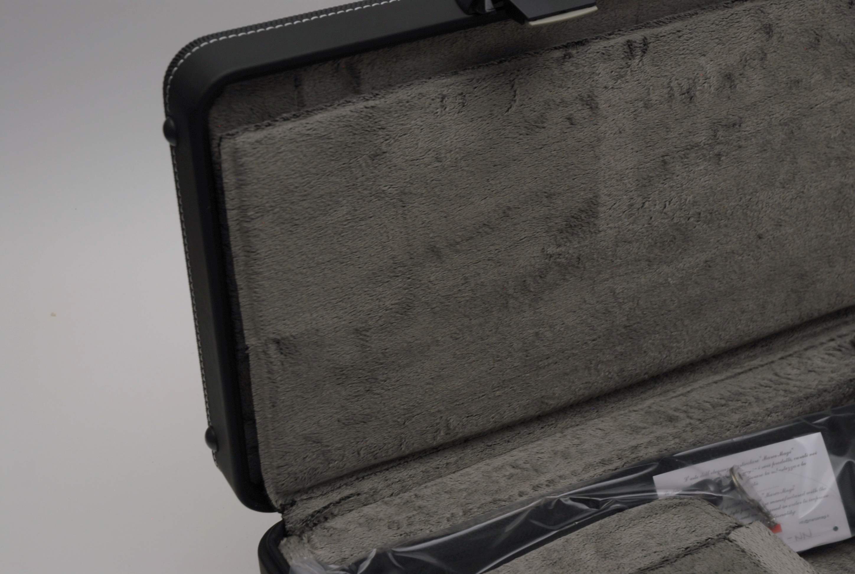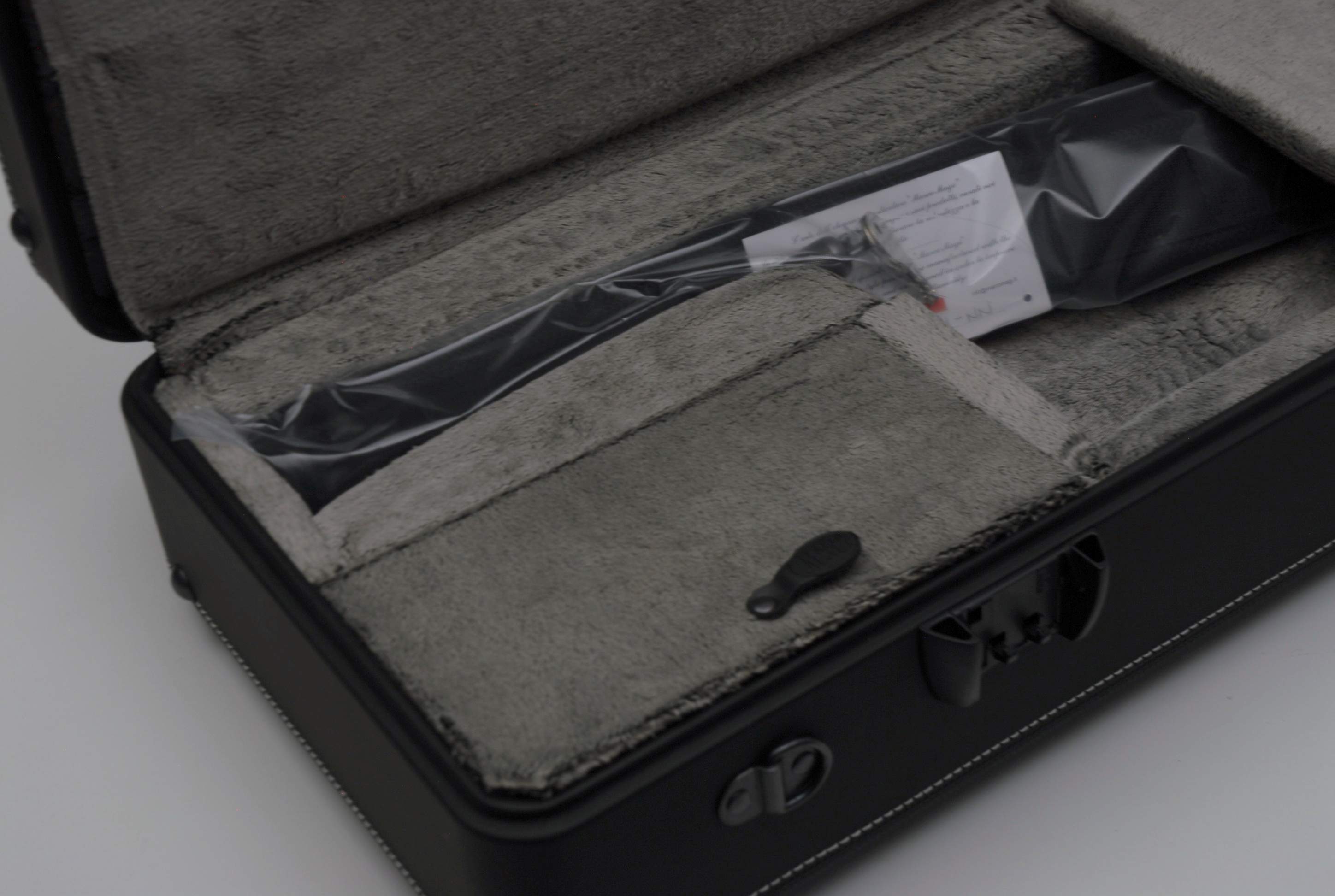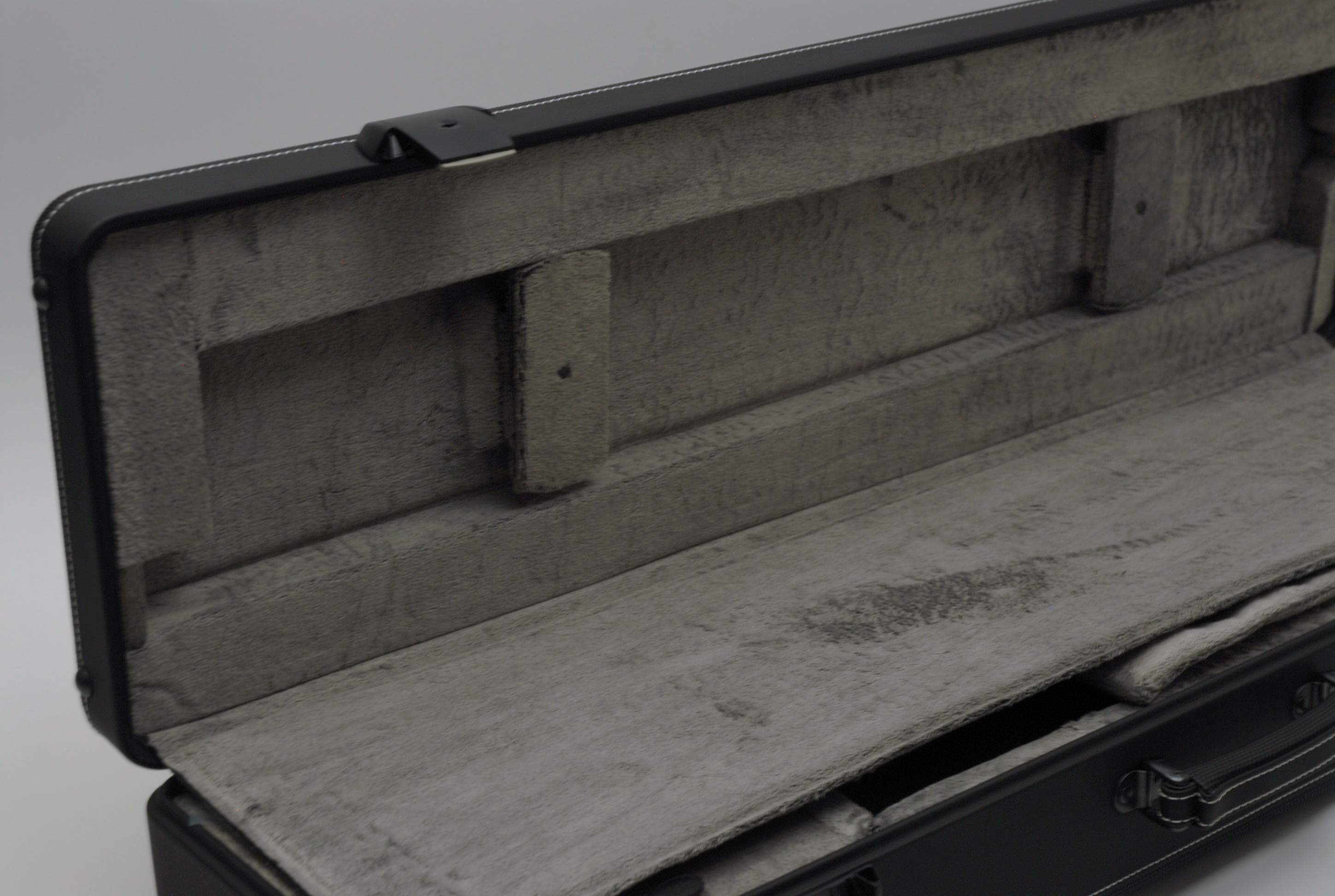Inside is the signature Marco Magi gray/olive long-loop velvet, a dust-resistant fabric that cushions the bell and valve section evenly without trapping lint or requiring extra blocks.