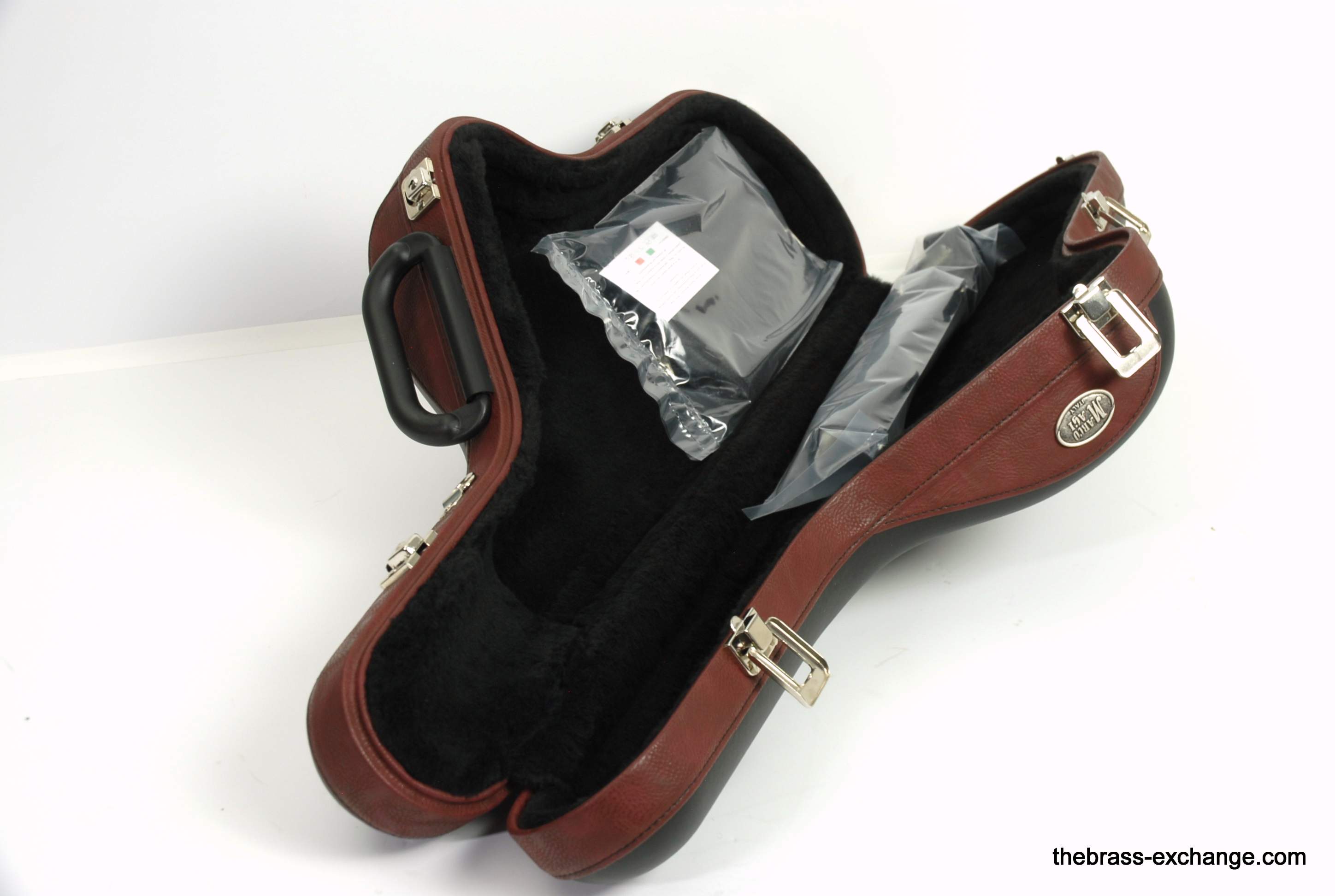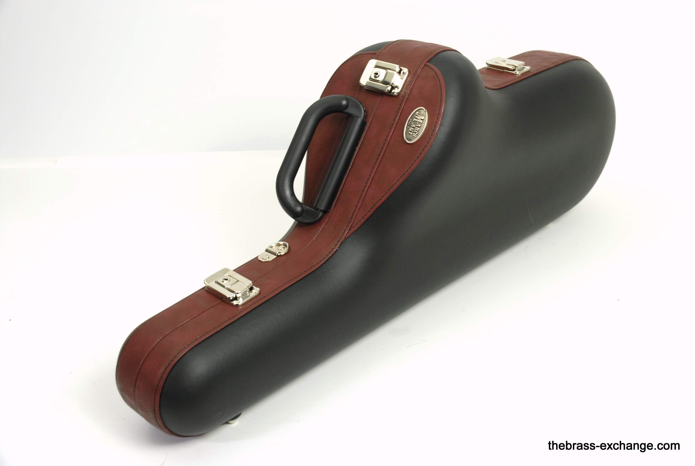 Marco Magi Tenor Saxophone Case, Professional Model, two color black and burgundy, leather exterior. Interior soft black long loop plush velvet. Comfortable black handle with nickel silver hardware, 4 latches with lock/key. Includes premium backpack style straps with steel hardware and additional removable soft accessory pouch. Case body is poured, shaped polyurethane. Is for standard size tenor like Selmer Mark VI or similar Yamaha, Eastman, ect. Weight is approximately 7lbs.