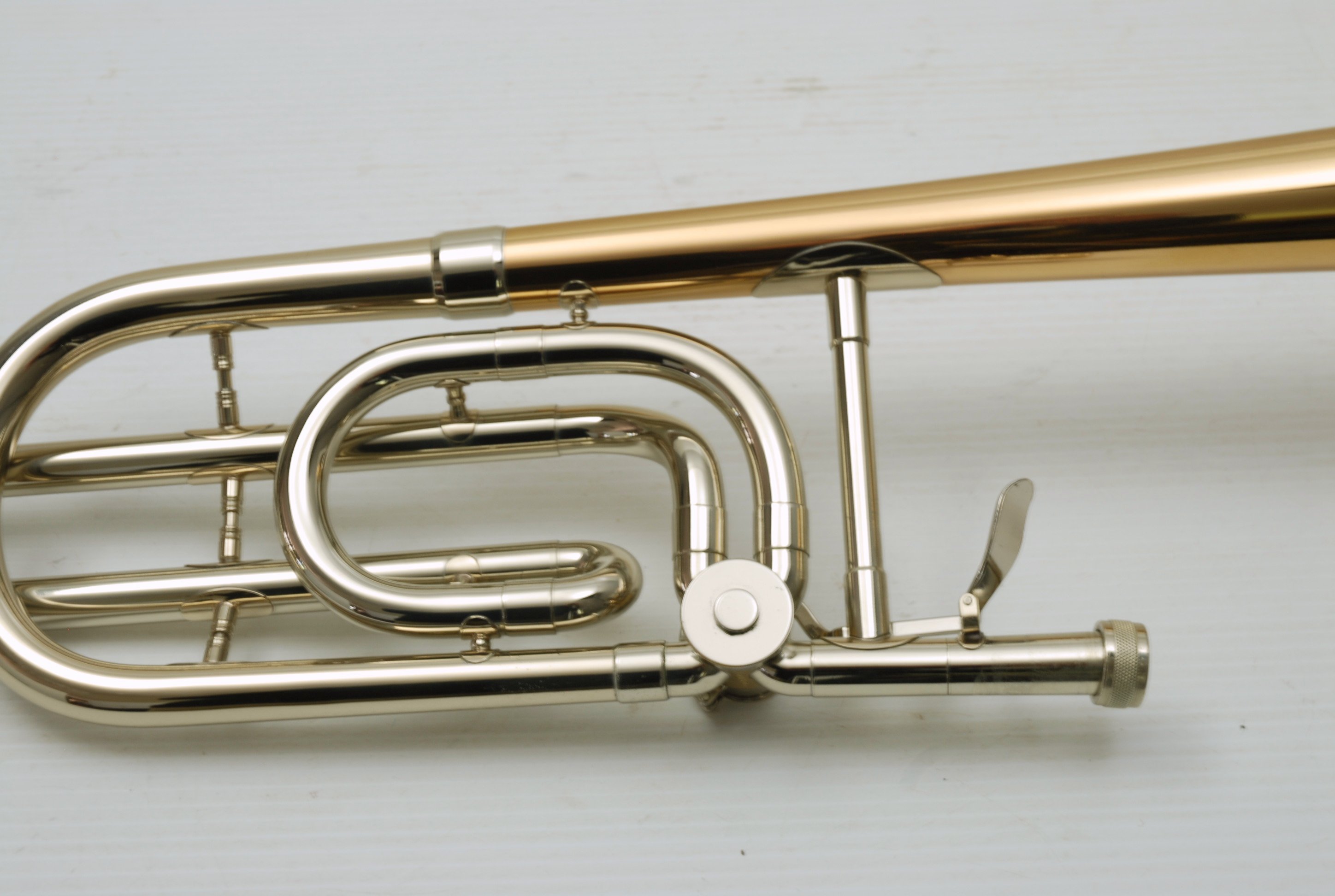 This horn features a large 9.5" yellow brass bell and a traditional closed-wrap F-attachment, tuned with a slide on the valve section. The response is broad and warm, with a clear low register and singing overtones up high. It plays incredibly evenly across the entire range and would be a serious performer for any orchestral, studio, or jazz bass trombonist looking for vintage character.