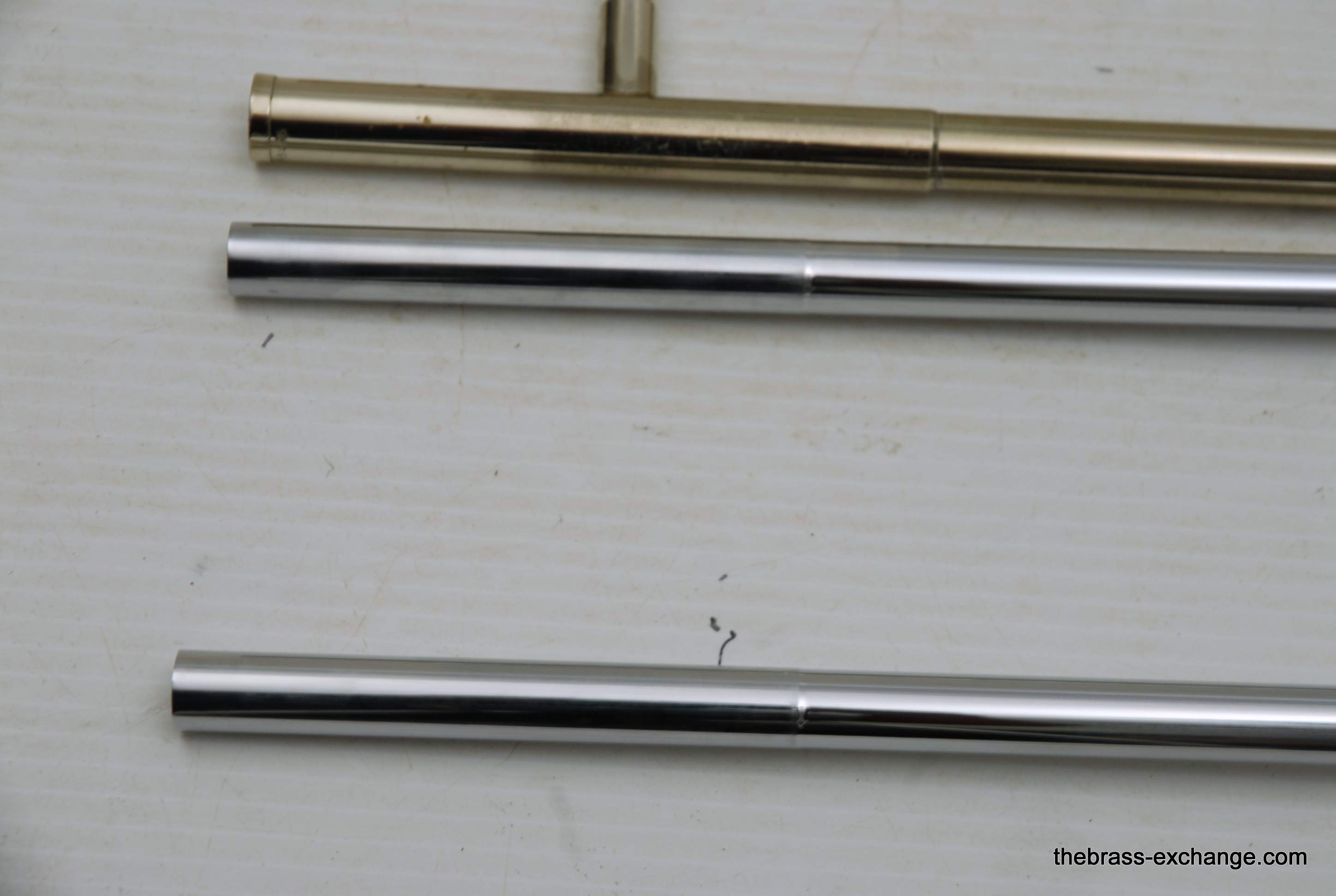 Olds Opera Large Bore Tenor Trombone, made in the late 1950s during the Fullerton era. Serial number 263498. This is a straight tenor configuration—no valve—with a large bore that actually exceeds the modern .547" standard, measuring closer to .550–.551". It features a stunning 8.5" bell with ornate engraving, constructed from nickel silver. The tuning slide and handslide are also nickel silver, giving this horn both strength and a brilliant tonal core.