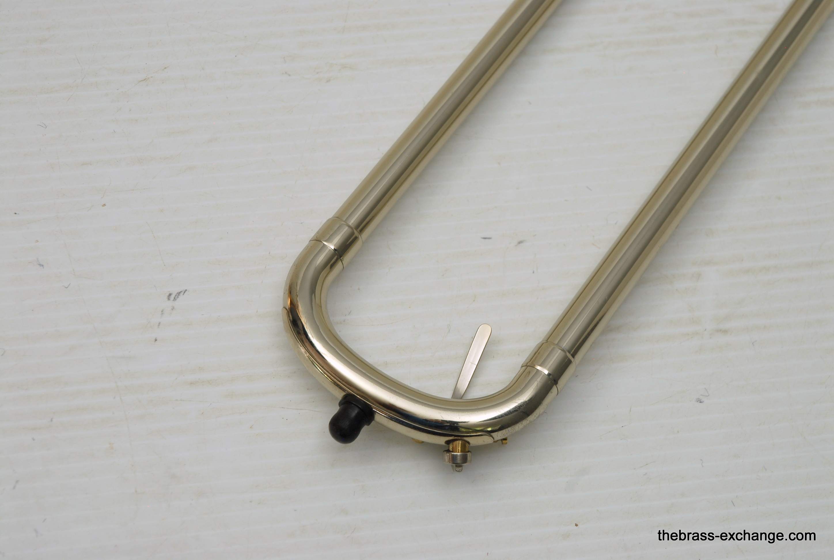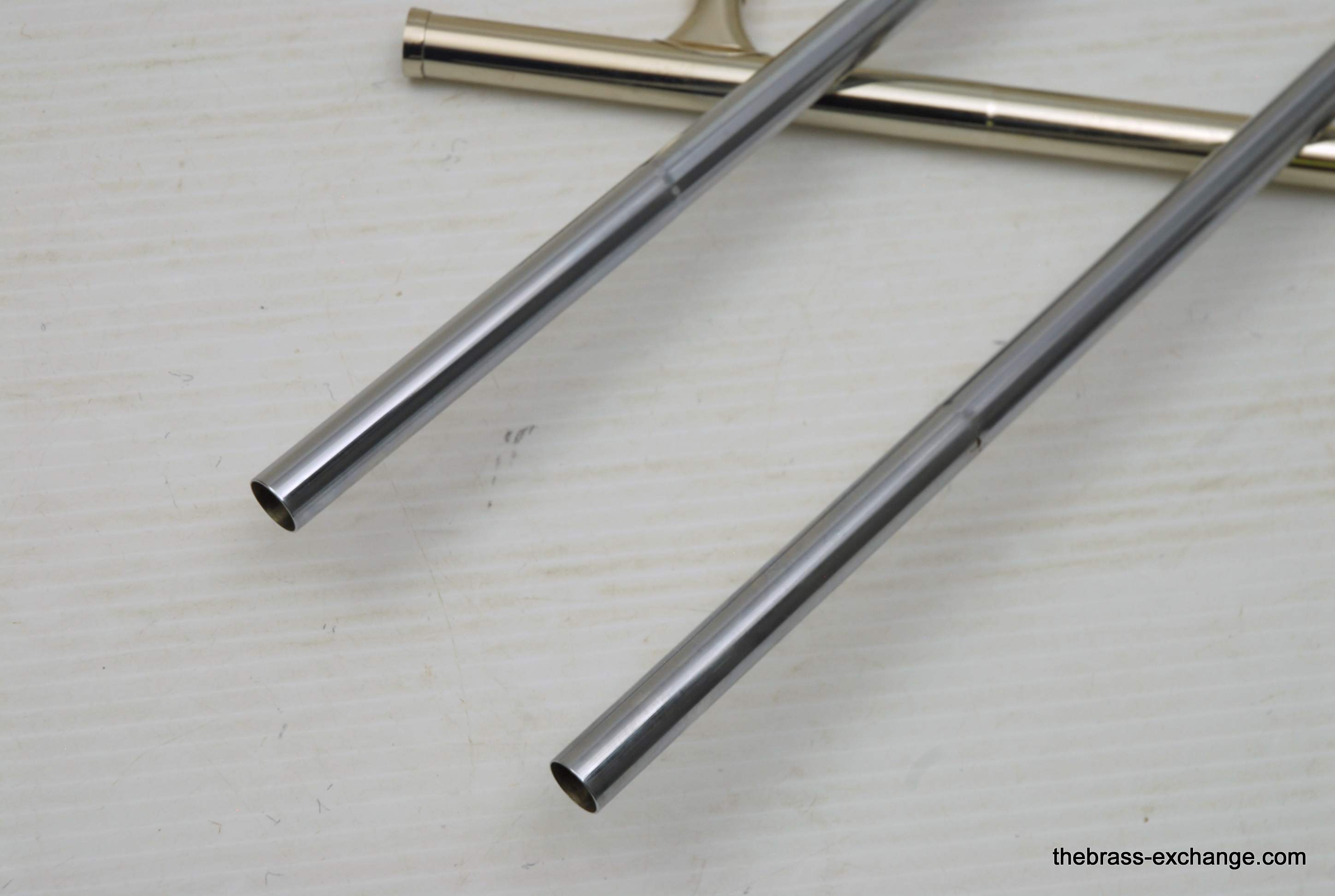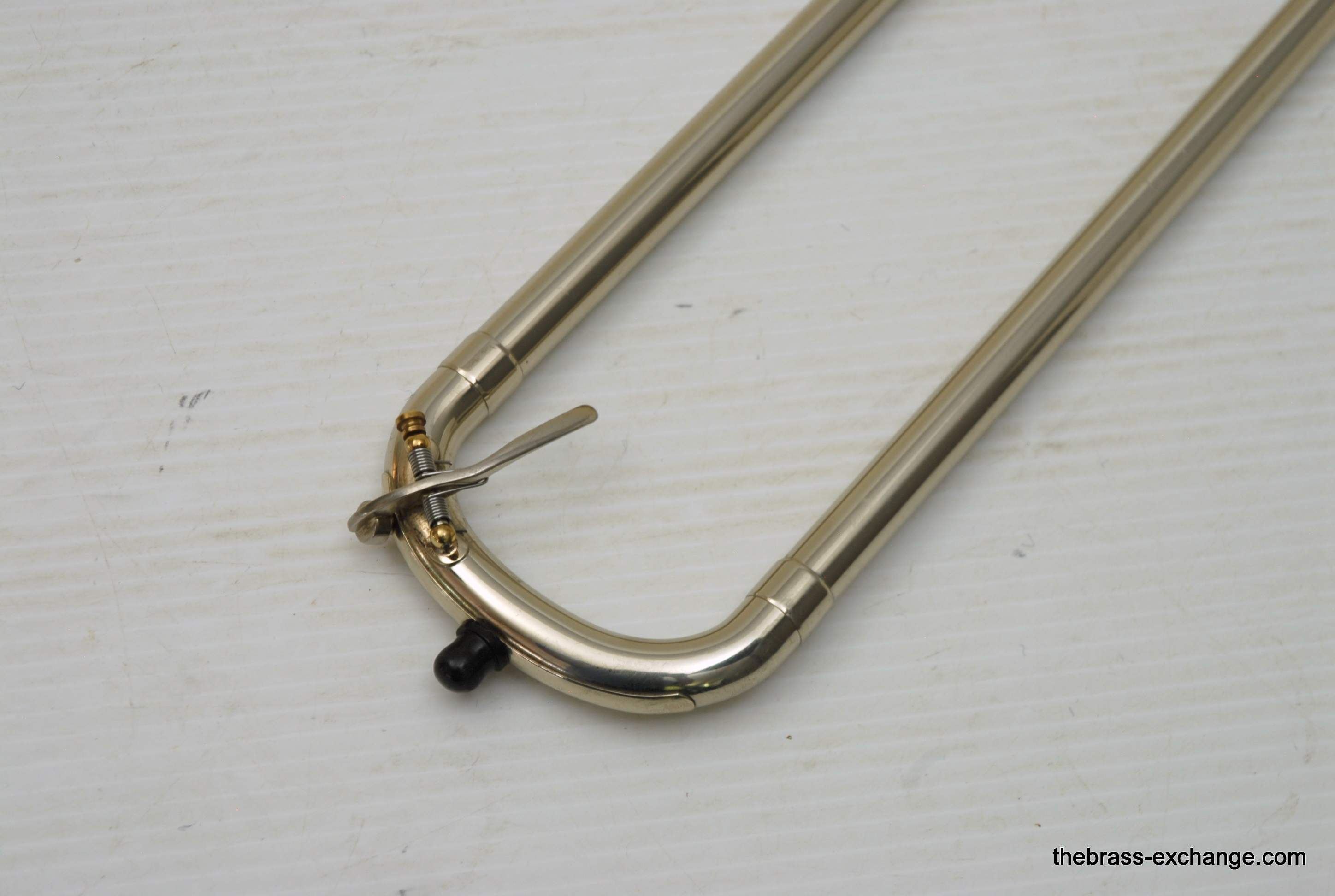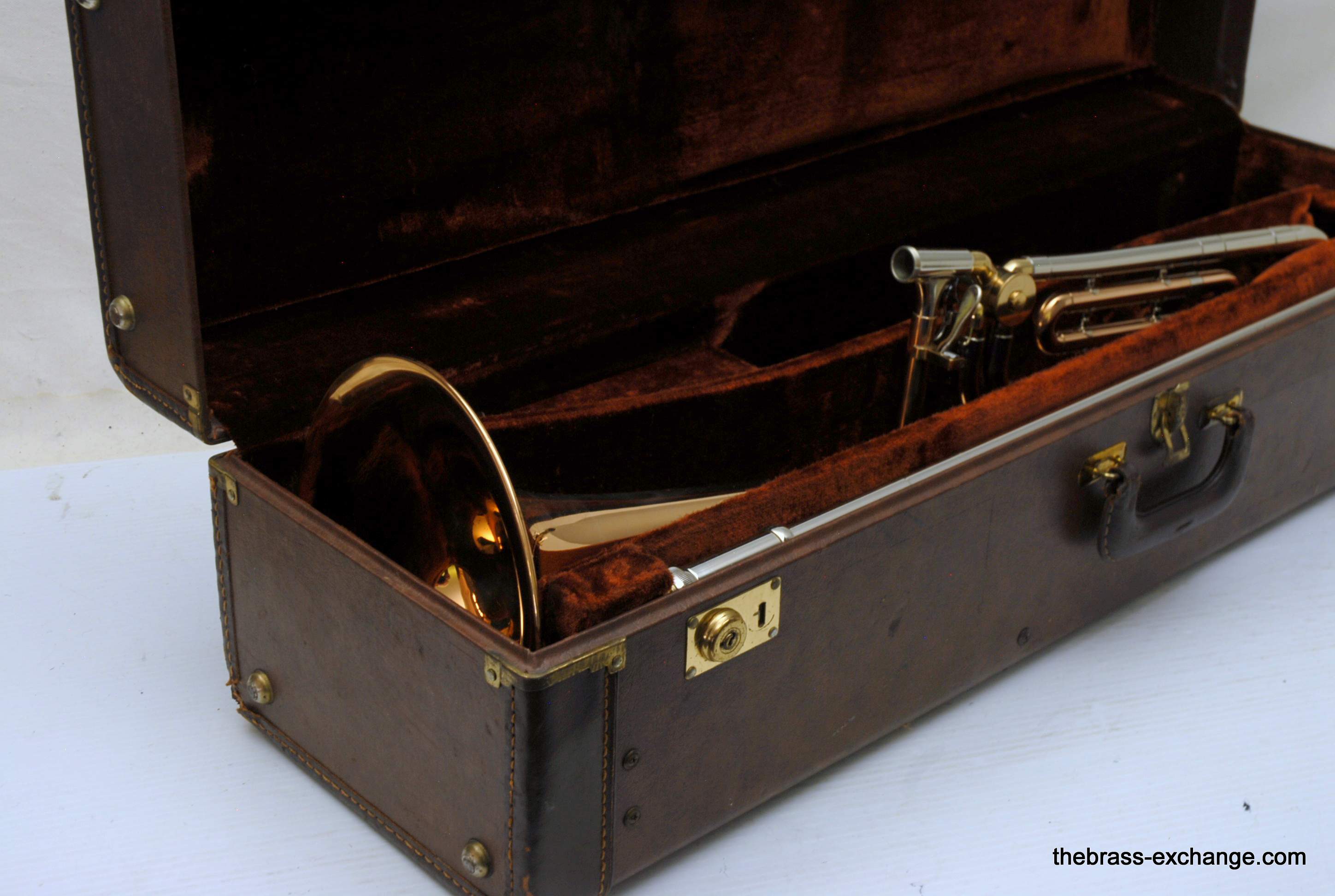 Olds Recording with F attachment. This is a very nice 1960's model, all original parts and lacquer. Has 8.5" gold brass bell, lightweight dual bore nickel silver handslide for small shank mouthpiece. This horn has never been dented damaged or repaired. Has had full shop service is super clean. No issues with playability. Fluted hand slide is near perfect, super straight an no tension, drag, or inner tube plating loss. It really is amazing that this horn has survived the years in such amazing condition. Original coffin style case also in perfect condition. Would be an obvious choice for an advancing player looking for professional level vintage. Is ideal for all around band use, including jazz band. Dual Bore size and small shank mouthpiece facilitates upper register. Gold/Rose Brass Bell Creates immediate warmth in sound. This is the type of horn that plays so easily that you get hooked on it right away, fall in love with beautiful sound. There is a reason why F.E. Olds trombones were so popular for over a half a decade. This one is very good. In-stock for immediate delivery.