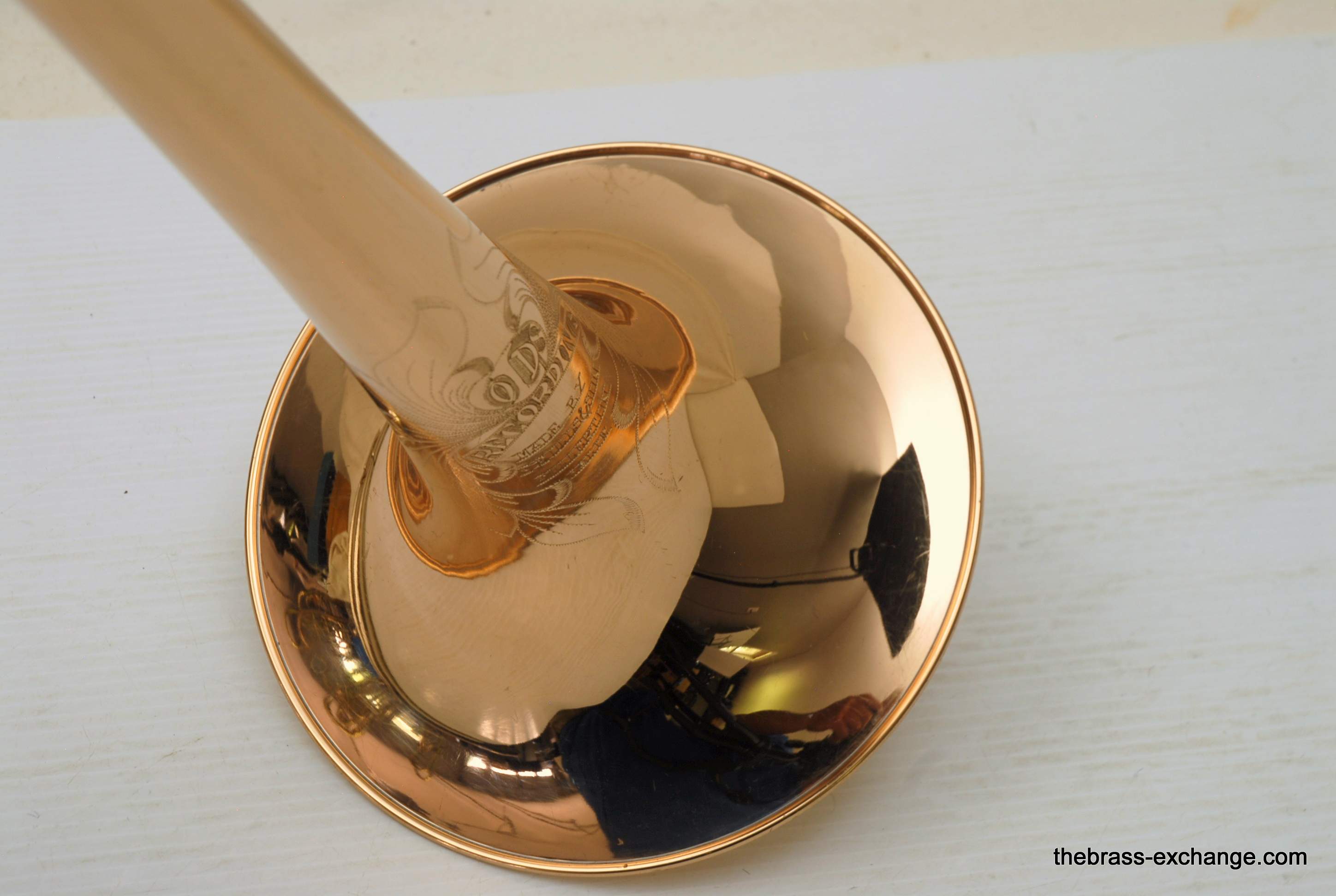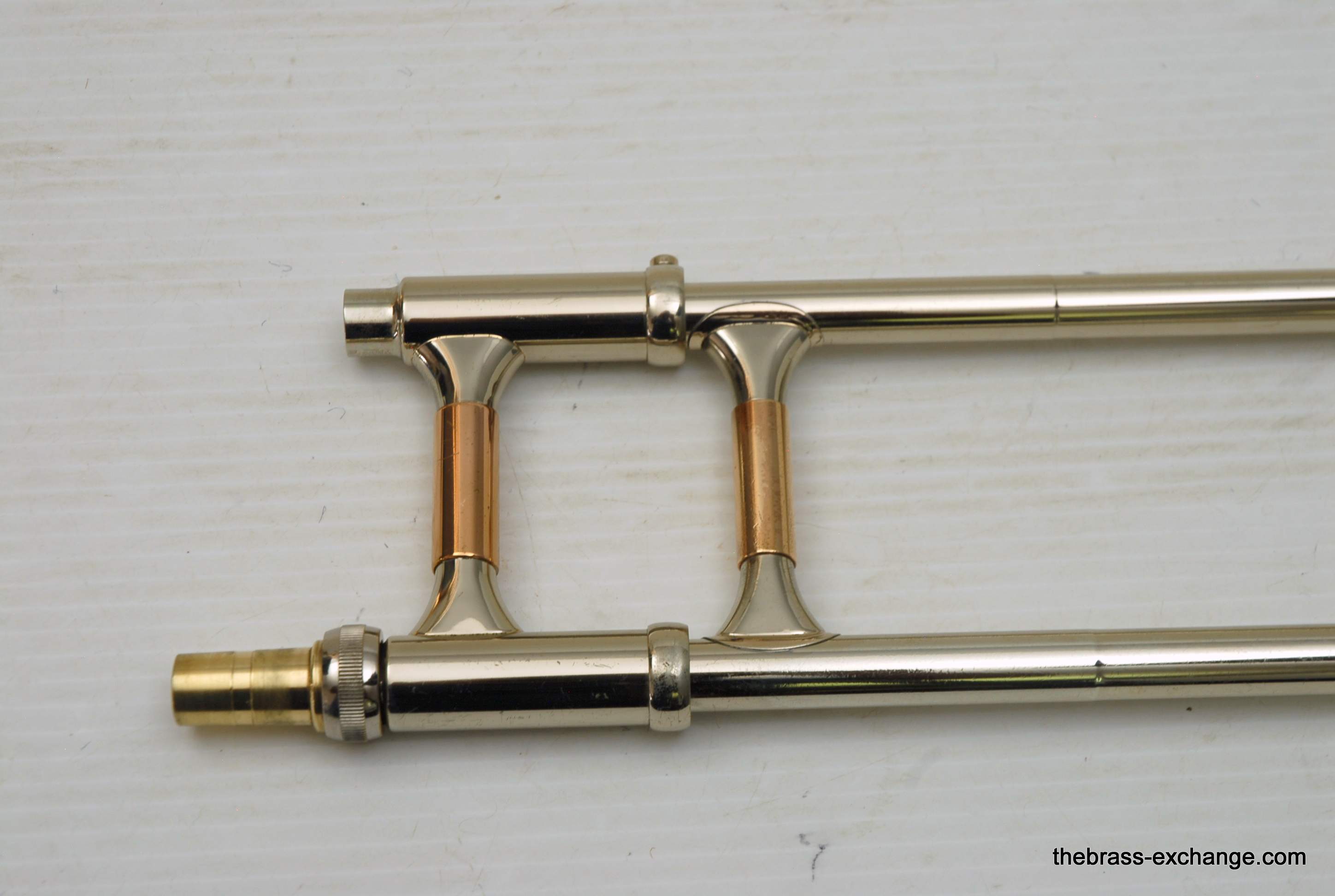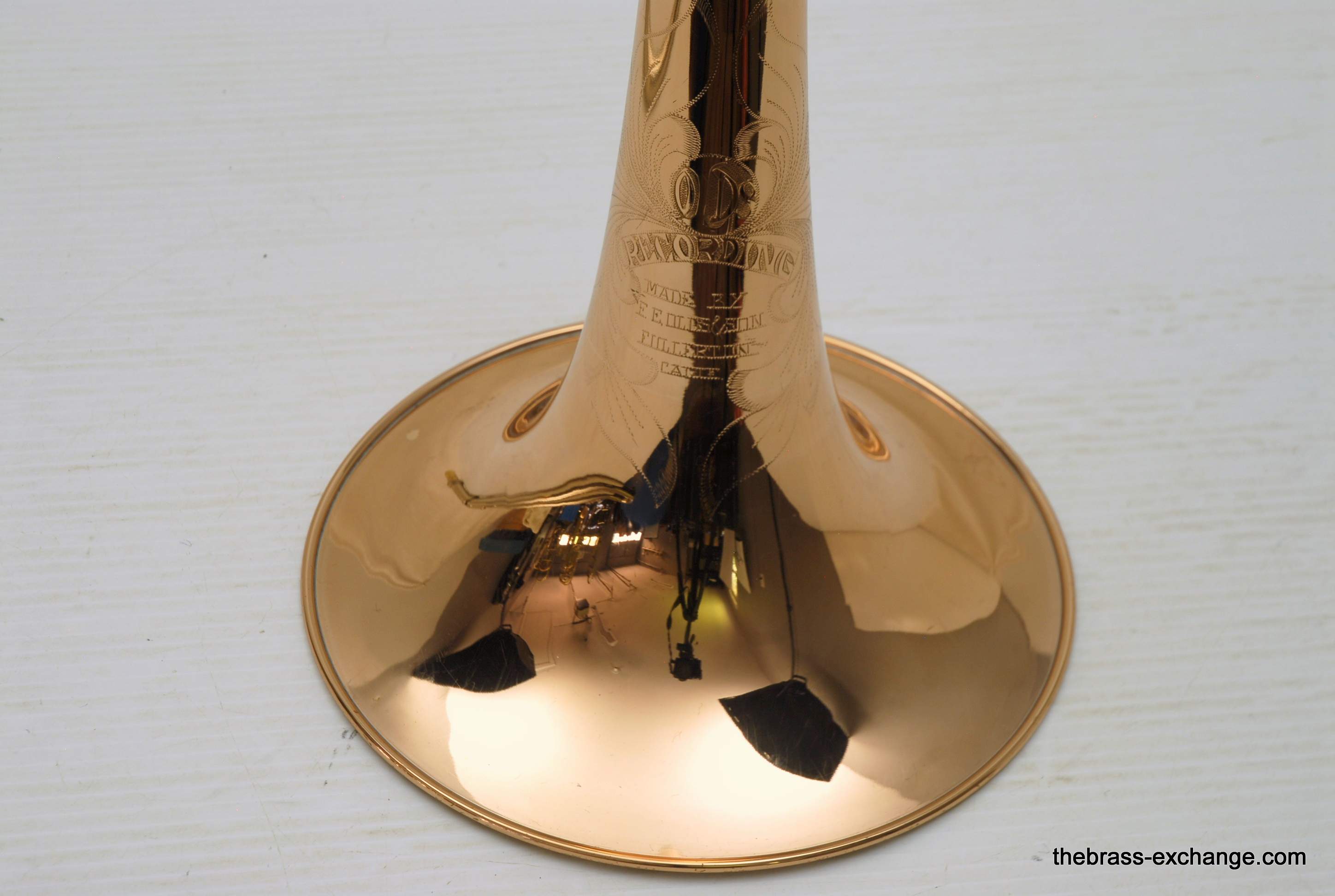 Olds Recording with F attachment. This is a very nice 1960's model, all original parts and lacquer. Has 8.5" gold brass bell, lightweight dual bore nickel silver handslide for small shank mouthpiece. This horn has never been dented damaged or repaired. Has had full shop service is super clean. No issues with playability. Fluted hand slide is near perfect, super straight an no tension, drag, or inner tube plating loss. It really is amazing that this horn has survived the years in such amazing condition. Original coffin style case also in perfect condition. Would be an obvious choice for an advancing player looking for professional level vintage. Is ideal for all around band use, including jazz band. Dual Bore size and small shank mouthpiece facilitates upper register. Gold/Rose Brass Bell Creates immediate warmth in sound. This is the type of horn that plays so easily that you get hooked on it right away, fall in love with beautiful sound. There is a reason why F.E. Olds trombones were so popular for over a half a decade. This one is very good. In-stock for immediate delivery.