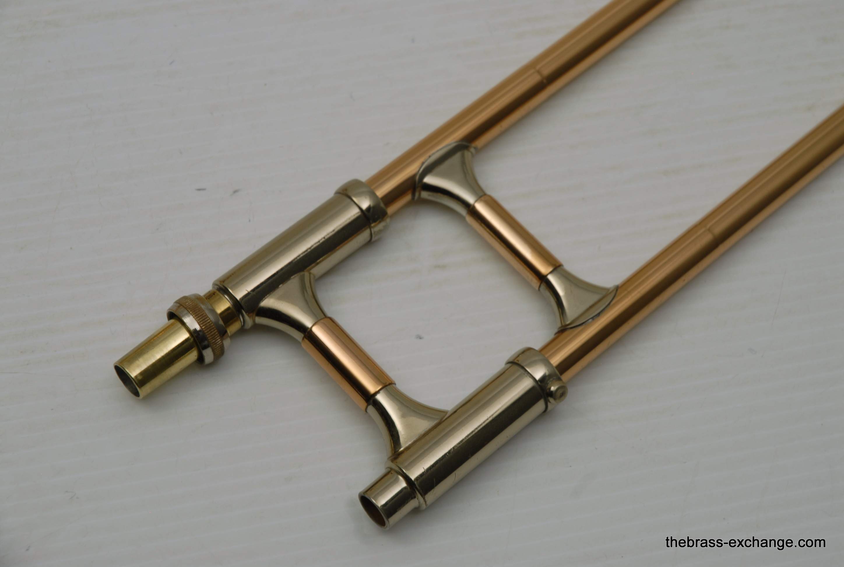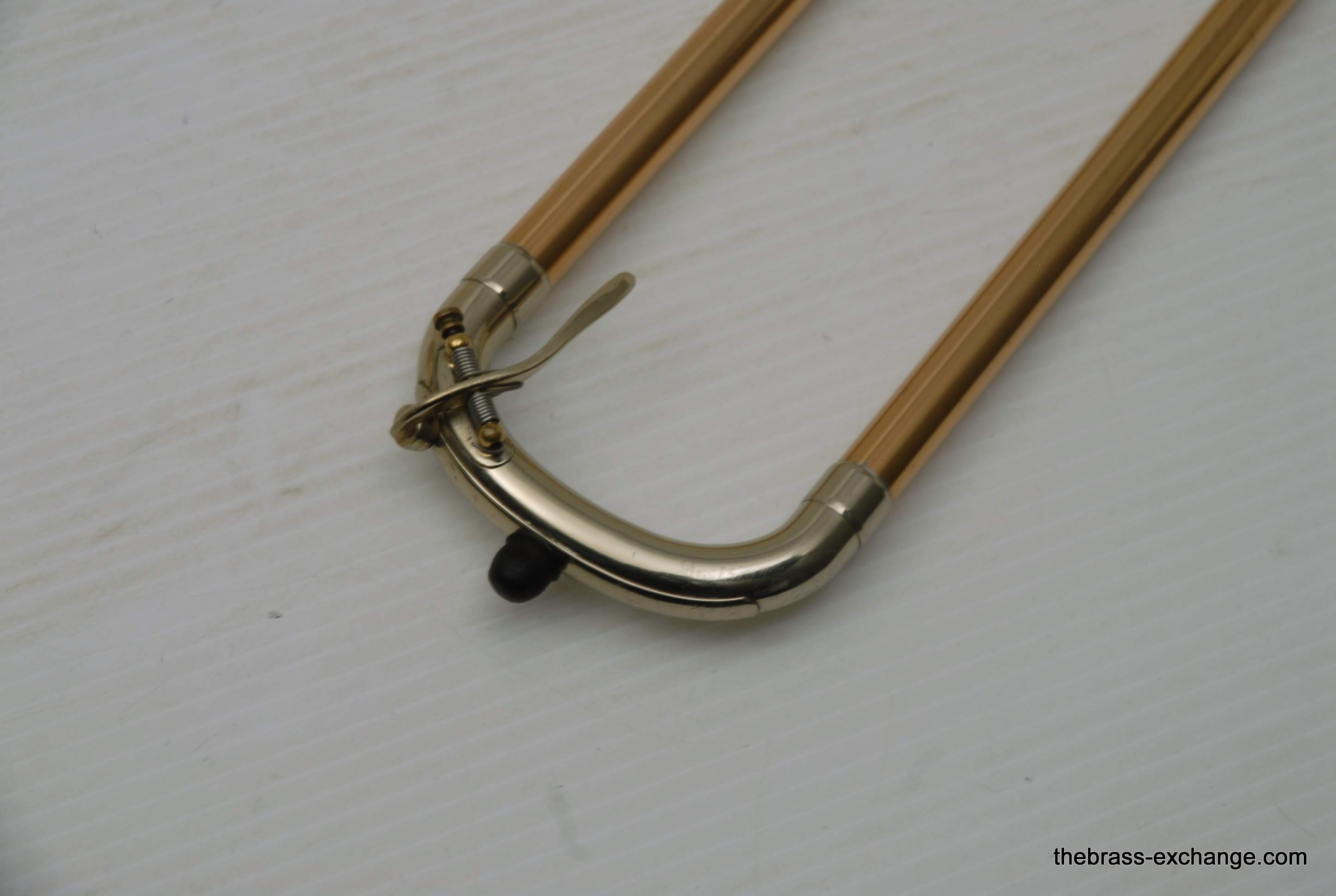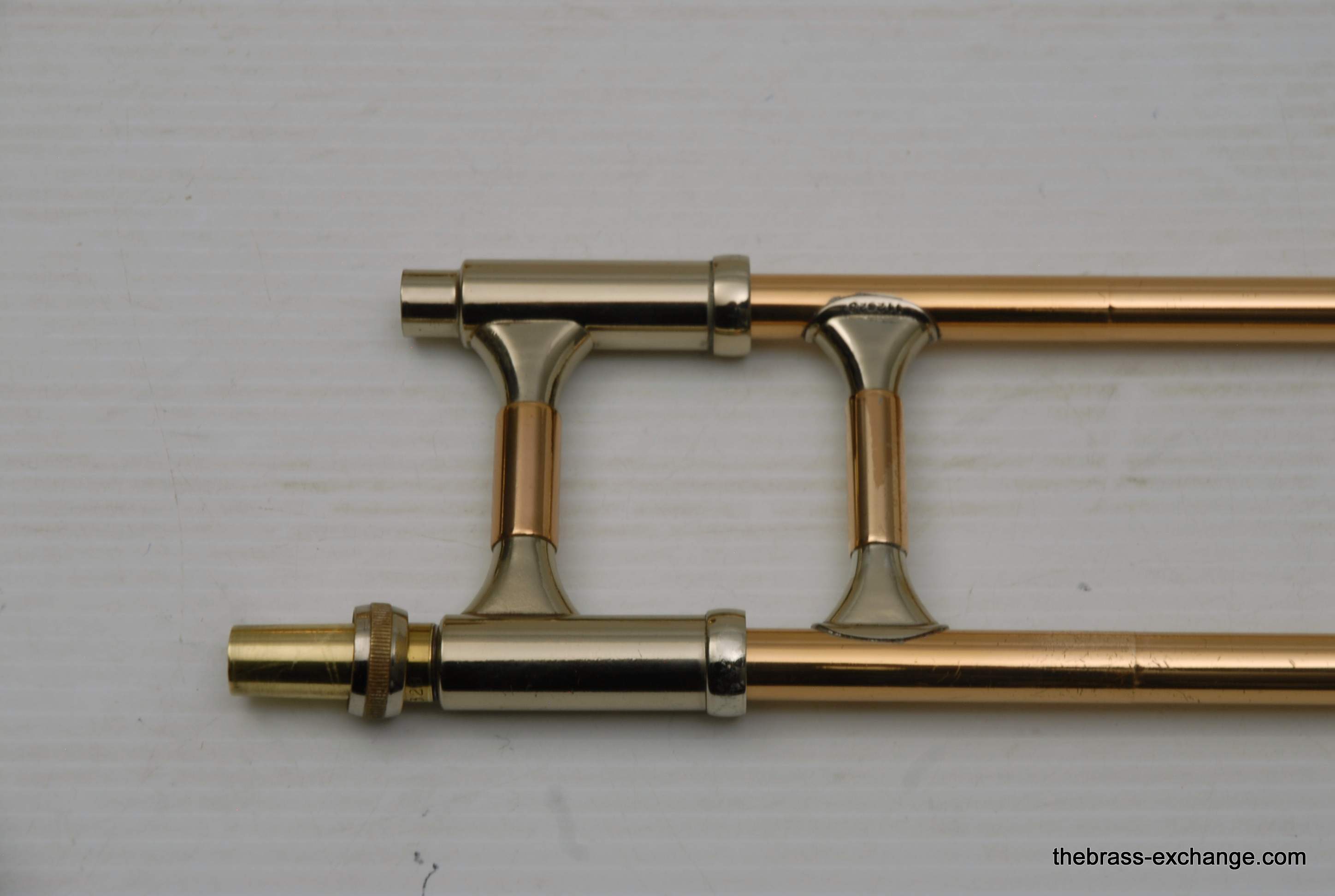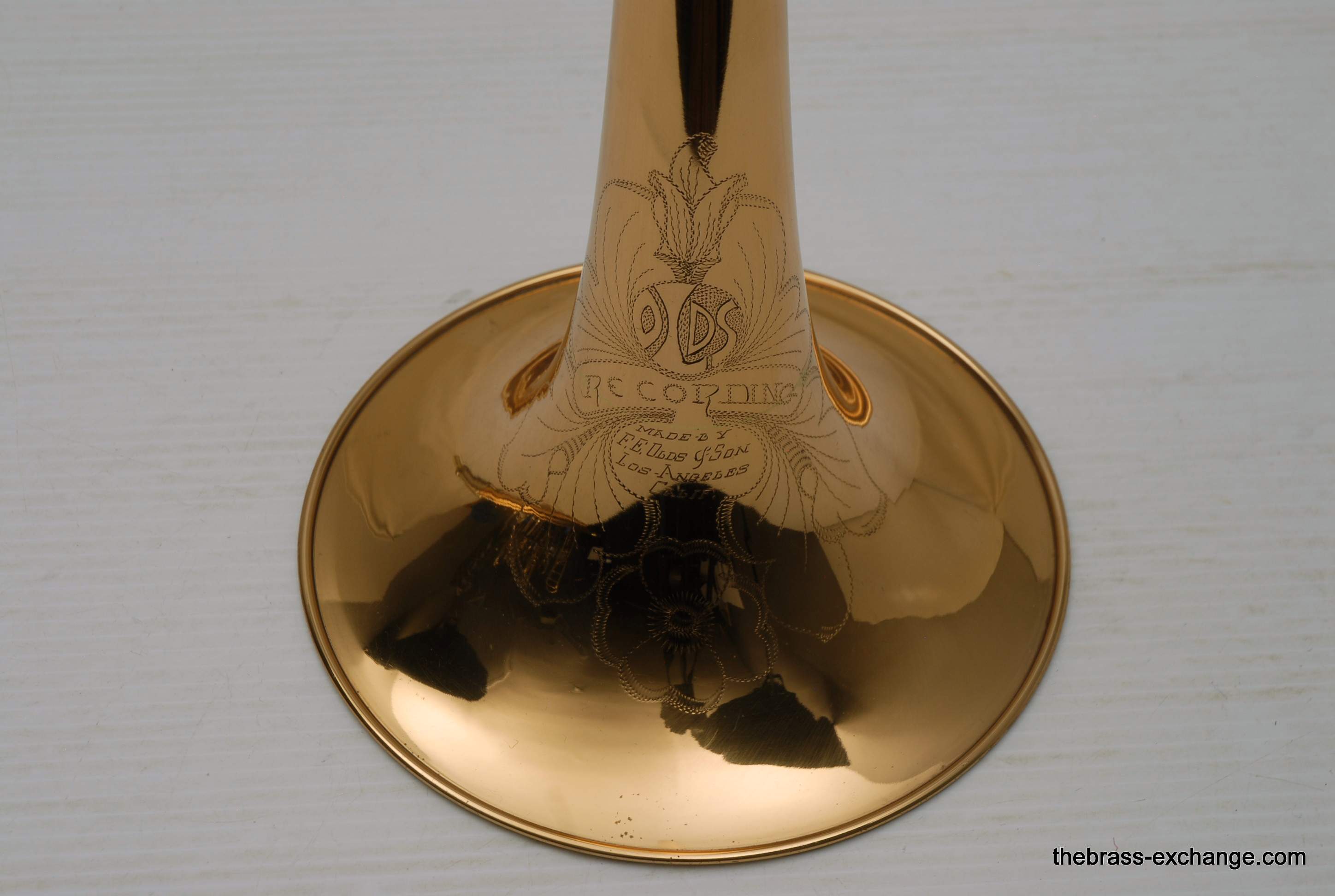 Olds Recording Trombone with F attachment, Vintage 1952 Los Angeles, CA Model.  Has 8.5" gold brass bell with dual bore gold brass handslide.  Later models had nickel silver handslides.  Dual bore .495-.510 fluted inner slide tubes- octagonal shaped, original leadpipe for small shank tenor mouthpiece.  All original parts and lacquer on this instrument.  Has had complete shop once over and is without any defects or issues with playability.  Both and collector and players horn.  Would be ideal for either a young player looking for a nice mid bore or an advanced adult player looking to play something smaller but still 8.5" bell sound.  Olds is known for their quality.  This instrument is proof that they were built to last a lifetime.  Has a new Marco Magi NN-TRK Case.  We sell these cases separately for $395.  Here is a link:  https://www.thebrass-exchange.com/content/trombone-large-tenor-nn-trk