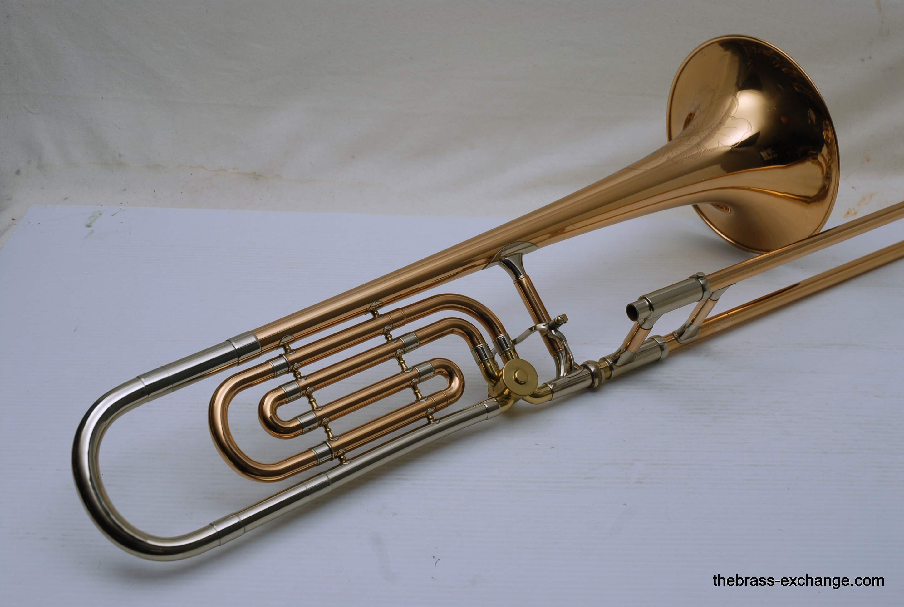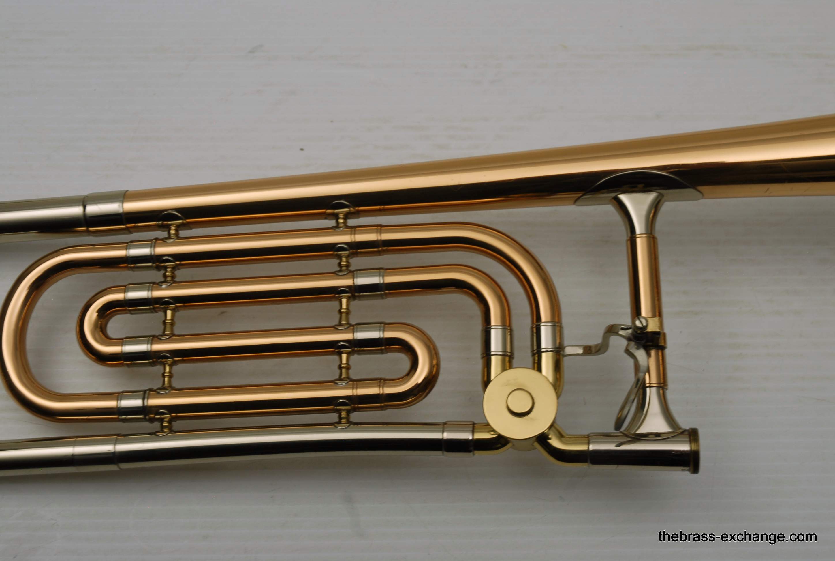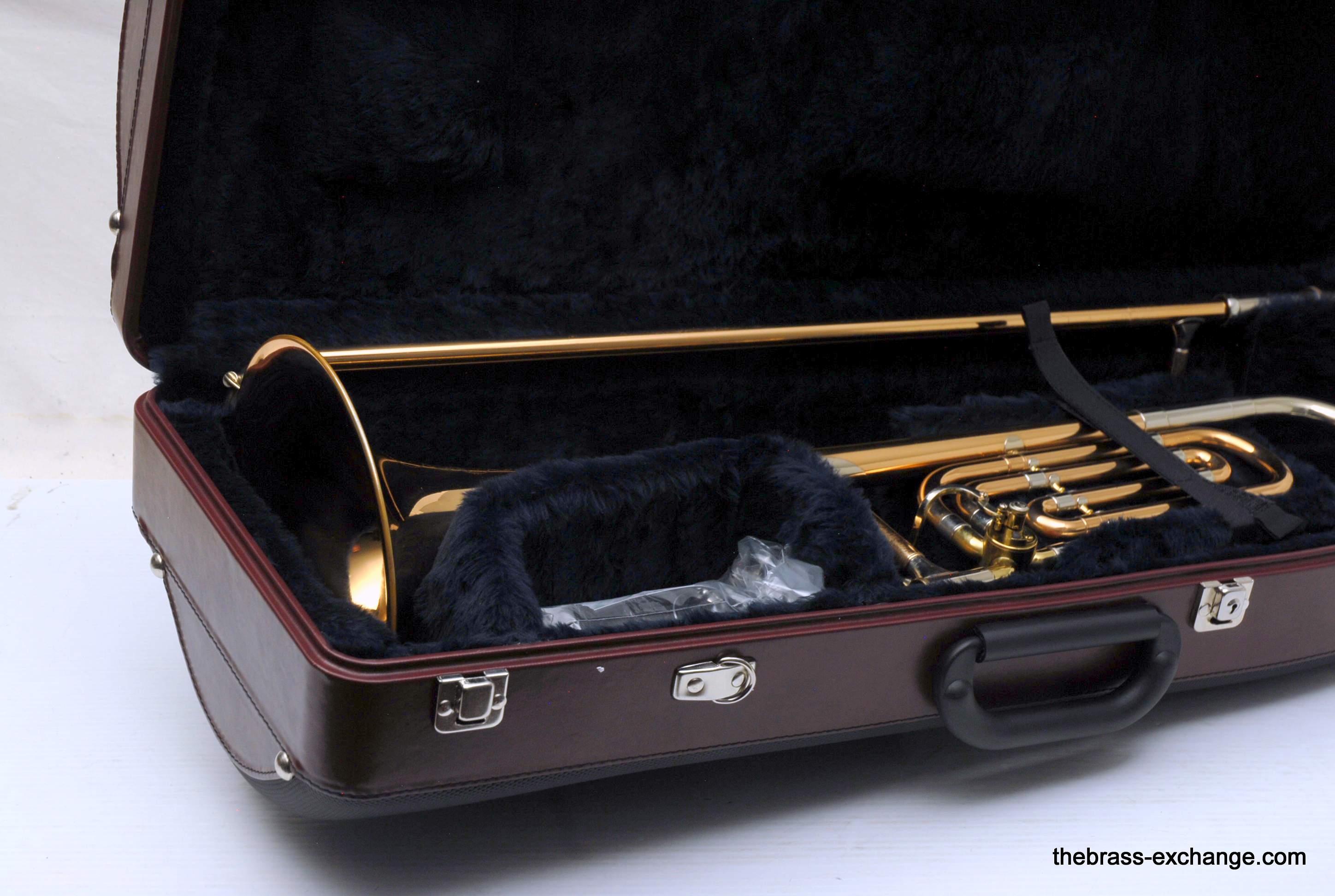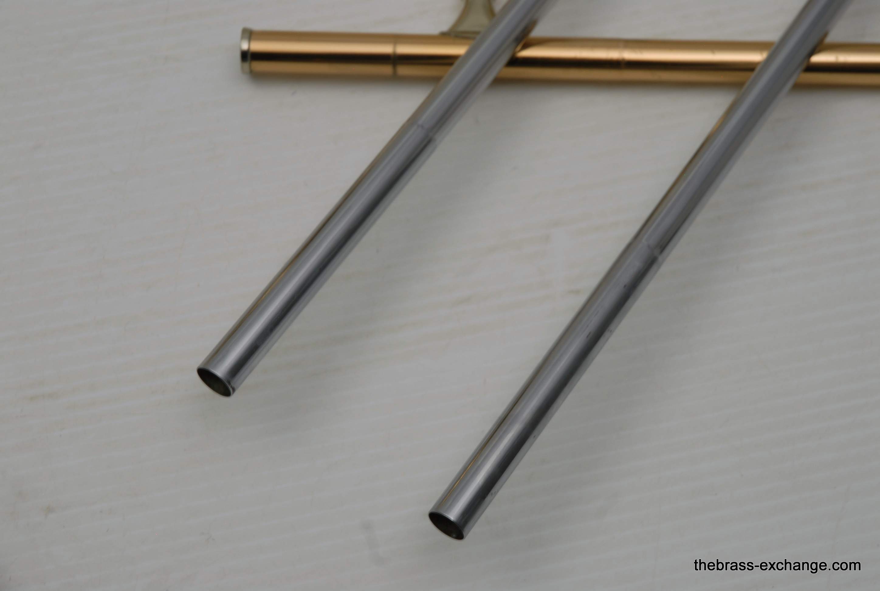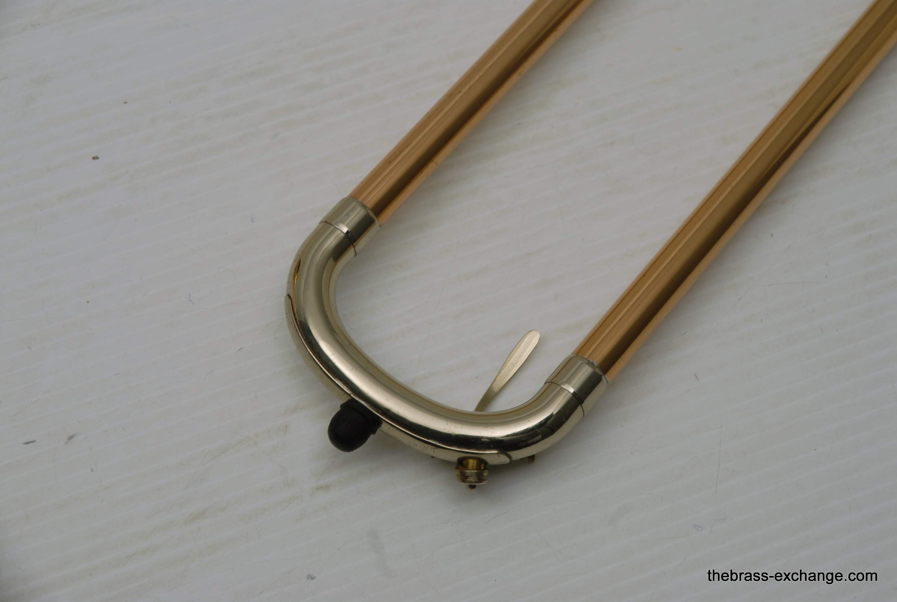 Olds Recording Trombone with F attachment, Vintage 1952 Los Angeles, CA Model.  Has 8.5" gold brass bell with dual bore gold brass handslide.  Later models had nickel silver handslides.  Dual bore .495-.510 fluted inner slide tubes- octagonal shaped, original leadpipe for small shank tenor mouthpiece.  All original parts and lacquer on this instrument.  Has had complete shop once over and is without any defects or issues with playability.  Both and collector and players horn.  Would be ideal for either a young player looking for a nice mid bore or an advanced adult player looking to play something smaller but still 8.5" bell sound.  Olds is known for their quality.  This instrument is proof that they were built to last a lifetime.  Has a new Marco Magi NN-TRK Case.  We sell these cases separately for $395.  Here is a link:  https://www.thebrass-exchange.com/content/trombone-large-tenor-nn-trk