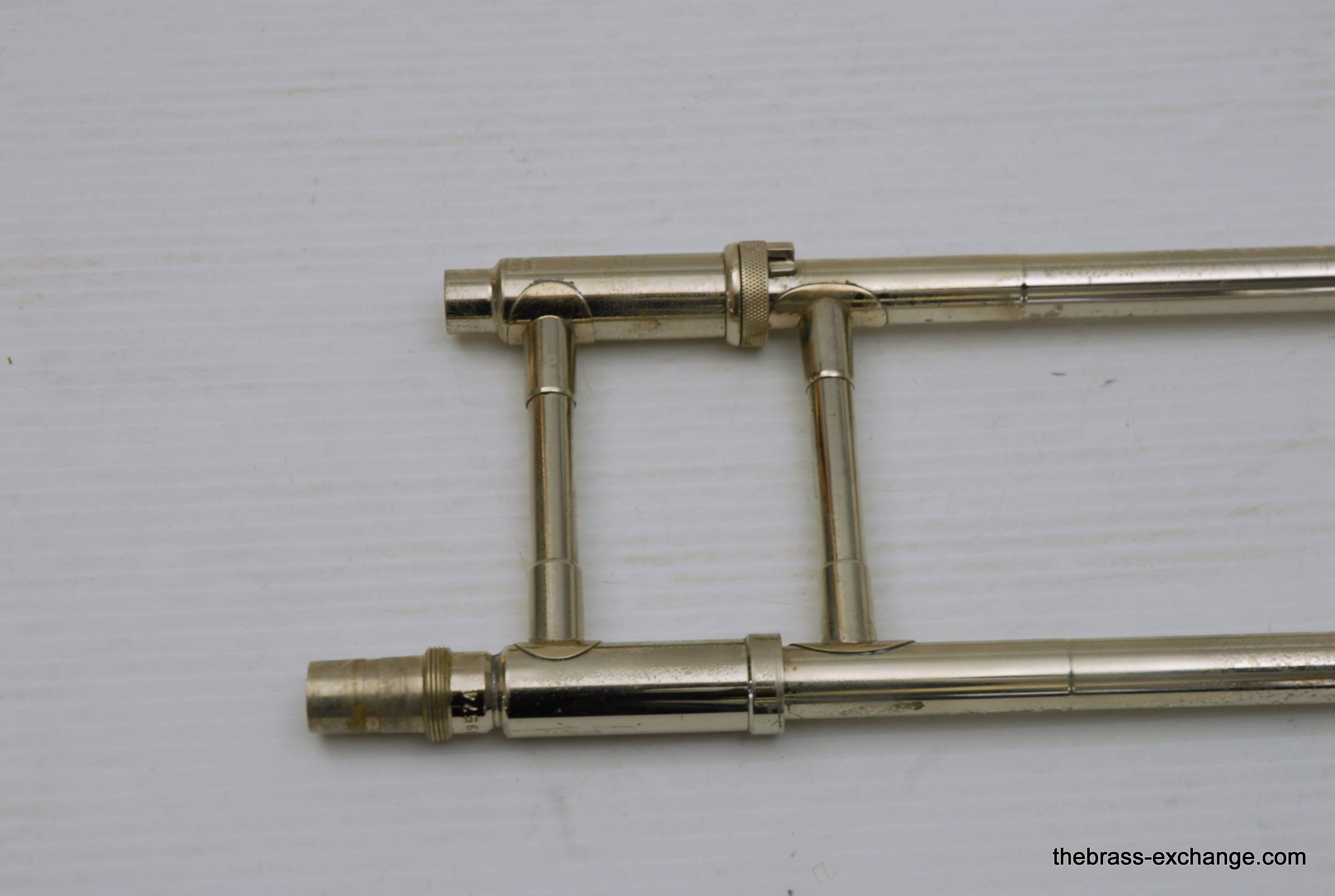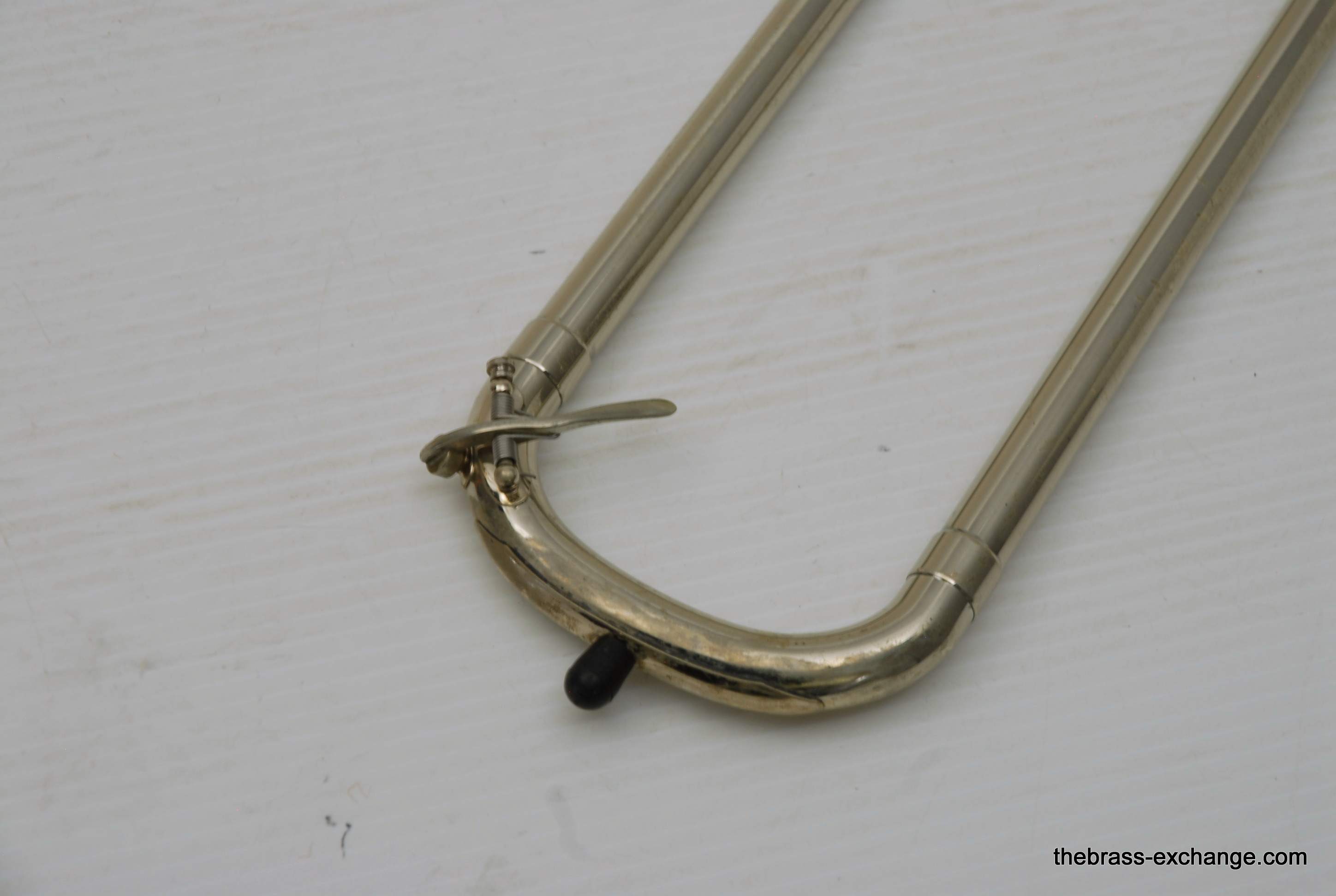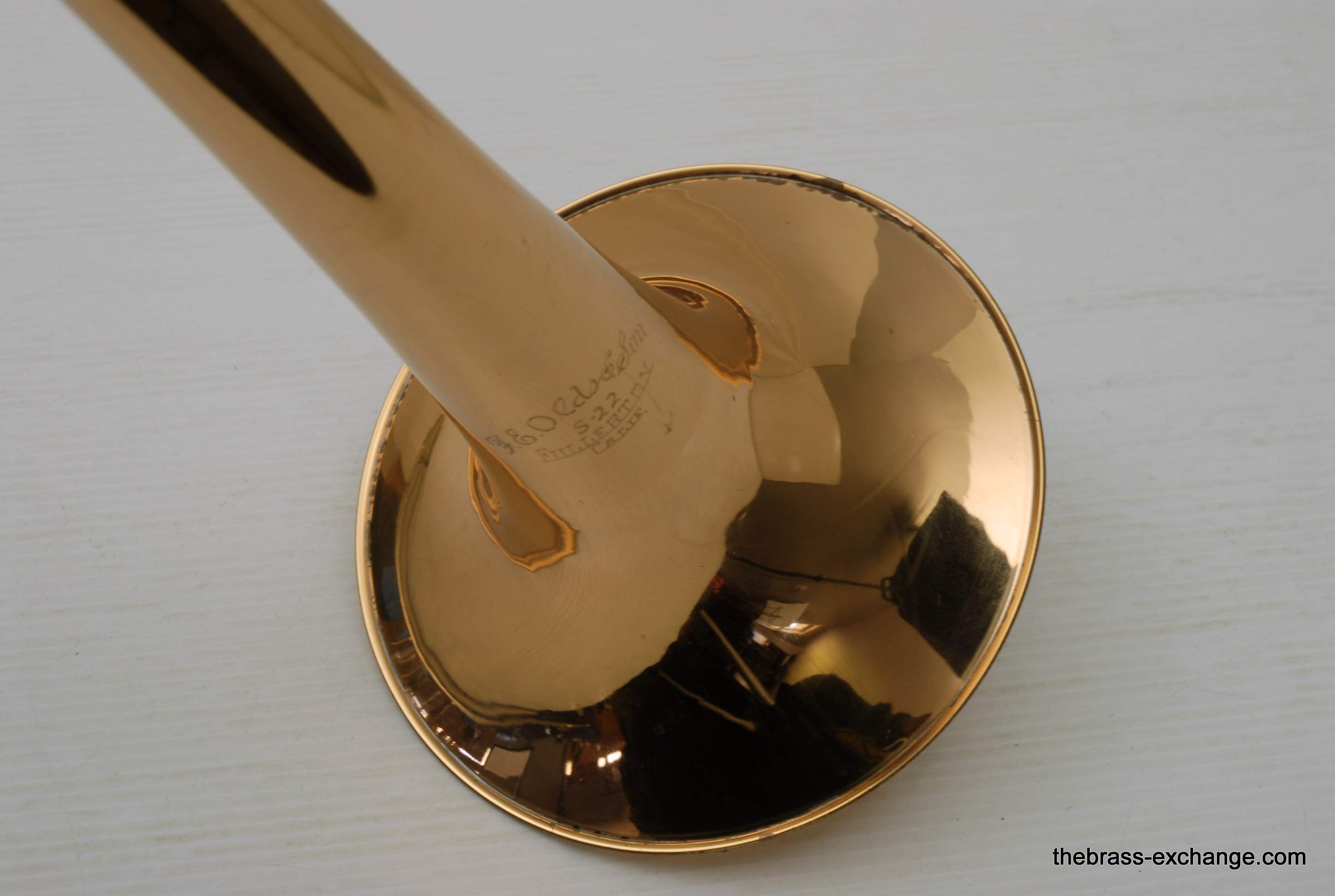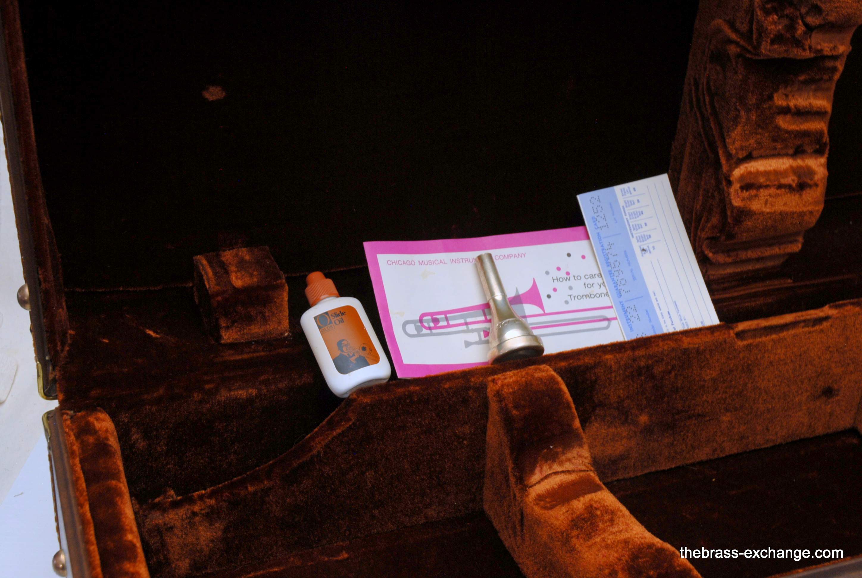Olds S-22 Bass Trombone, Single Valve. 1960's Model SN 789574 All original parts, lacquer, case. Has 9" gold brass bell, nickel silver bass bore .562 handslide, original mouthpiece and case. This is a rare find. Vintage olds single bass in very good condition. Totally straight horn, no signs of previous repair or damage, does have some smooth plating wear on inner tube, but not a hindrance to playability. It is a great horn. Ideal for anyone looking to play a smaller bass, great for big band, even orchestra where a second valve is not needed. George Roberts played a single valve bass his entire career, and it never held him back.
