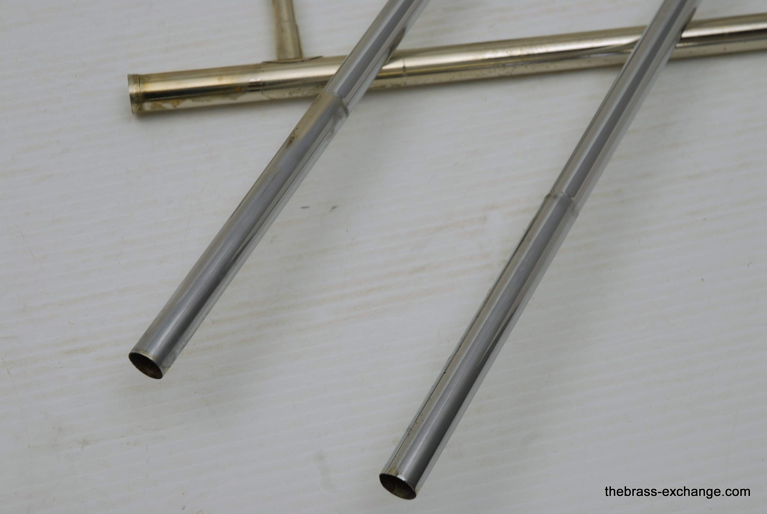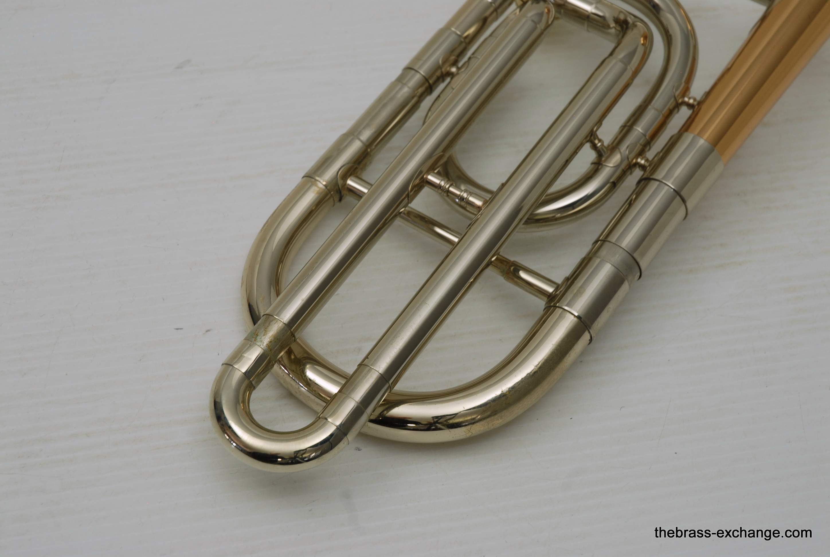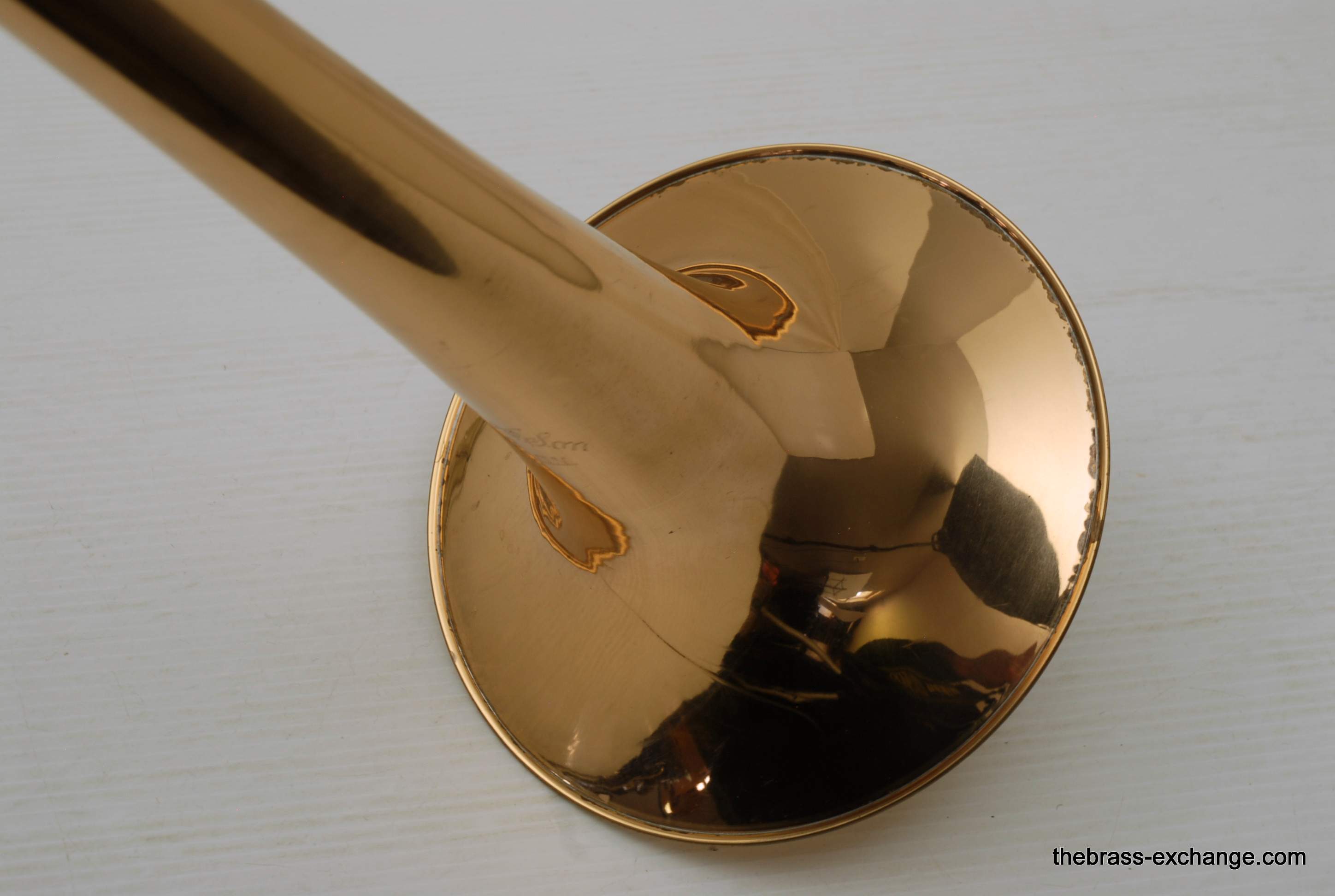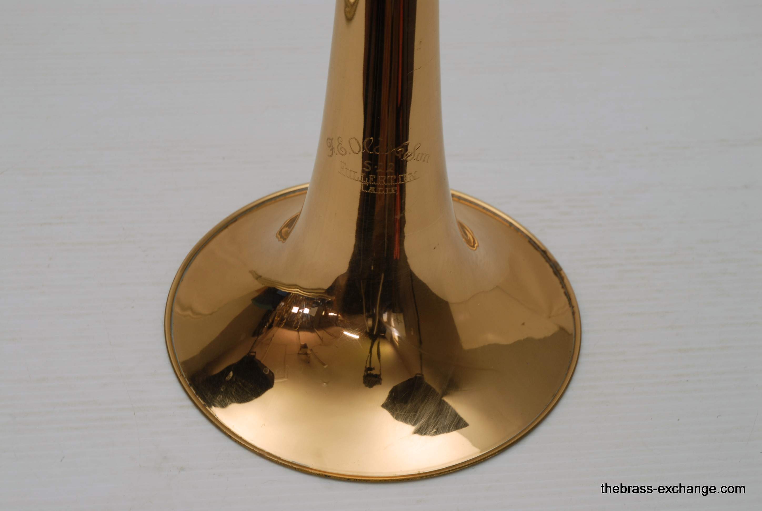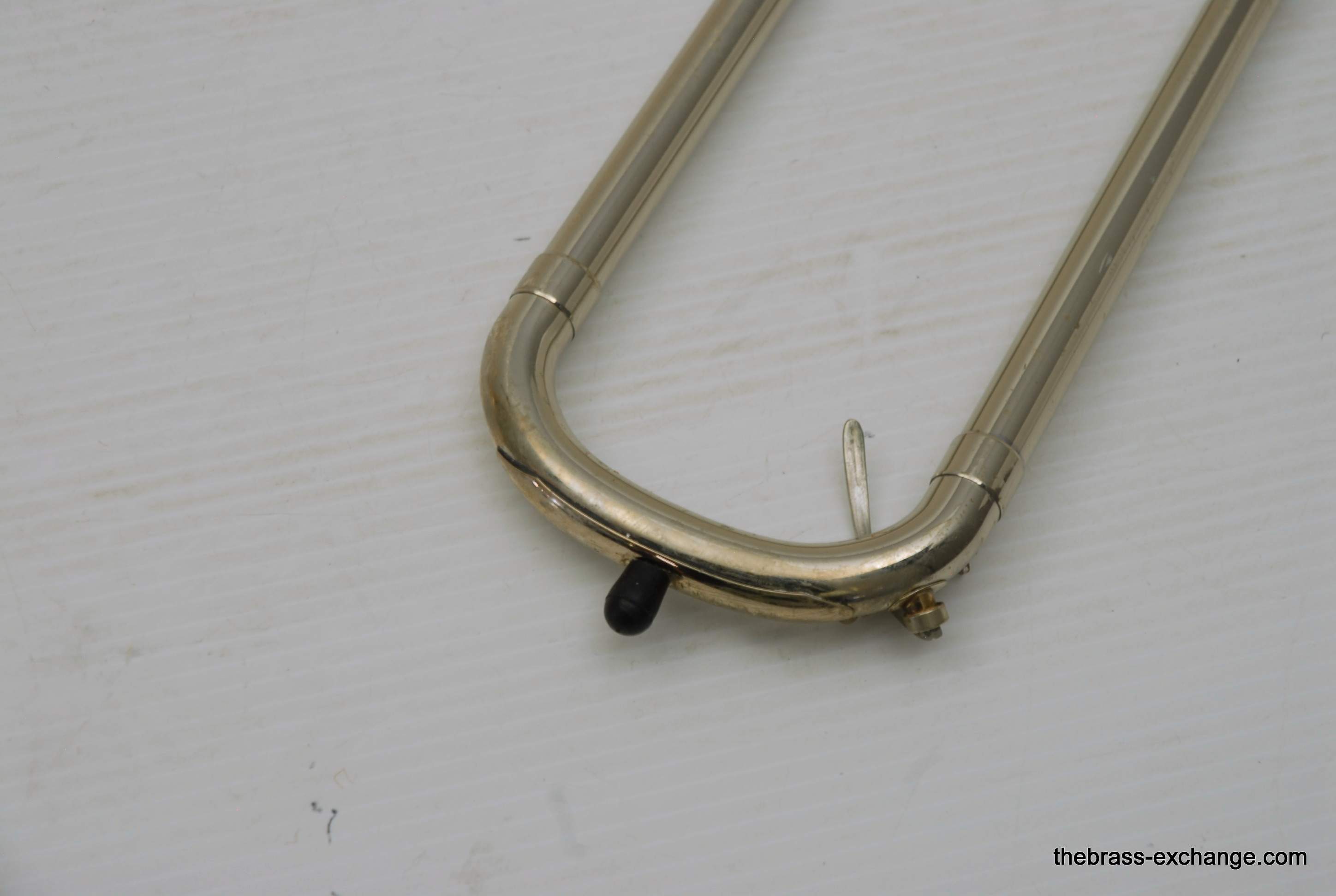 Olds S-22 Bass Trombone, Single Valve. 1960's Model SN 789574 All original parts, lacquer, case. Has 9" gold brass bell, nickel silver bass bore .562 handslide, original mouthpiece and case. This is a rare find. Vintage olds single bass in very good condition. Totally straight horn, no signs of previous repair or damage, does have some smooth plating wear on inner tube, but not a hindrance to playability. It is a great horn. Ideal for anyone looking to play a smaller bass, great for big band, even orchestra where a second valve is not needed. George Roberts played a single valve bass his entire career, and it never held him back.