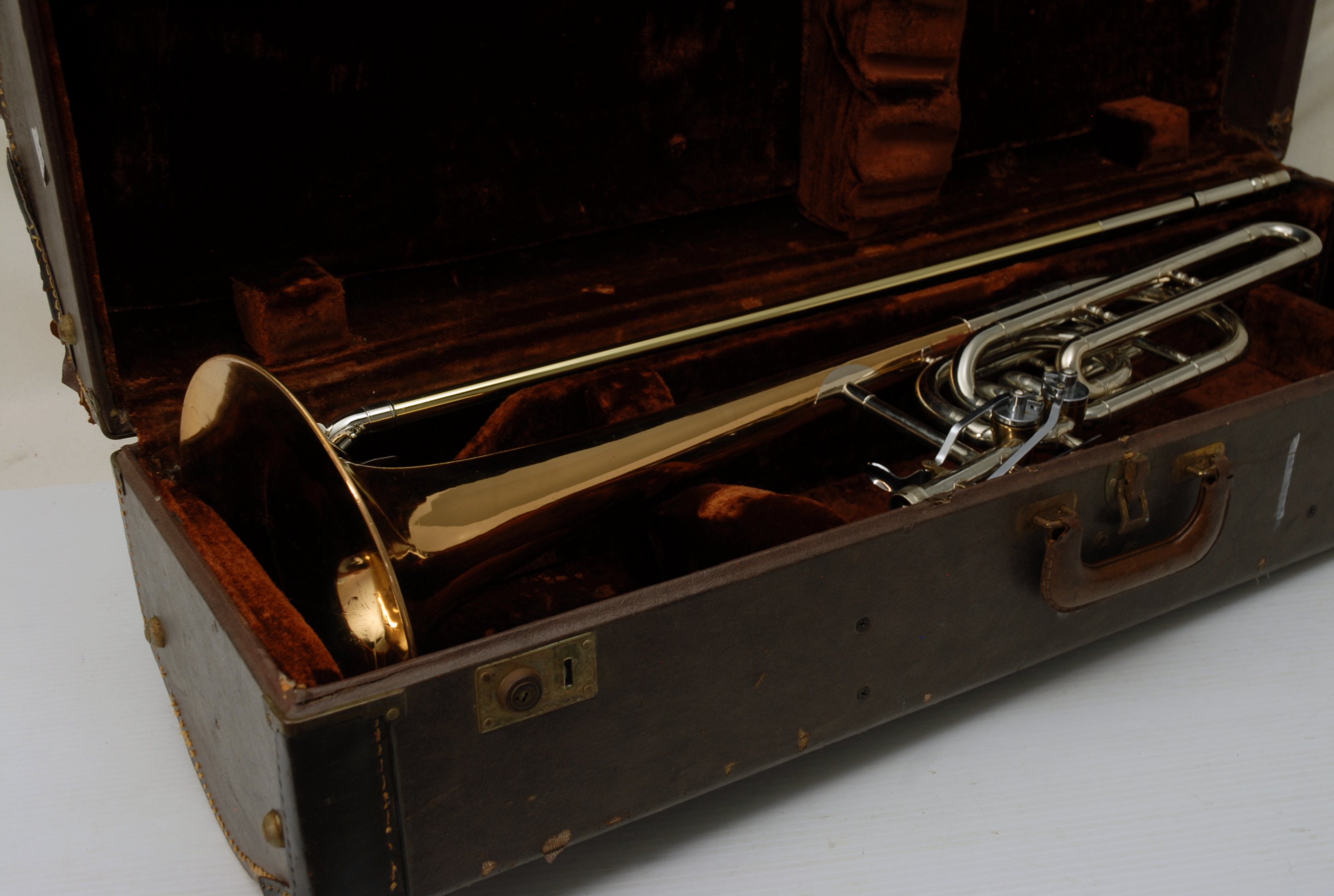 The bell section received dent work and valve service, restoring excellent structural condition with no remaining issues affecting playability. The bell shows moderate lacquer wear typical of instruments from this era, while the newly rebuilt slide carries fresh lacquer.