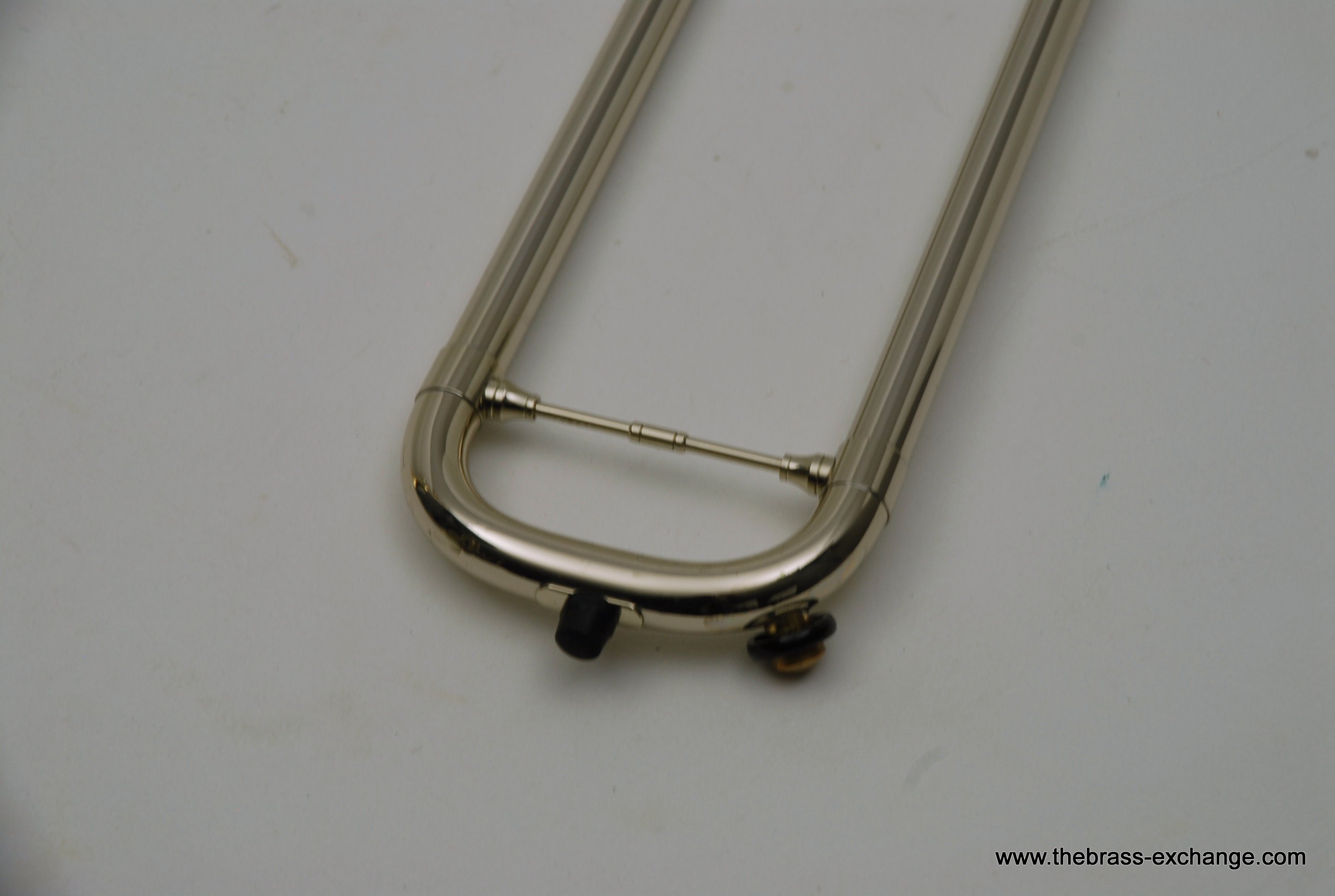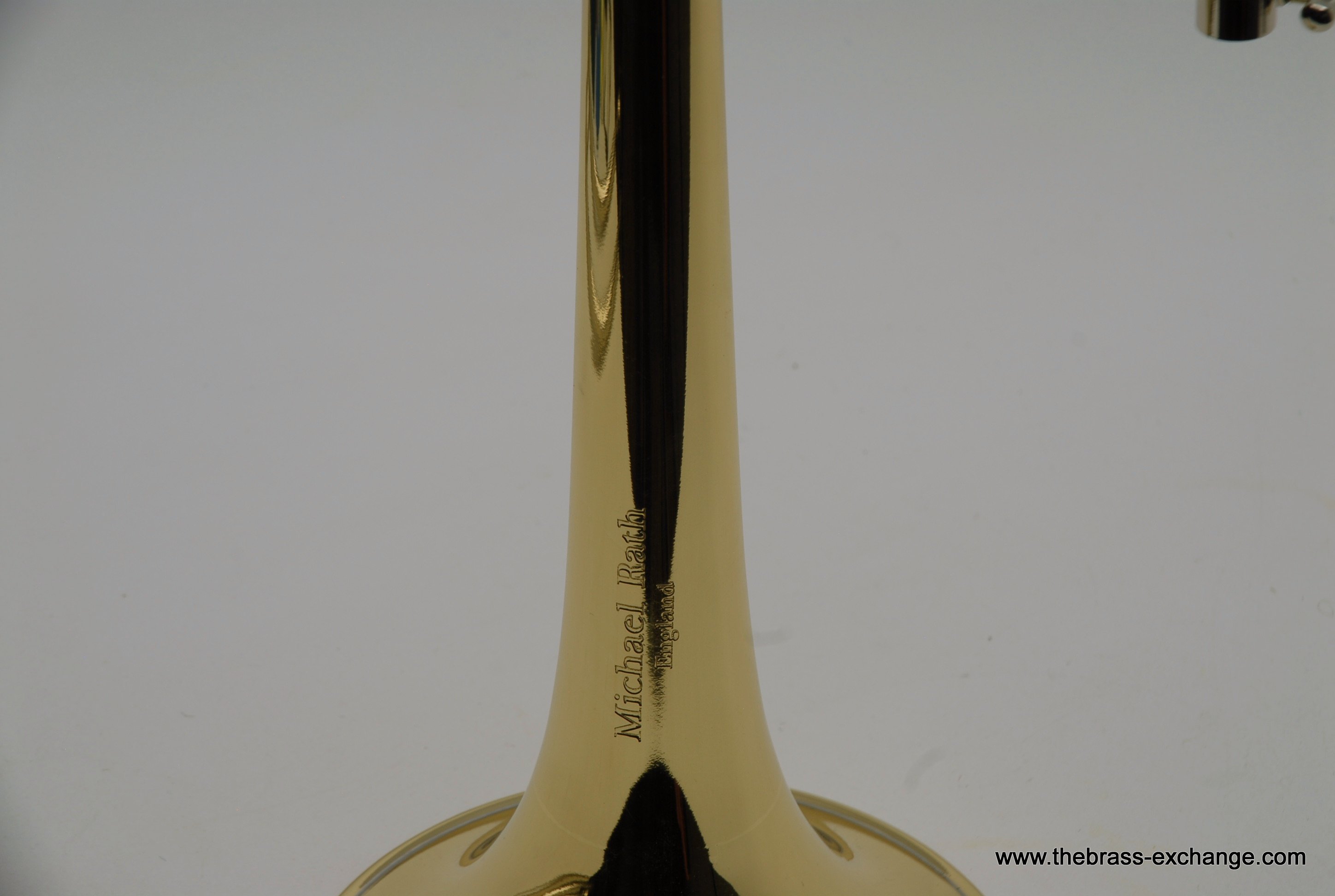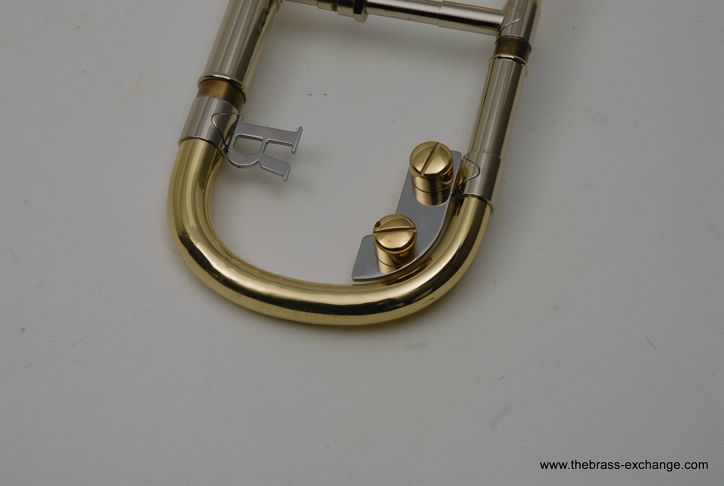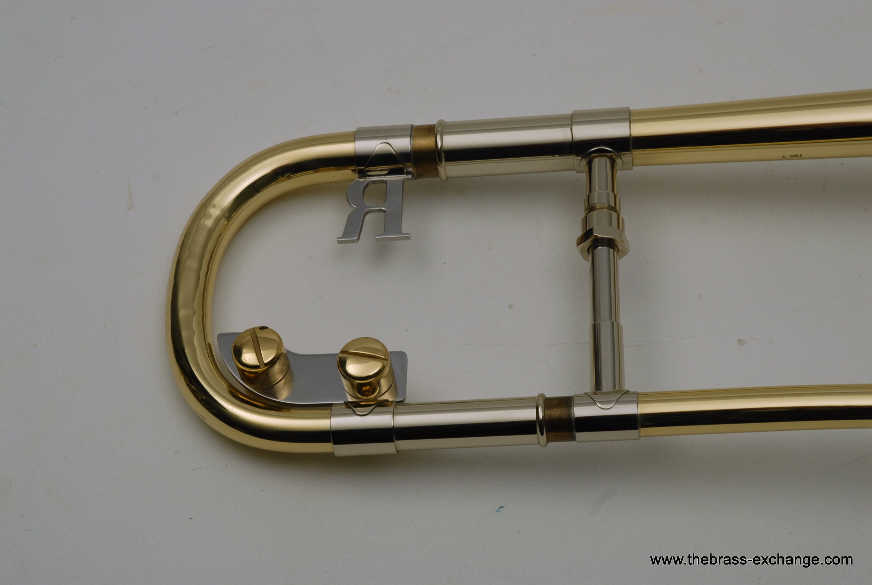 Rath R3 Professional Custom Medium Bore Tenor Trombone Made in England. Pre-owned super excellent condition .525 bore with removable neck pipe, nickel silver slide. Has 8" yellow brass bell, model 750Y. Standard yellow brass tuning slide with signature Rath Balance weight built into tuning slide. Is an excellent playing .525 bore with a complex sound and plays easily. Handslide is fantastic. Minor dings removed from tuning slide crook, is fine now. Overall lacquer is in excellent condition. Would be an excellent choice for anyone looking to play a unique .525 size, or add to your collection of other Rath modular components. Is compatible with Rath custom valve sections. Includes a new Marco Magi NN-TKR case, made in Italy. Also includes 3 removable leadpipes, 2 of the pipes take large shank mouthpiece, 1 pipe takes small shank mouthpiece. Would be great jazz/commercial style trombone.