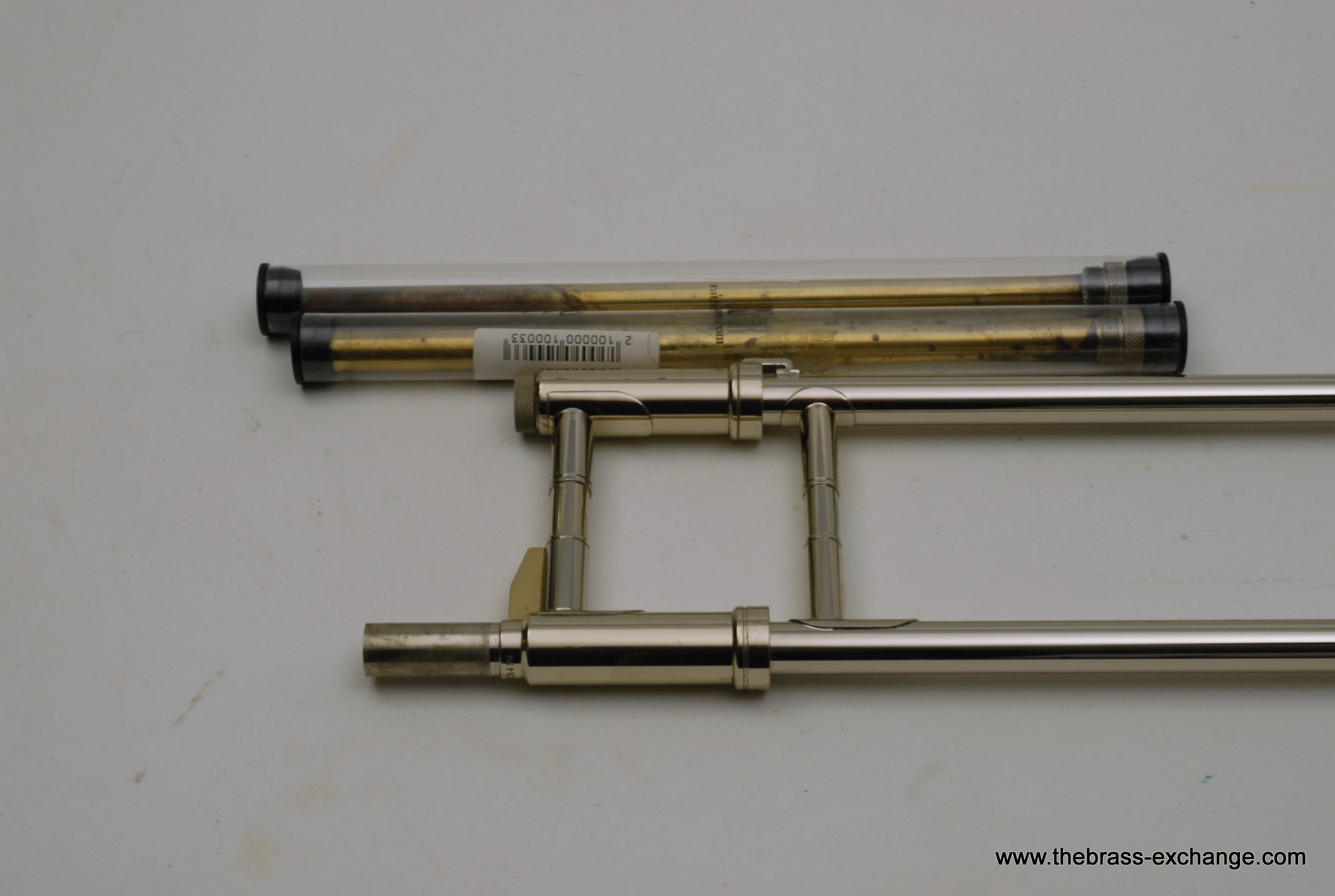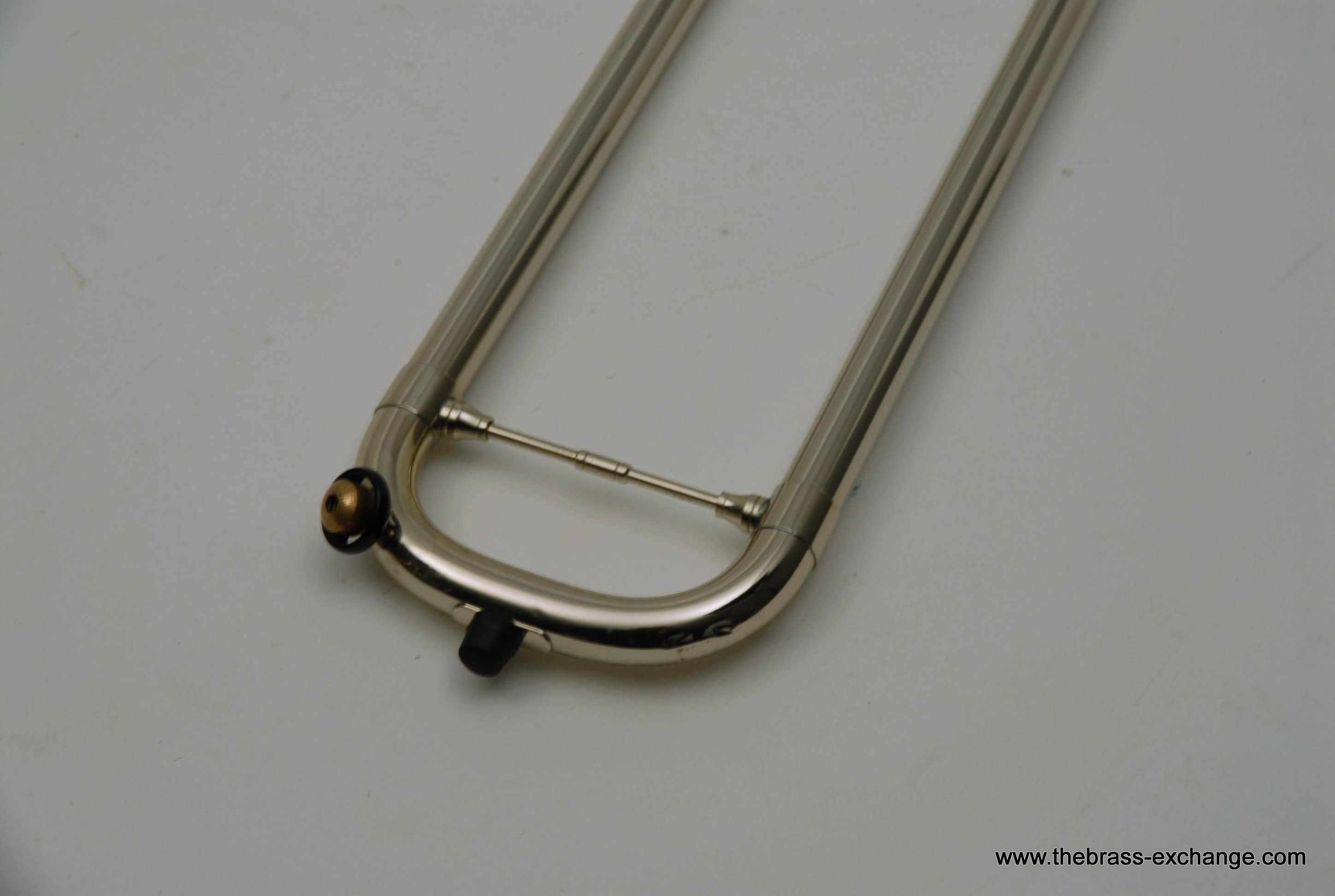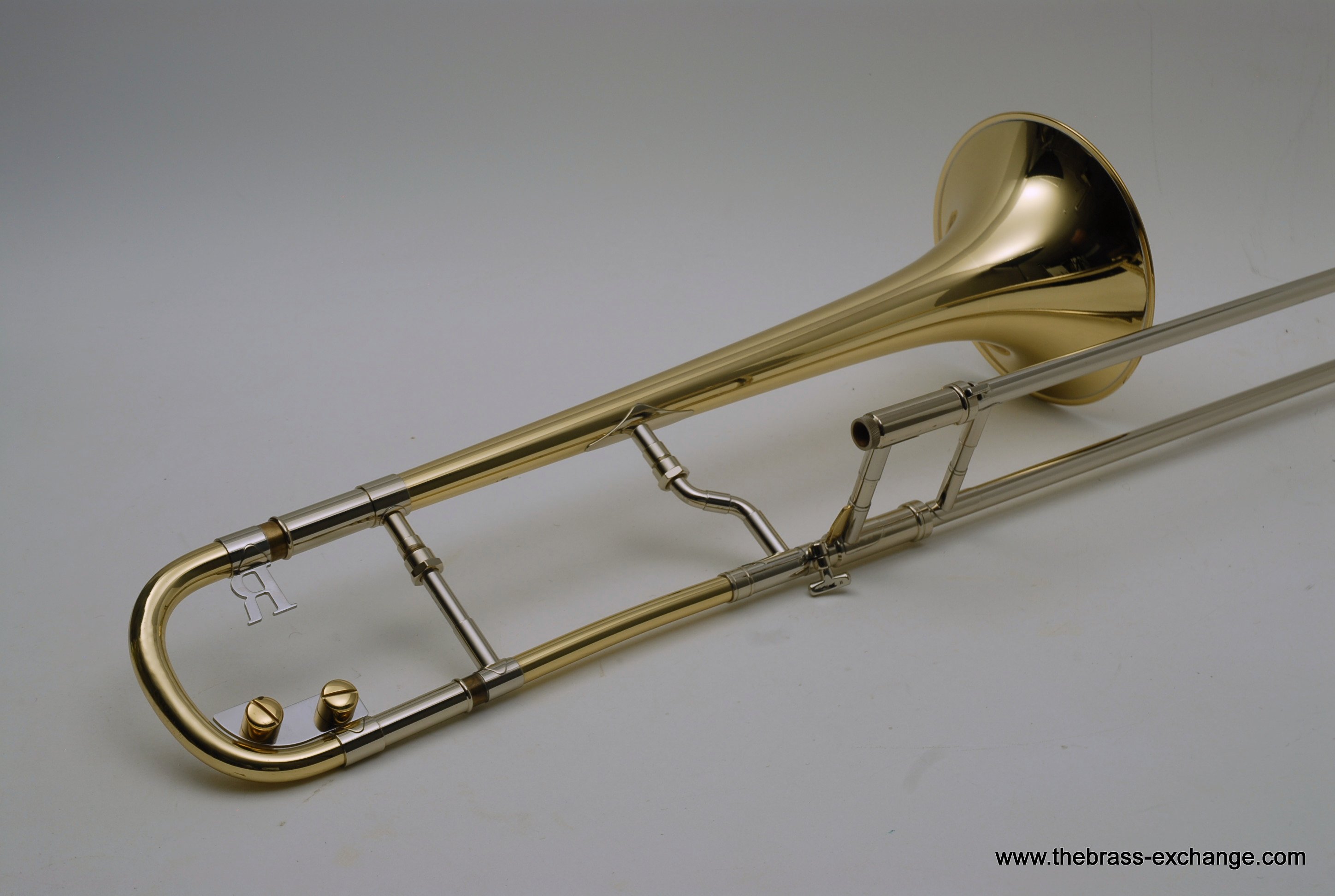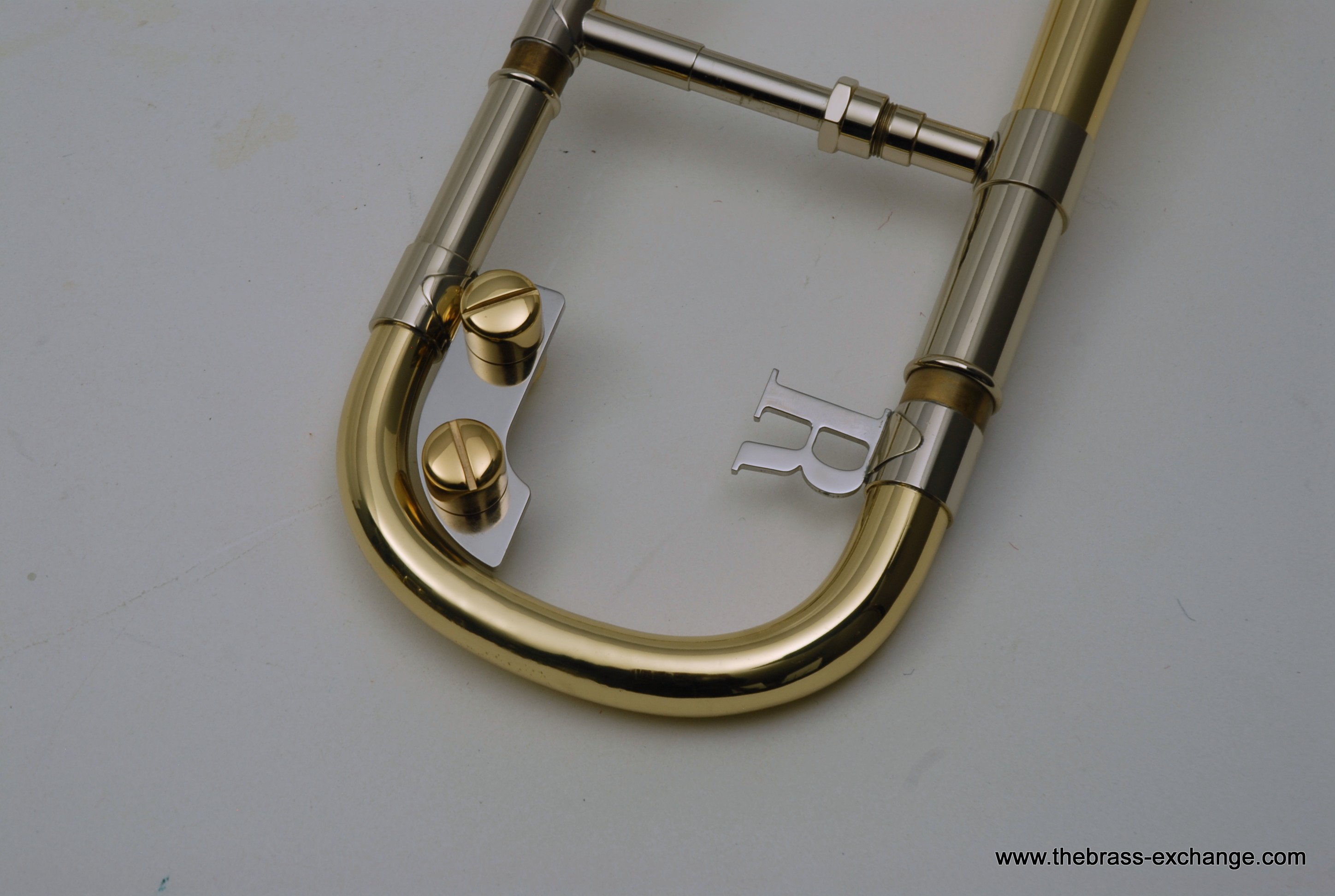 Rath R3 Professional Custom Medium Bore Tenor Trombone Made in England. Pre-owned super excellent condition .525 bore with removable neck pipe, nickel silver slide. Has 8" yellow brass bell, model 750Y. Standard yellow brass tuning slide with signature Rath Balance weight built into tuning slide. Is an excellent playing .525 bore with a complex sound and plays easily. Handslide is fantastic. Minor dings removed from tuning slide crook, is fine now. Overall lacquer is in excellent condition. Would be an excellent choice for anyone looking to play a unique .525 size, or add to your collection of other Rath modular components. Is compatible with Rath custom valve sections. Includes a new Marco Magi NN-TKR case, made in Italy. Also includes 3 removable leadpipes, 2 of the pipes take large shank mouthpiece, 1 pipe takes small shank mouthpiece. Would be great jazz/commercial style trombone.